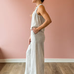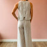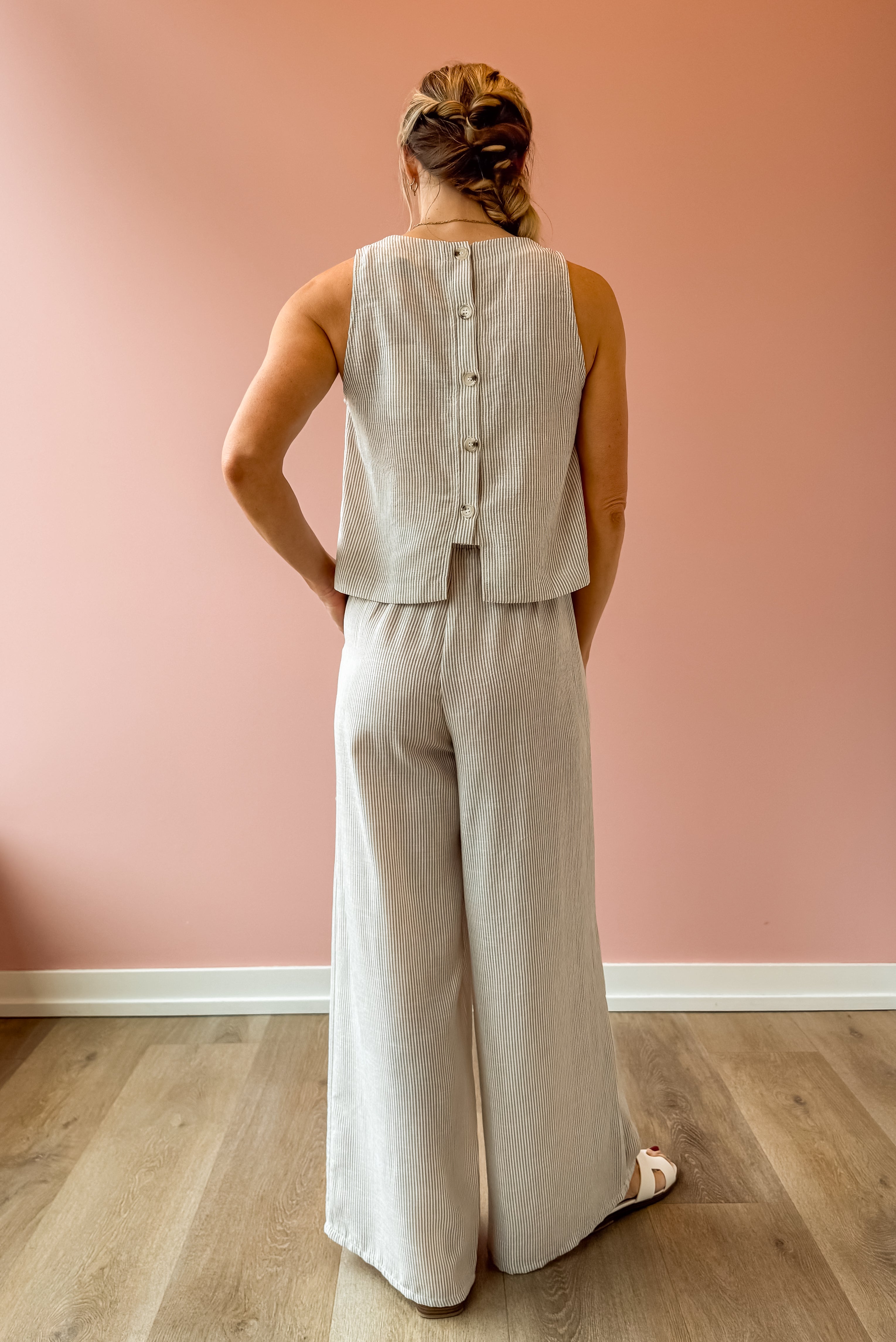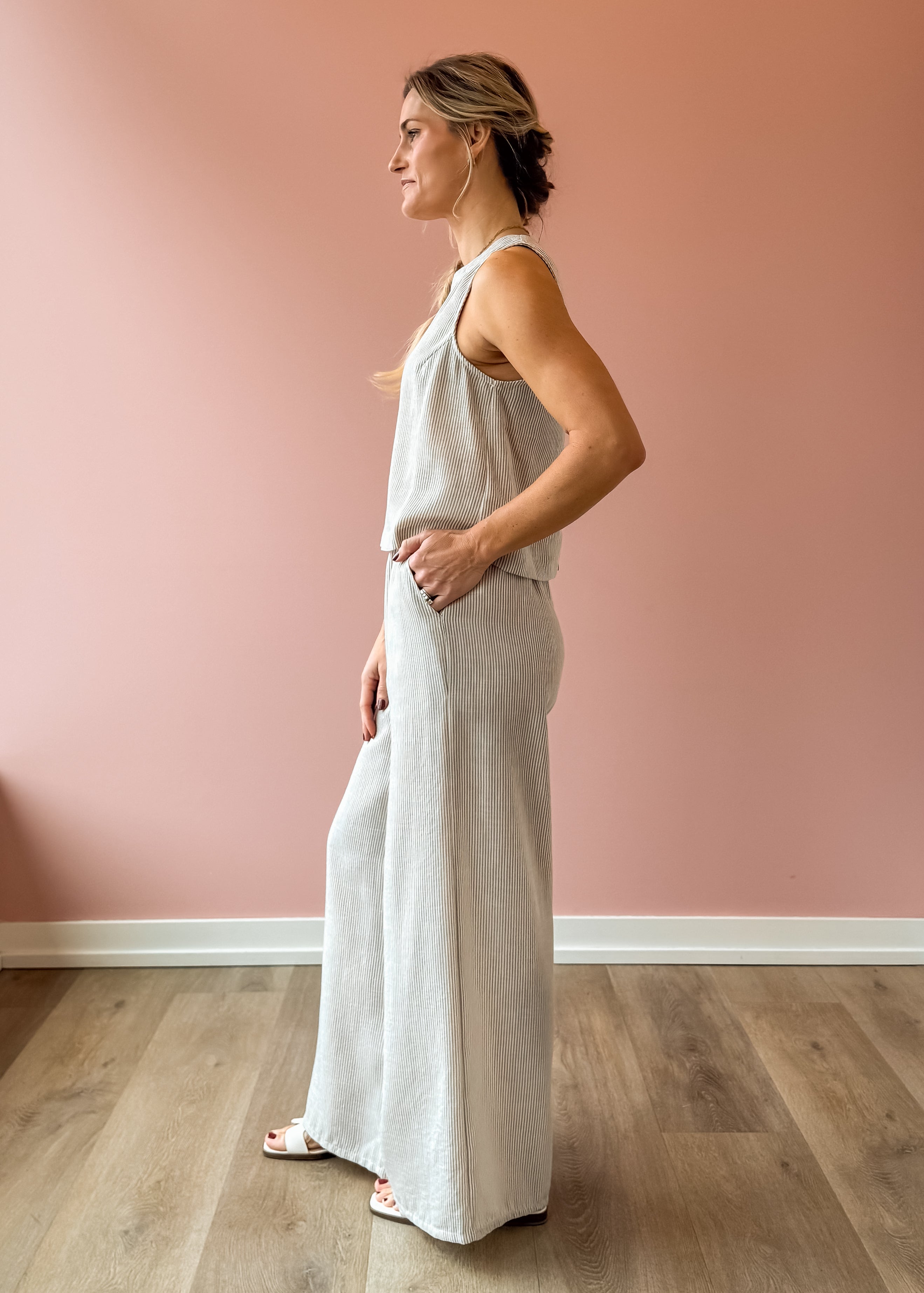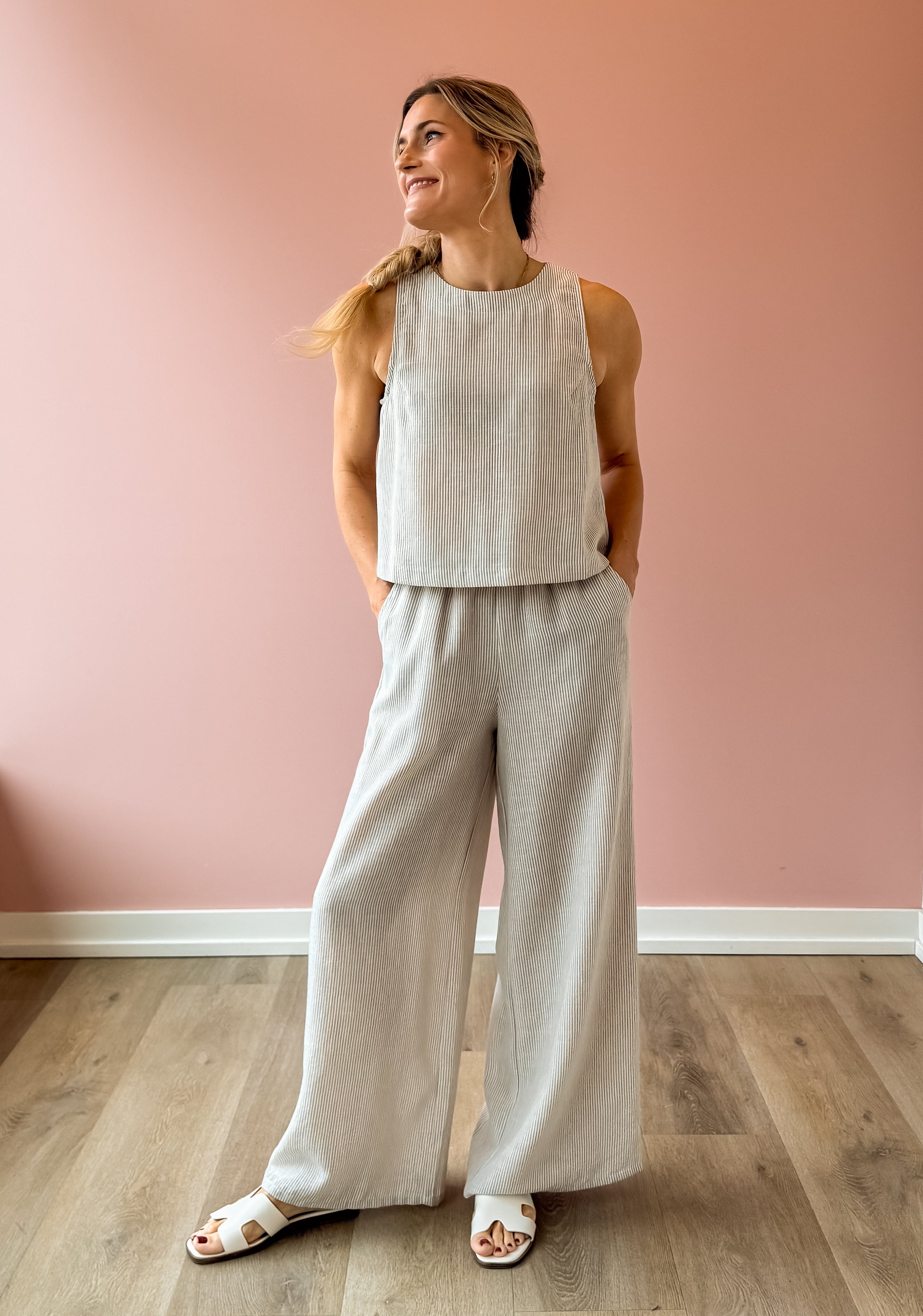 Elevate your warm-weather wardrobe with these Garden Sun Pants, featuring a flattering high-rise silhouette and wide-leg cut in soft tan and ivory stripes. The flowing drape creates an effortlessly chic look, while functional side pockets add practicality. Pair with the matching Garden Sun Tank and your favorite sandals for a coordinated, resort-ready ensemble that transitions seamlessly from day to evening.