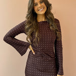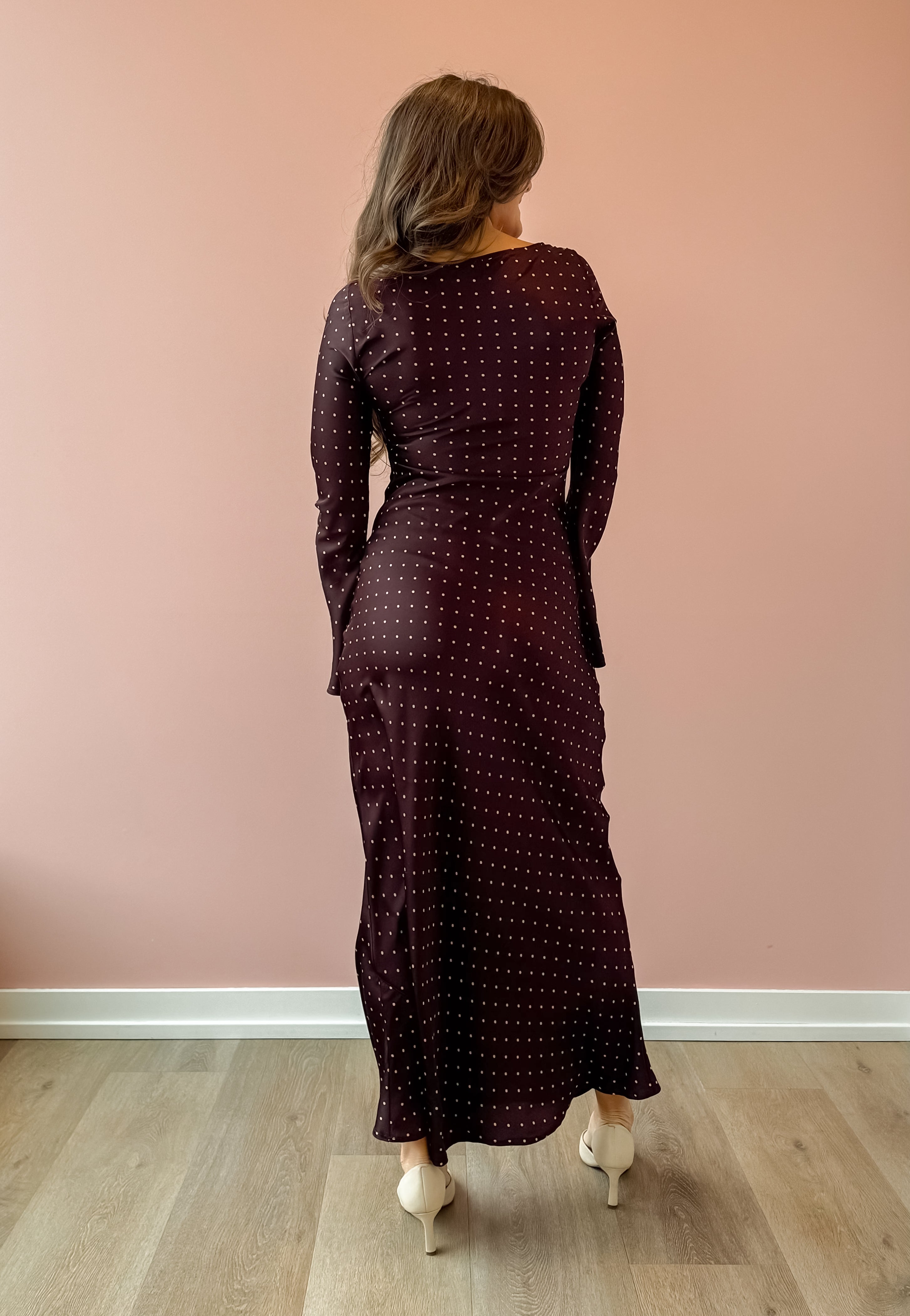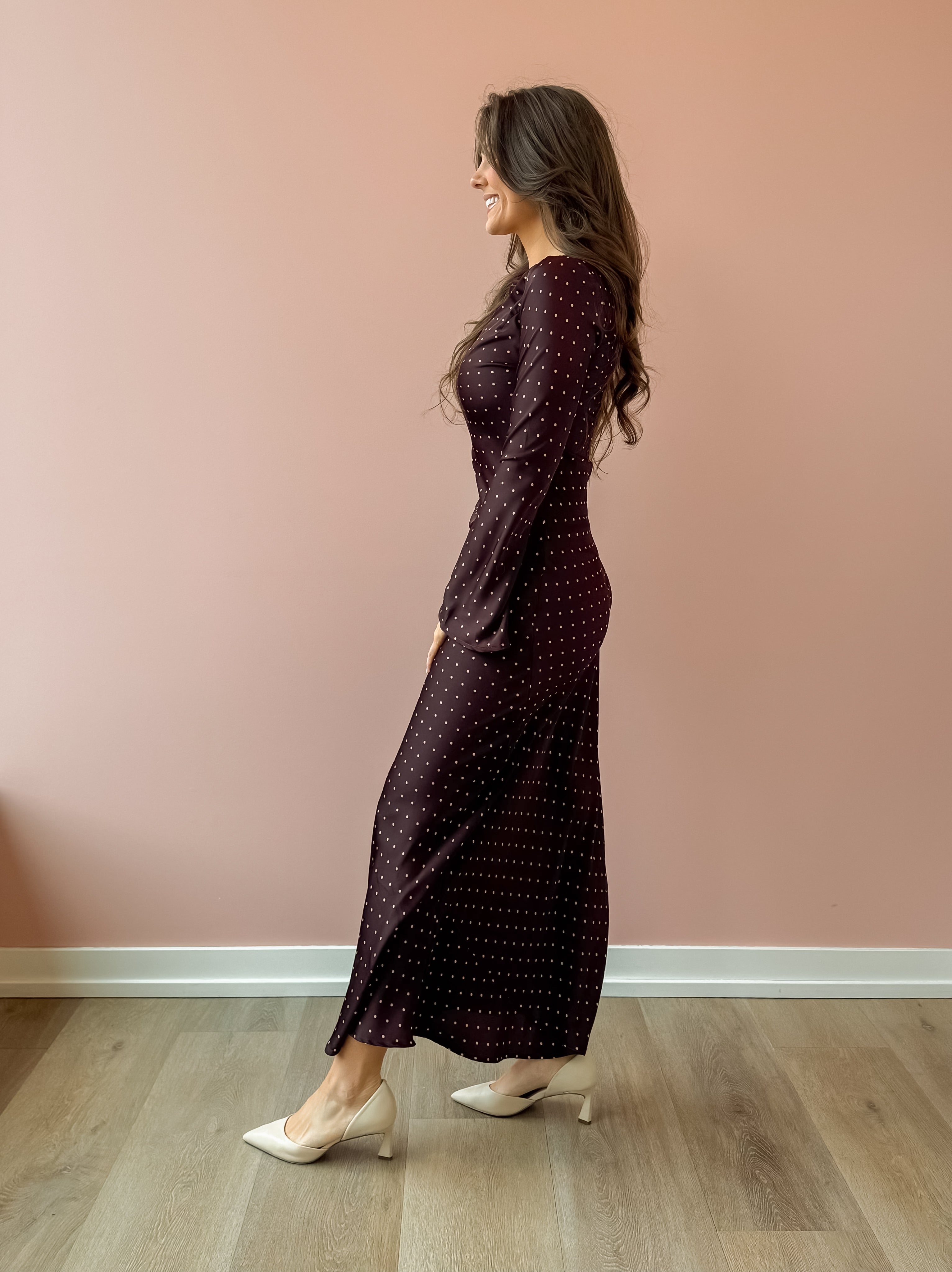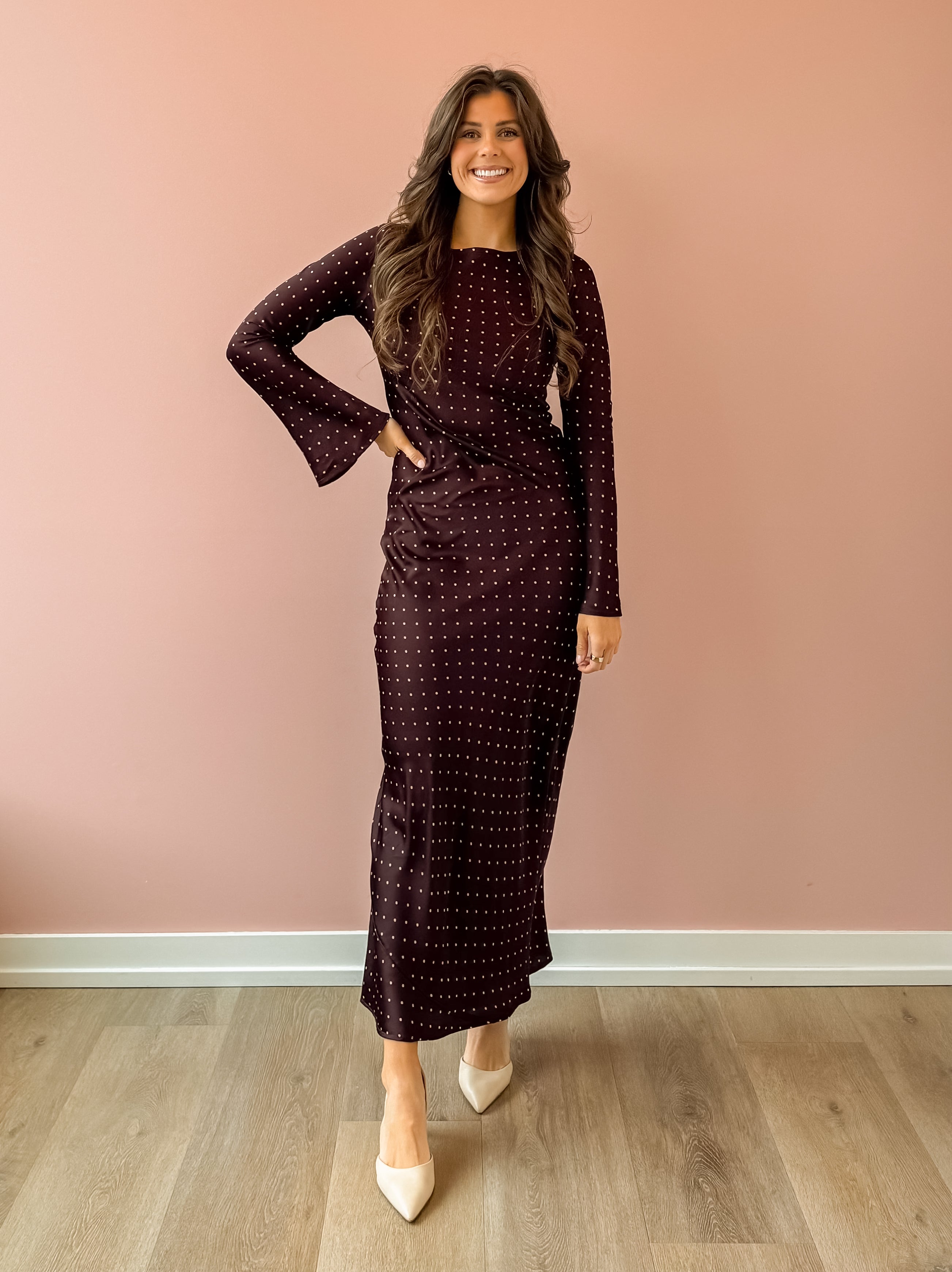 Elevate your holiday wardrobe with the Georgie Midi Dress—a timeless piece that effortlessly combines sophistication with playful charm. Featuring a flattering boatneck neckline and graceful long sleeves, this midi dress drapes beautifully in rich burgundy adorned with delicate light pink polka dots. Perfect for festive gatherings, pair it with heels to create an elegant look that turns heads.