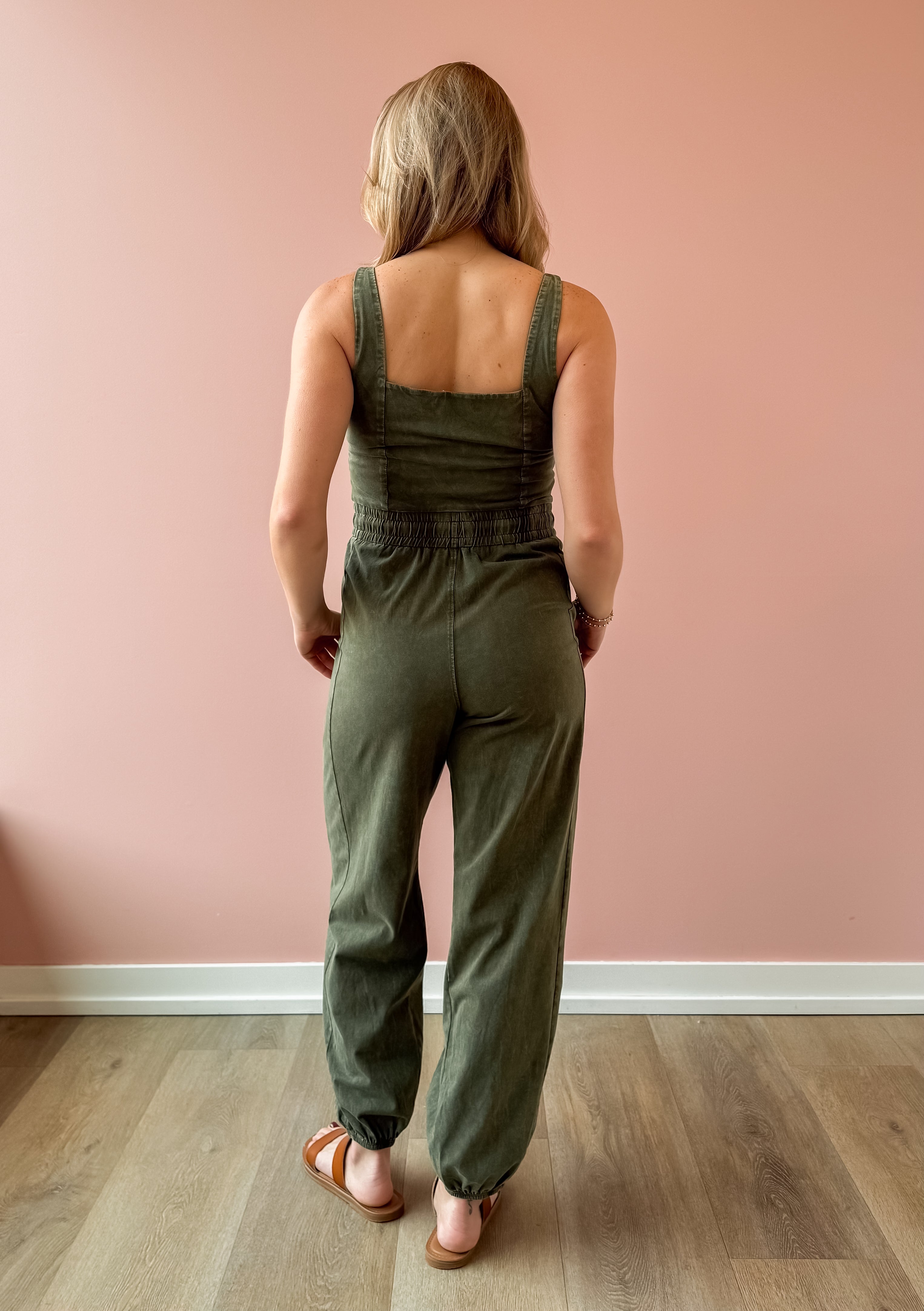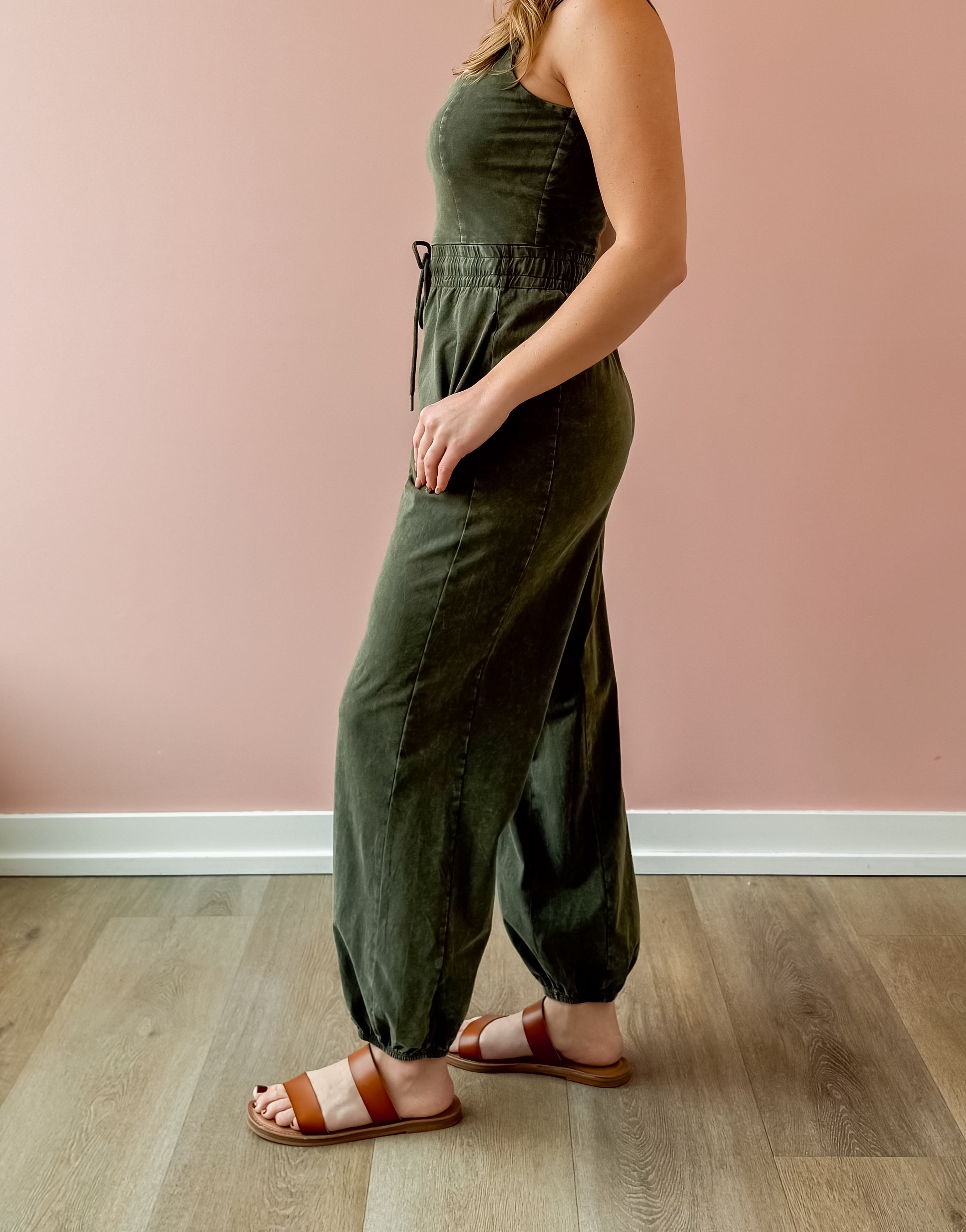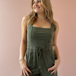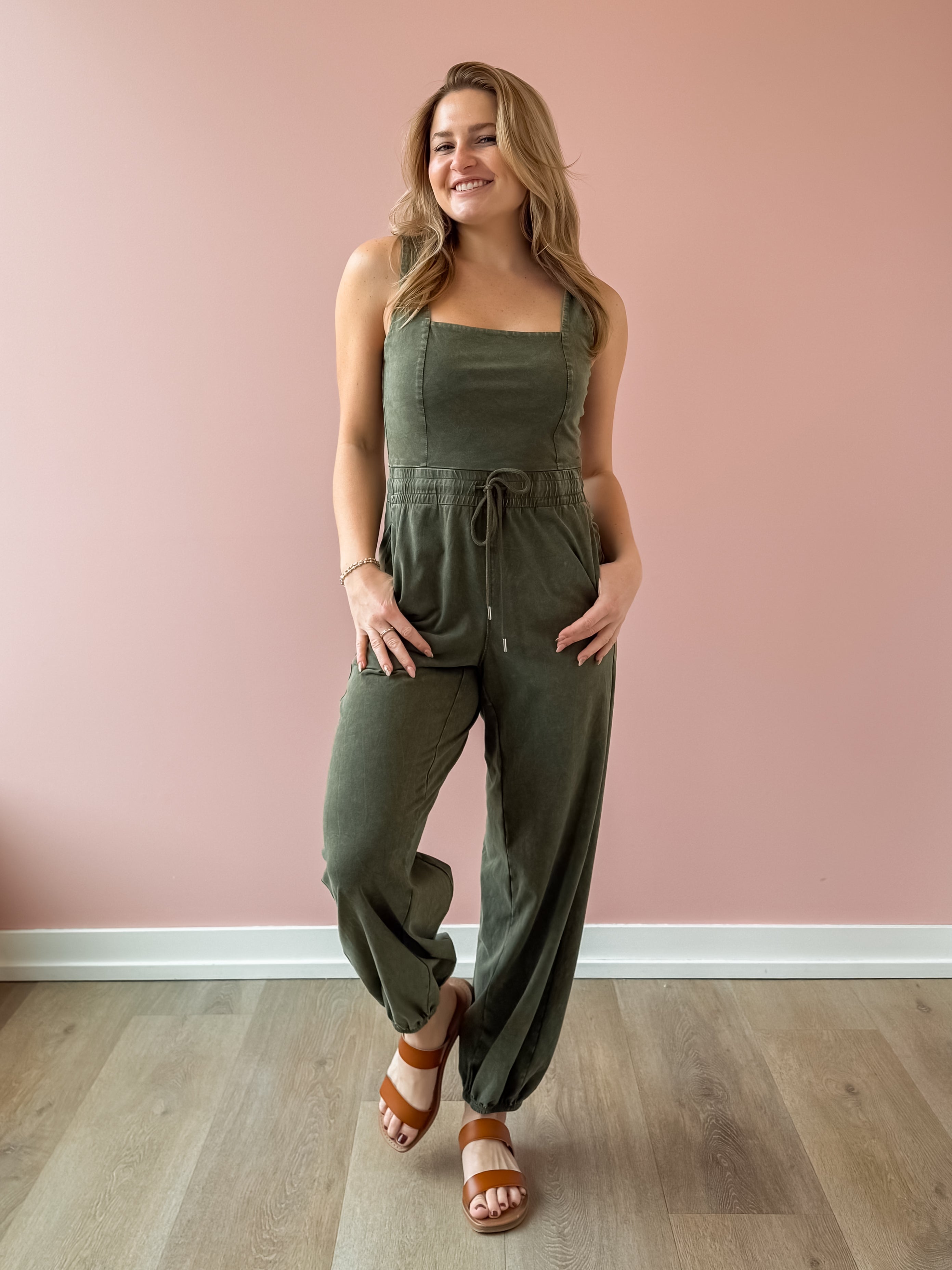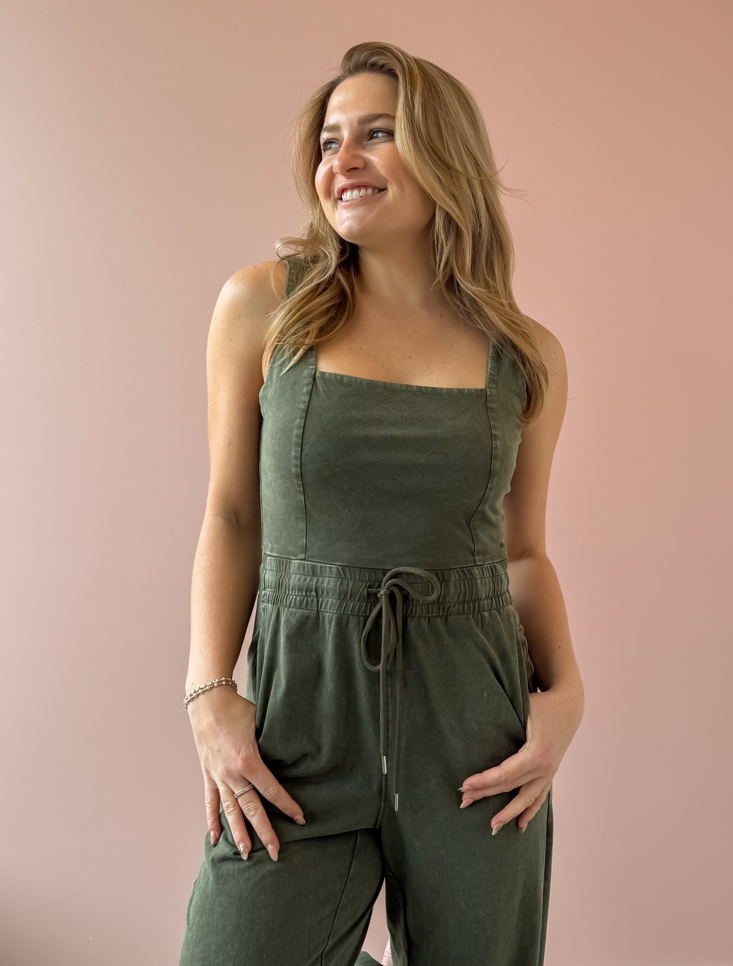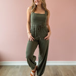 Effortlessly cool and wearable, this olive knit jumpsuit is your new one-and-done favorite. Designed with a flattering square neckline and wide shoulder straps, the fitted bodice creates a sleek silhouette before flowing into relaxed, wide-leg pants for an easy, laid-back feel. The elastic waistband with adjustable drawstring defines your shape while keeping things comfortable, and side pockets add the perfect touch of functionality. Style it with a sneakers or sandal!
