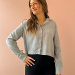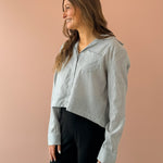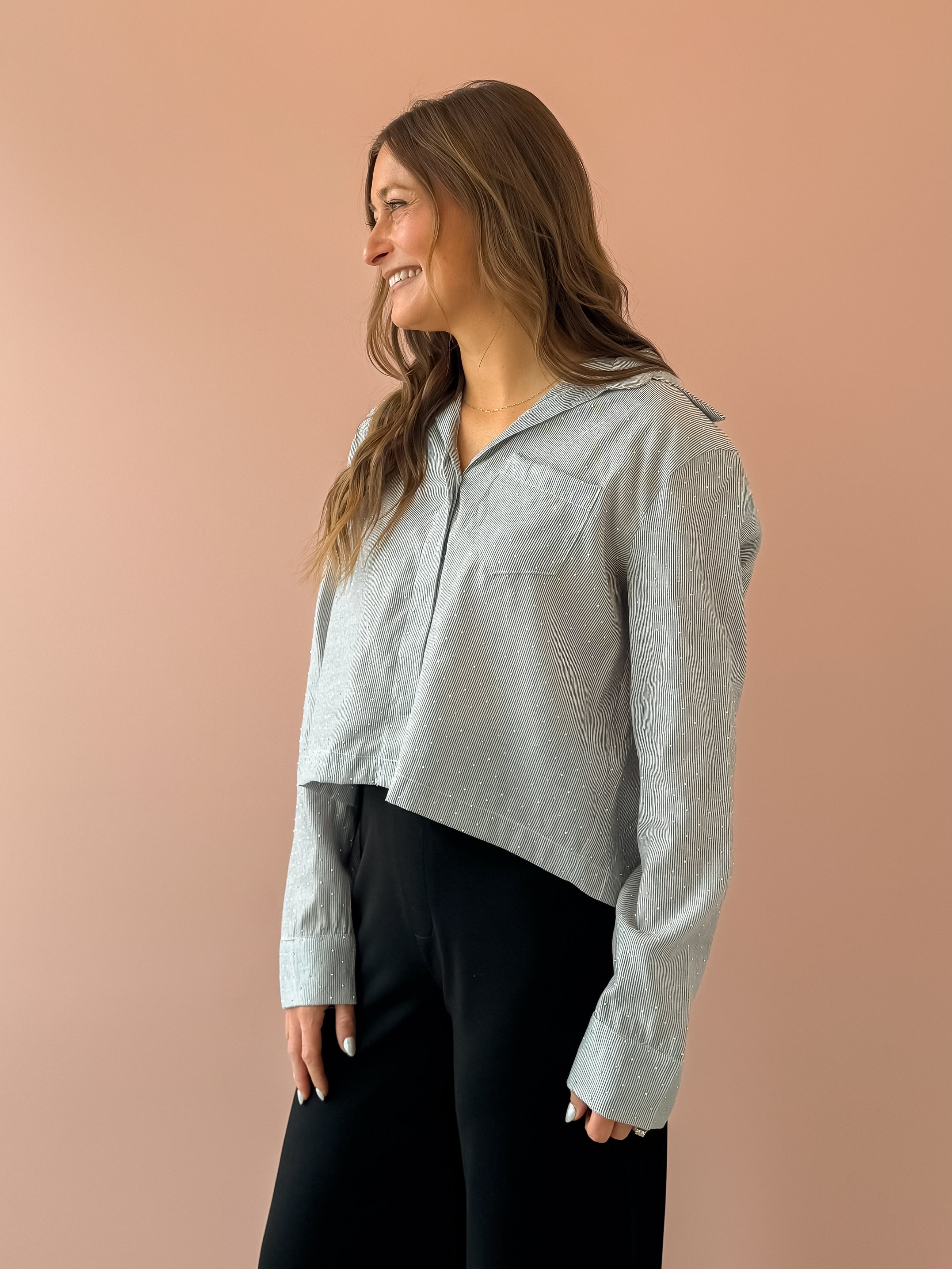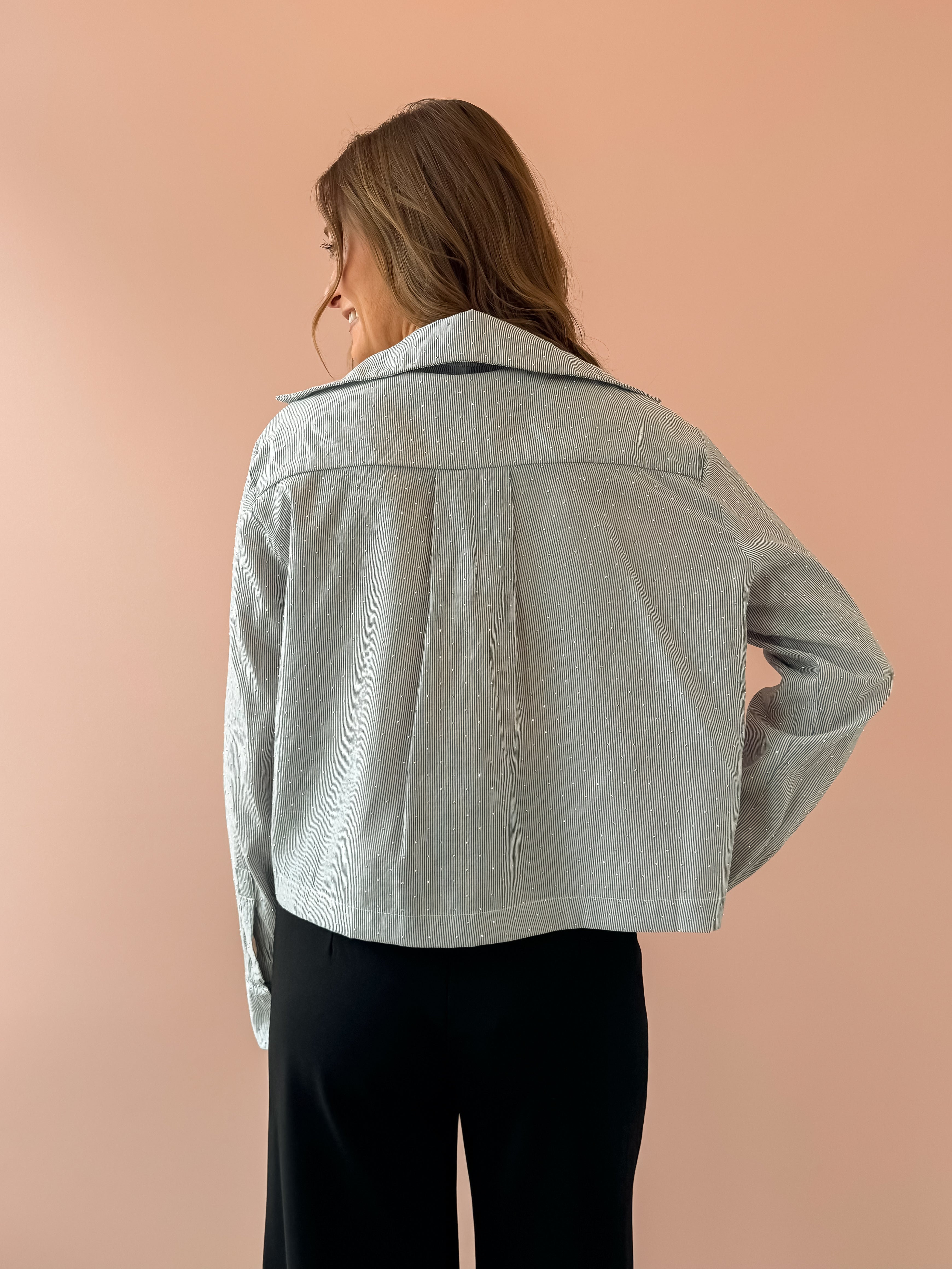 Elevate your holiday look with the Glacier Glow Top, a sophisticated cropped collared button-up that combines elegance with festive sparkle. Crafted in a soft blue adorned with shimmering rhinestones, this piece instantly transforms any occasion into something special. Pair it with a high-rise skirt and boots for a polished party ensemble that commands attention. Perfect for holiday gatherings, this top delivers the refined style and eye-catching details you need to stand out.