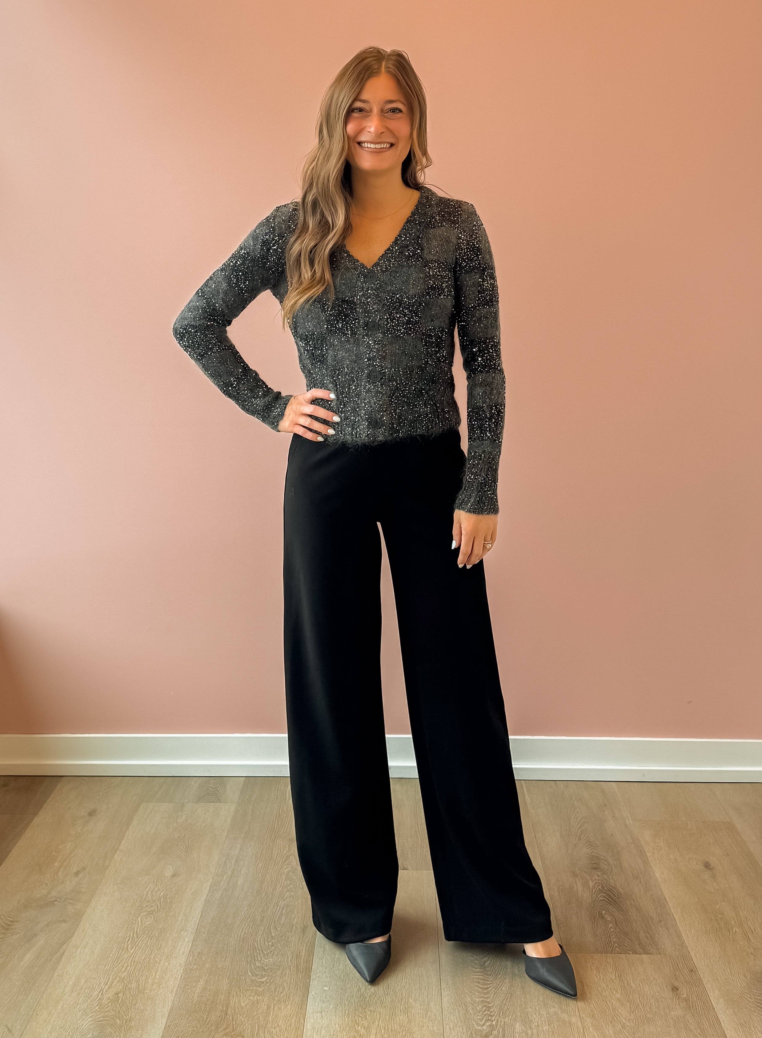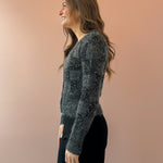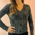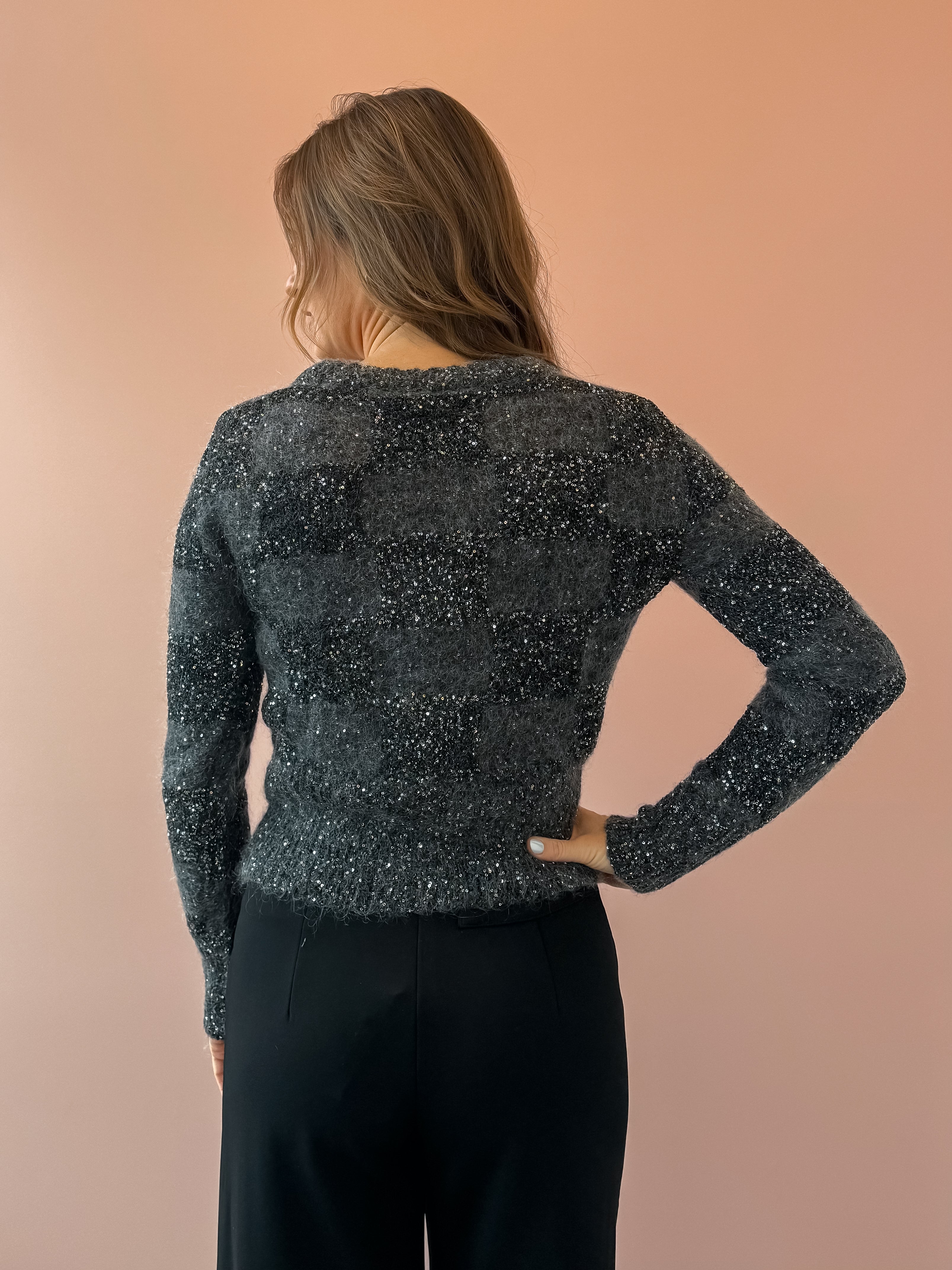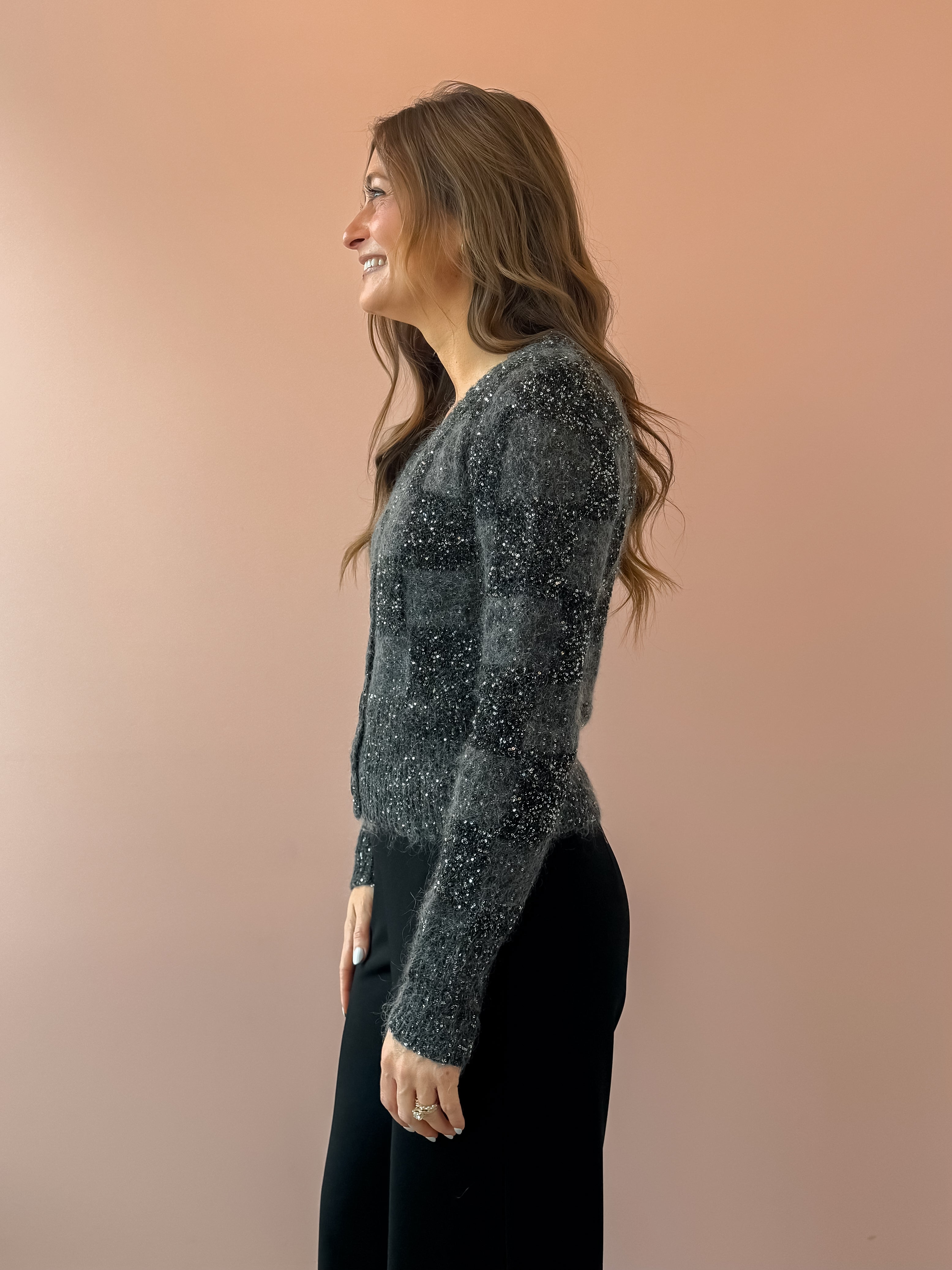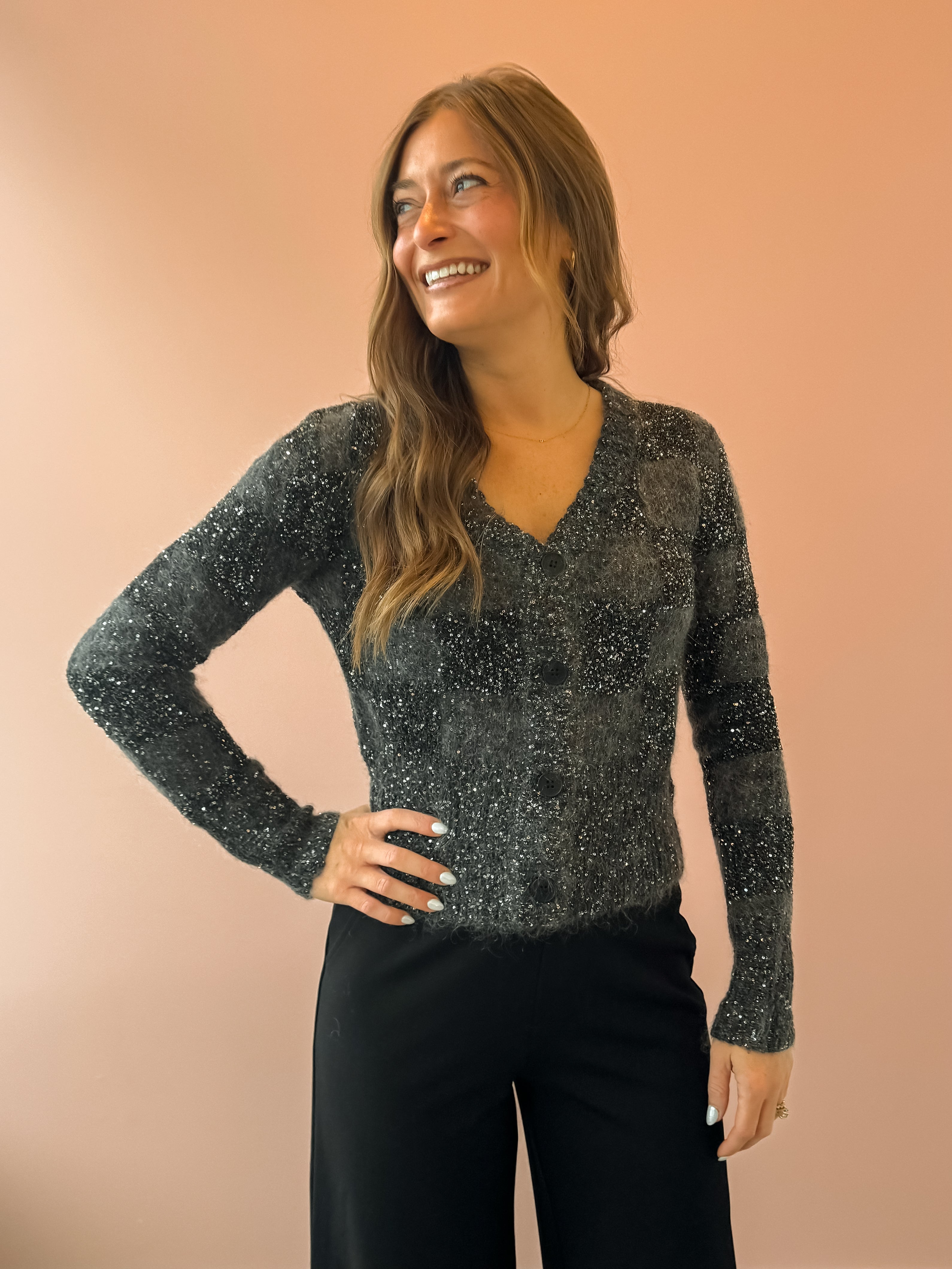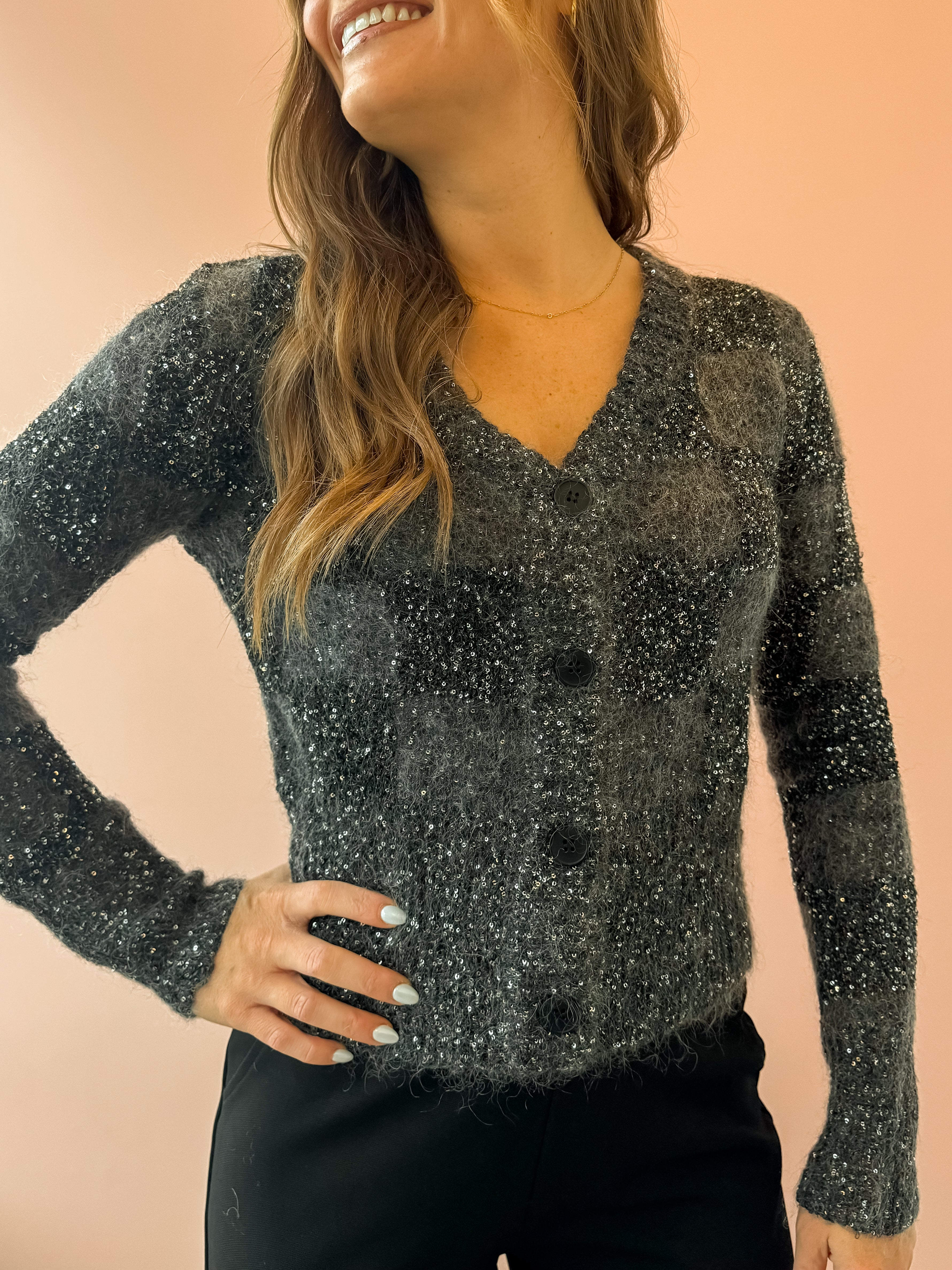 The Glenn Sequin Cardigan transforms any ensemble with its sophisticated allure. This long-sleeve button-front piece features a subtle black and grey pattern enhanced by delicate mini sequins that shimmer with every movement. Designed for versatility, it layers beautifully over dresses or shines on its own. The comfortable fit keeps you polished from day to night, making it an indispensable wardrobe staple. Pair with black pants and boots for an effortlessly chic holiday ensemble, or dress it up for evening occasions.