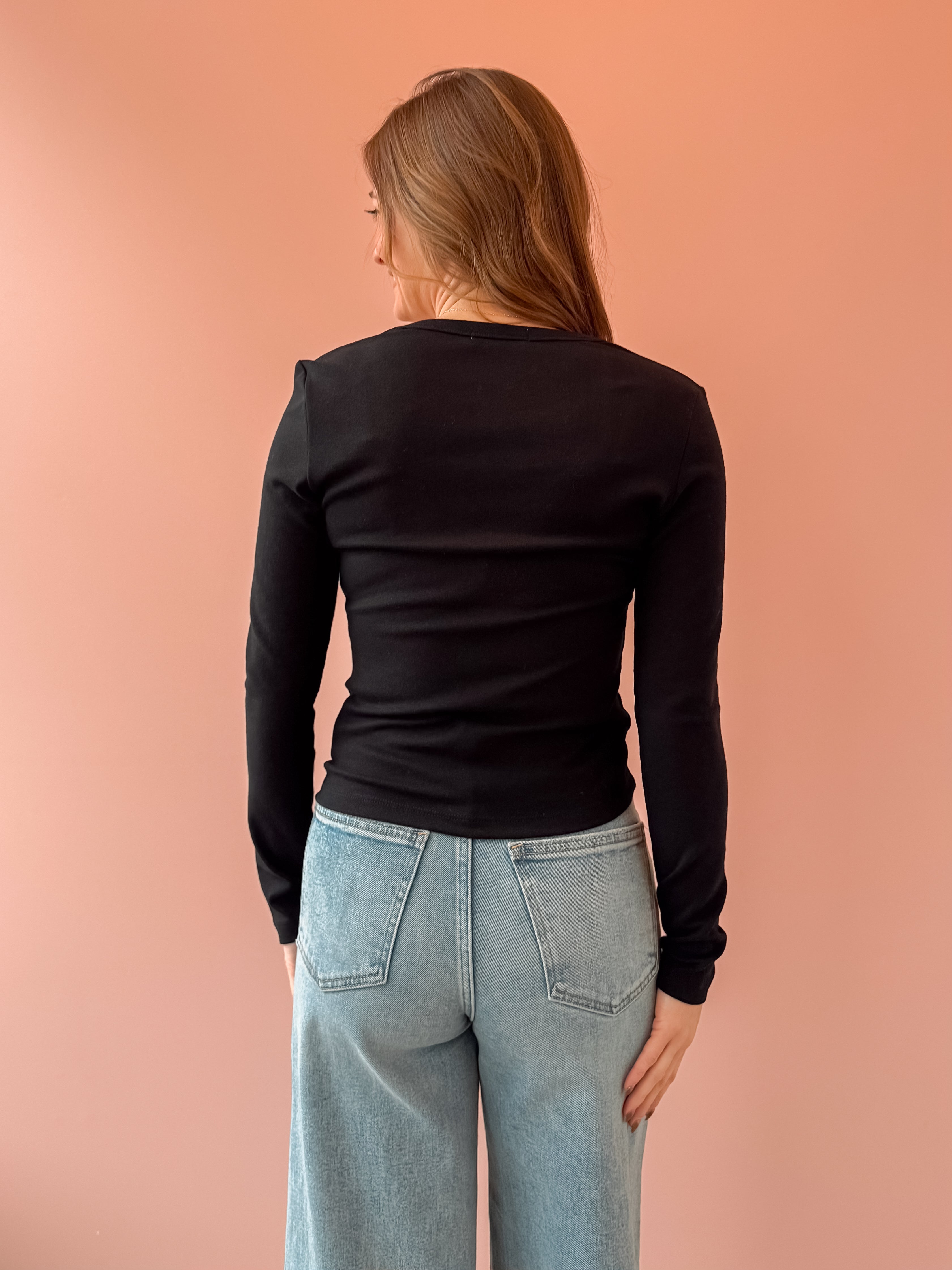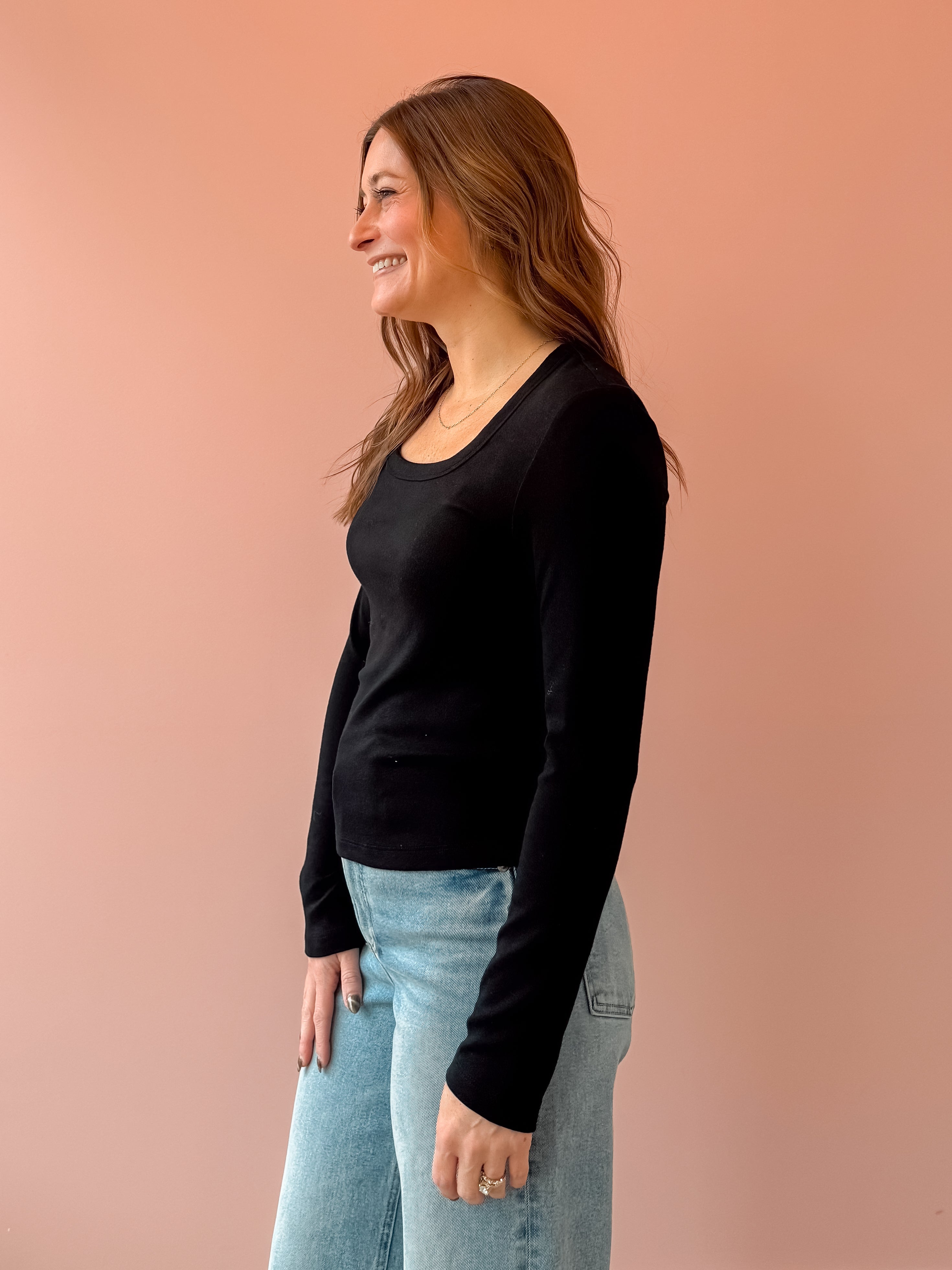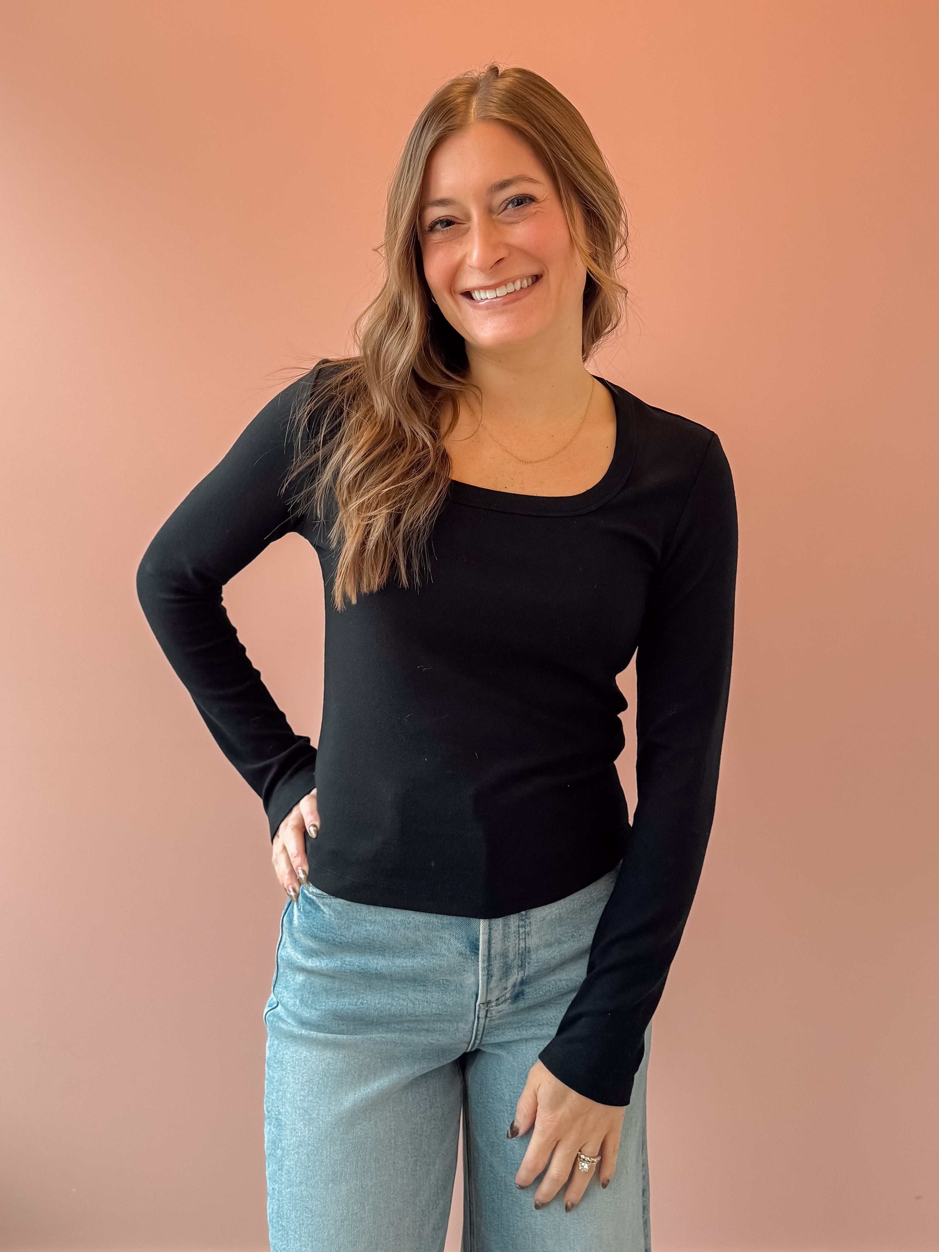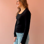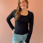The Gracie Long Sleeve is the effortless essential every wardrobe needs — soft, timeless, and endlessly versatile. Designed with a flattering scoop neckline in classic black, it’s perfect for layering or wearing on its own. Dress it up with tailored trousers, jewelry and a jacket for a polished day out, or keep it casual with high-rise denim and sneakers.