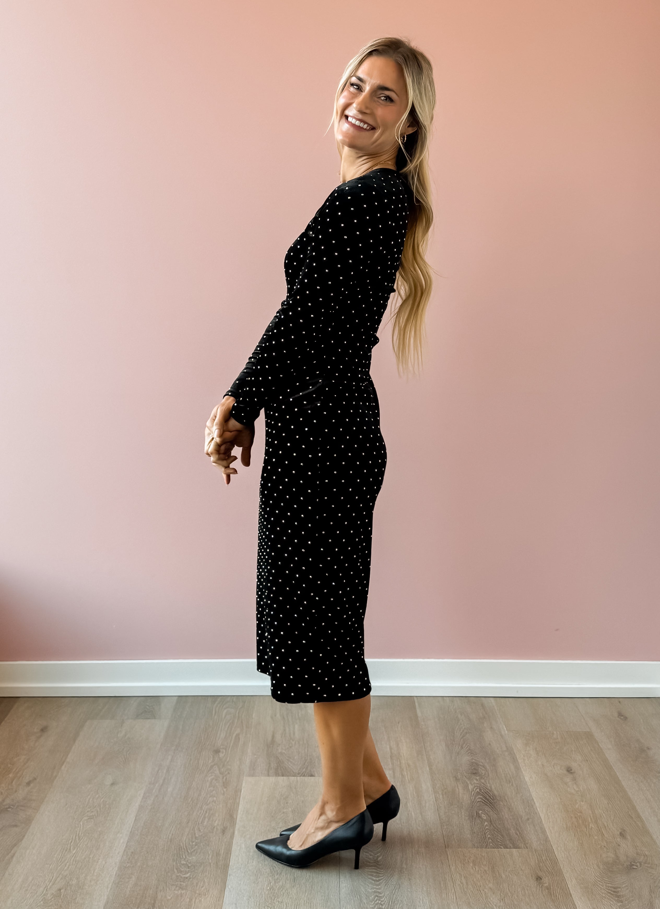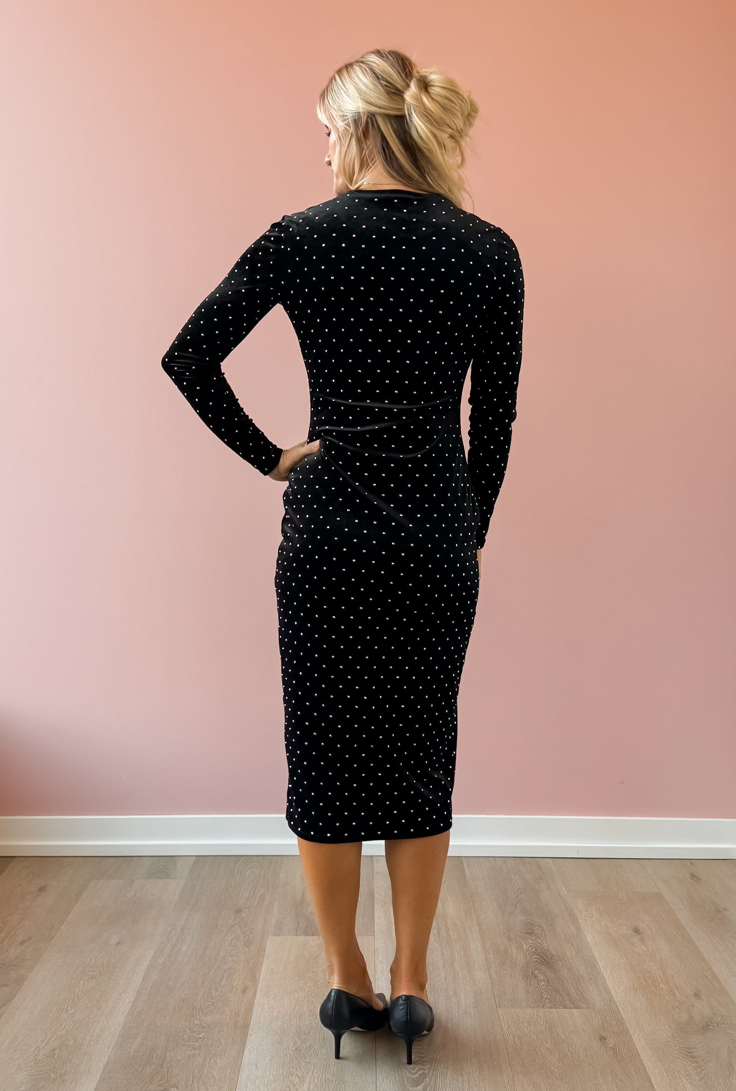The Hailee Midi Dress combines timeless elegance with a modern edge in a chic black velvet fabric. This long-sleeved midi dress features a sophisticated mock neckline and is detailed with subtle studs, adding a touch of glamour. Designed for both style and comfort, its breathable material and flattering silhouette make it perfect for upscale events or evening occasions where you want to stand out. Style with heels and jewelry for a special occasion!