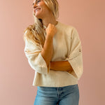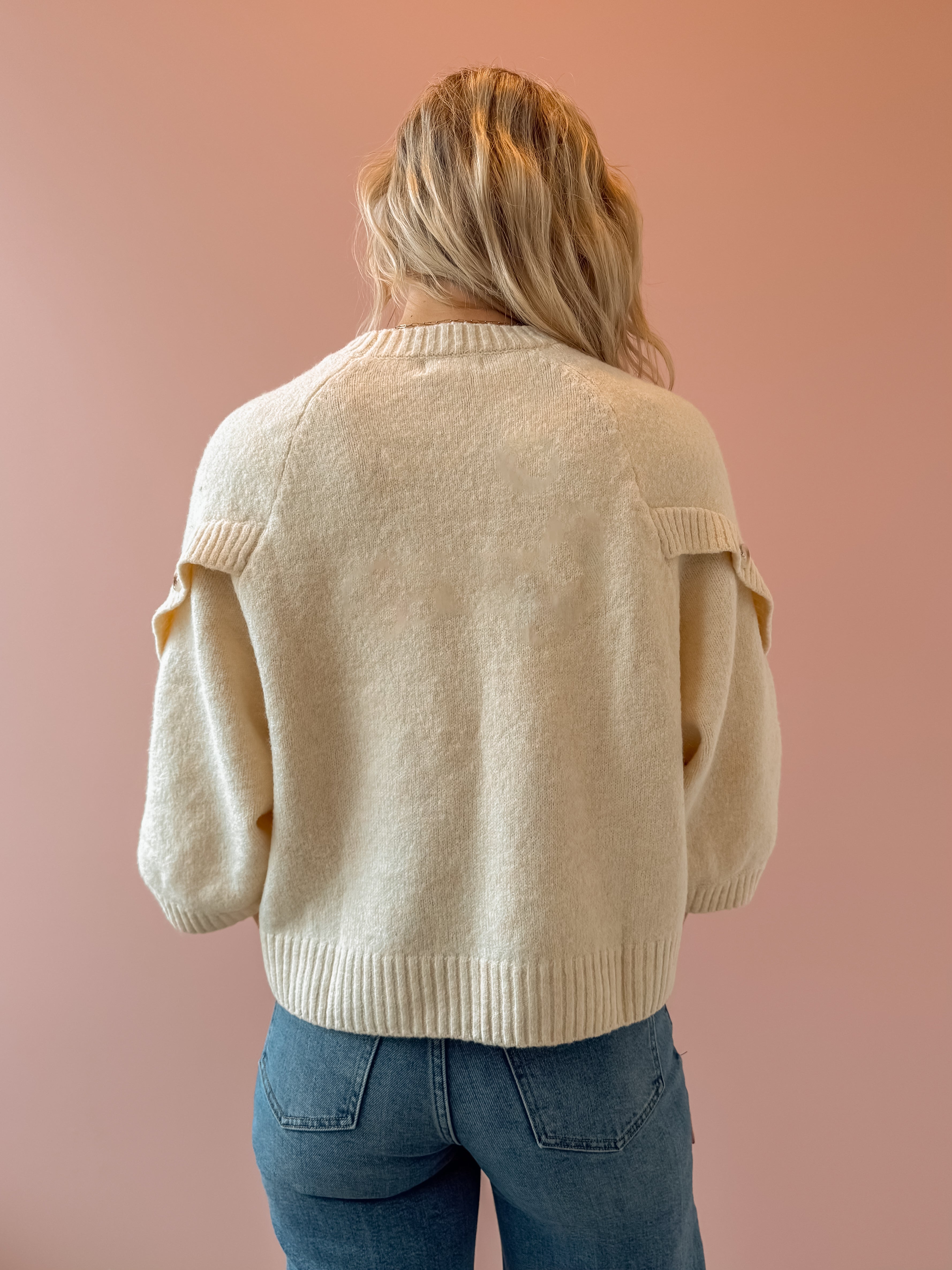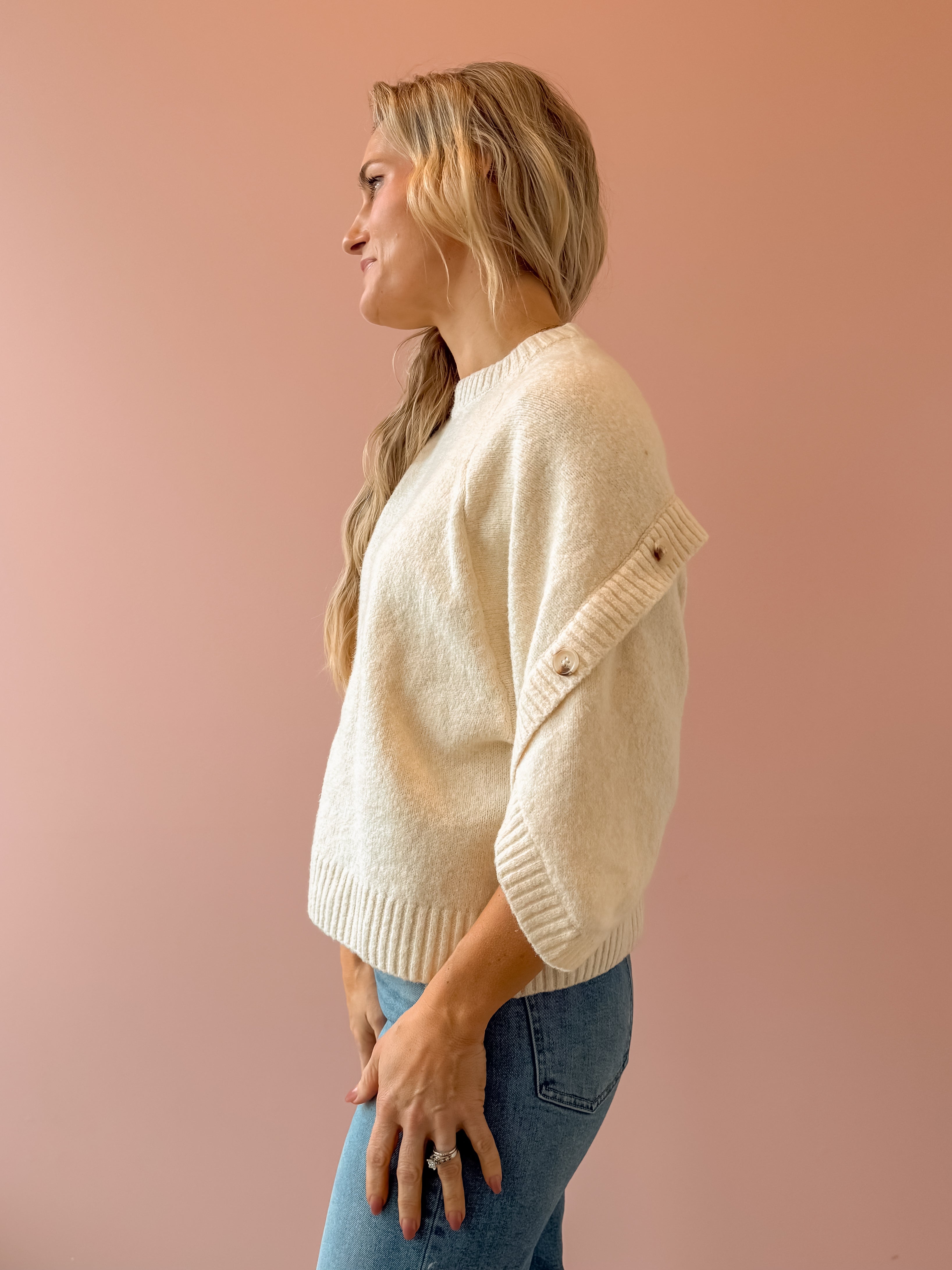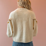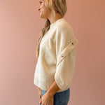 The Harper Sweater is a soft ivory knit designed with an oversized, relaxed fit and a classic crew neckline for effortless wear. Featuring statement sleeves finished with brown and beige button detailing, this piece adds a unique, elevated touch while still feeling timeless. It hits right at the hem, making it easy to style with denim, tailored trousers, or layered over a dress for a cozy yet refined look.