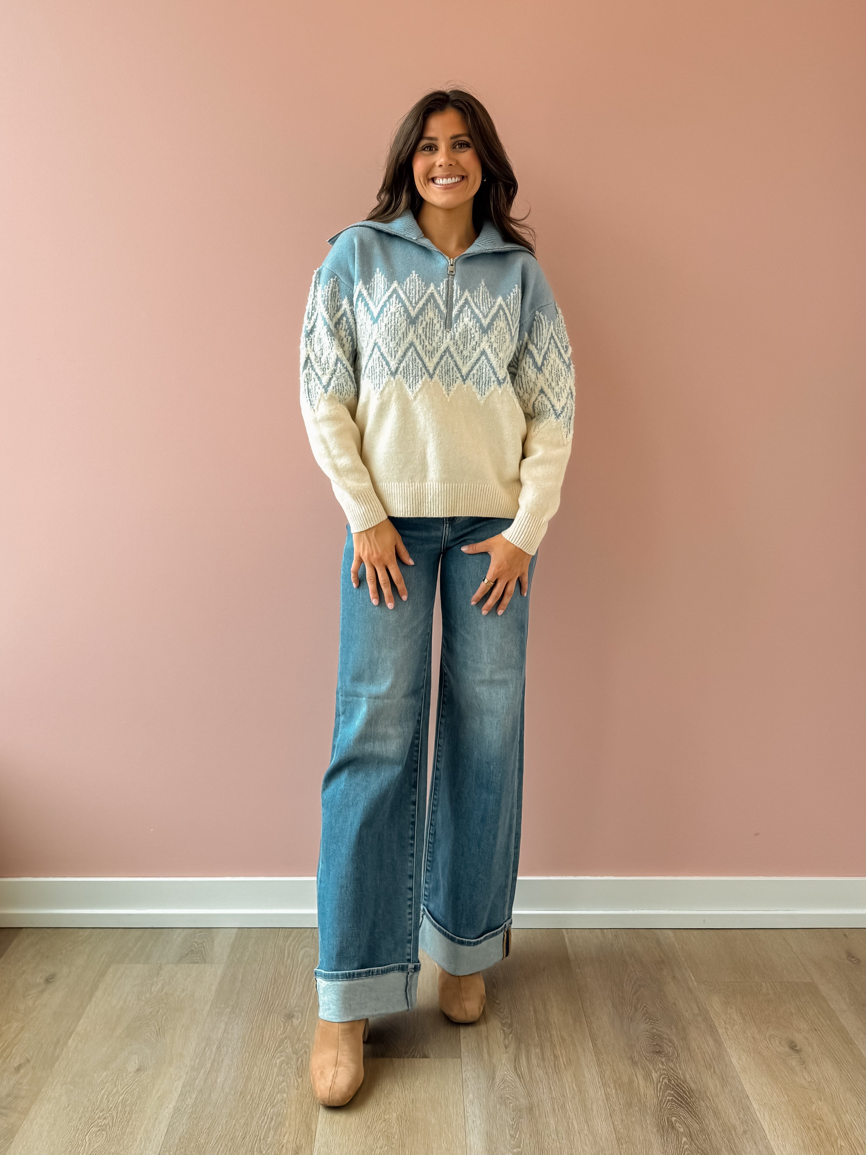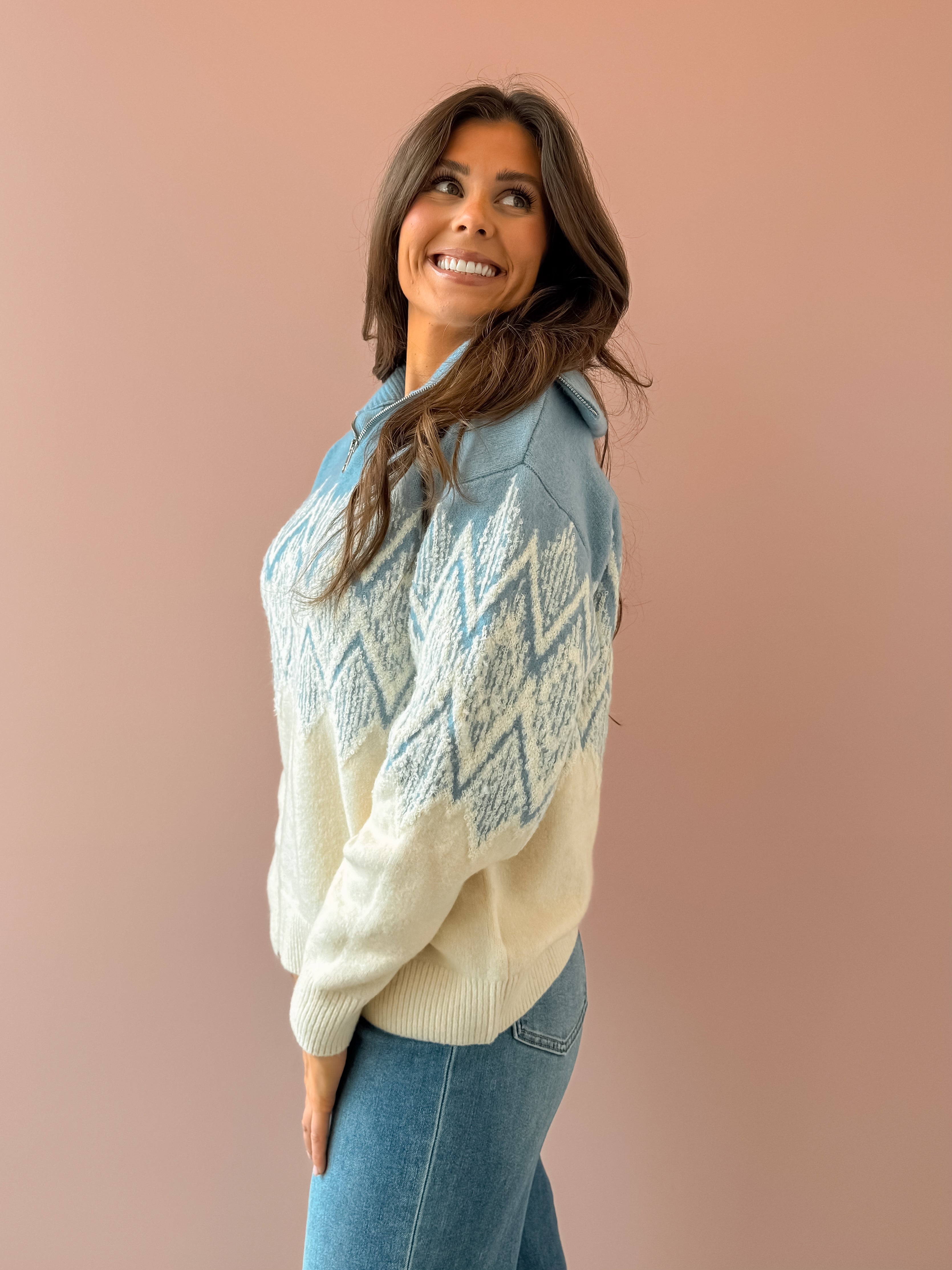 Embrace cozy style with the Hedda Fairisle Half Zip, designed for a relaxed fit and effortless layering. Its soft, chunky knit and raglan sleeves provide warmth and mobility, making it perfect to wear over your favorite essentials. This winter knit adds a striking pattern and comfort to your wardrobe, ensuring you stand out while staying snug during chilly days. Style with leggings and sneakers on the go!