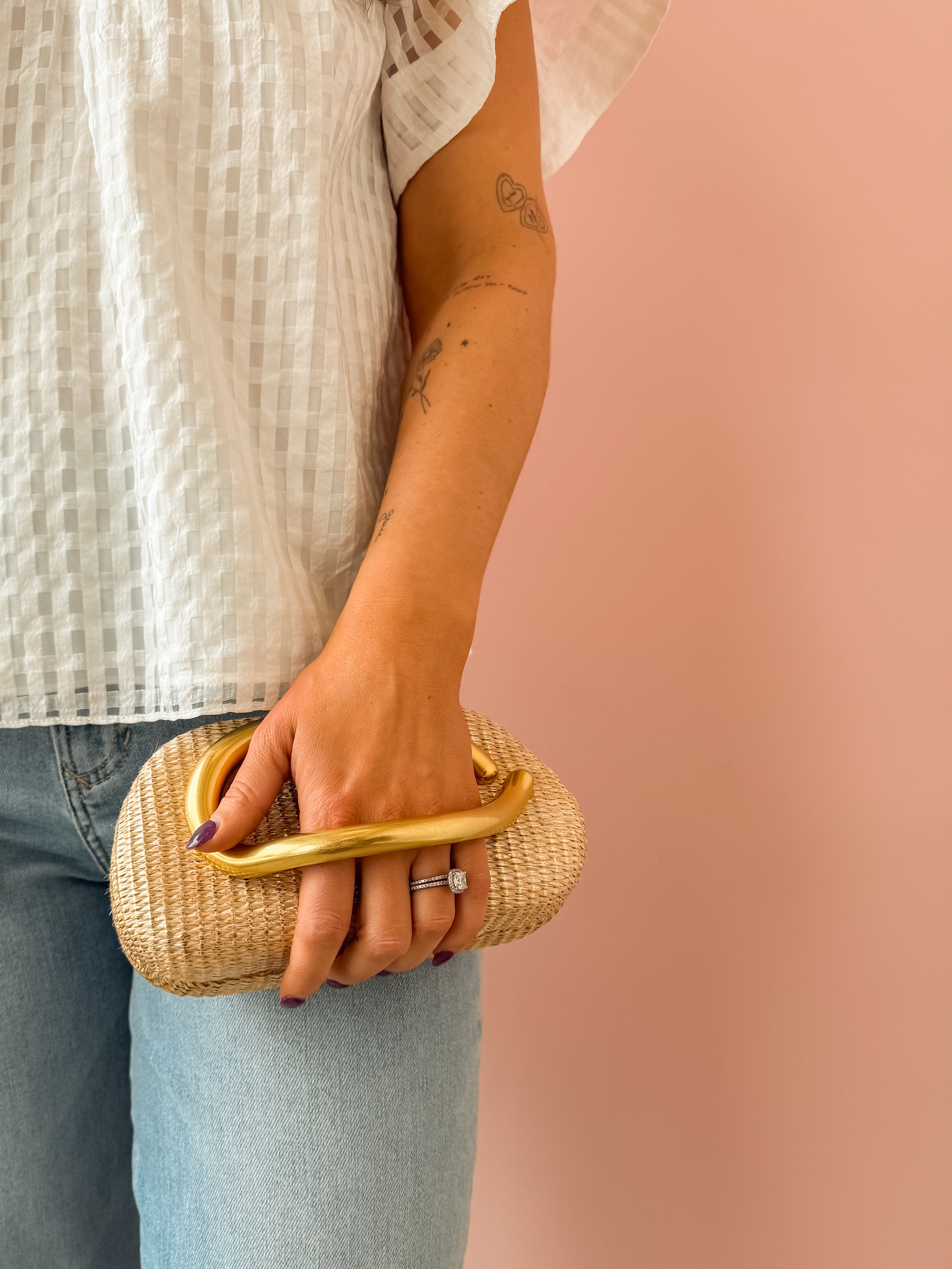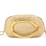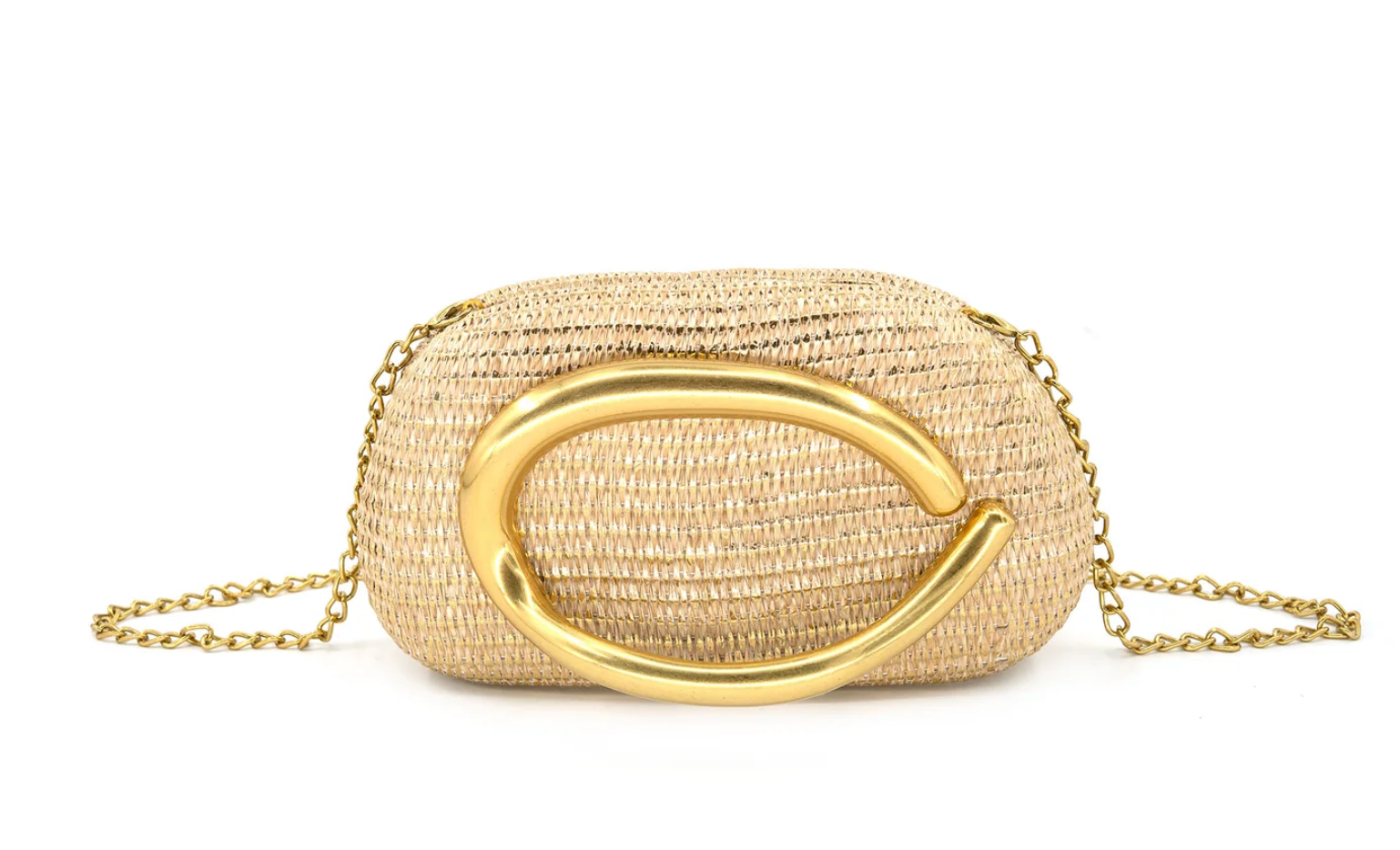 Stun on a night out or event with this versatile hard-shelled clutch that seamlessly transitions from handheld to crossbody in seconds. The slim gold chain strap offers effortless styling flexibility, while distinctive structural detailing on the front serves as both a statement design element and functional handle. Also available in black and ivory.
