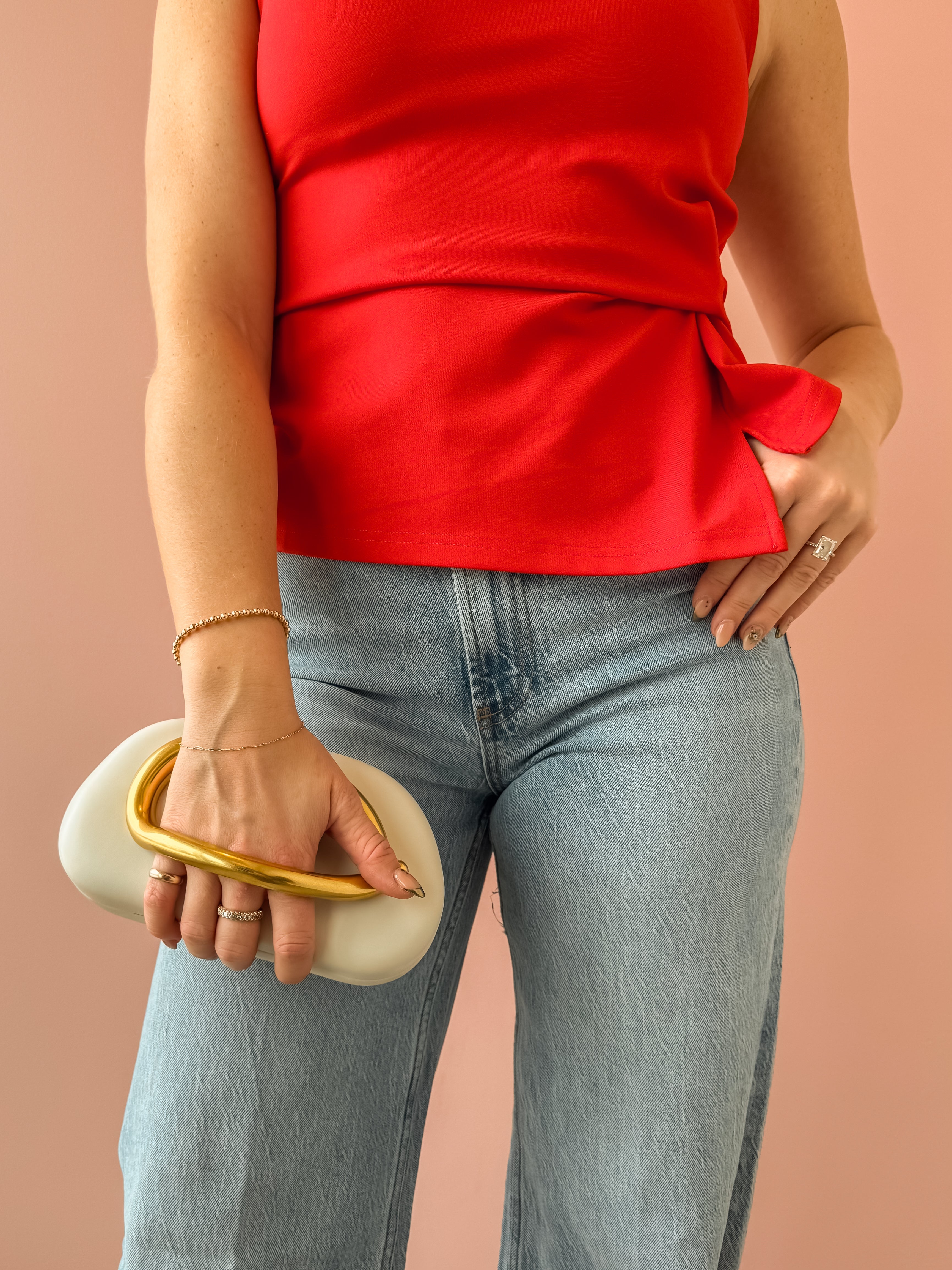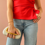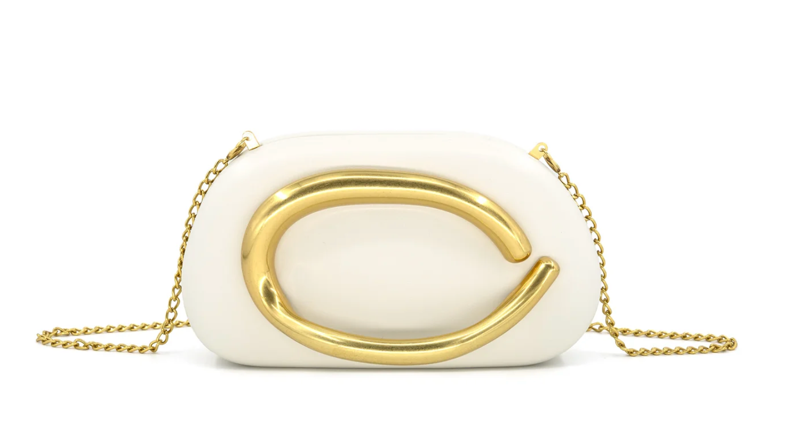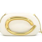 Stun on a night out or event with this versatile hard-shelled clutch that seamlessly transitions from handheld to crossbody in seconds. The slim gold chain strap offers effortless styling flexibility, while distinctive structural detailing on the front serves as both a statement design element and functional handle. Also available in black and natural.