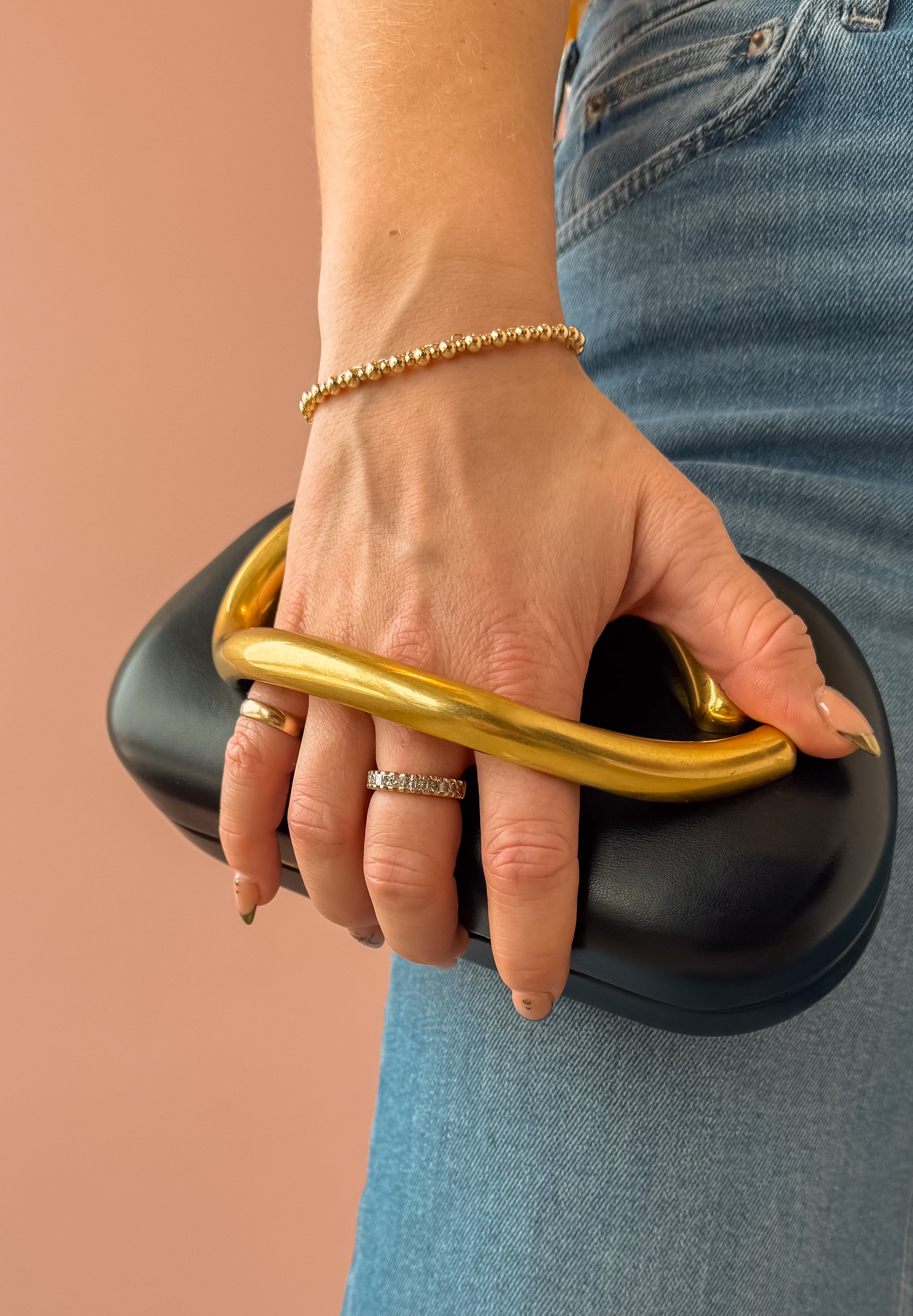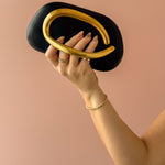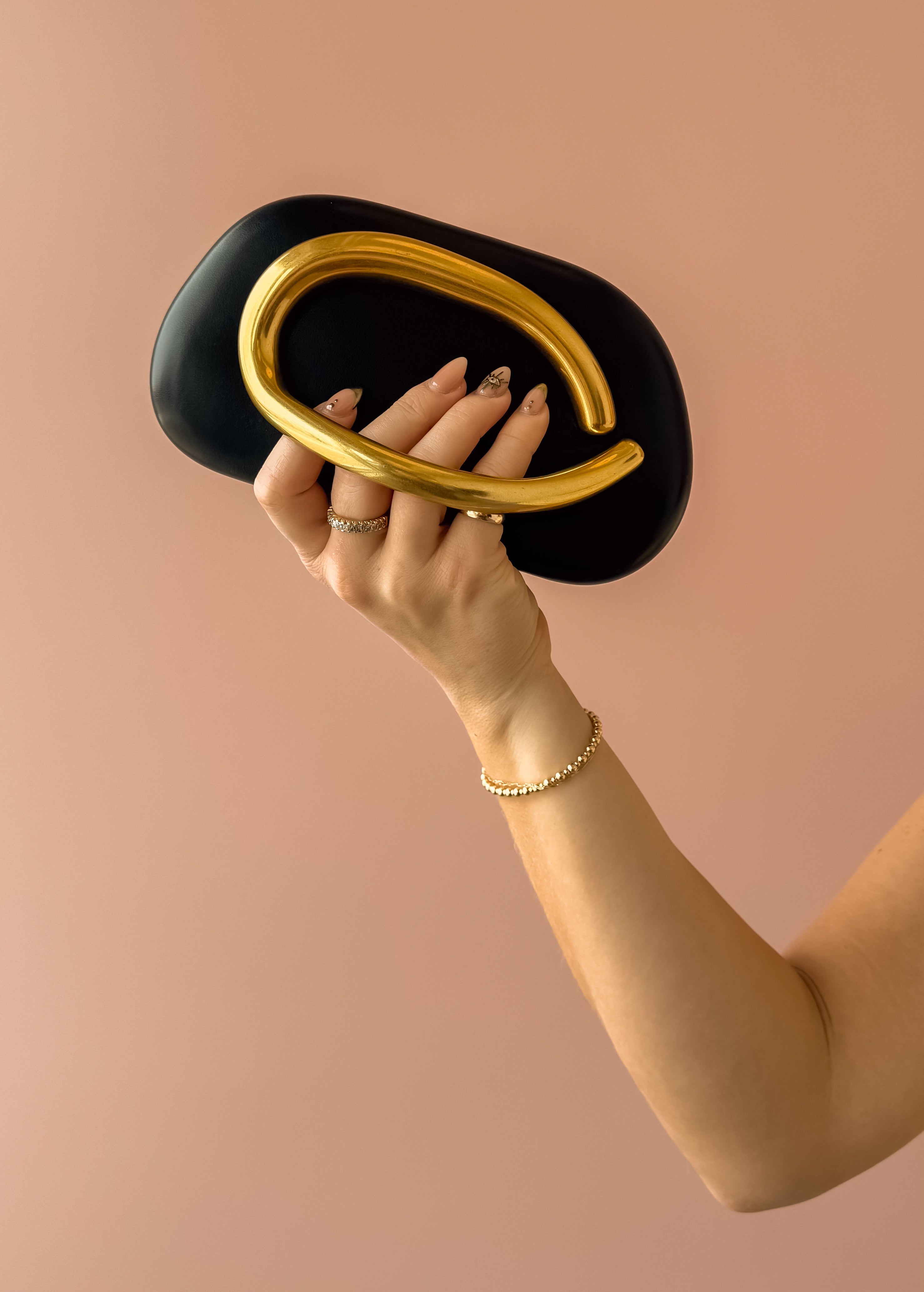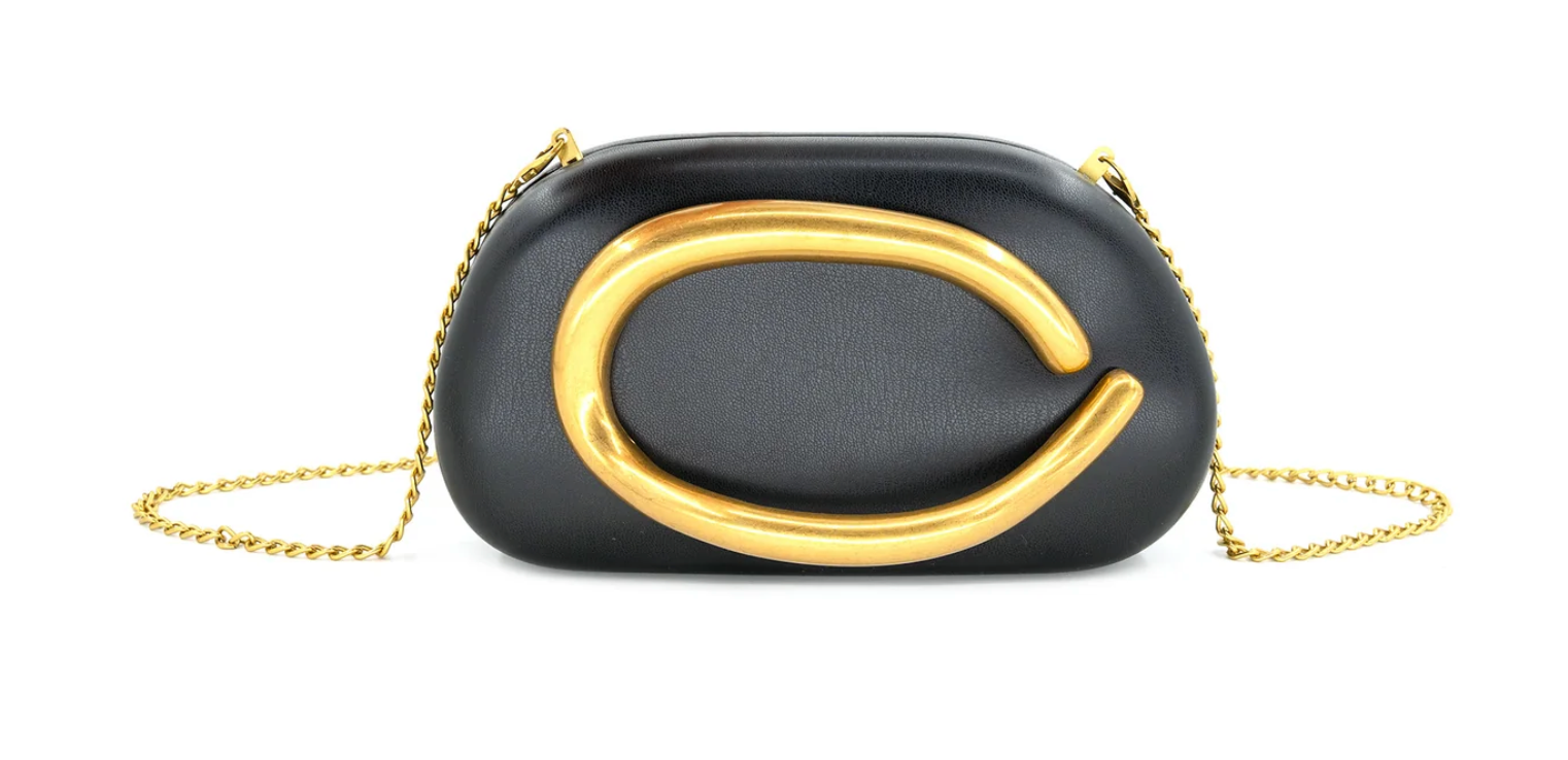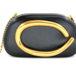 Stun on a night out or event with this versatile hard-shelled clutch that seamlessly transitions from handheld to crossbody in seconds. The slim gold chain strap offers effortless styling flexibility, while distinctive structural detailing on the front serves as both a statement design element and functional handle. Also available in natural and ivory.