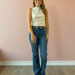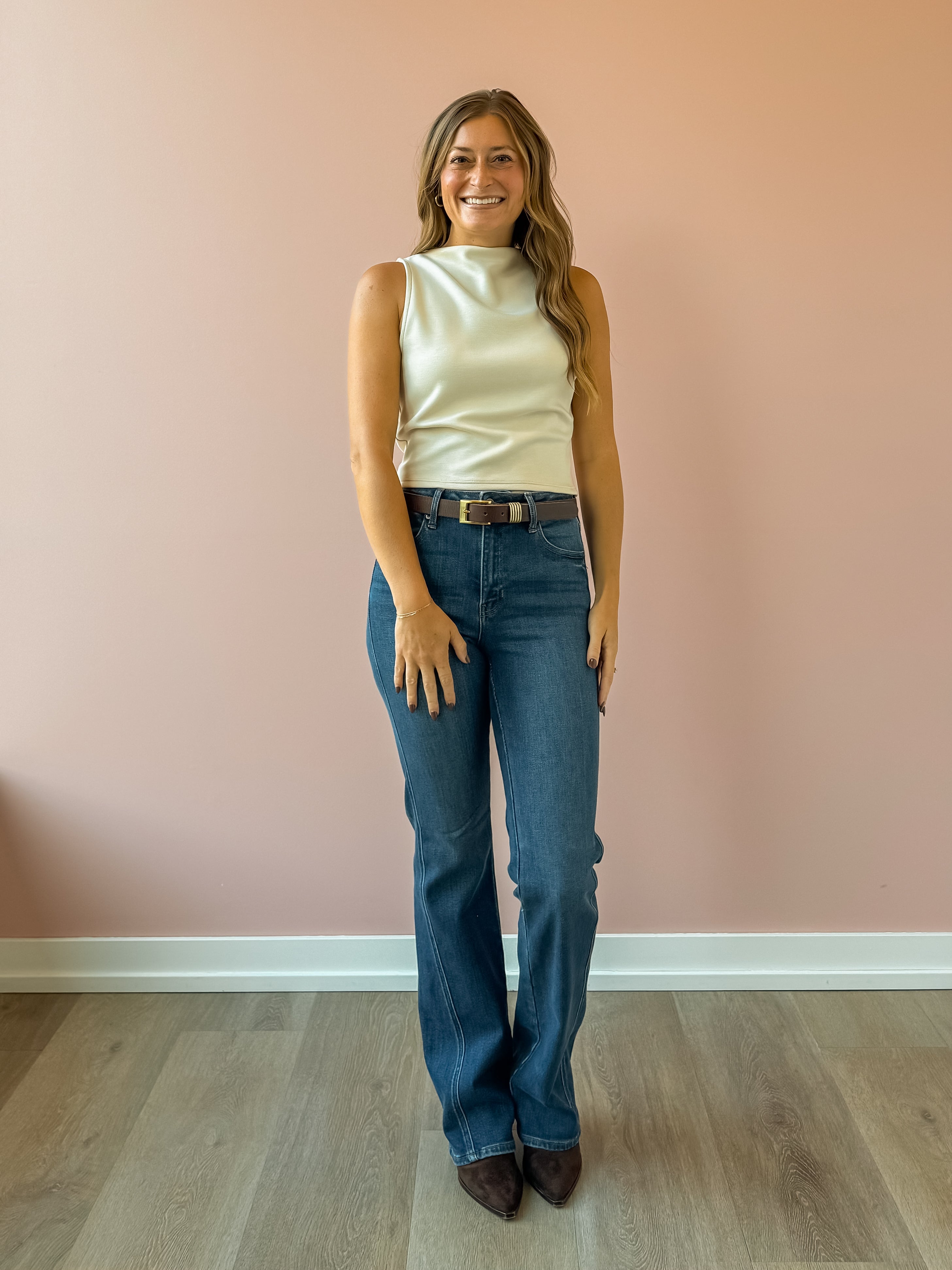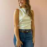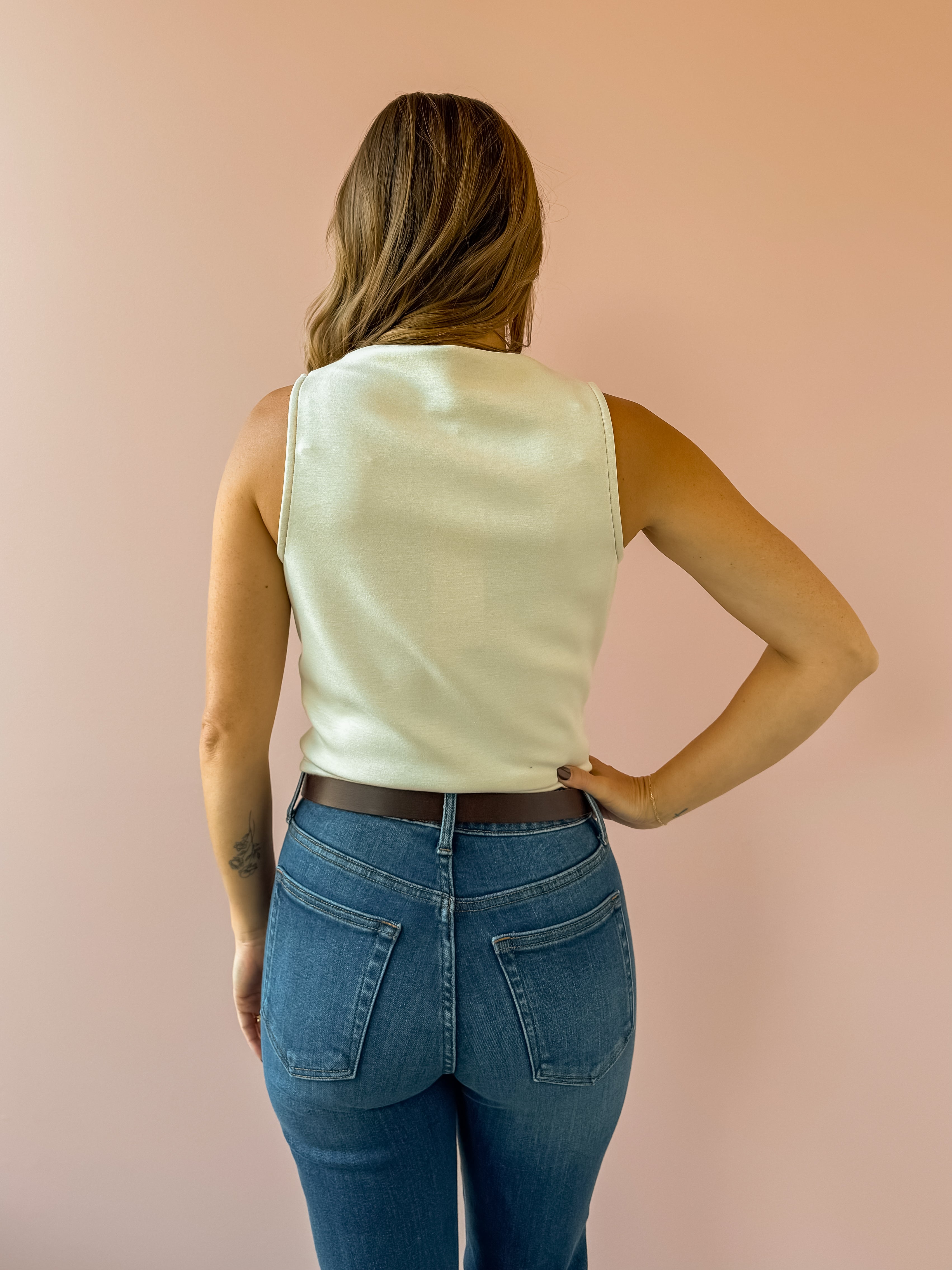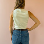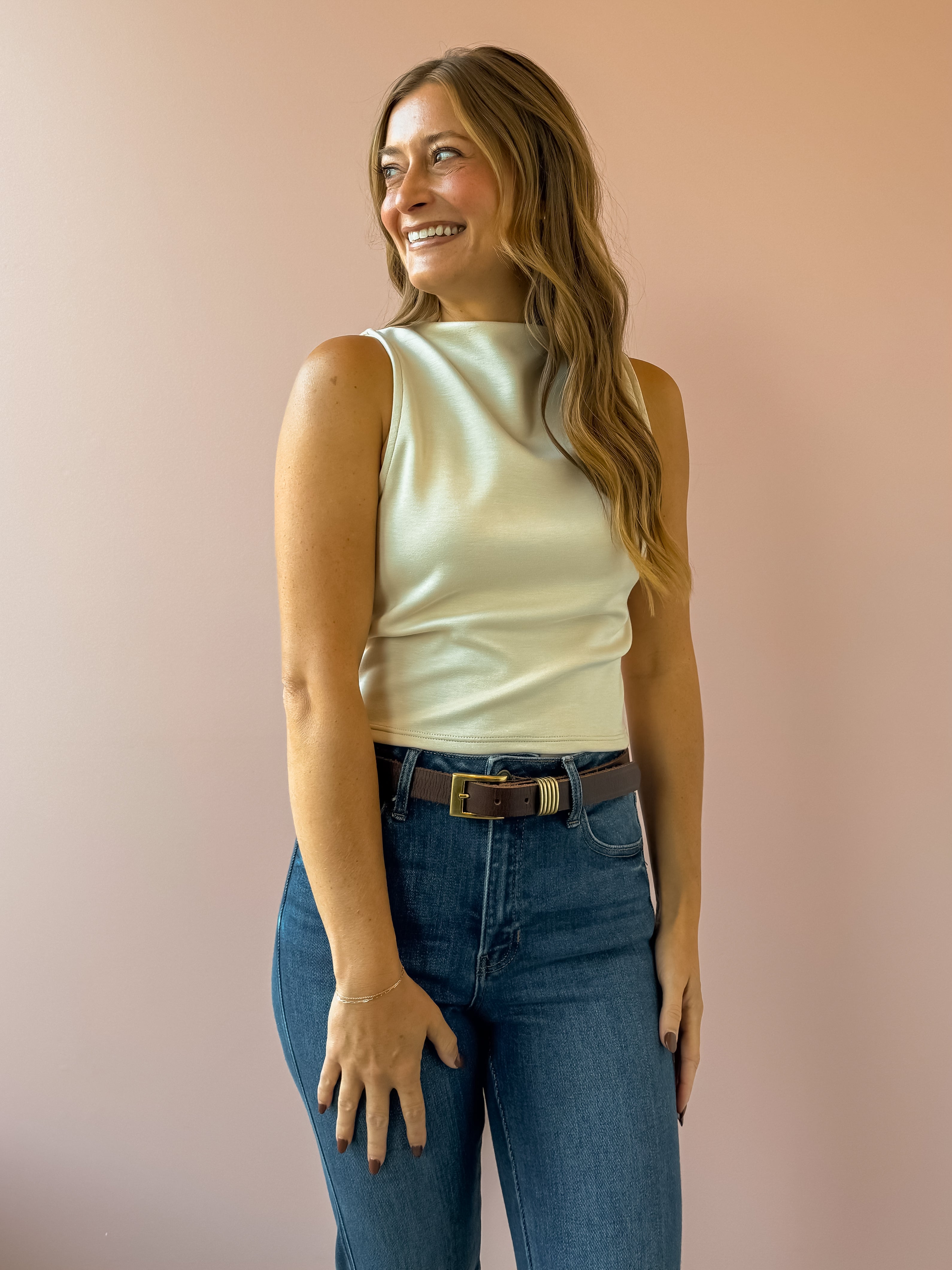 Elevate your wardrobe with the Hustle Crop Top, designed with a flattering sleeveless cut and a chic high neckline. Its soft ivory hue offers versatile styling options—perfect for pairing with tailored trousers and loafers at work or a mini skirt for an effortlessly stylish date night look.