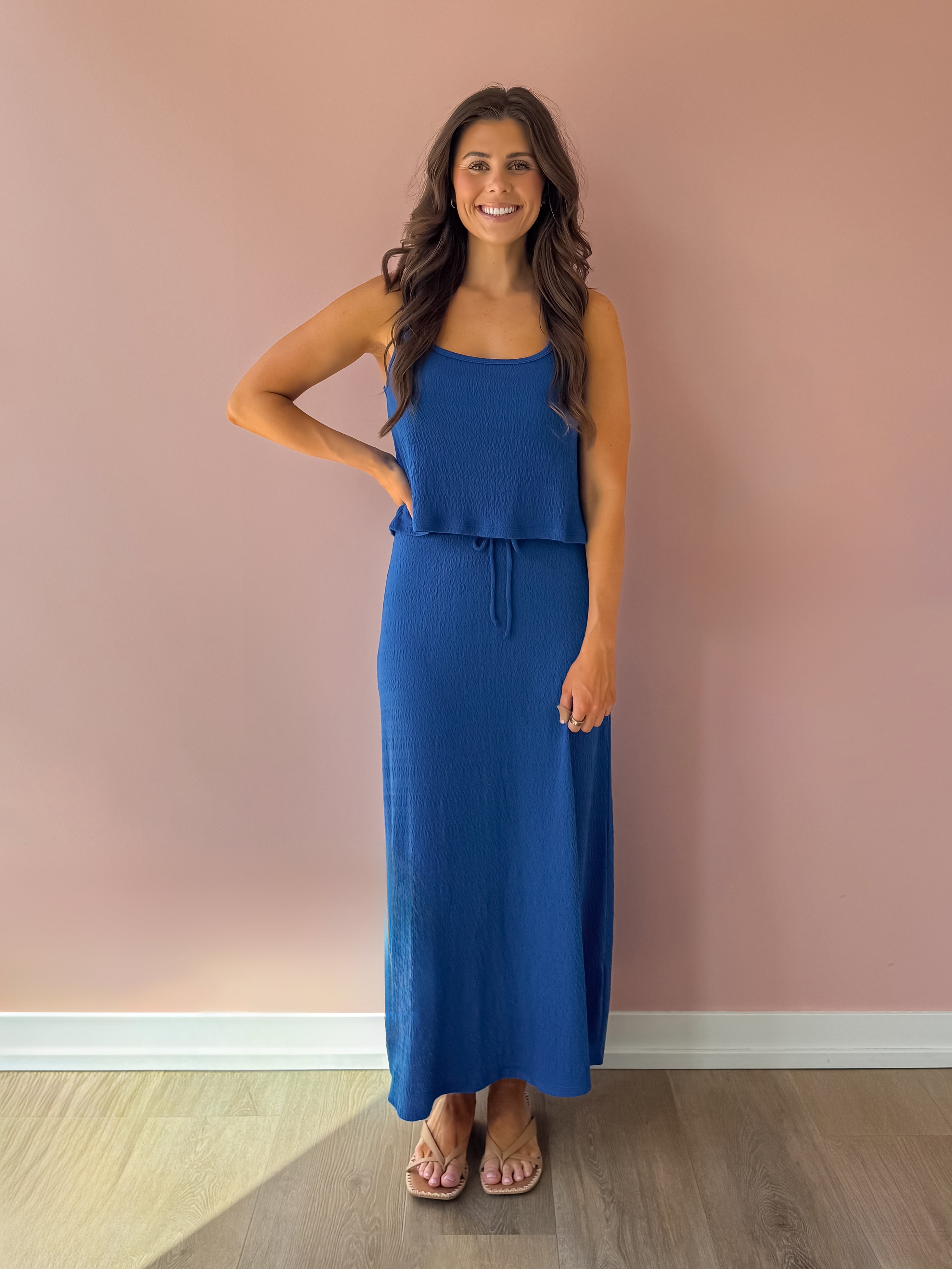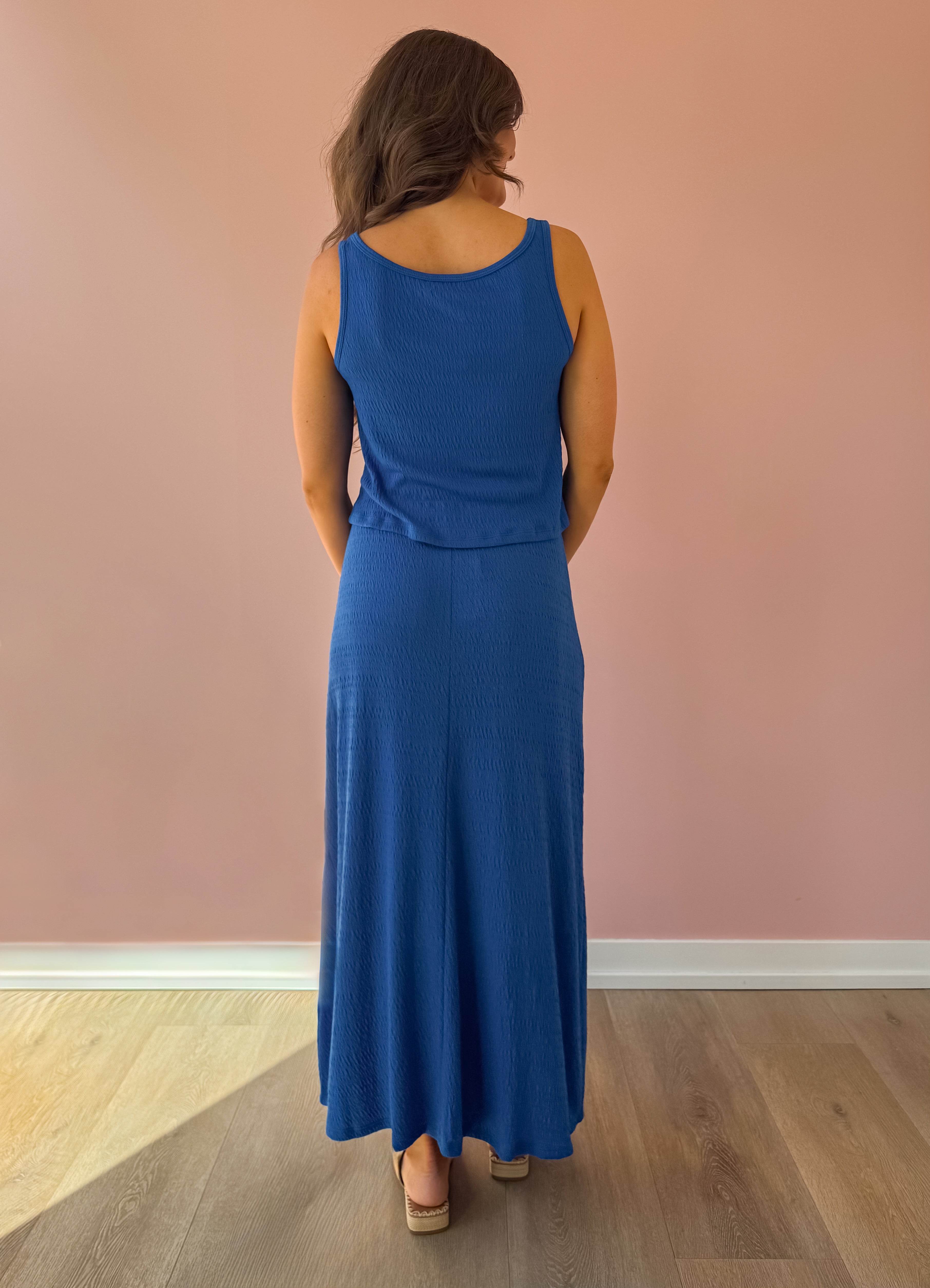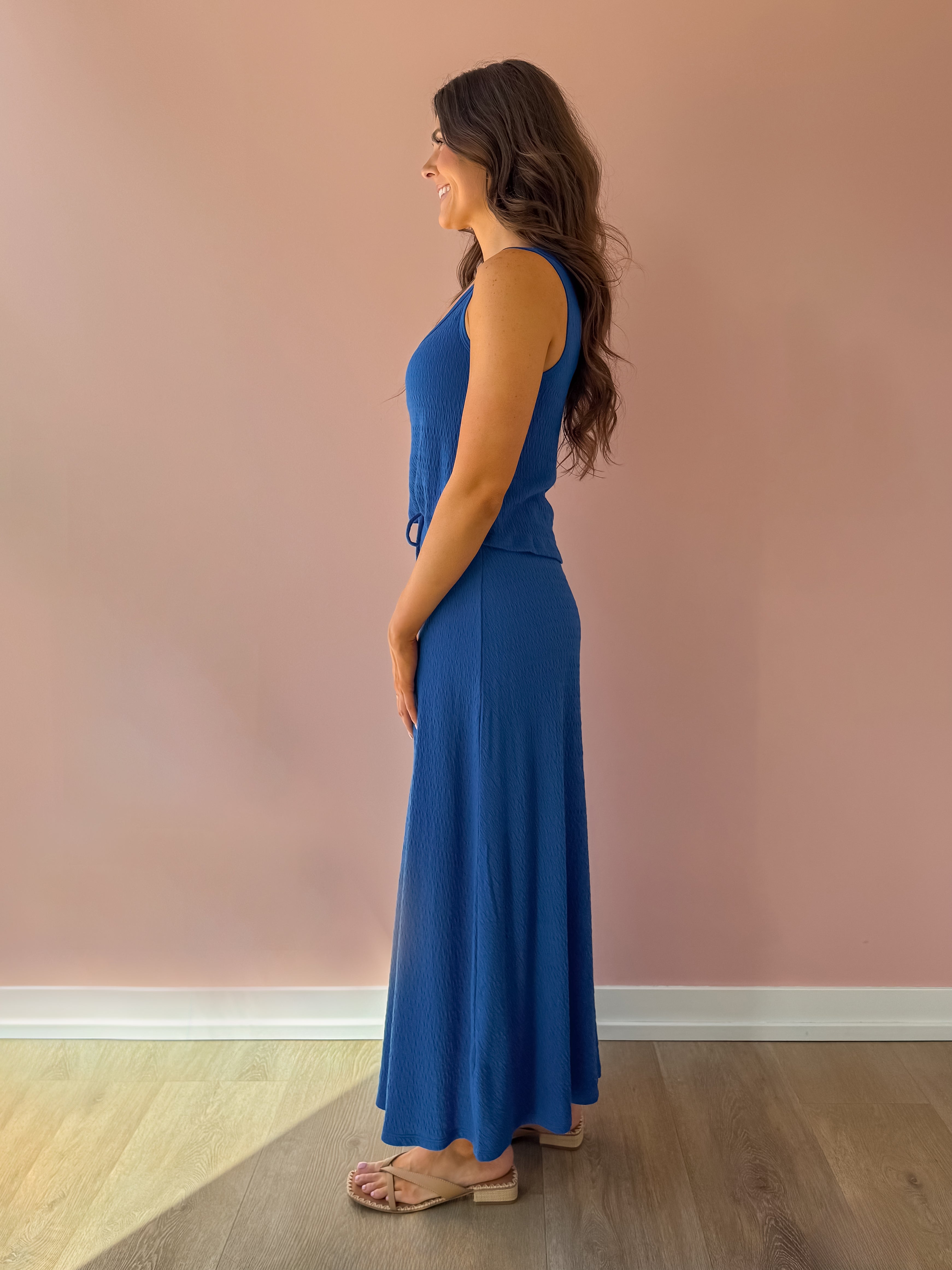 Effortless and easy to wear, the Idris Maxi Skirt is crafted in a textured puckered knit with a soft, comfortable feel. Designed with an elastic tie waist for a flexible fit and a back slit for added movement, it’s the kind of piece you’ll reach for again and again. The relaxed silhouette gives it a flattering, laid-back look while still feeling elevated. Pair it with the matching Joanna Tank and a simple sandal for a coordinated, effortlessly polished look.