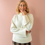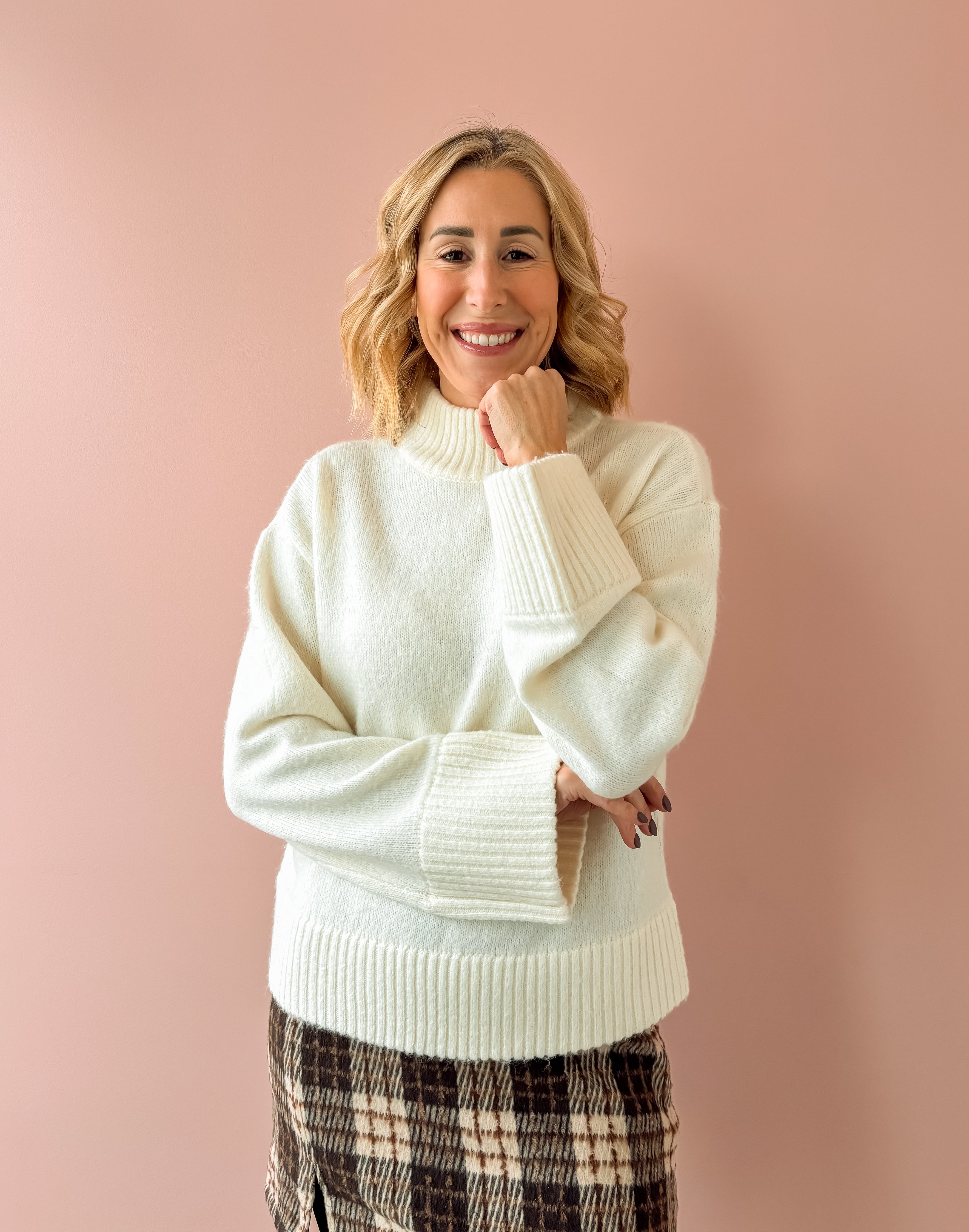 Elevate your holiday wardrobe with the Ivy Sweater, a timeless piece that effortlessly transitions from casual to elegant. Featuring a flattering mock neck and dropped shoulders for a relaxed, modern silhouette, this sweater showcases distinctive wide ribbing at the neckline, cuffs, and hem that adds sophisticated texture and visual interest. Crafted in a luxurious ivory tone, it's perfect for styling—pair it with a skirt and heels for a polished holiday look, or dress it down with your favorite jeans and loafers!