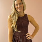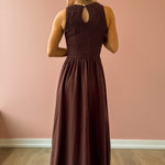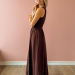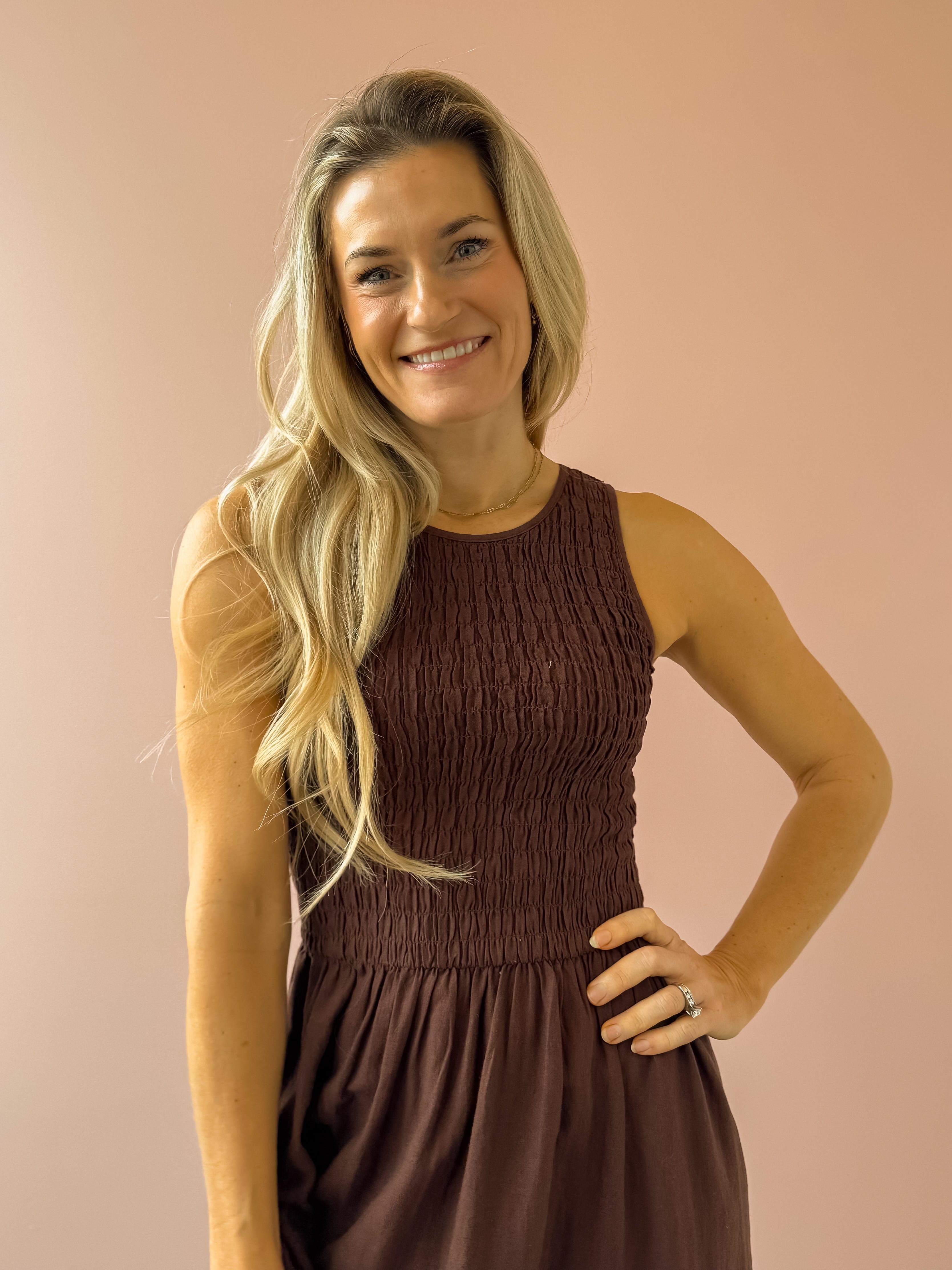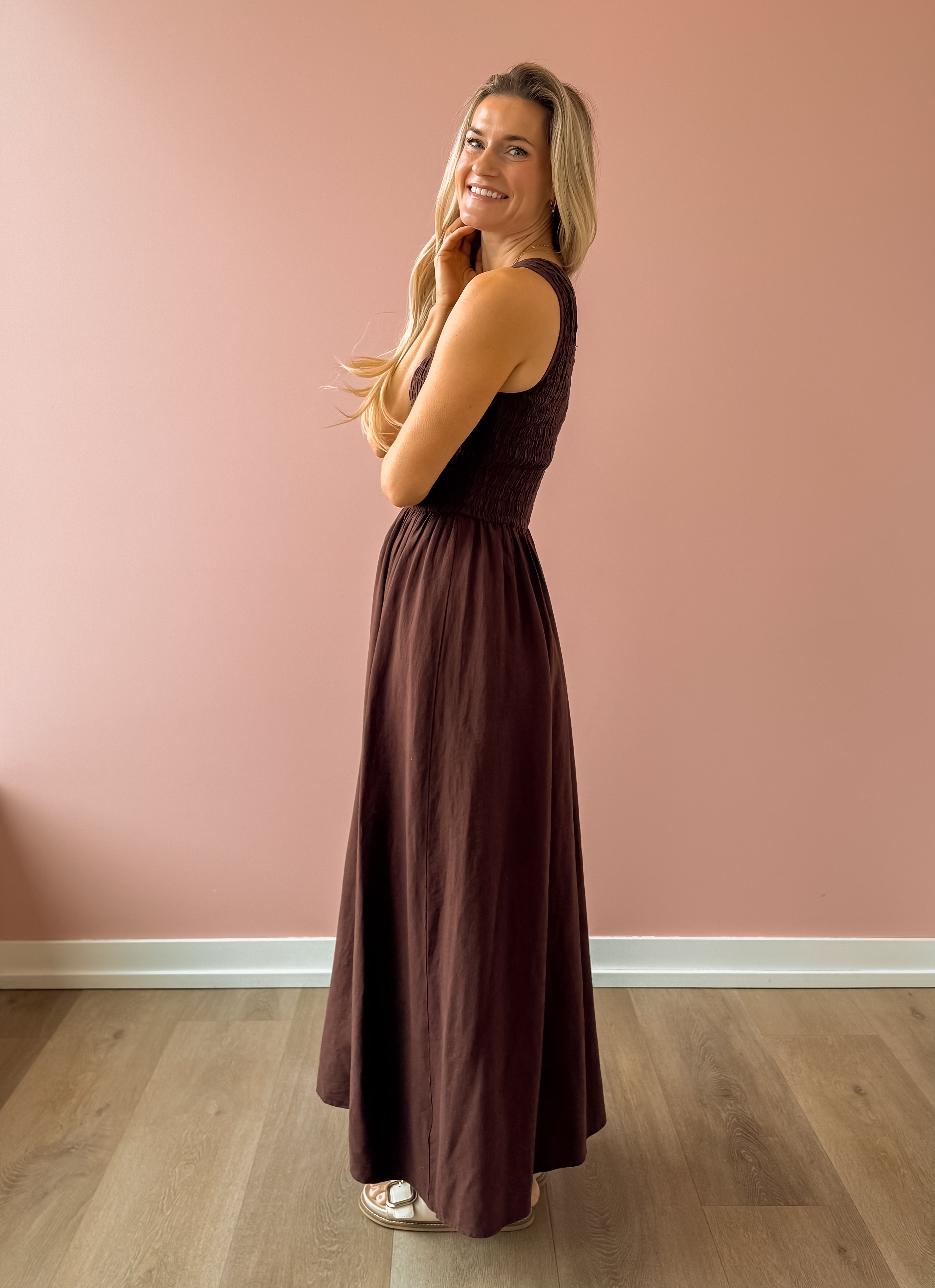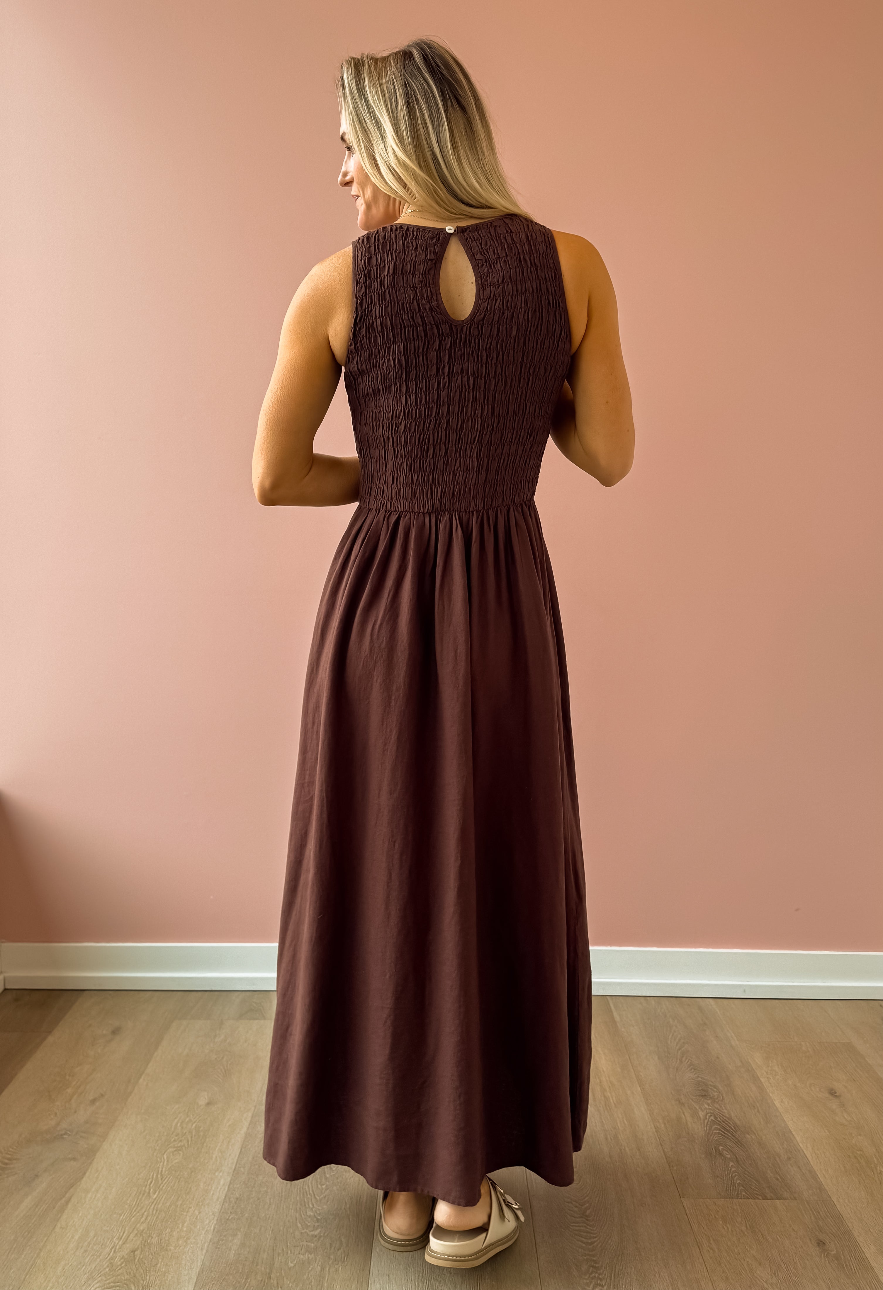 Meet your new vacation essential! The Juniper Maxi Dress is a breezy linen-viscose blend that keeps you cool and chic. Sleeveless, crew neck, and hitting at the perfect midi length, this brown beauty works from sunrise beach walks to sunset dinners. Lightweight and effortlessly stylish—pack it and go!
