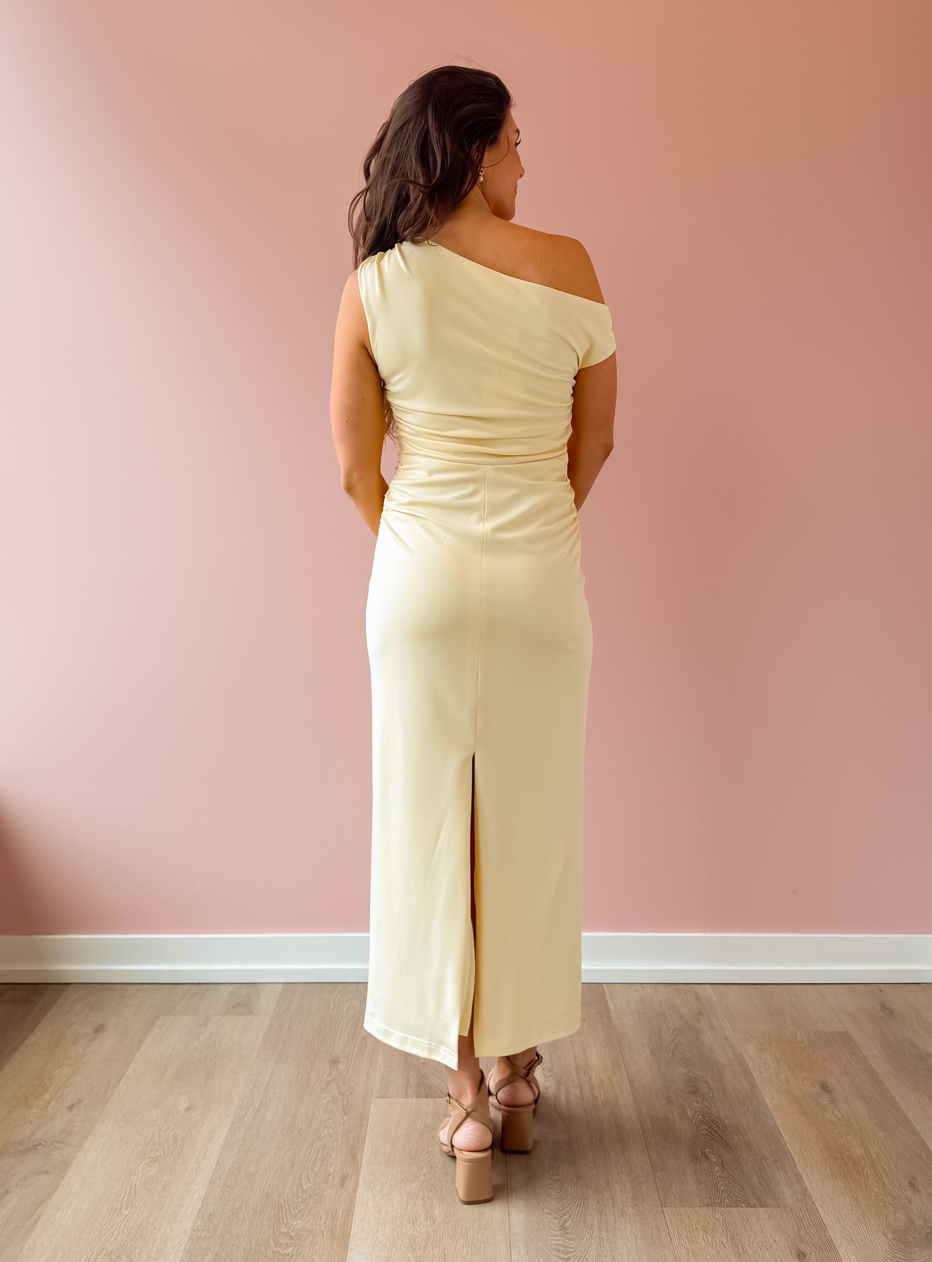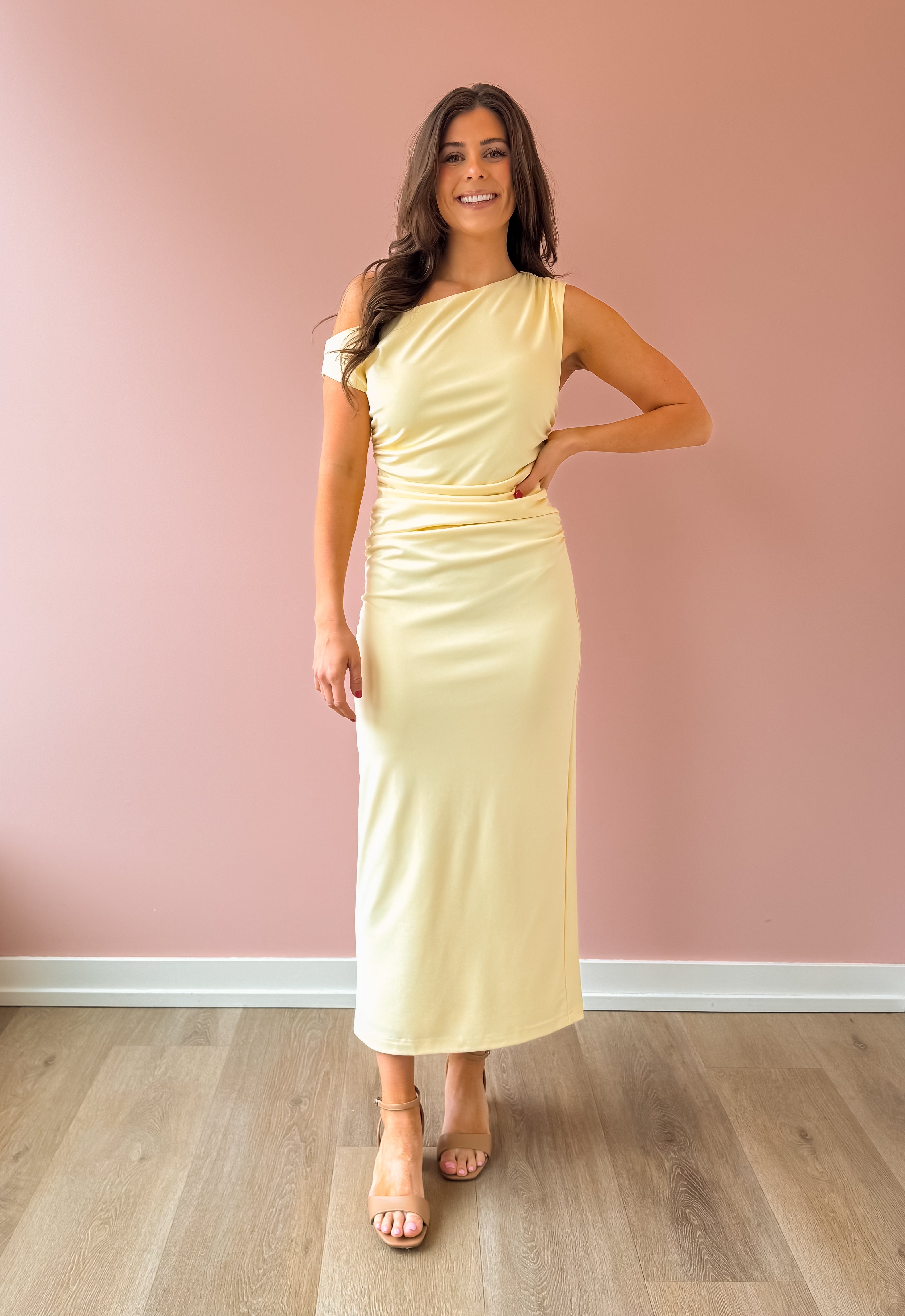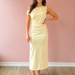 Slip into effortless elegance with the Kate Midi Dress. This stunning piece features a soft, beautiful yellow hue that radiates warmth and sophistication. The sleeveless, one-shoulder design creates a modern, flattering silhouette, while strategic ruching along the side adds dimension and visual interest. Cut to a midi length with a body-skimming fit, it moves beautifully with you. Perfect for weddings and special occasions, pair it with heels to complete the look.