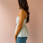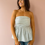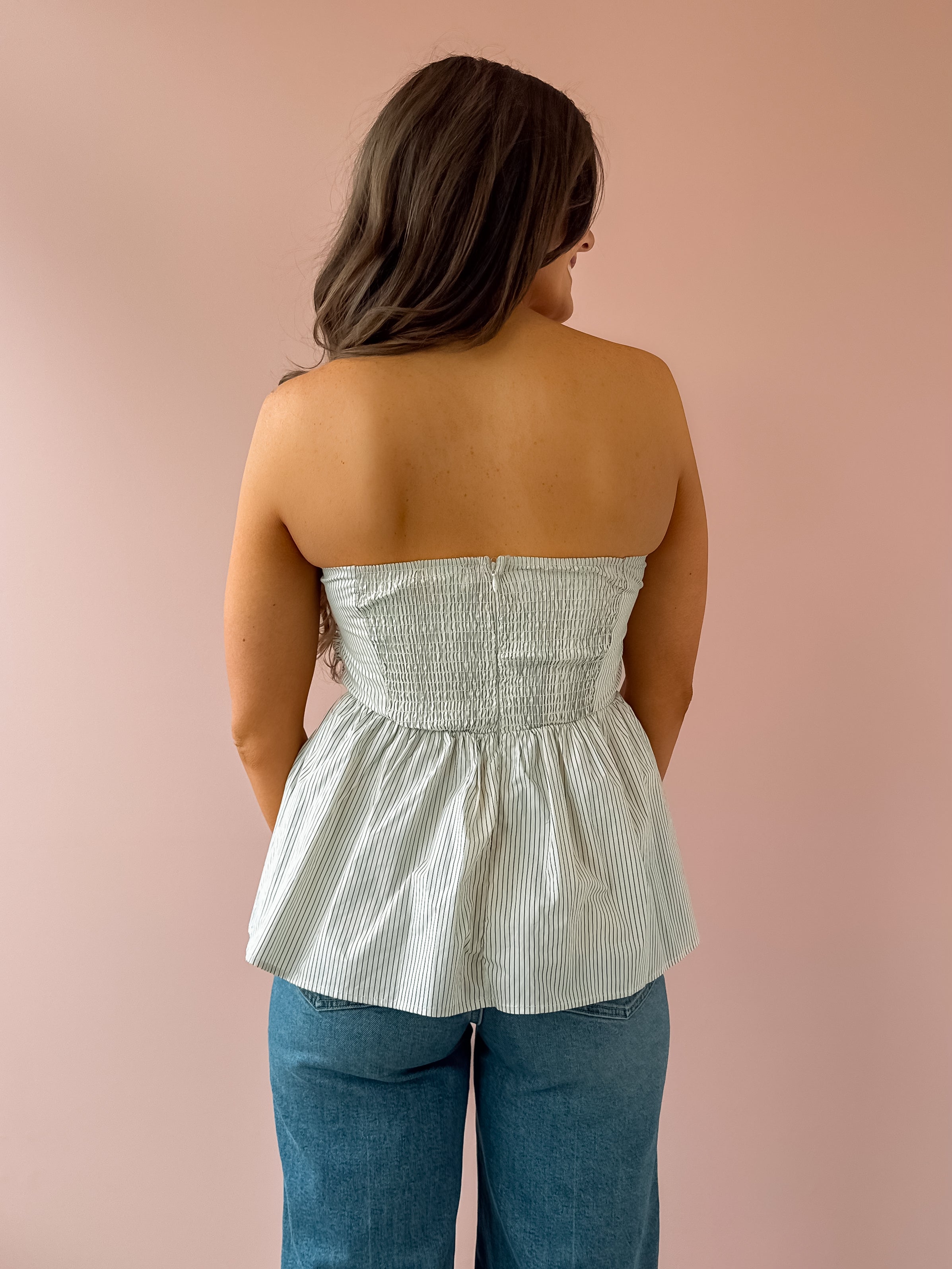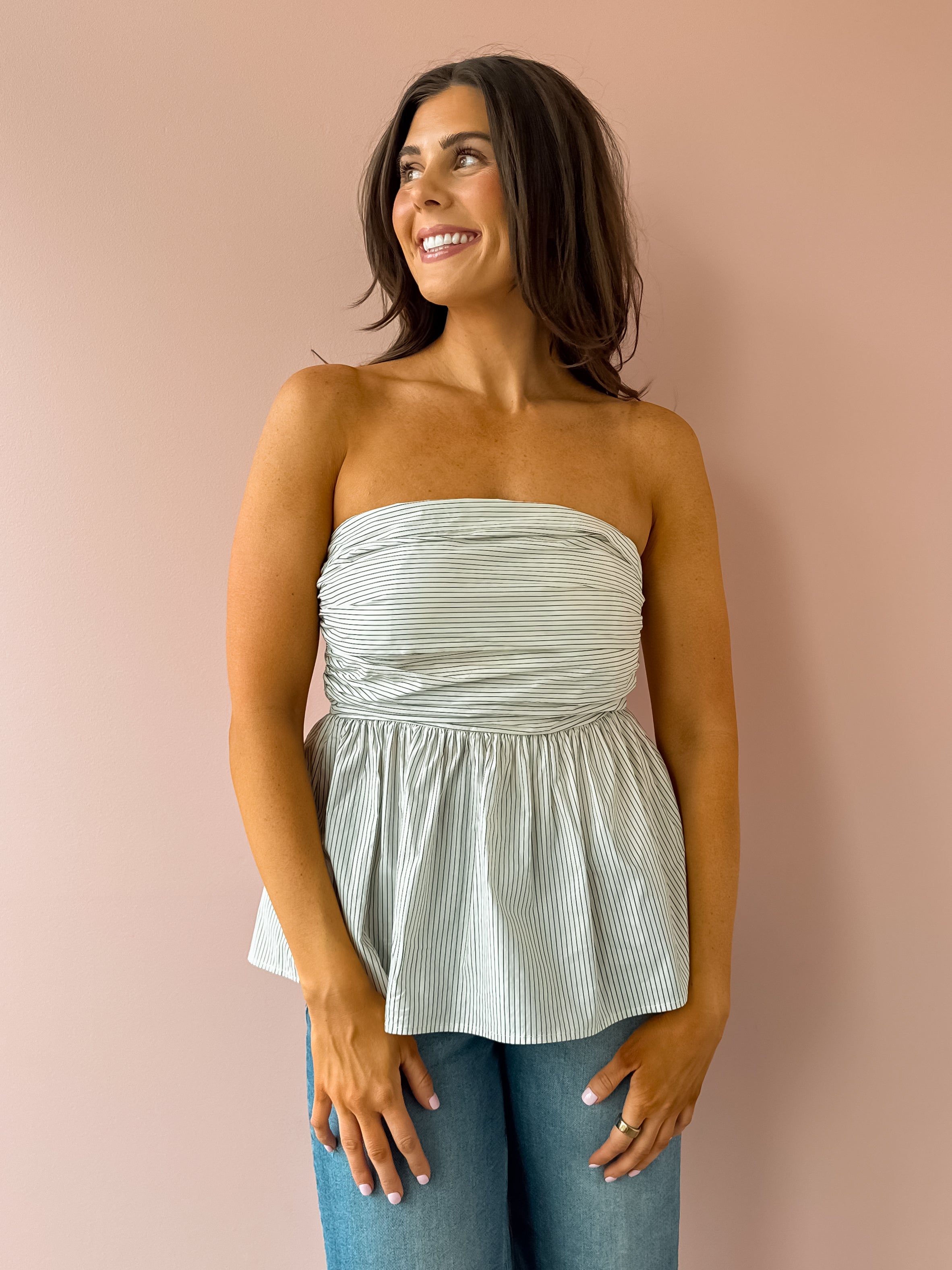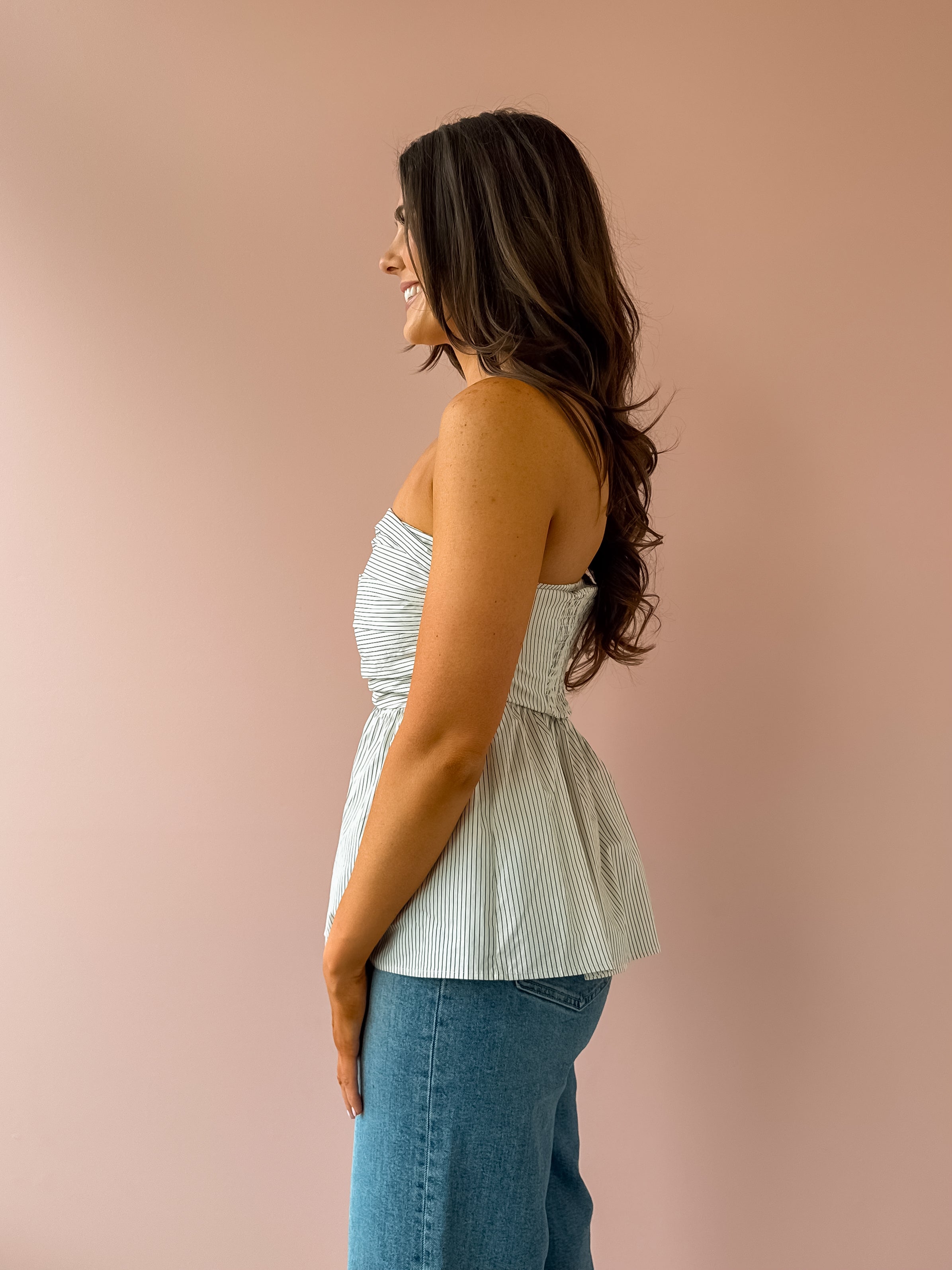 The Kendall Top is a sleeveless tube top featuring a classic white background with bold navy stripes. Cut with a fitted silhouette and finished with a charming ruffle hem, this piece offers both style and security with its back closure. Perfect for creating effortless, playful looks, pair it with denim and heels for an instant date-night outfit that turns heads.