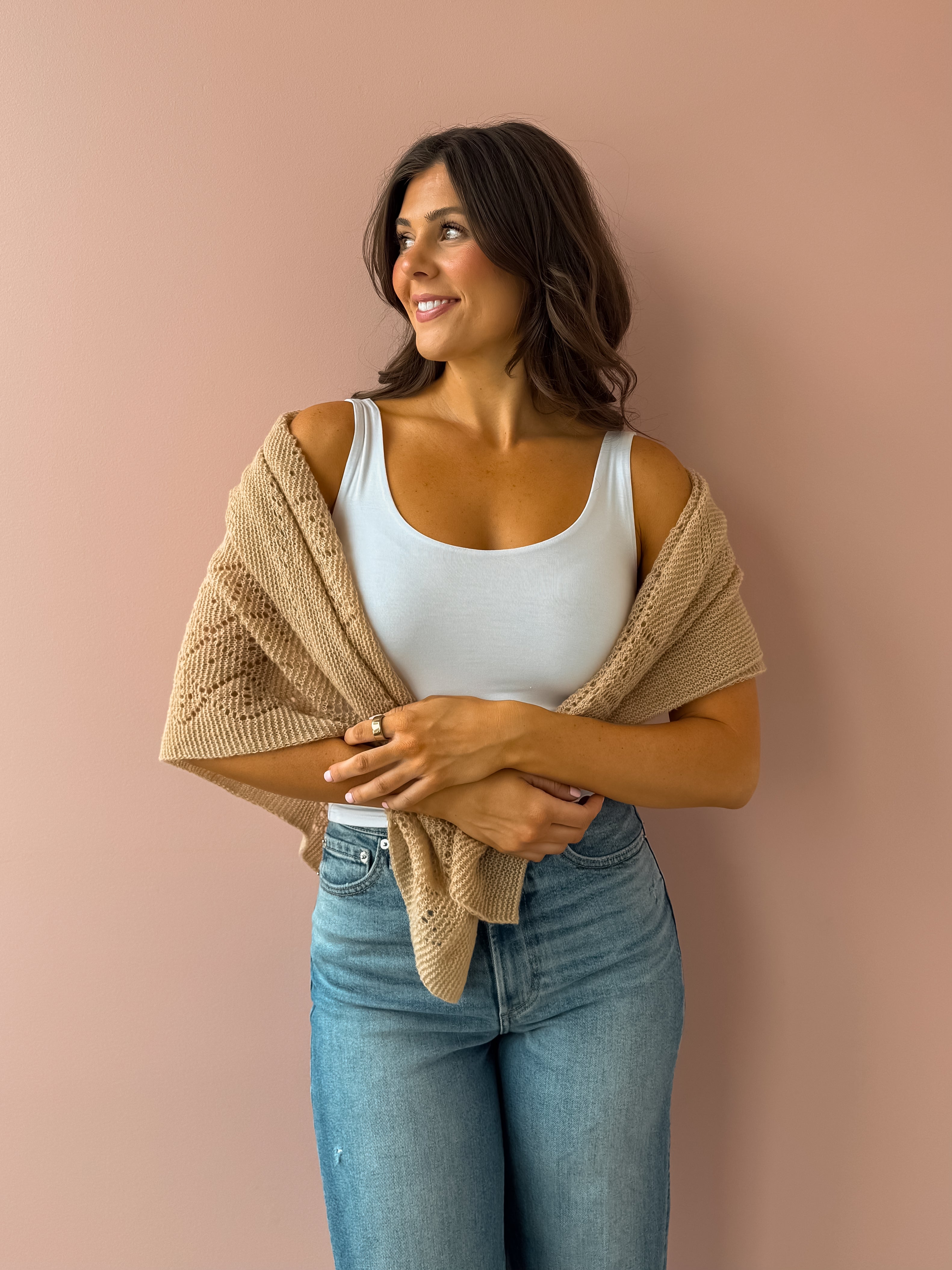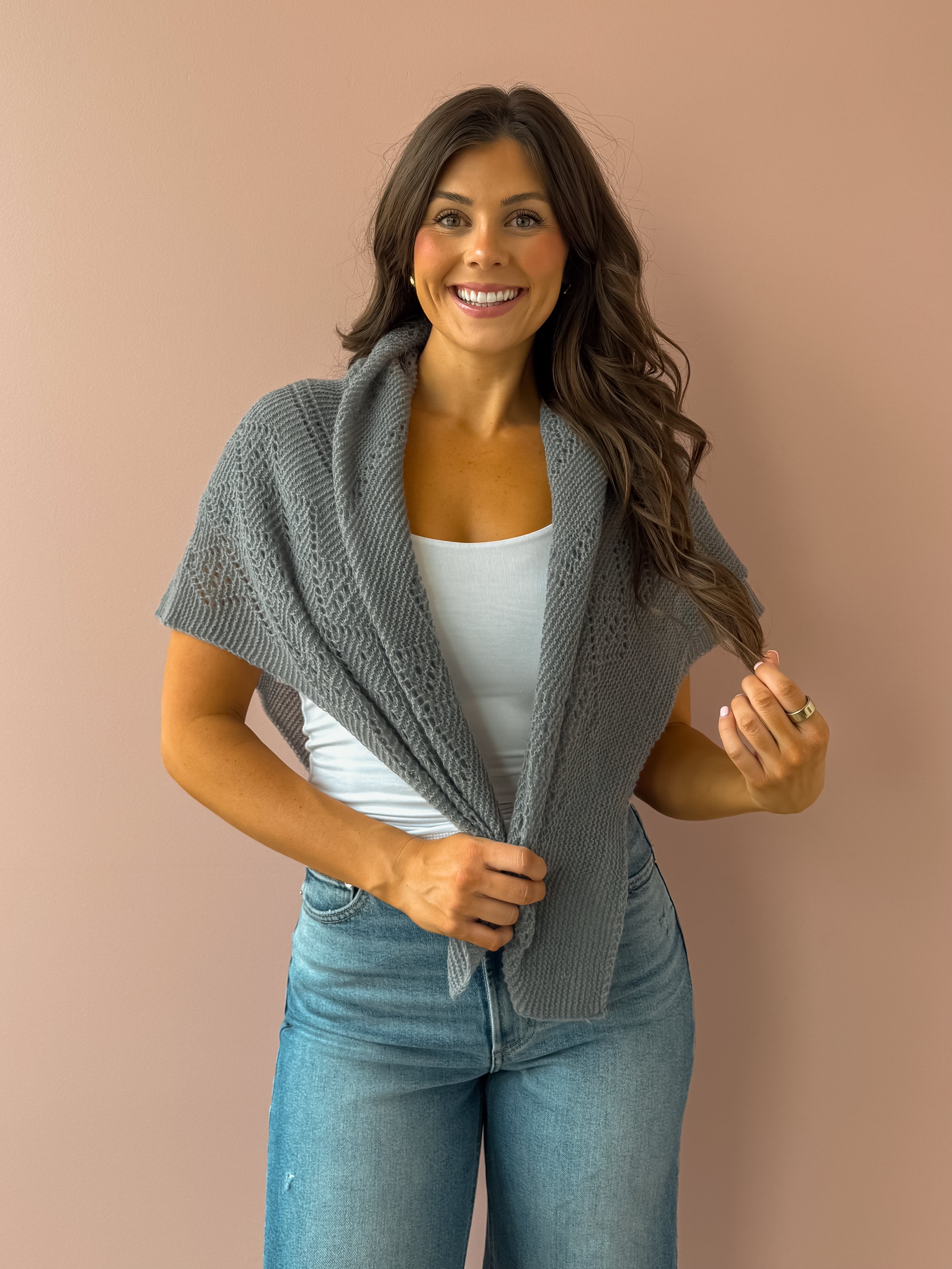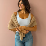 Soft knit in neutrals, this pointelle knit scarf features a square shape for multi way wear. Wear as a shawl, head scarf, regular scarf, or wrap. Available in colors white, grey, and beige.