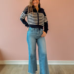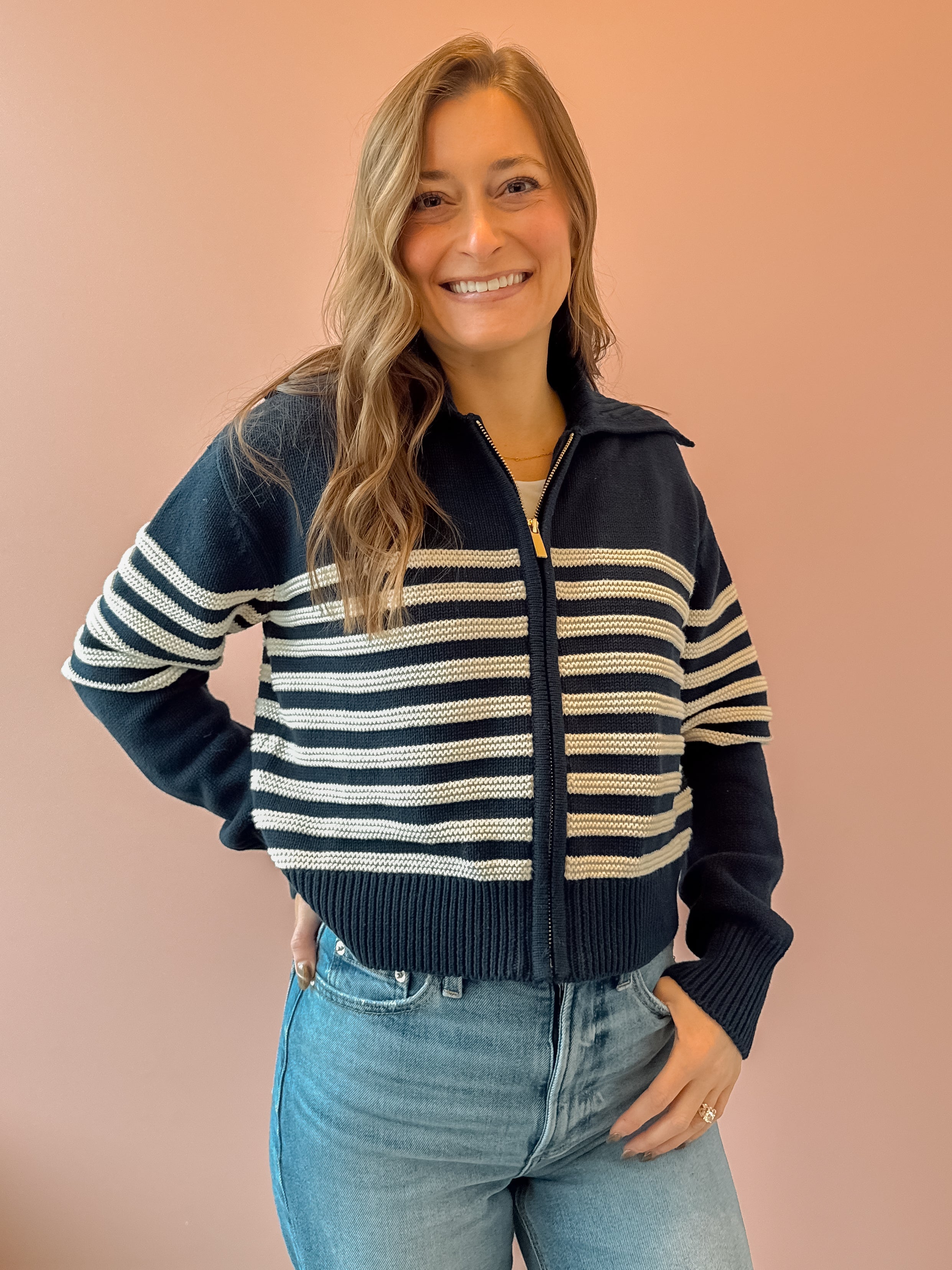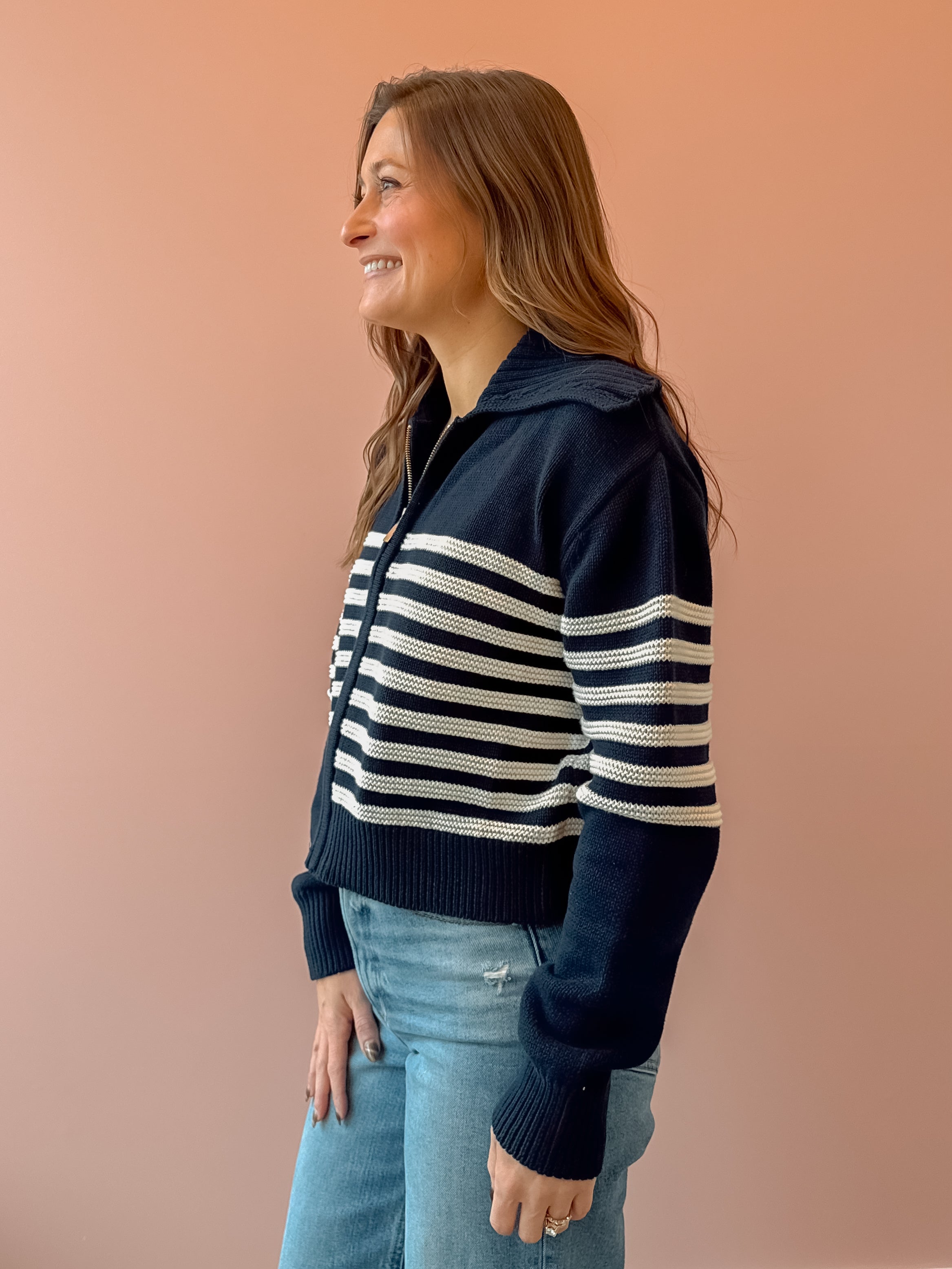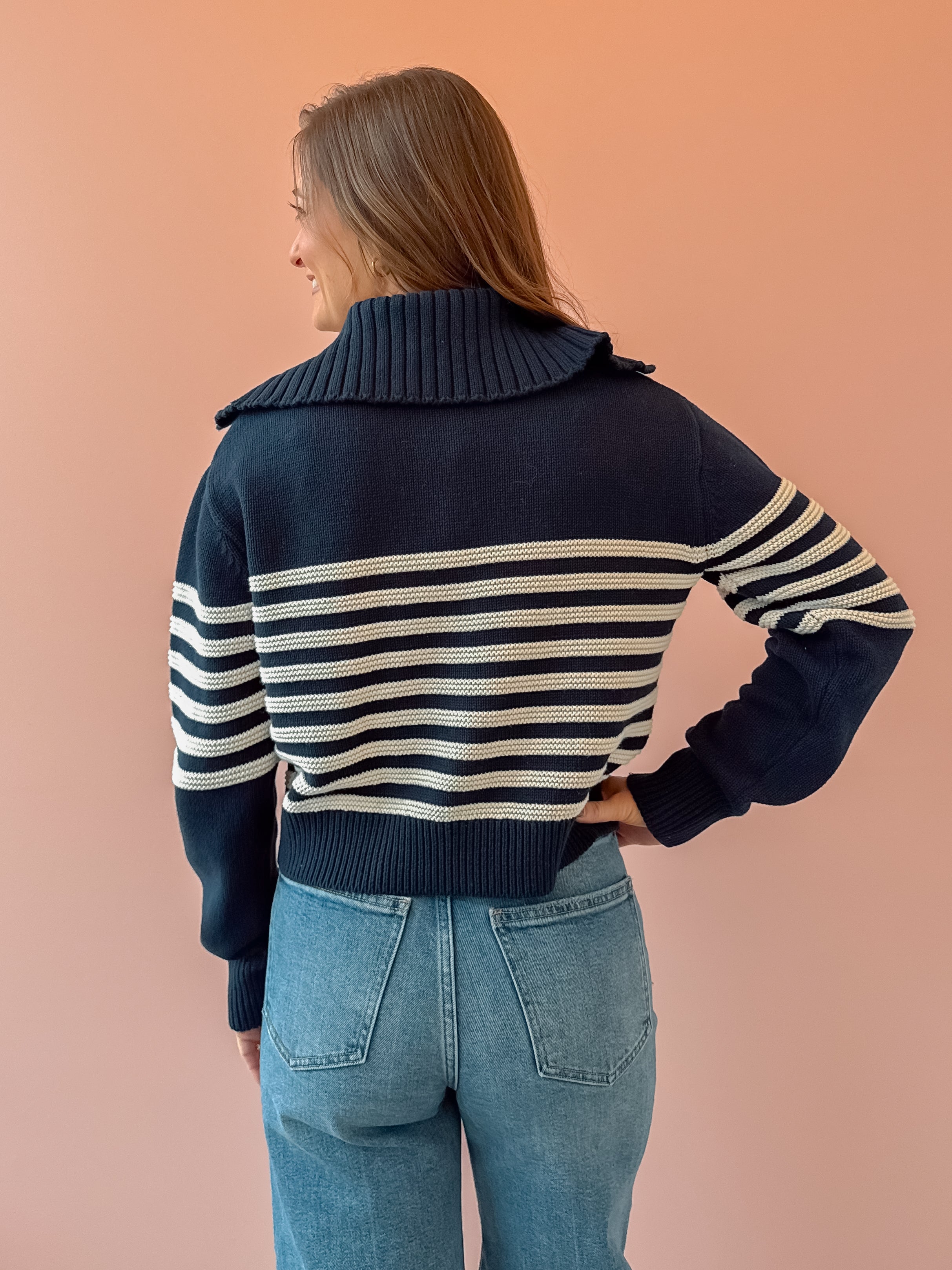 This 100% cotton sweater is perfect for all seasons. The stripe and large collar detail elevate this cozy top making it easy to dress up or down. Pair with light denim or even your favorite trousers.