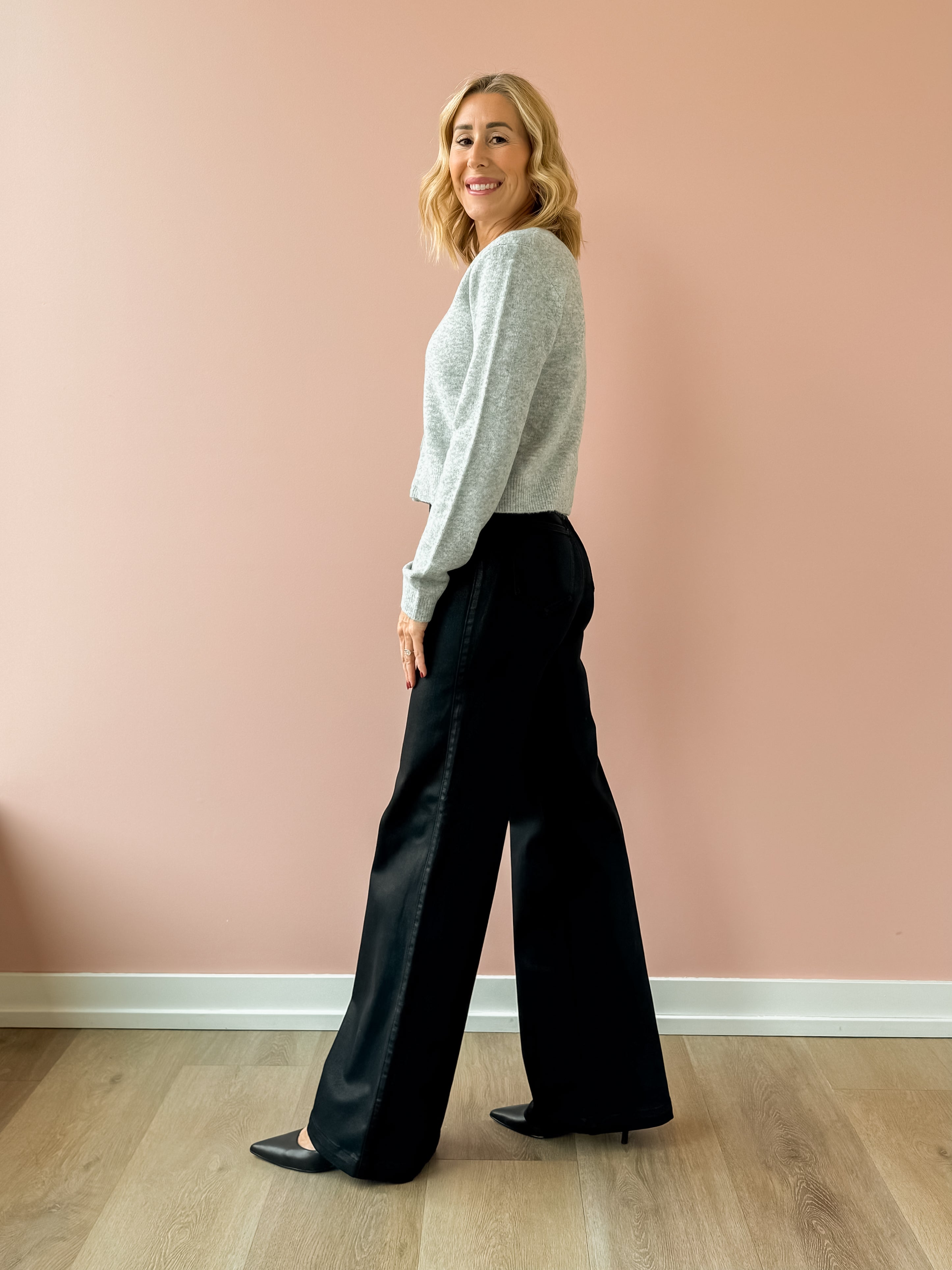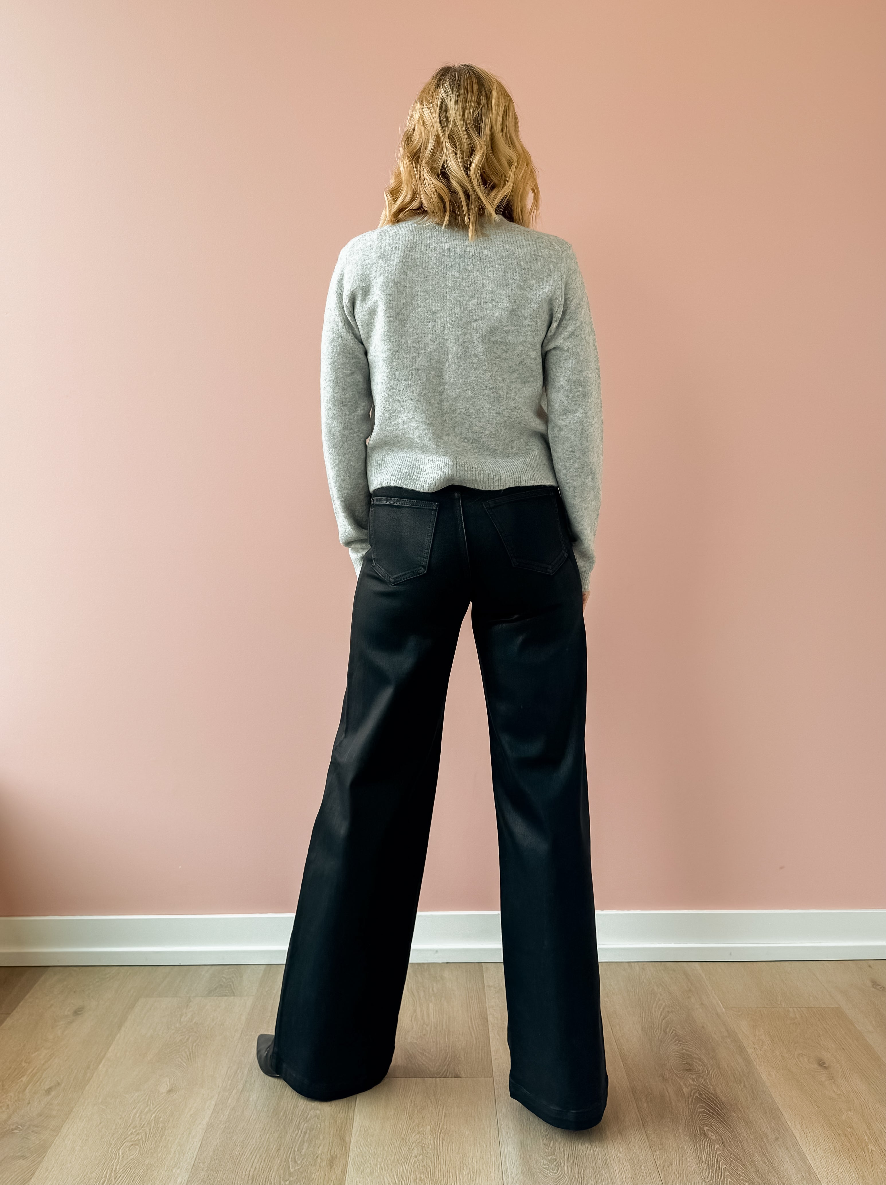The best-selling wide leg that commands the room. Lana sits at a high rise with an ultra wide leg silhouette and full-length 33" inseam that feels effortlessly dramatic. The ultra wide opening creates maximum impact while the relaxed fit flows beautifully. Crafted from our signature comfort stretch denim in Coated Noir, a rich black finish with luxurious coated texture. Style with a sweater and a heel!