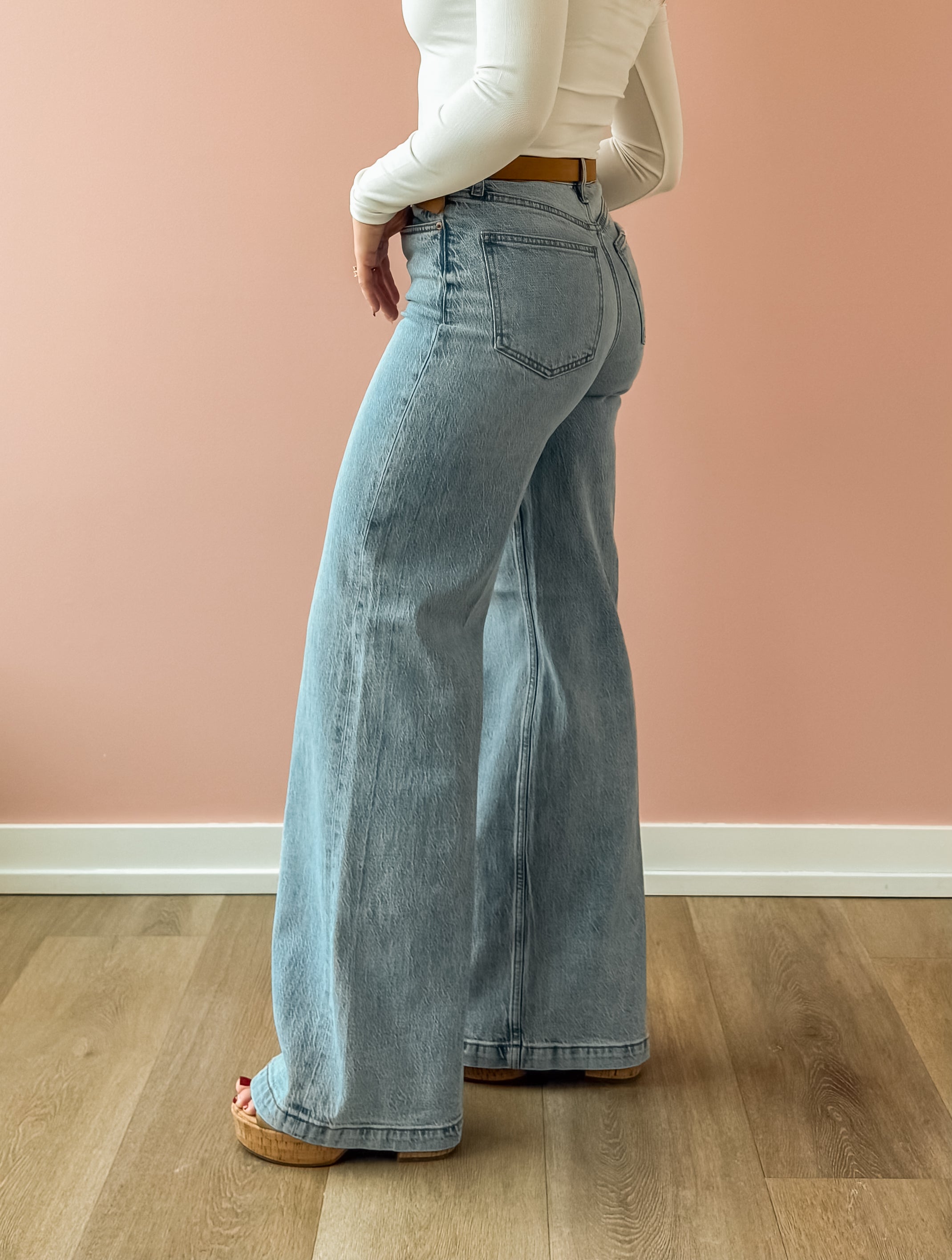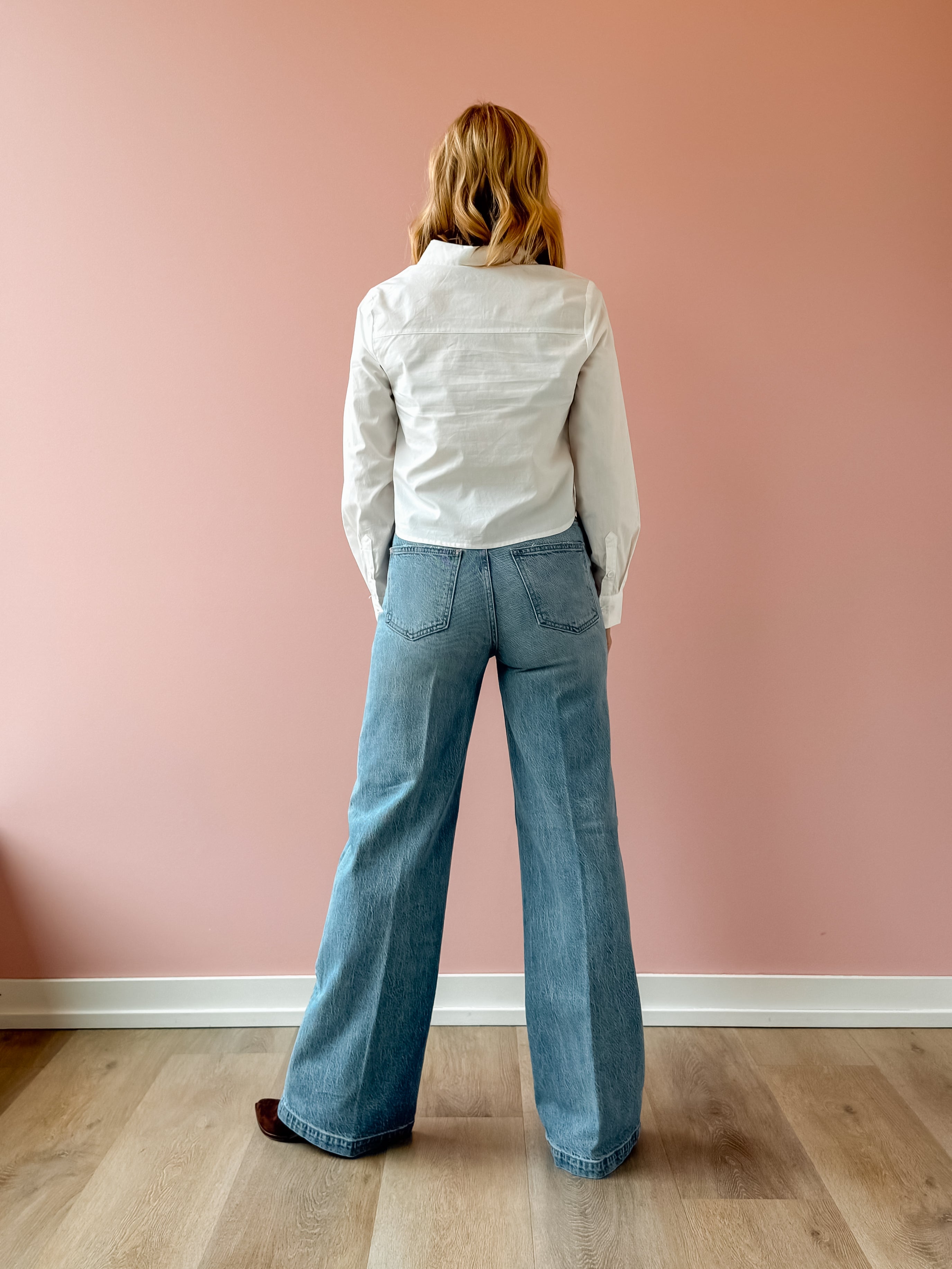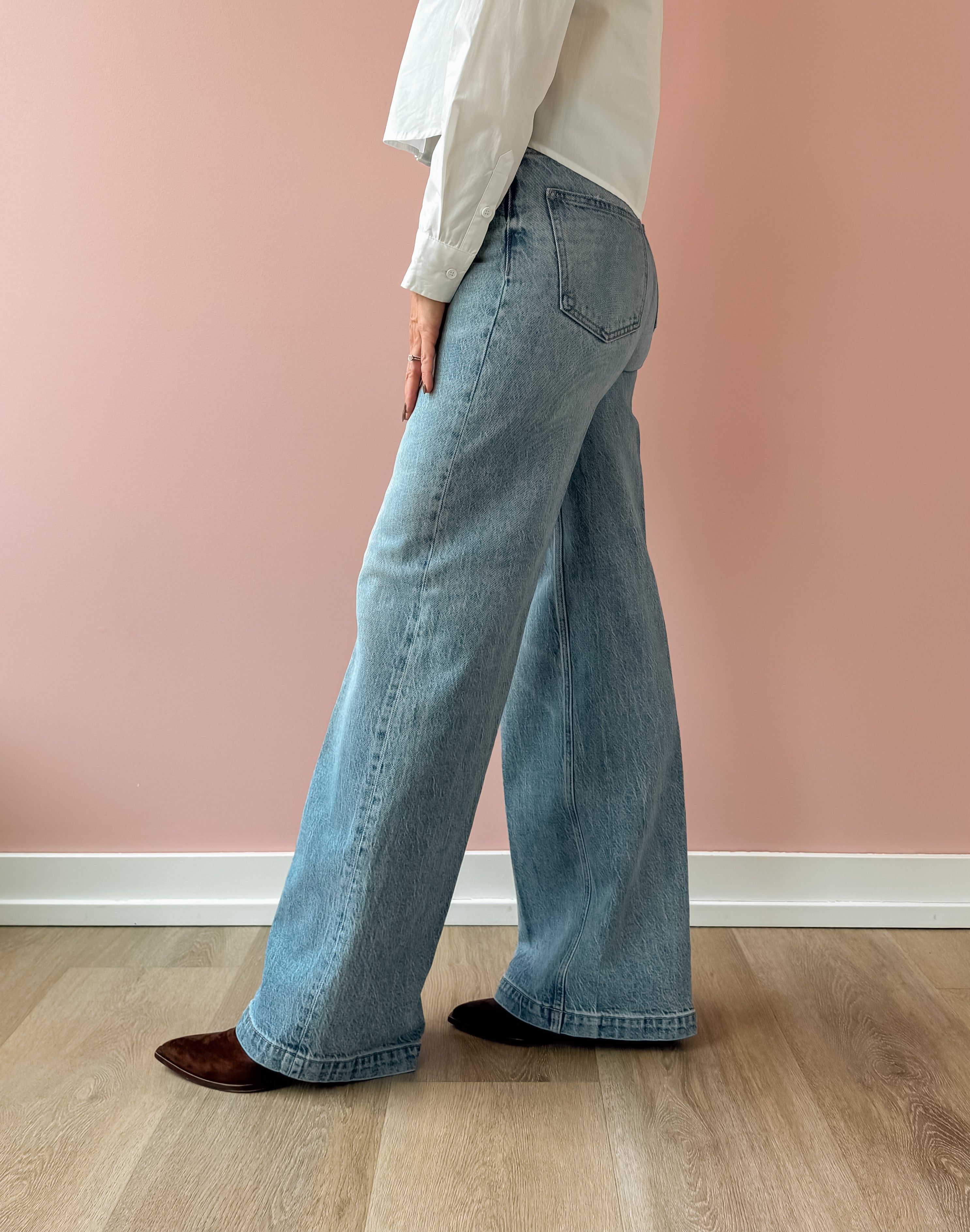 A relaxed, ultra wide leg silhouette with a high rise waist, breezy full length cut, and a clean finish hem. Crafted from our signature comfort stretch denim to provide a structured shape with just the right give. Break is a medium blue denim wash with blasted fading. Style with a button-up for the office, or a graphic crewneck and sneakers for the weekend!