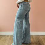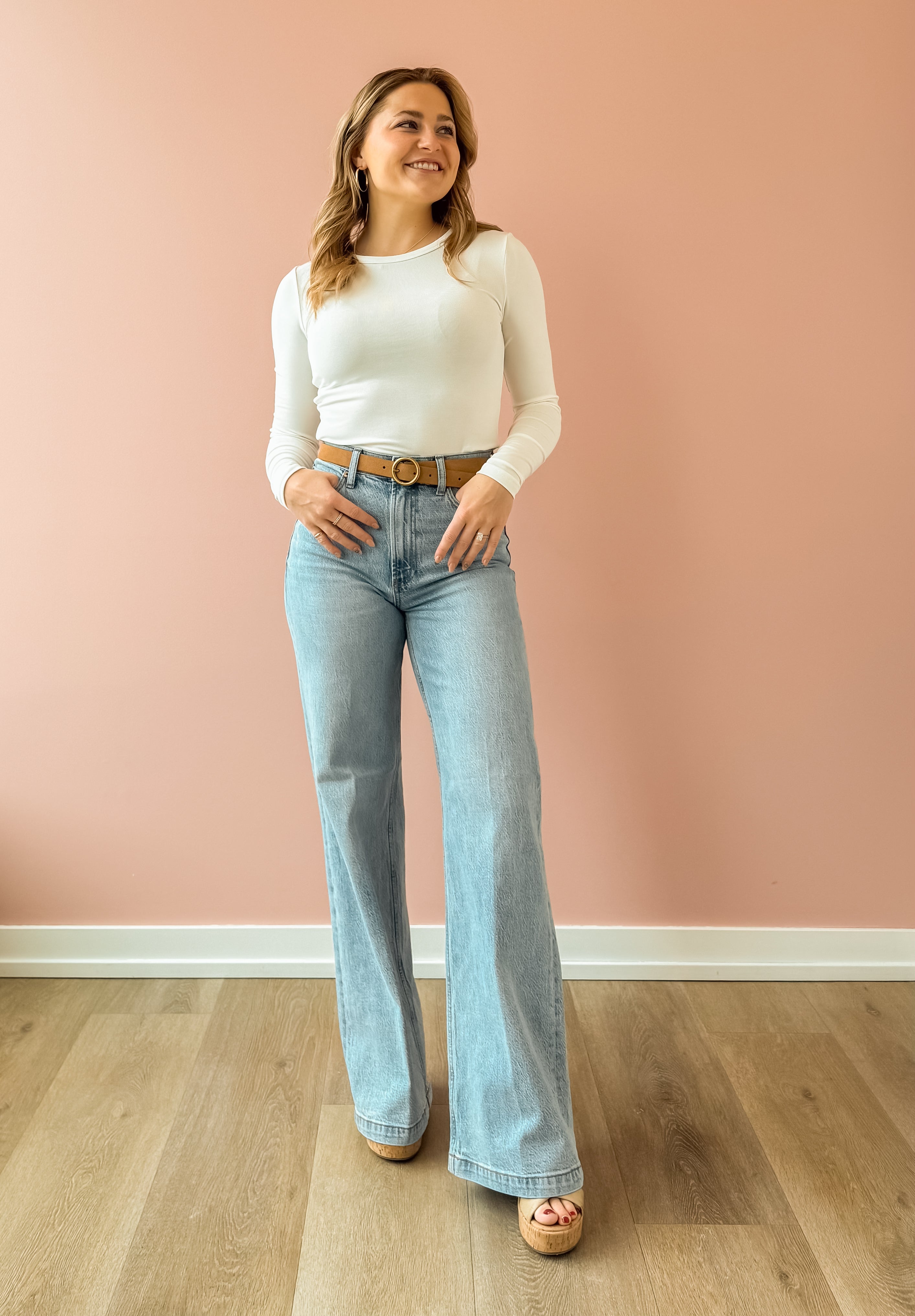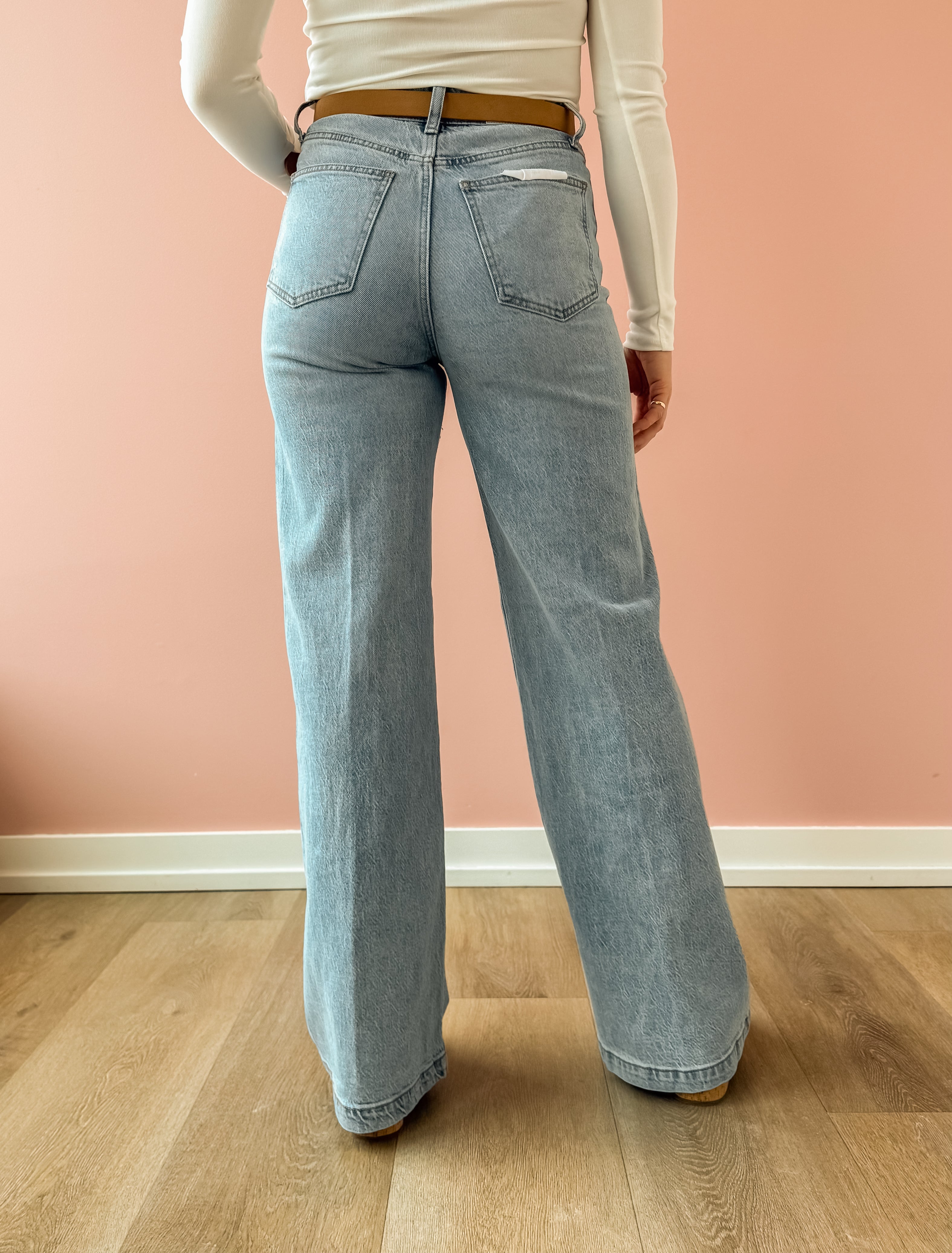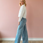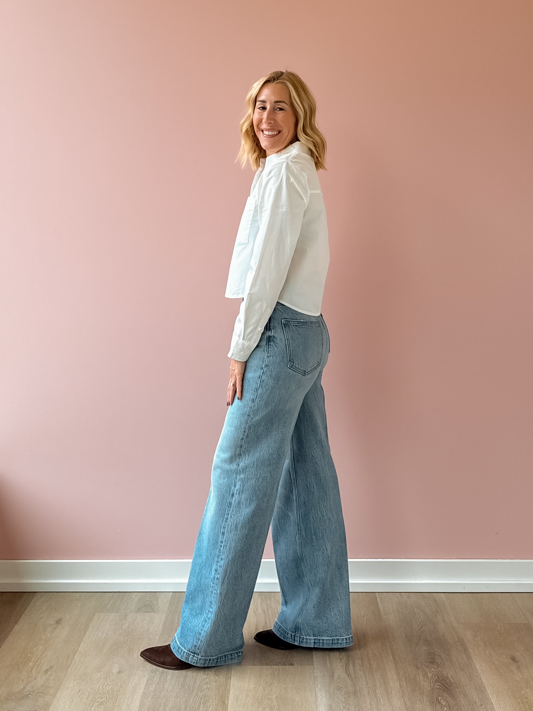 A relaxed, ultra wide leg silhouette with a high rise waist, breezy full length cut, and a clean finish hem. Crafted from our signature comfort stretch denim to provide a structured shape with just the right give. Break is a medium blue denim wash with blasted fading. Style with a button-up for the office, or a graphic crewneck and sneakers for the weekend!