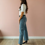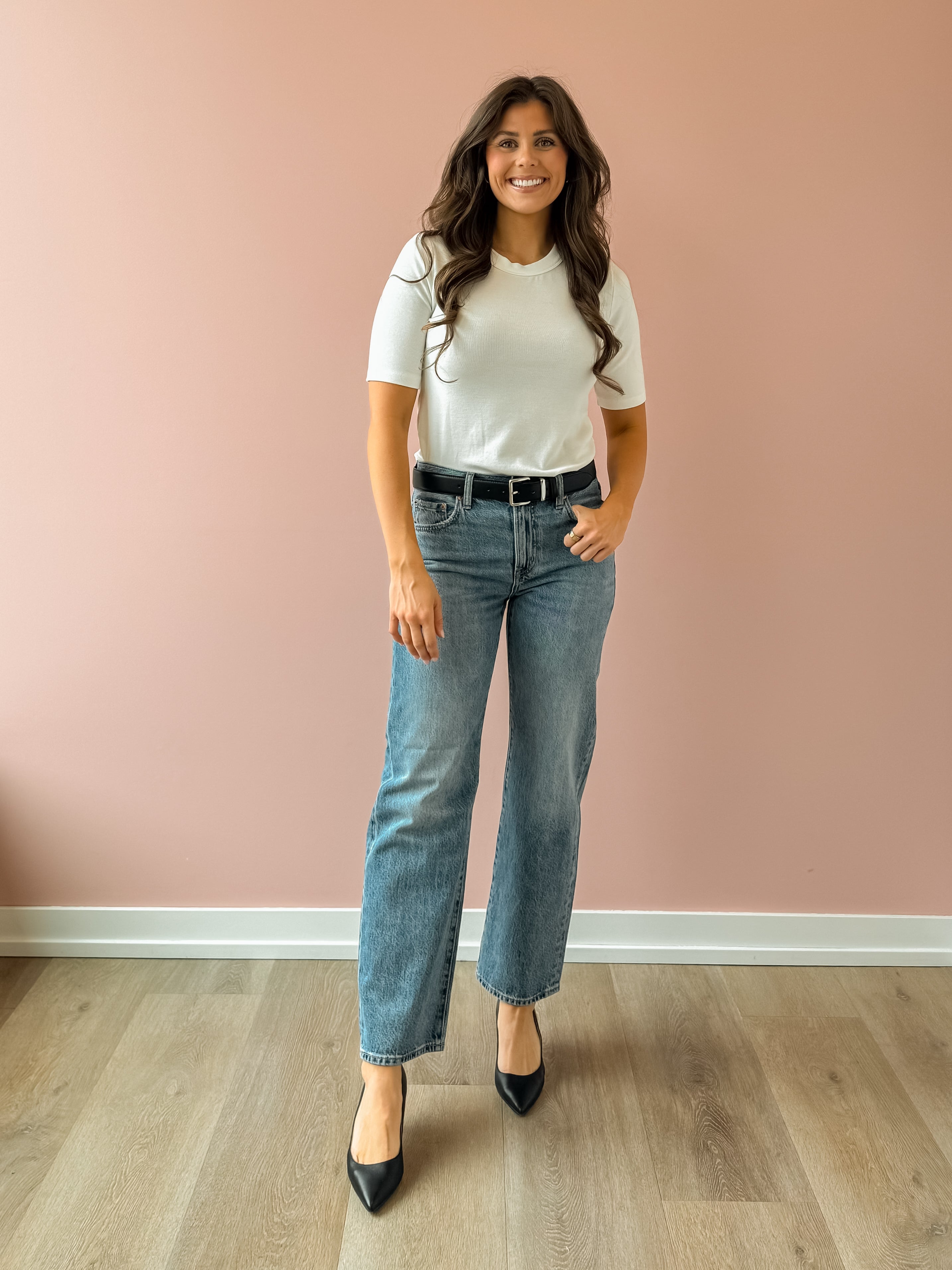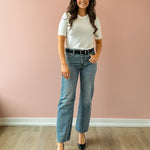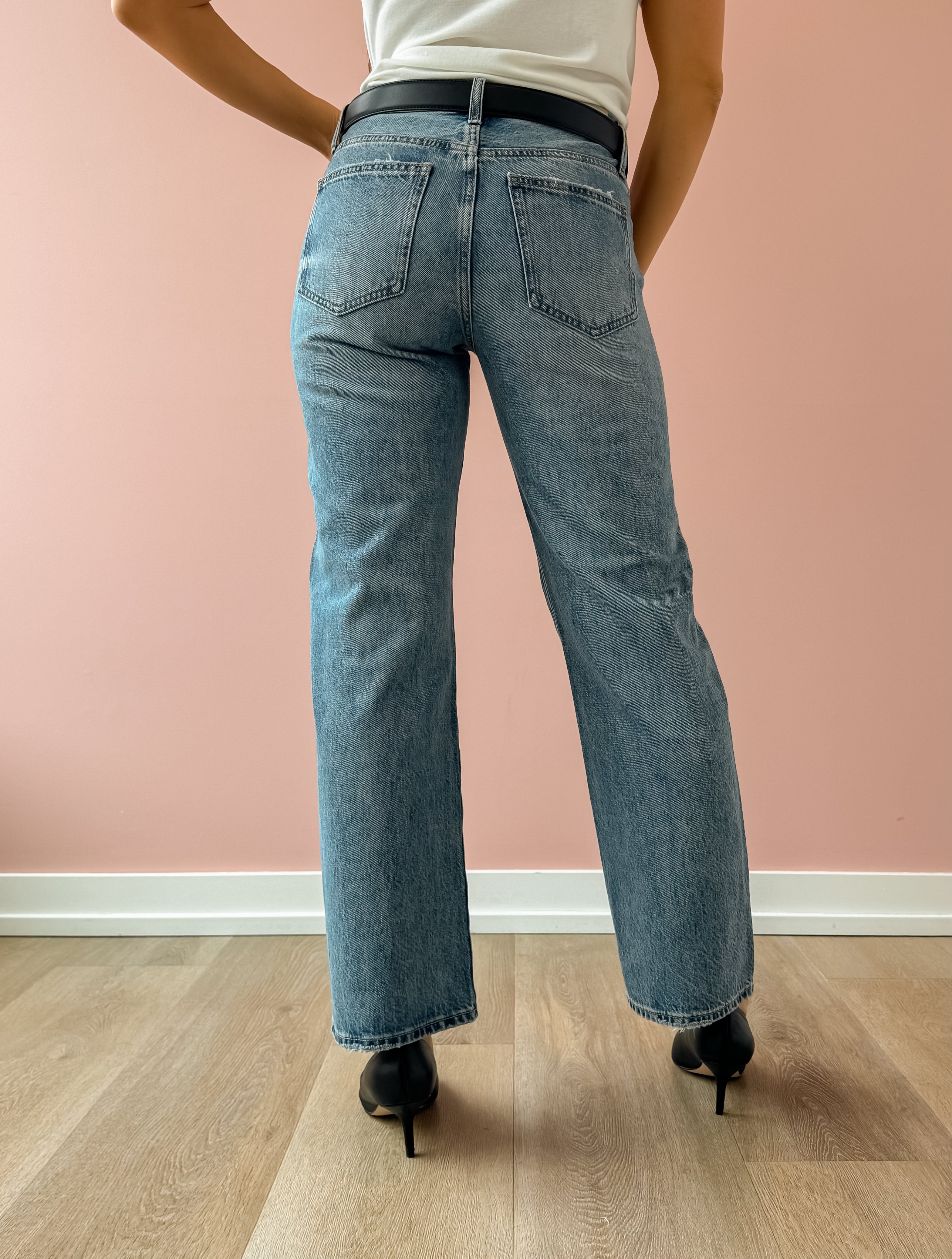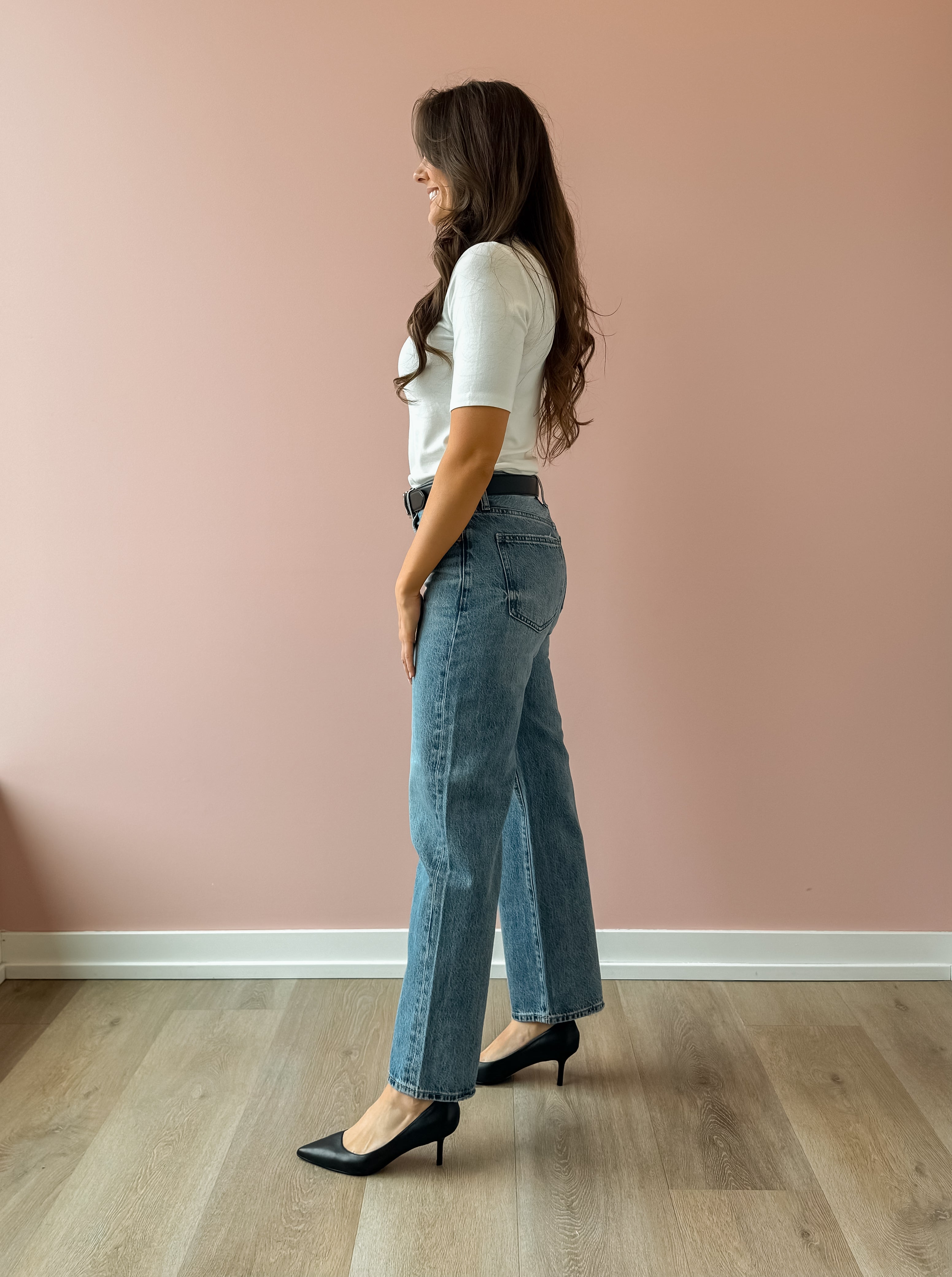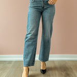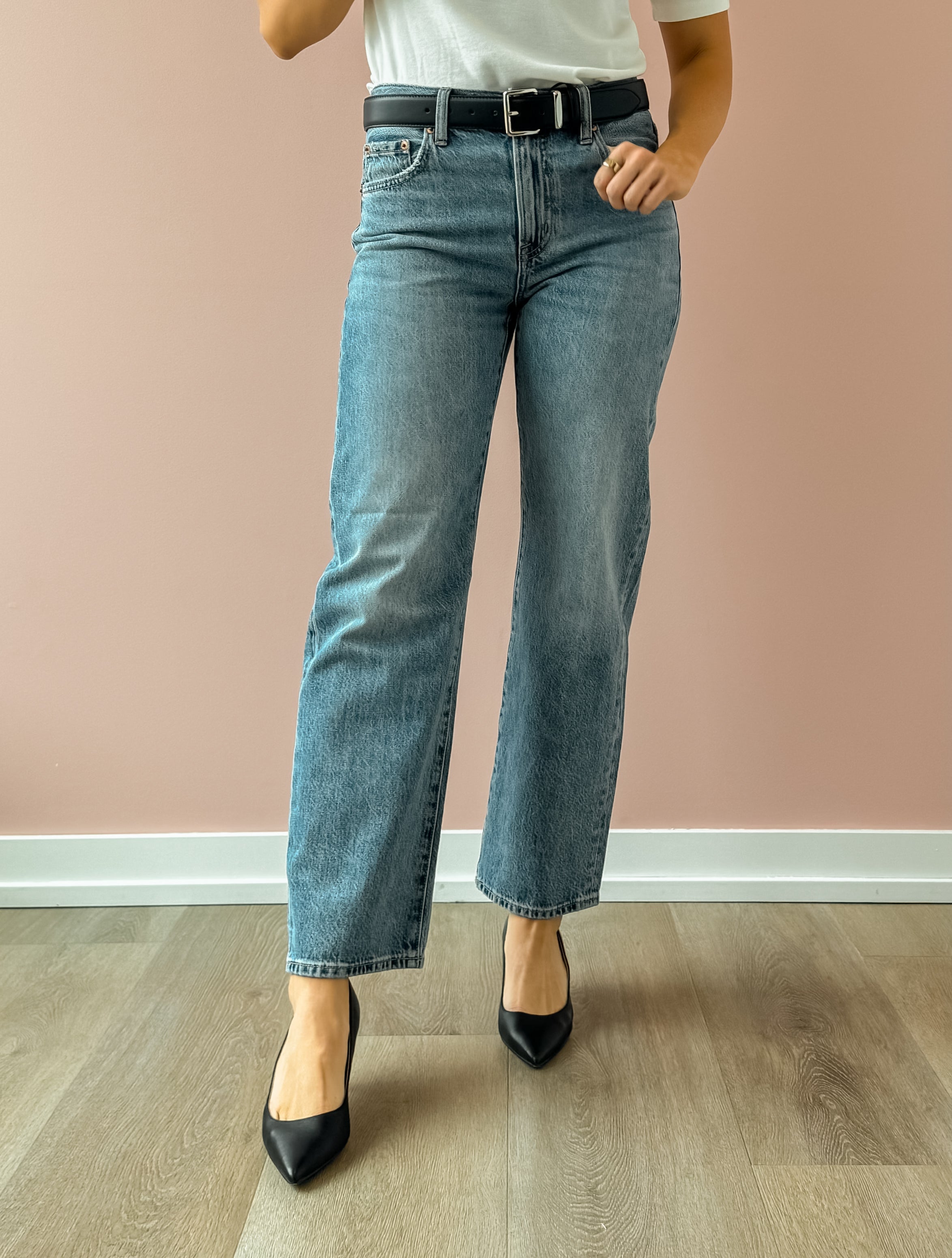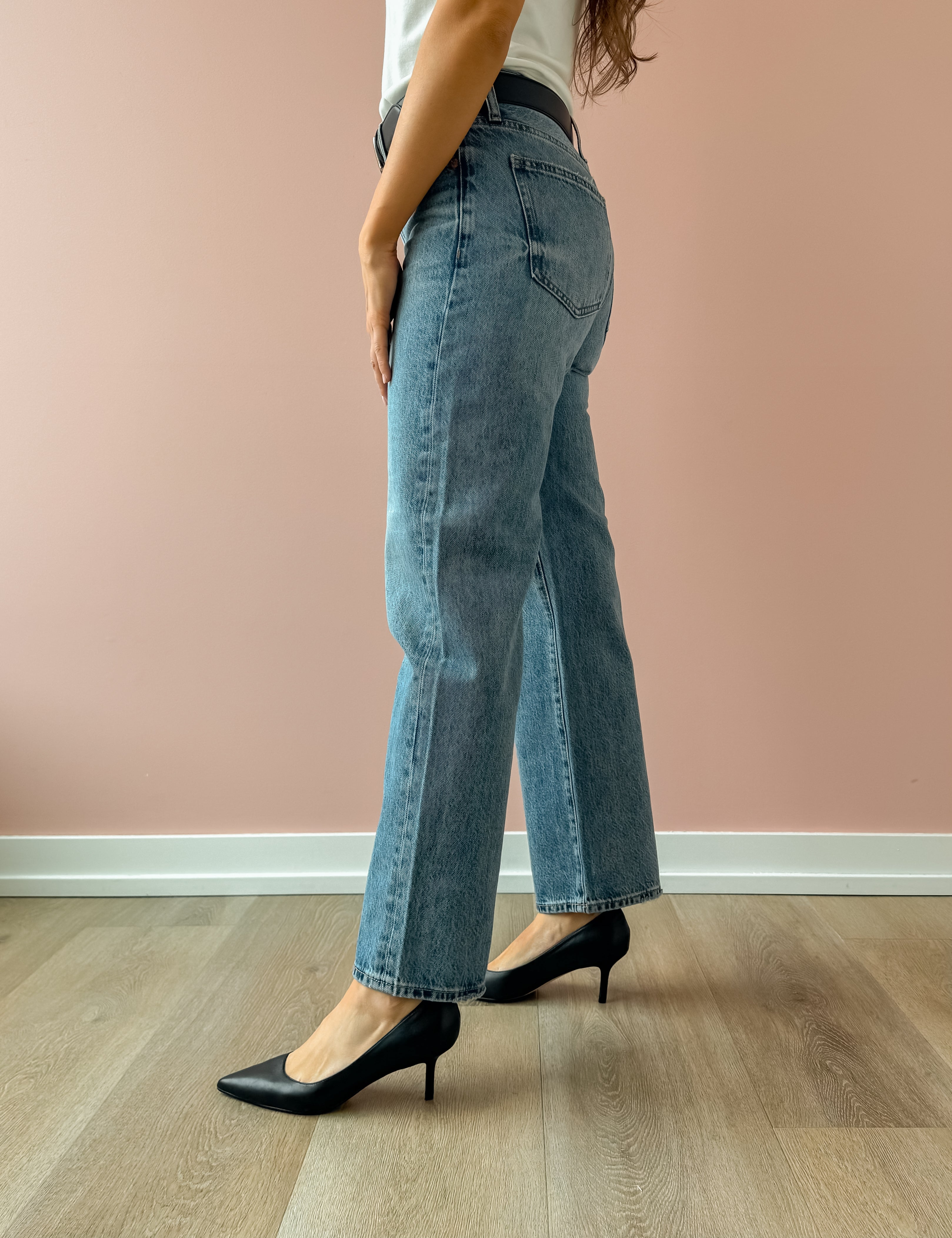 Meet Lexi, the jean that's earned its bestseller status through thoughtful design. This mid-rise bowed straight leg flatters with a subtle curve at the knee, creating effortless shape without compromise. The clean hem delivers a polished silhouette that works from day to night. Crafted from rigid denim in Metropolis—a medium indigo wash with authentic fading and whiskering—each pair tells a story of timeless style. No stretch means pure denim authenticity. Pair with sneakers and a sweater for casual ease, or elevate with heels and blazer for the office.