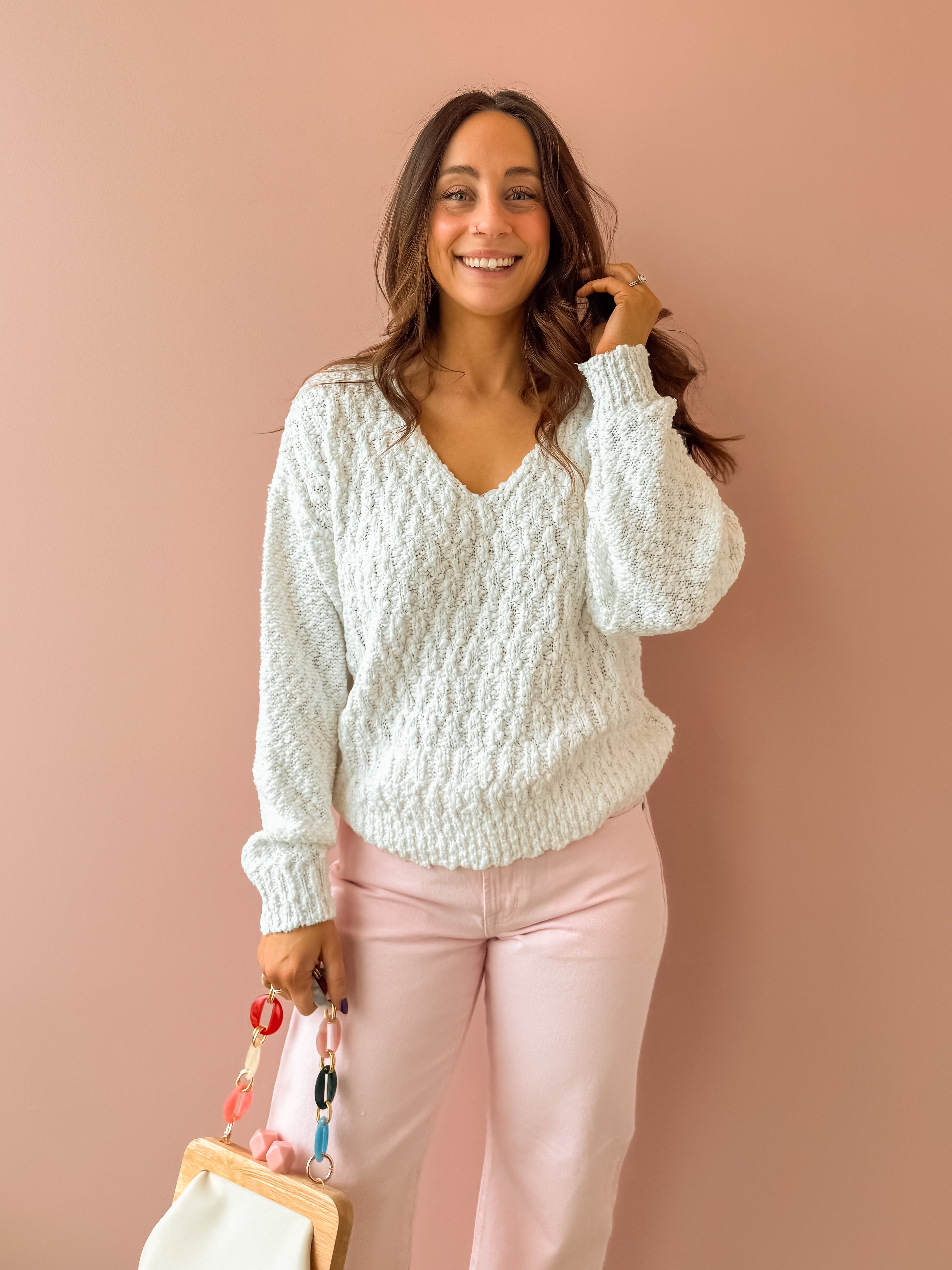 Lexi long sleeve sweater in a soothing yarn, designed with a relaxed fit for comfort and effortless style. Offers plush warmth and a chic silhouette for a perfect choice for layering or wearing on its own, versatility for any occasion. Pair this with jeans and a flat for a cozy, chic look!