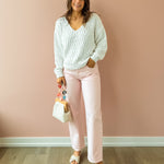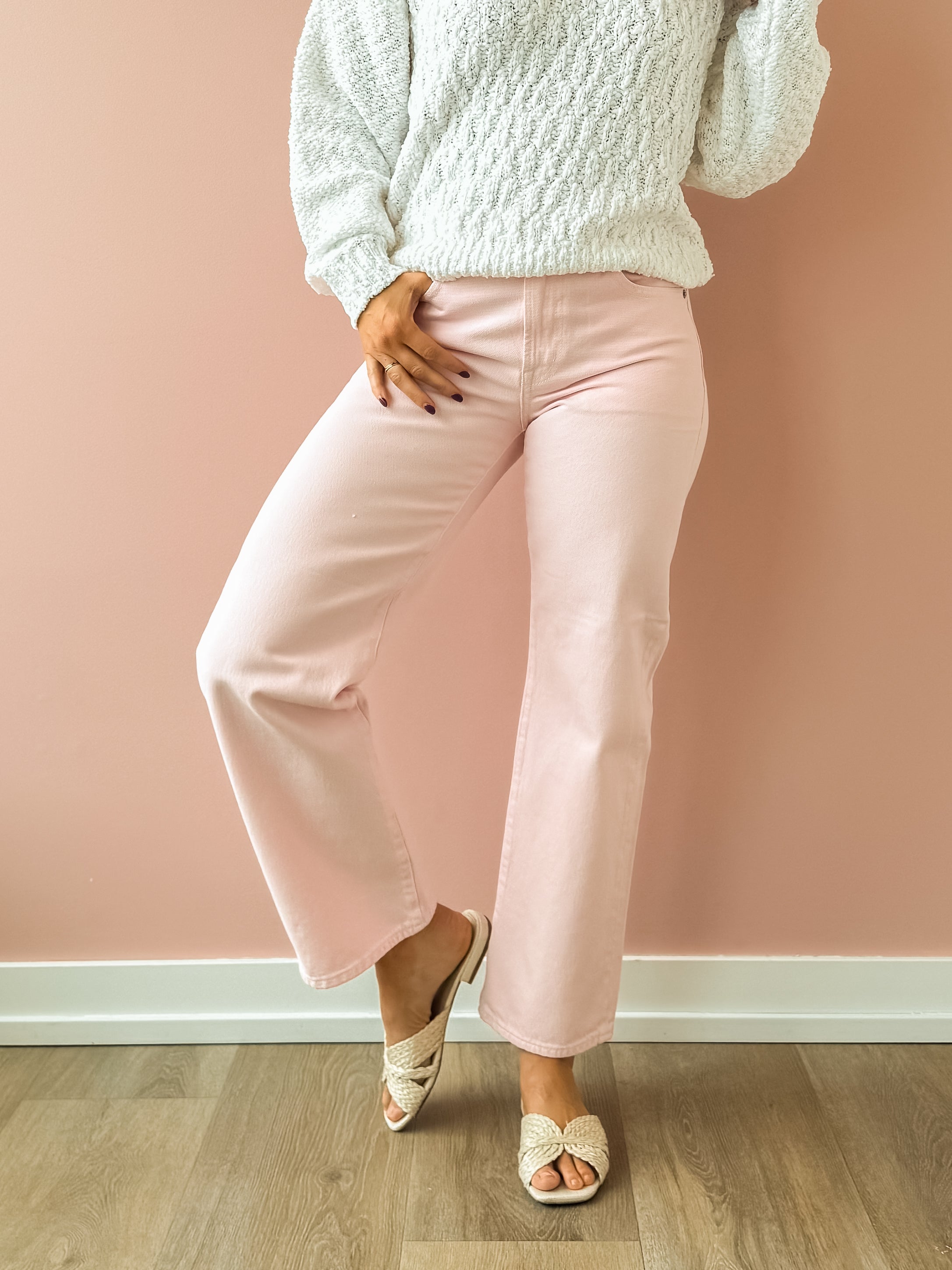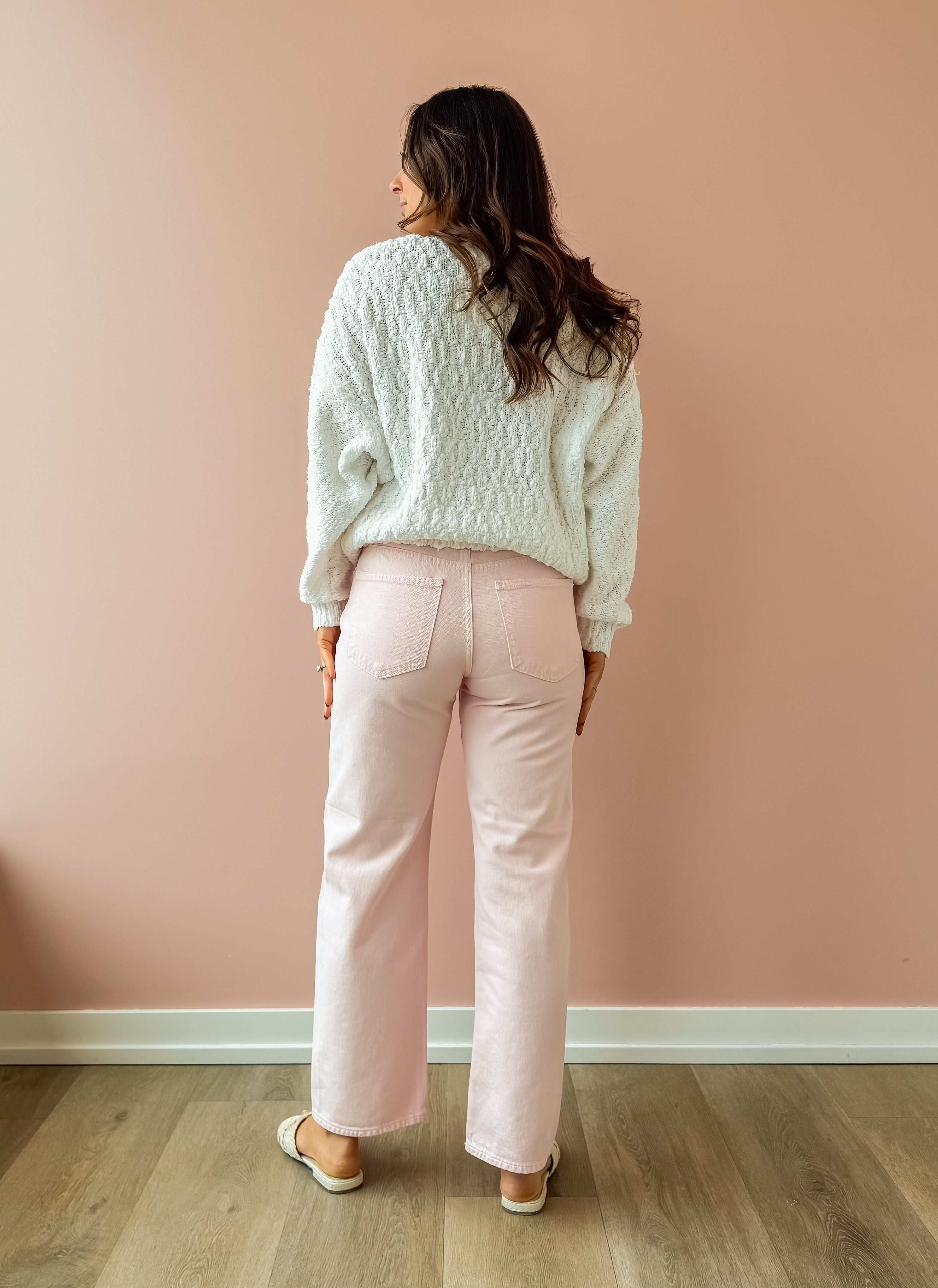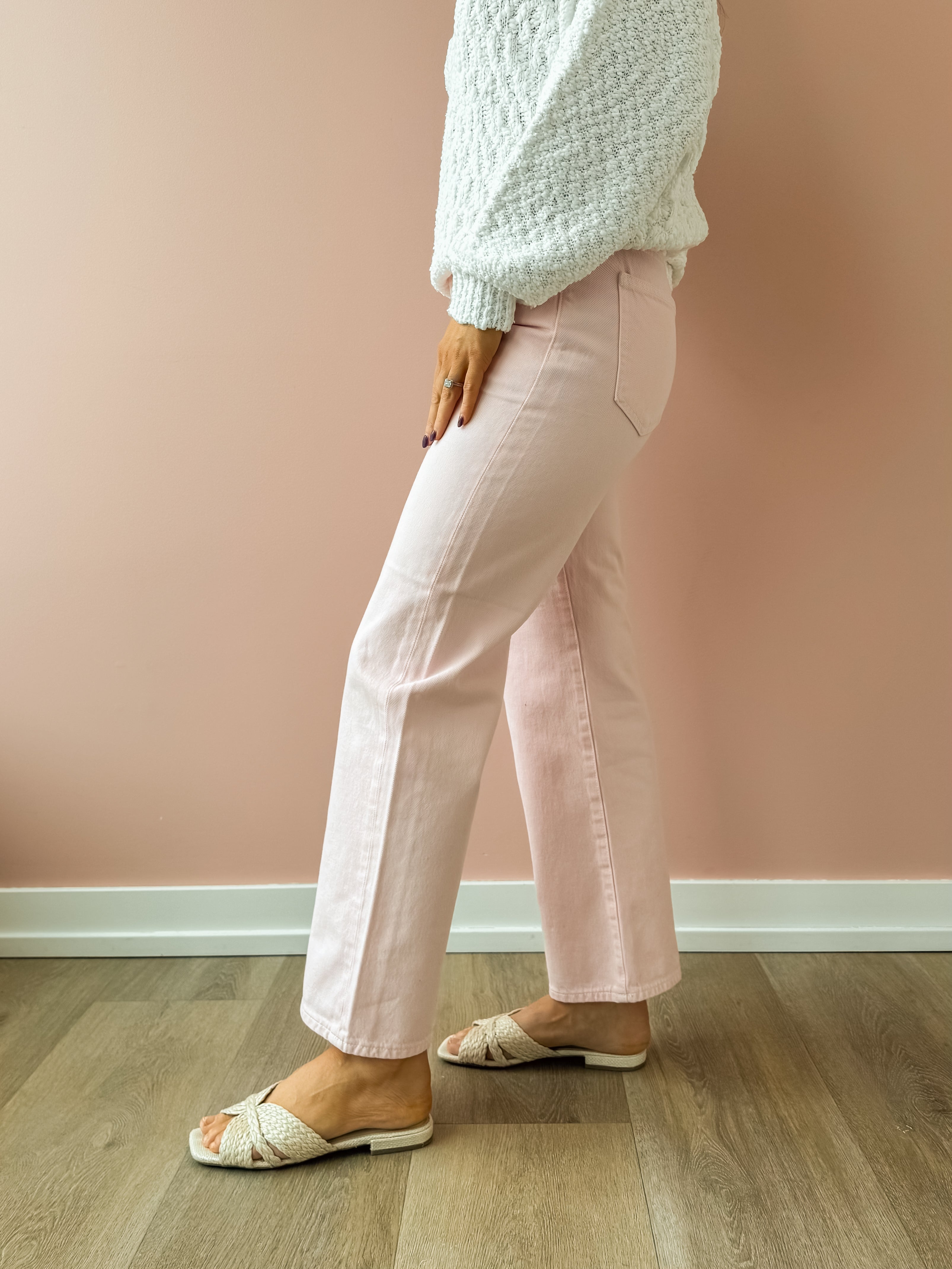 A best-selling silhouette, Lexi sits at a mid-rise with our signature bowed straight leg and a gentle curve through the knee that creates subtle dimension. Crafted in a dreamy blush pink, this style adds just the right amount of structure while still feeling effortless and wearable. The subtle bow in the leg creates a fashion-forward shape that elevates even the simplest outfit. Pair with a fitted bodysuit or lightweight knit to balance the volume, and finish with ballet flats, neutral sneakers, or a low heel. Add a cropped jacket or tailored blazer for an easy polished look that works from brunch to errands.