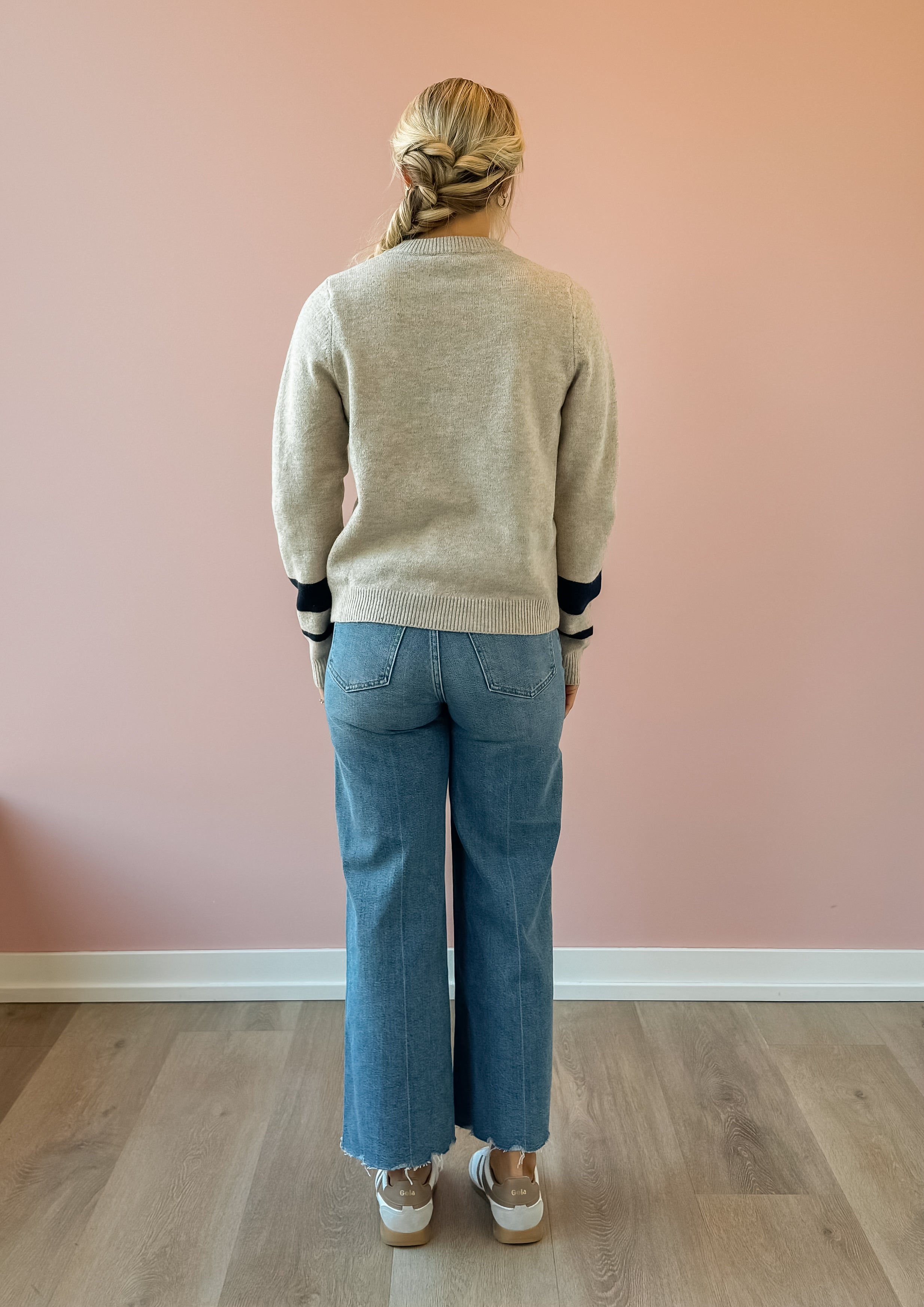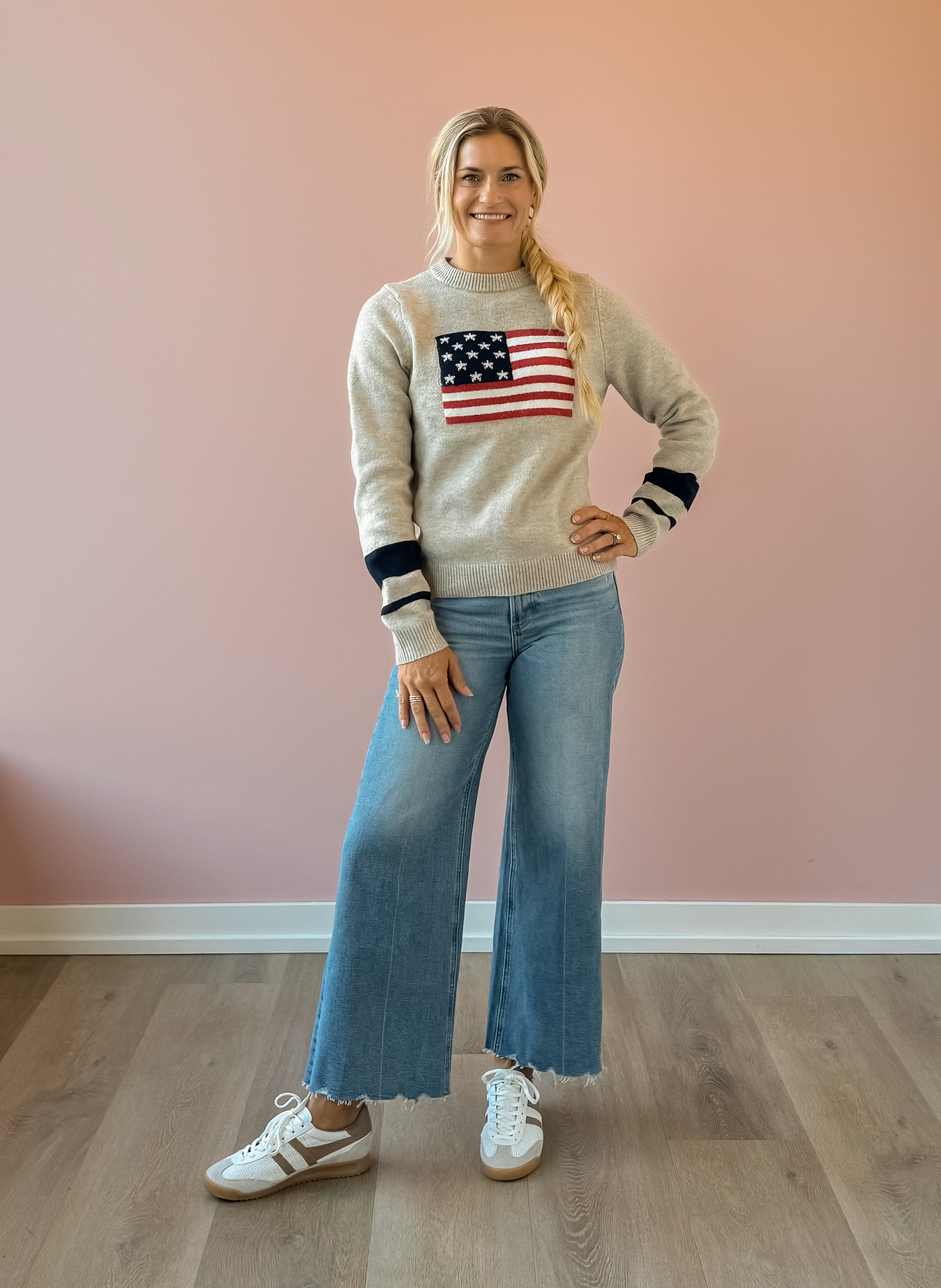 The Libby Sweater is your new go-to for cozy Americana charm. Featuring a soft oatmeal knit and vintage-inspired American flag detailing, it blends classic heritage with modern femininity. Its relaxed fit and timeless palette make it perfect for layering through every season. Style it with denim shorts and boots for a laid-back weekend look, or tuck it into a flowy midi skirt with sneakers for an elevated, casual vibe!
