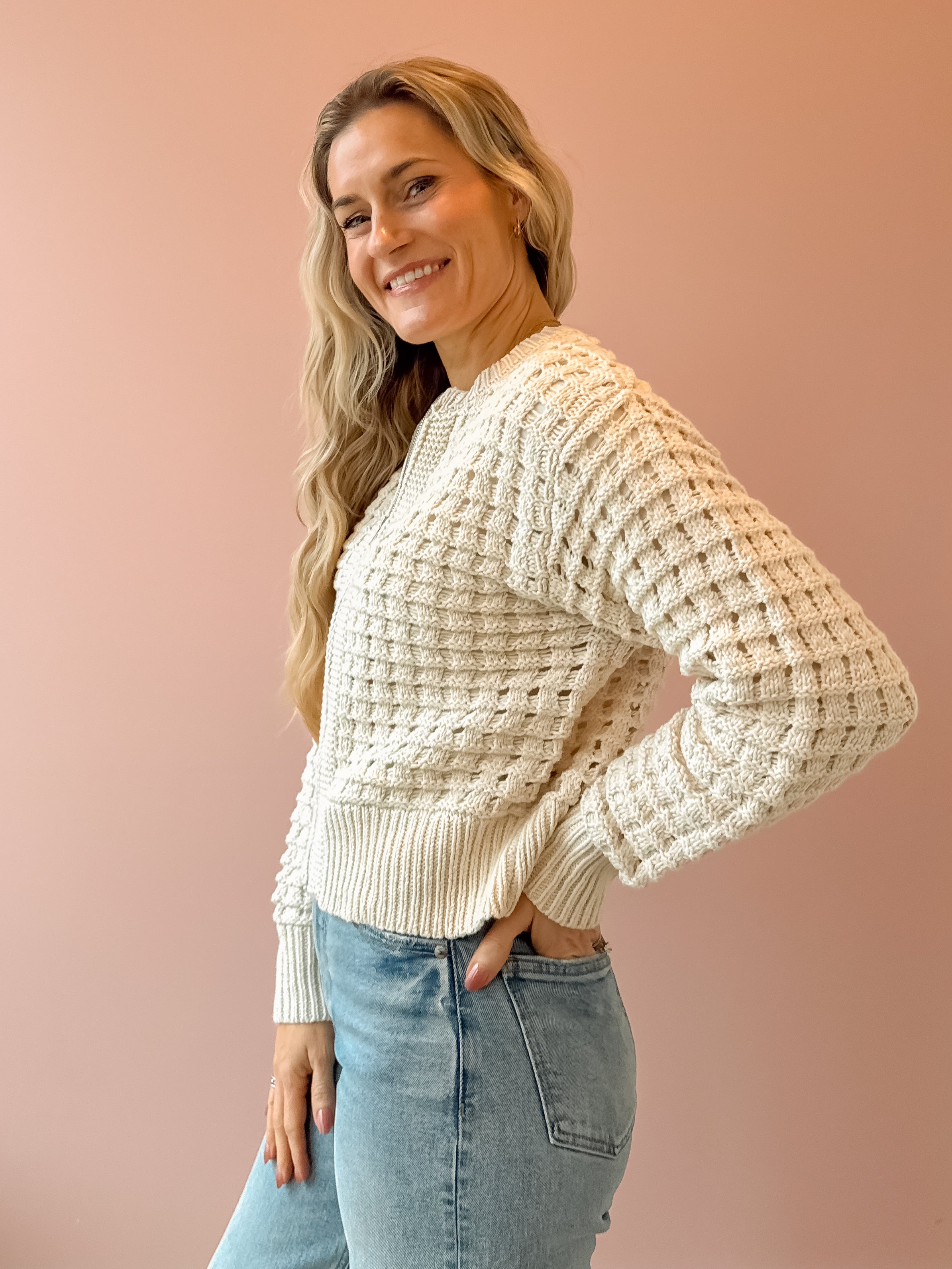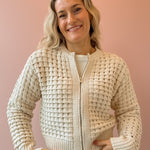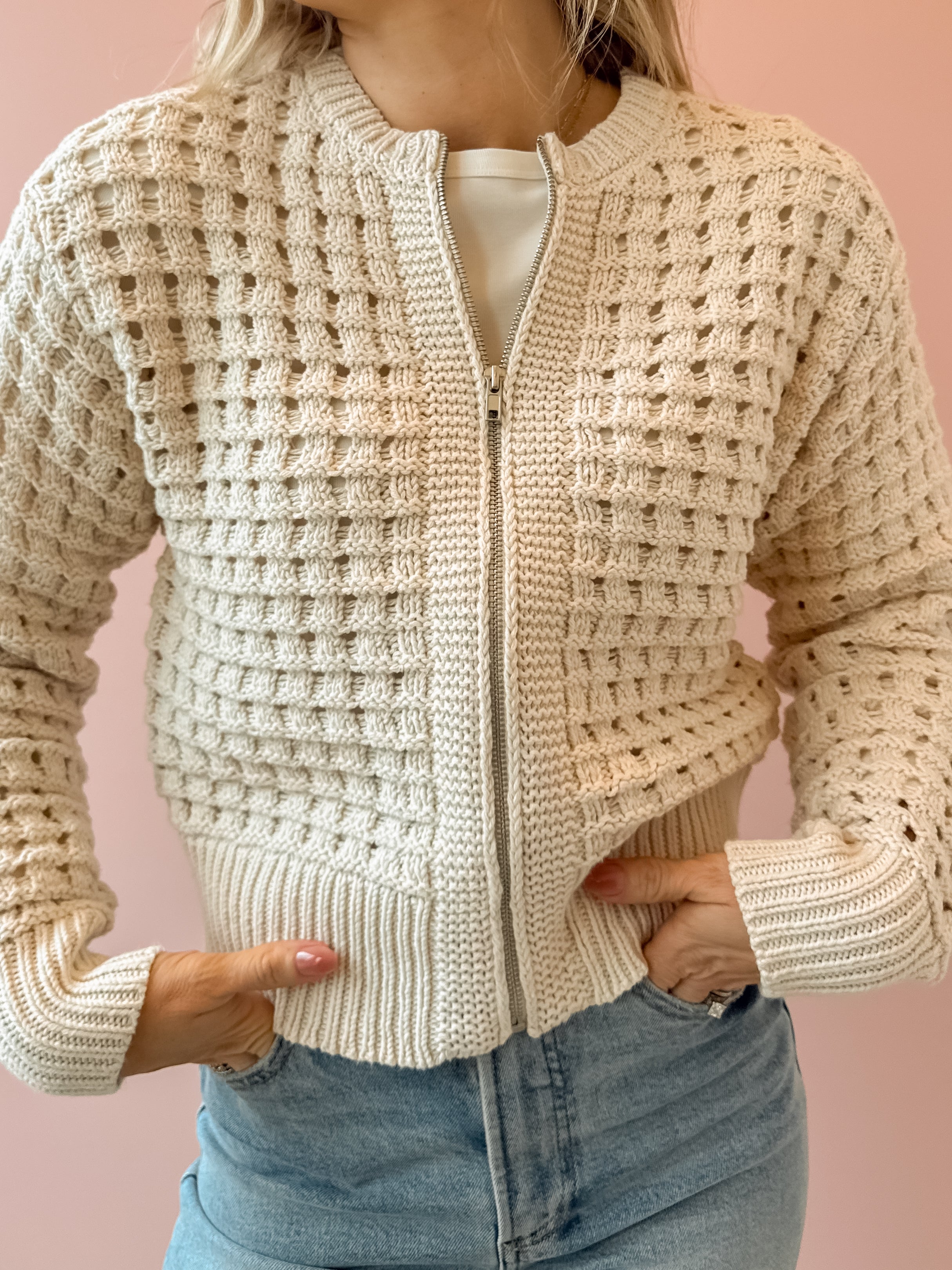 Crafted from soft cotton-blend yarns, this sweater jacket features a novelty knit texture that adds depth and dimension. With ribbed trims, a crew neckline, and an exposed zipper, it’s the perfect piece for transitional layering and all-day comfort.