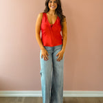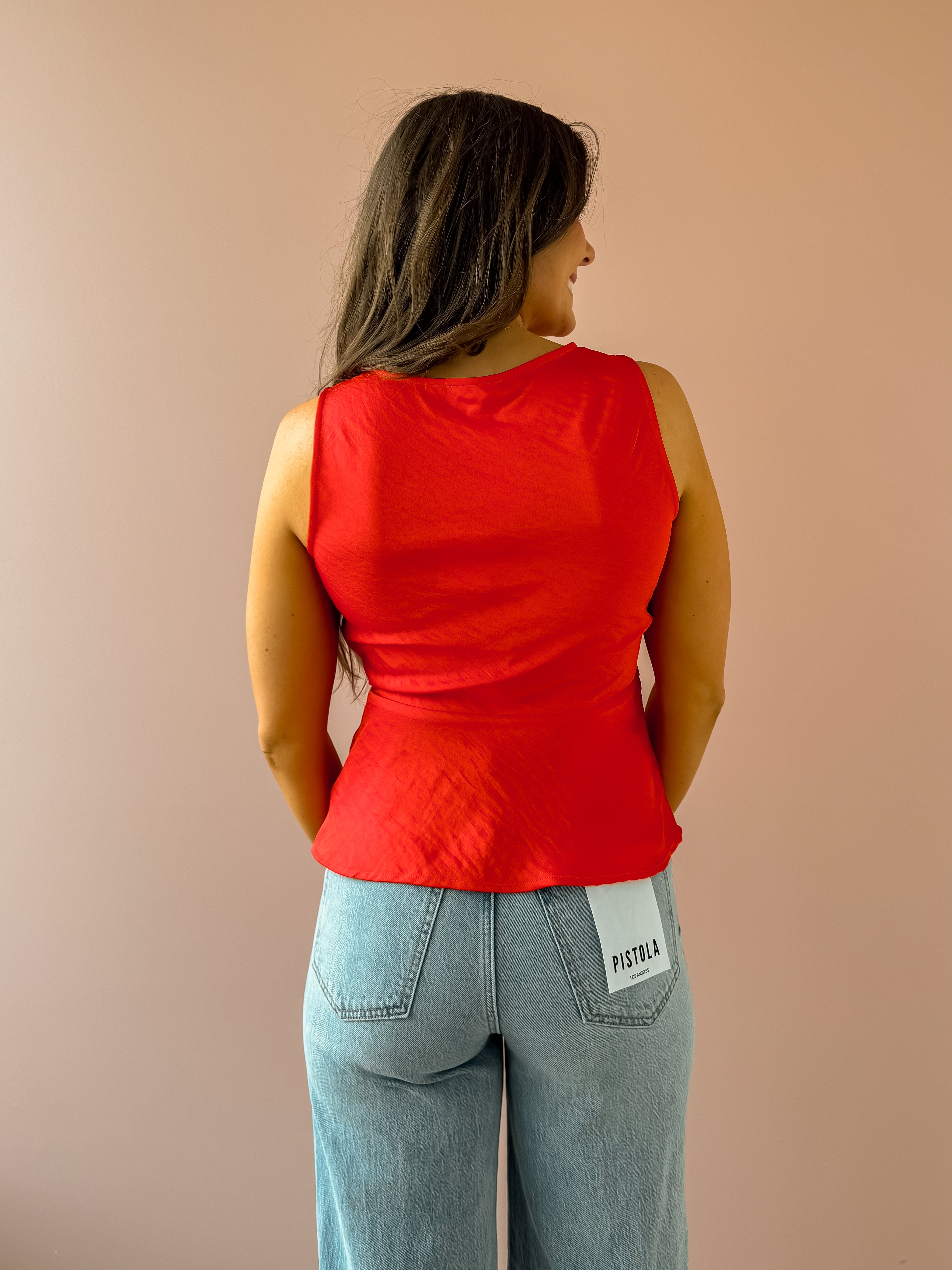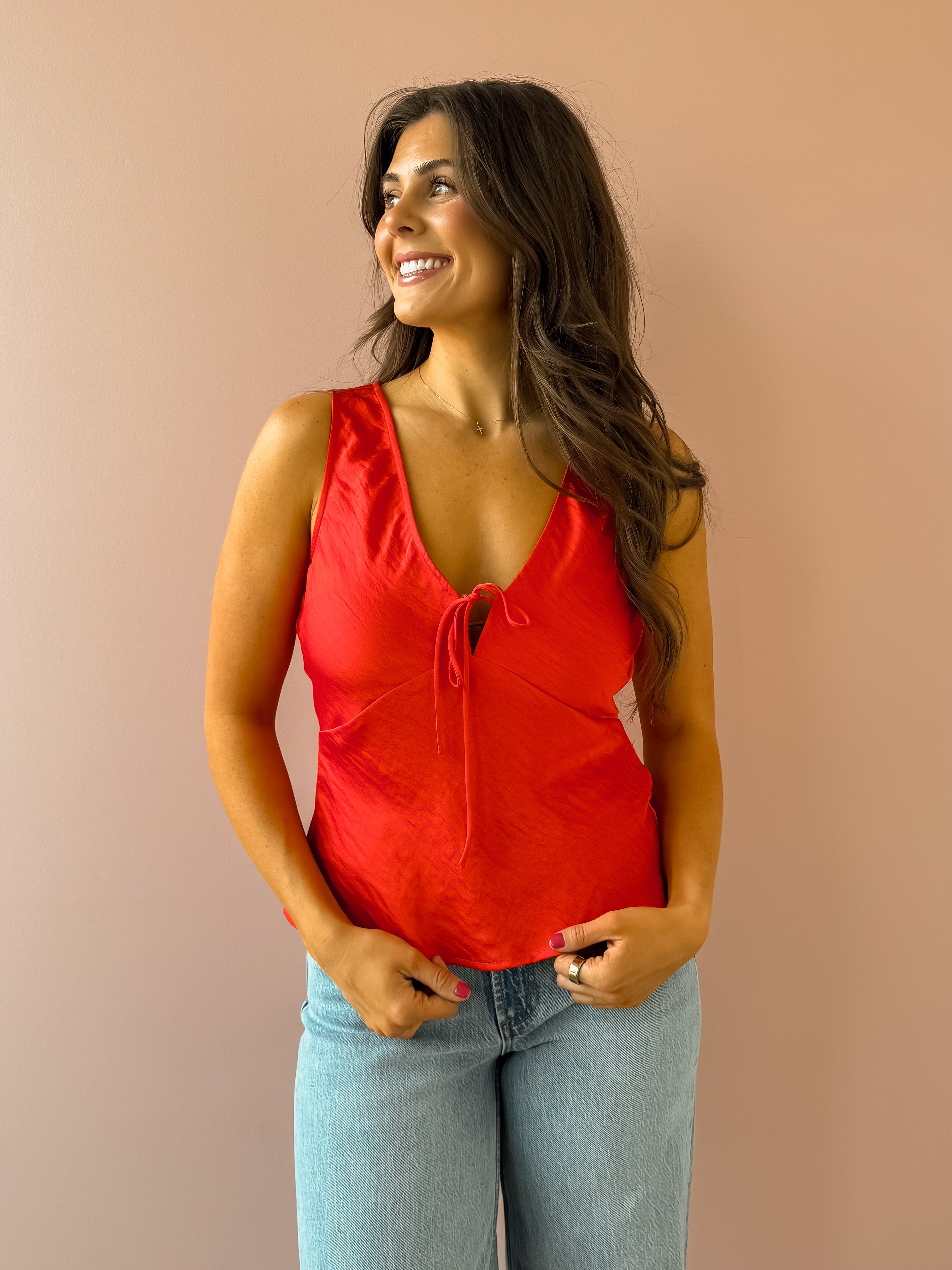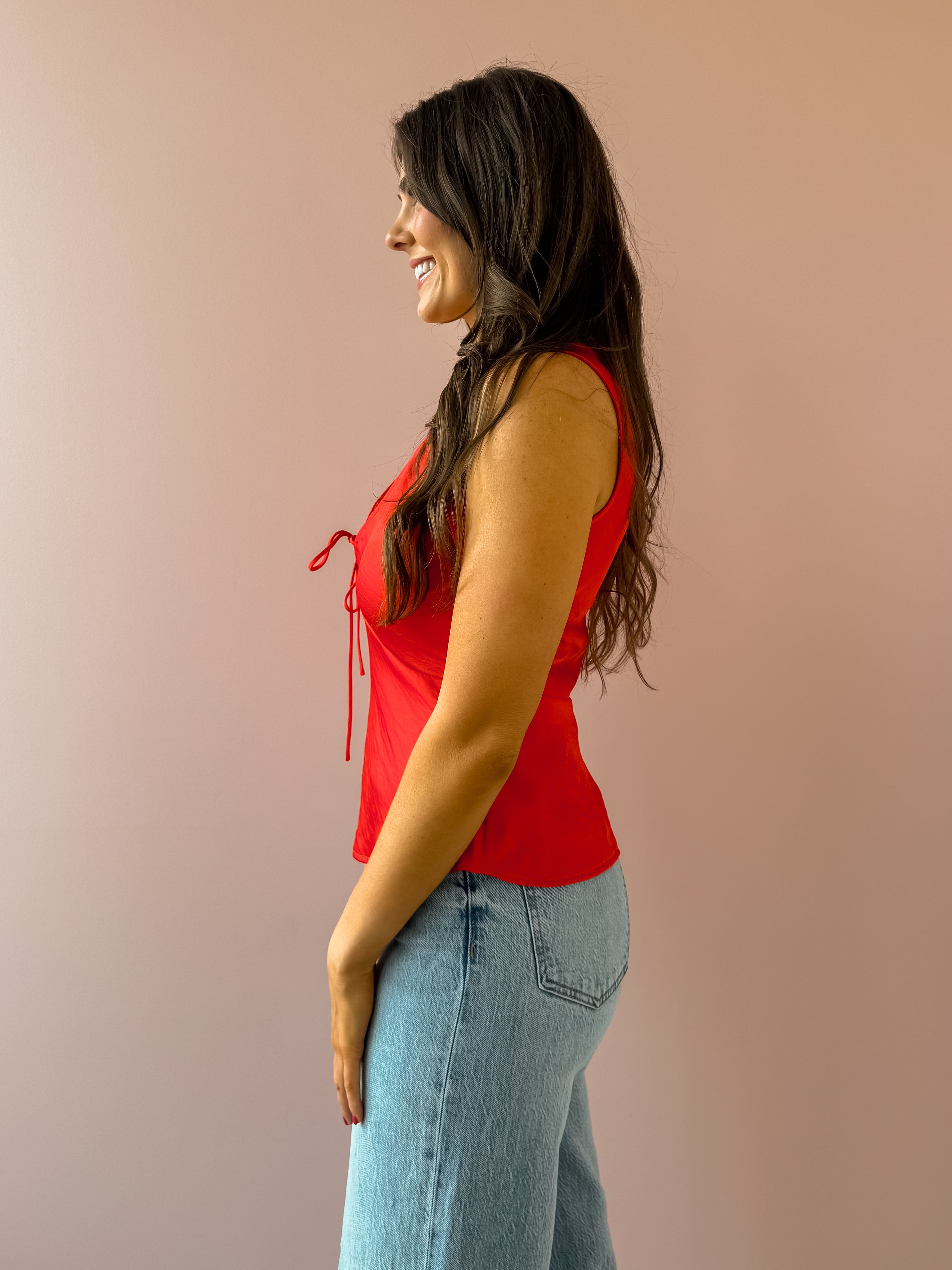 The Luana Top is a standout piece crafted from luxe satin with a soft, fluid drape. Designed with a flattering v-neckline, sleeveless silhouette, and a front tie closure that creates a delicate bow, it strikes the perfect balance of feminine and alluring. Lightweight with a heavy soft wash, it feels comfortable while still looking refined. Style it with denim and heels for an effortless date-night look that feels confident and chic.