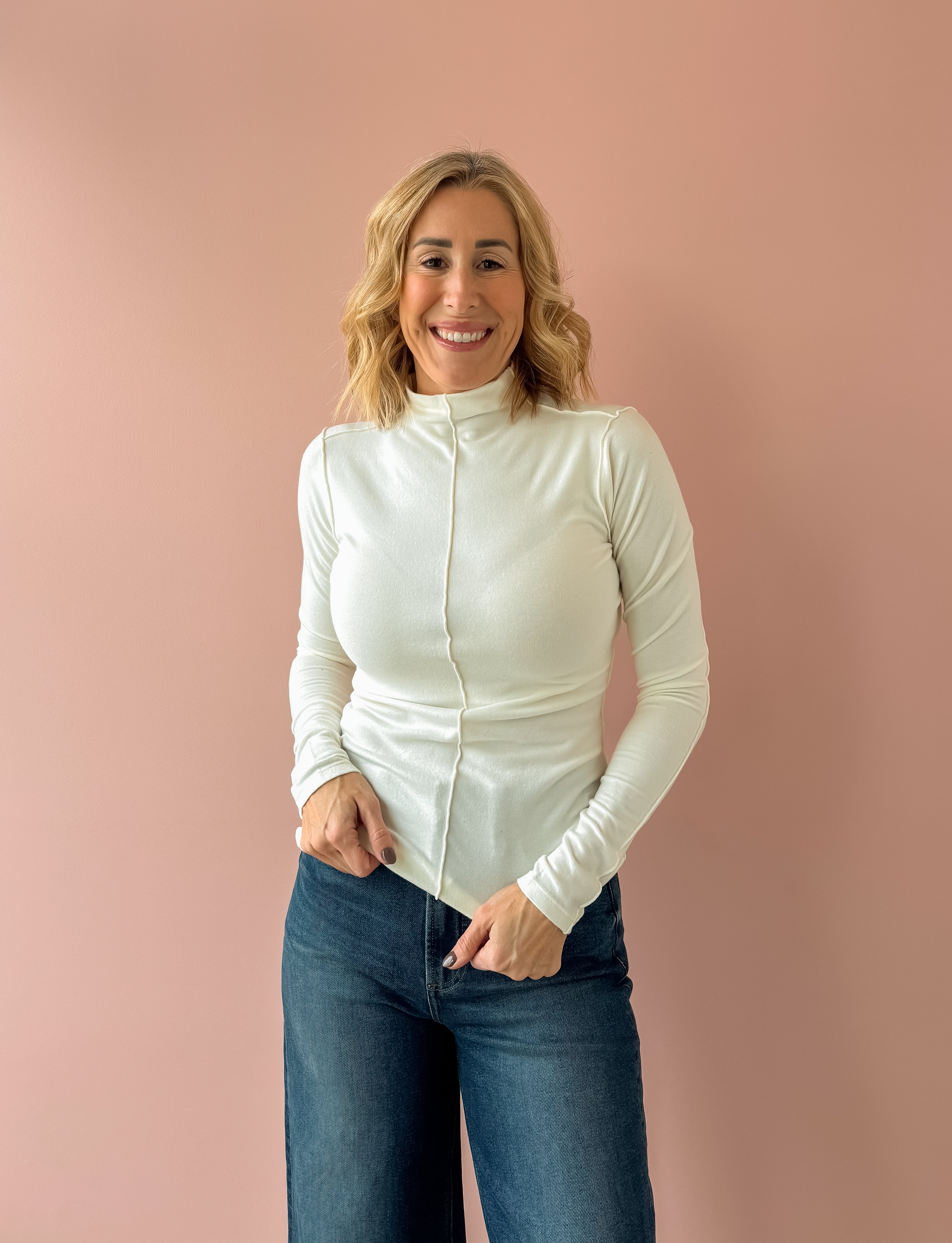 Elevate your wardrobe with the Marisol Long Sleeve, a classic mock-neck top in a timeless pure ivory hue. Thoughtful stitching enhances the silhouette, adding a unique and subtly flirty touch. Pair it effortlessly with jeans and boots for an easy, chic look that blends comfort and style.