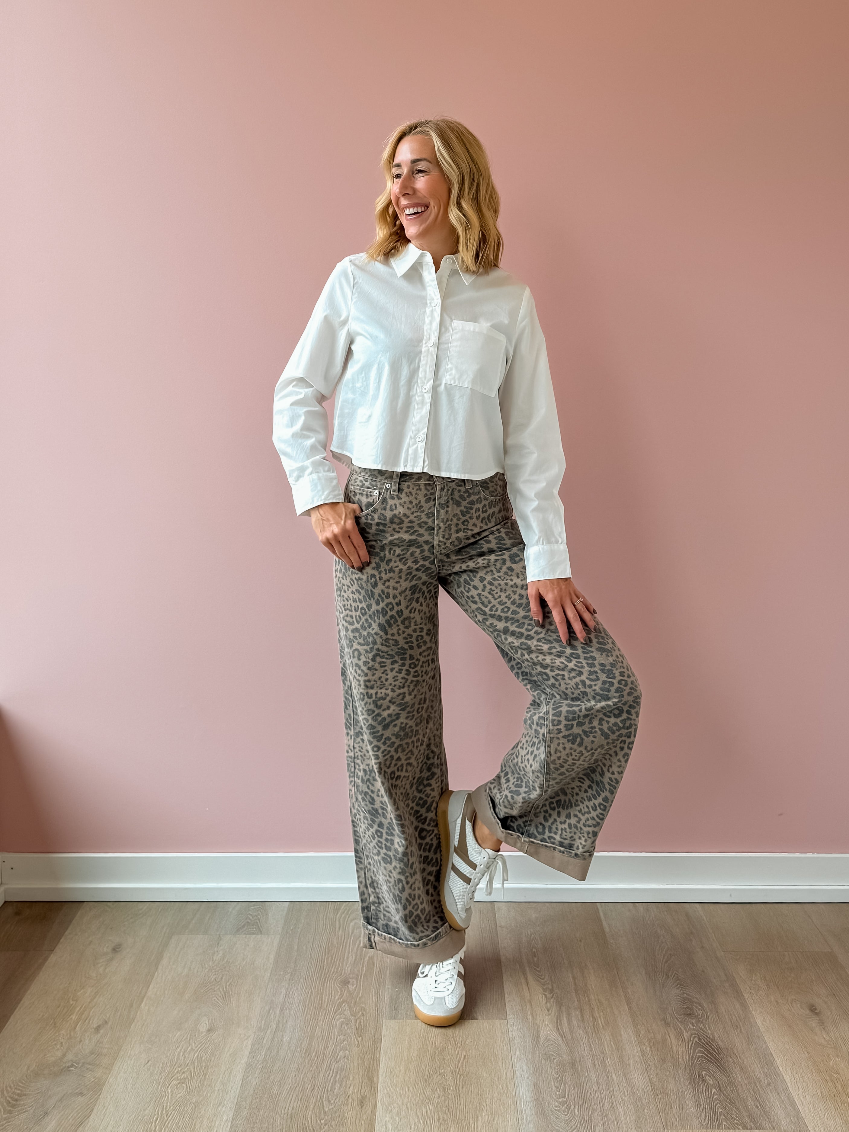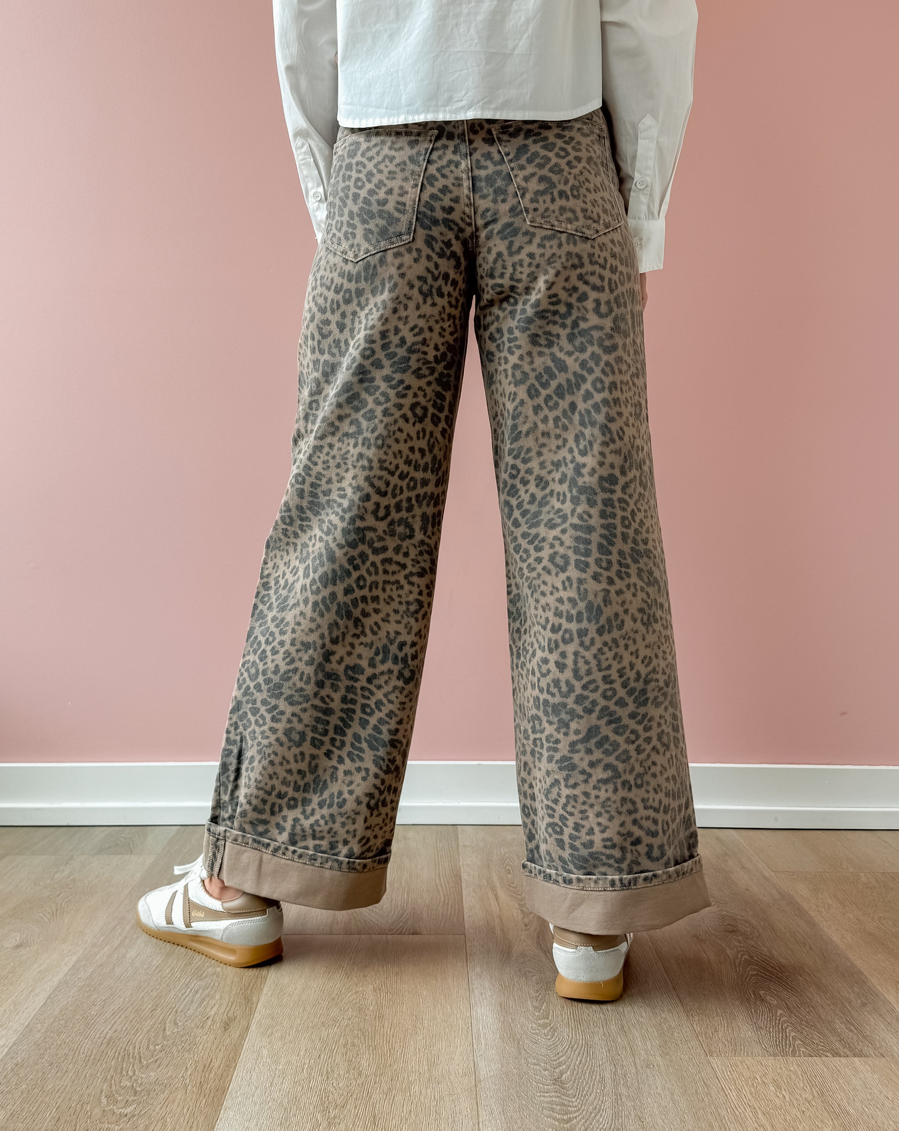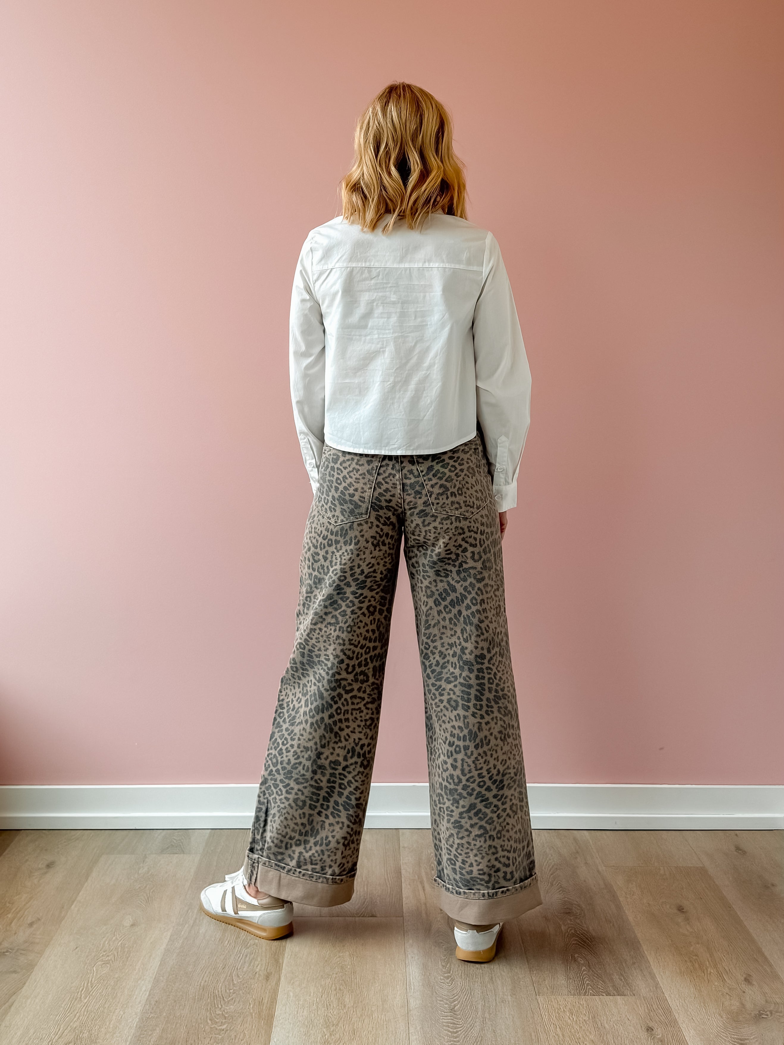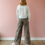 The Marlin Leopard Pant brings bold energy to a timeless silhouette. Made from structured denim with a heavy soft wash, this high-rise, full-length style features a wide leg and utility-inspired five-pocket design for a modern edge. The fit is close through the waist and hip, with a relaxed drape through the leg—size up for a roomier feel. Style it with a fitted tank or graphic tee, and finish with sneakers or heeled boots for a look that’s effortlessly cool.