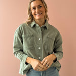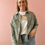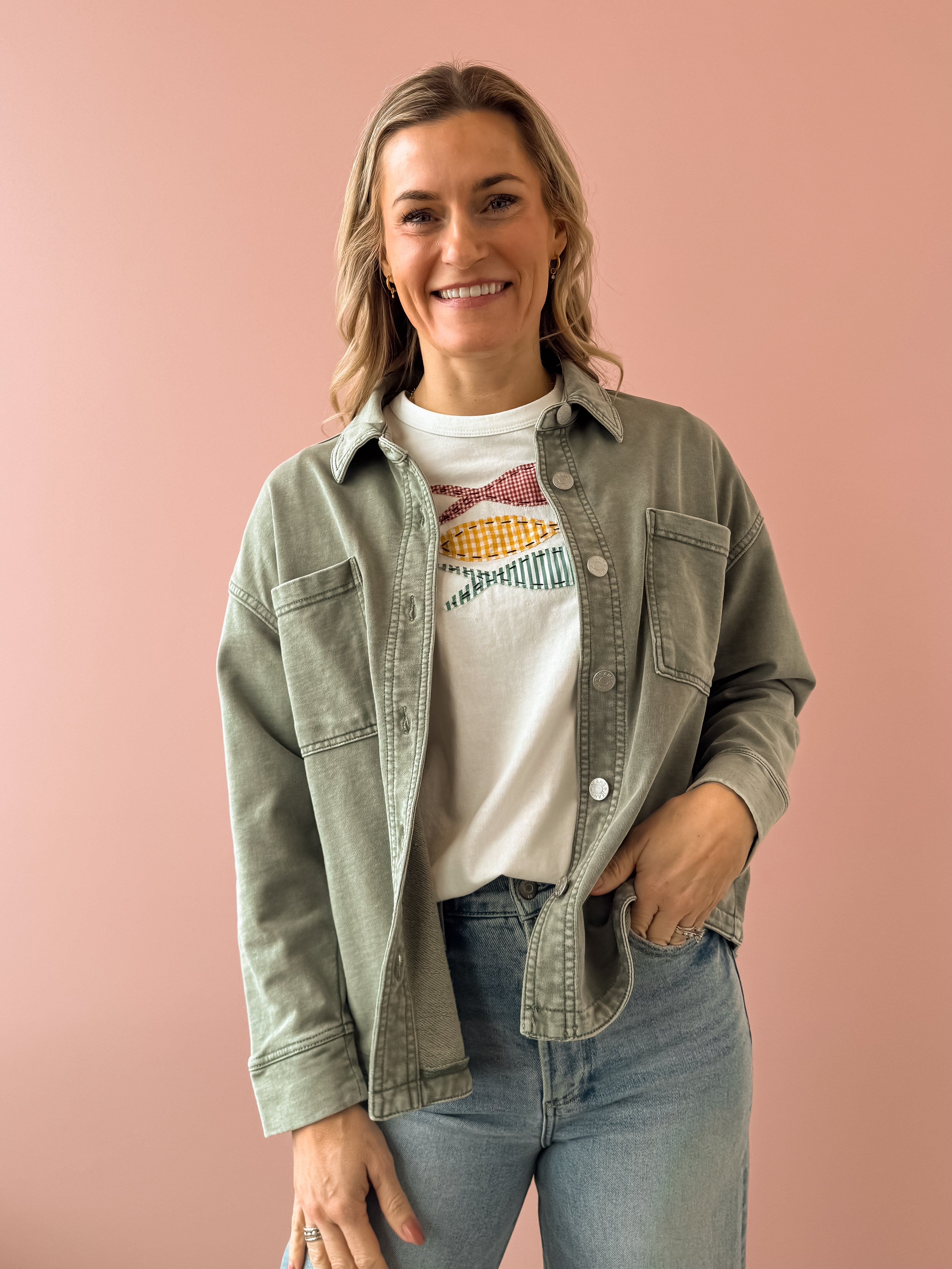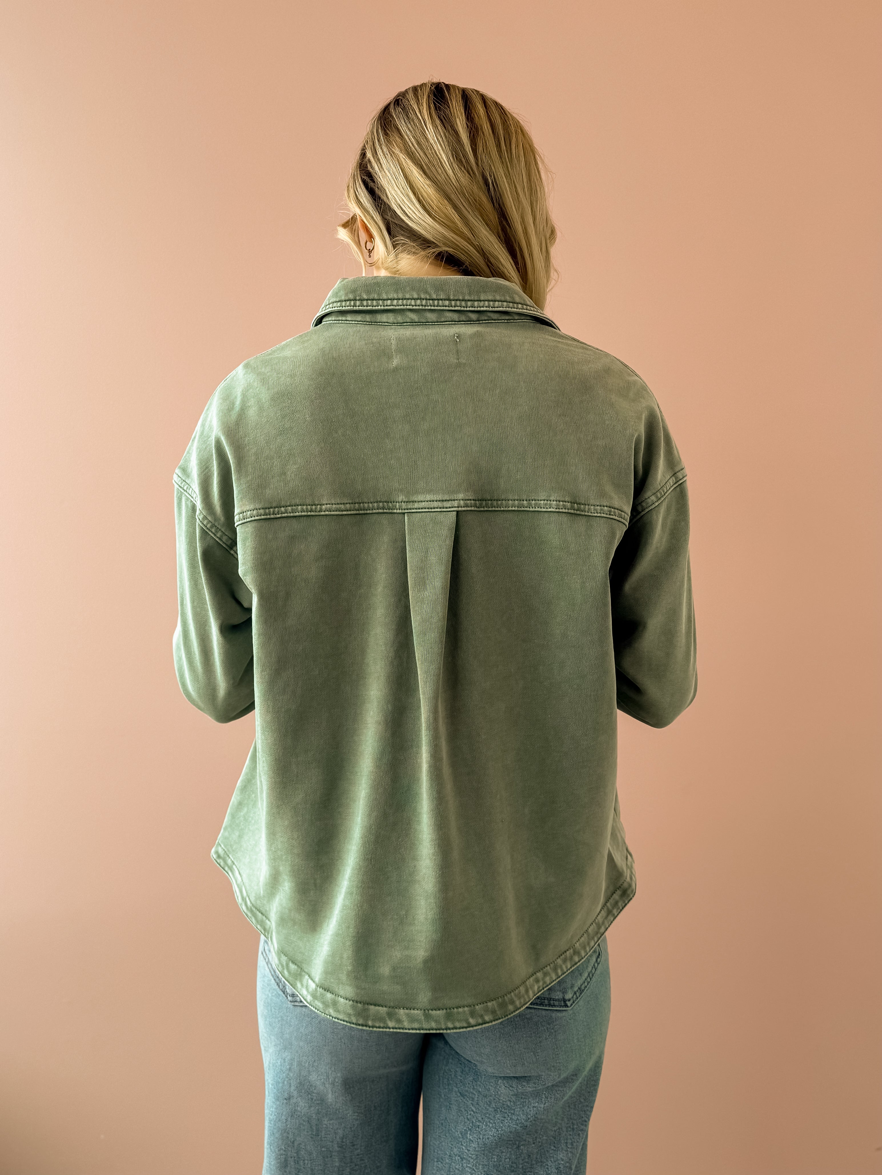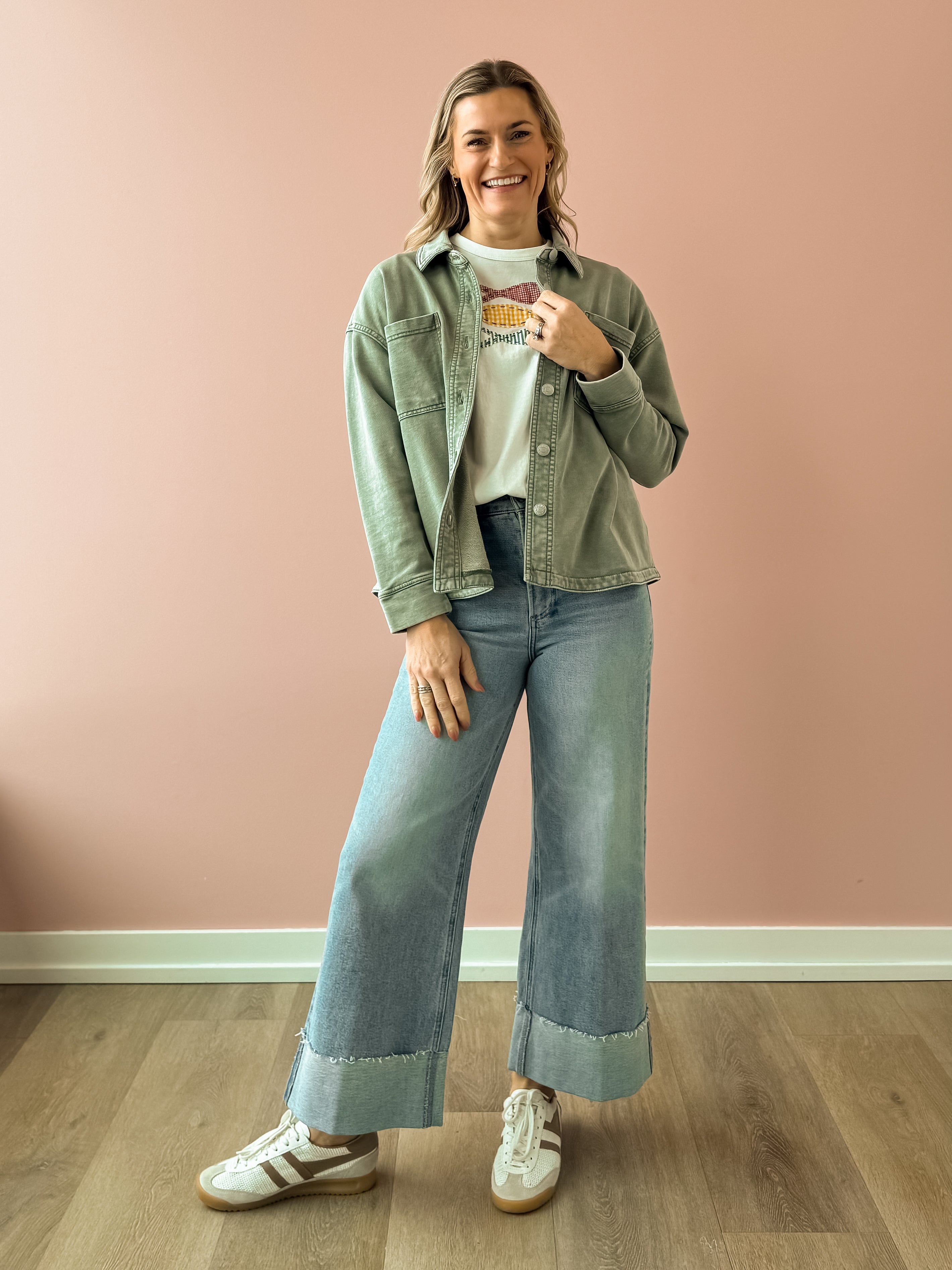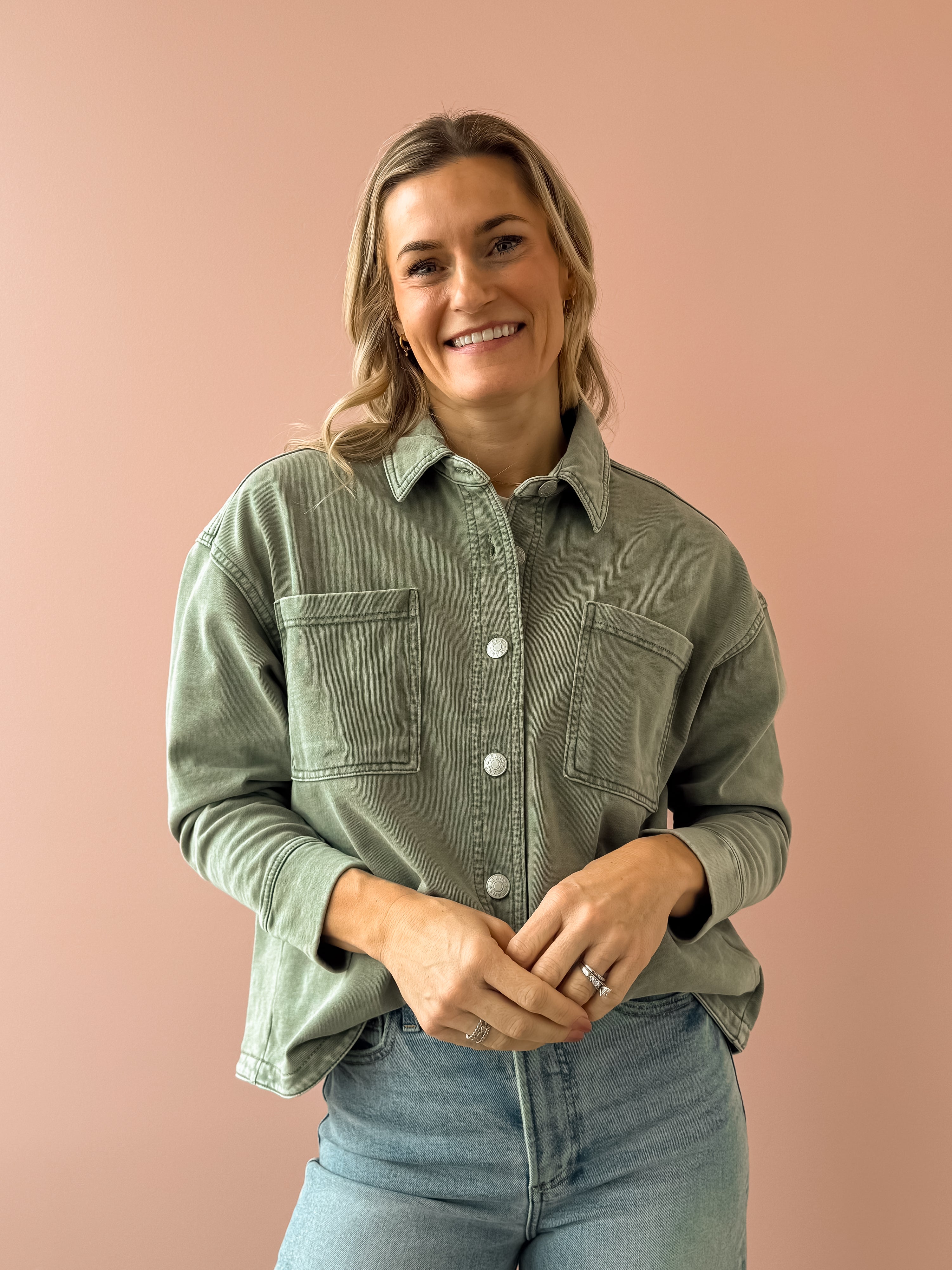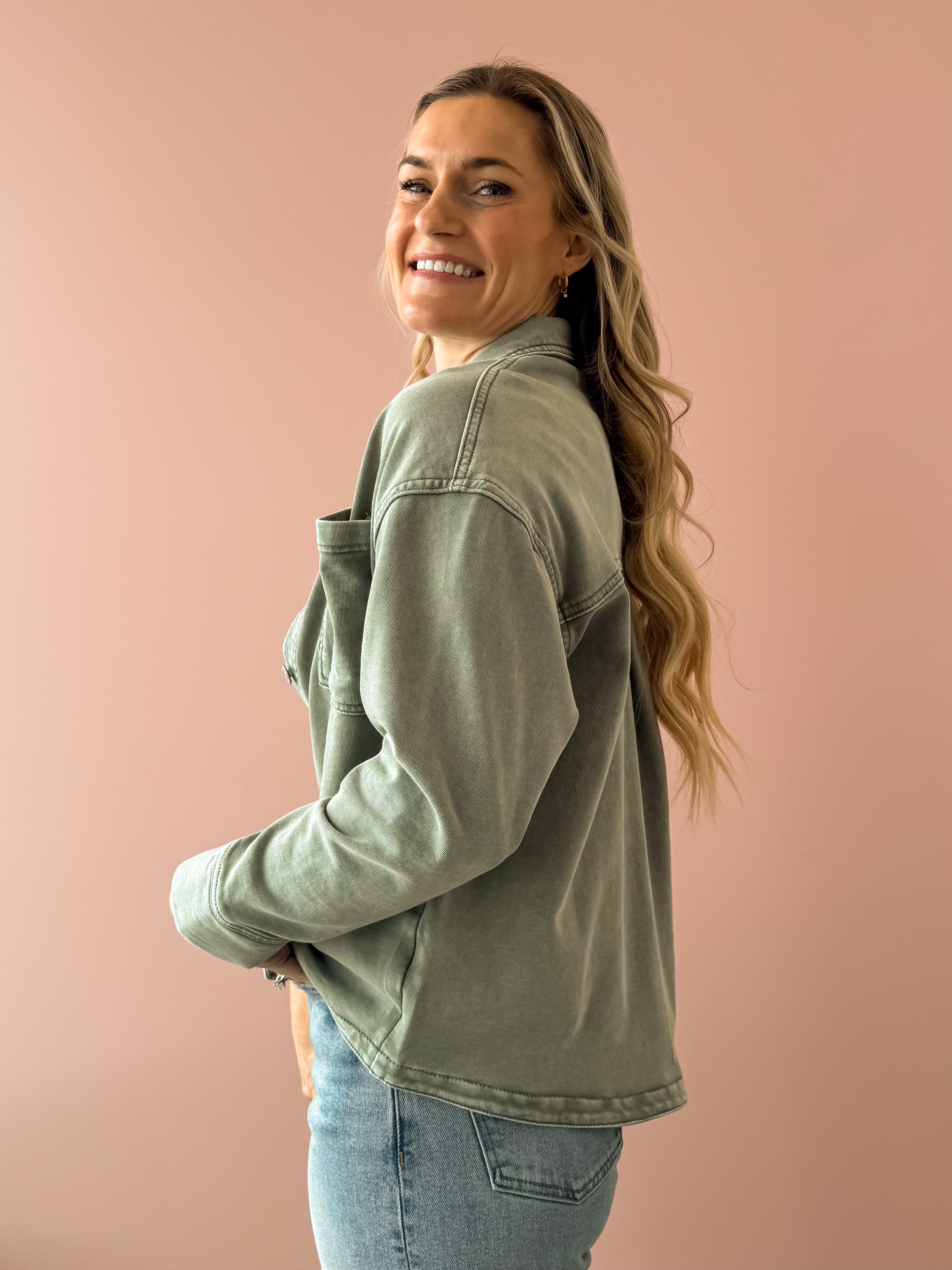 The Matcha Moment Jacket is the versatile shacket you've been waiting for. This garment-dyed piece combines the polished structure of a classic denim shirt jacket with modern comfort—featuring a soft, stretchy fabric that adapts to your movements throughout the day. The beautifully washed finish adds character, while the oversized fit and cropped silhouette deliver contemporary edge. Complete with a collared neckline, long sleeves, and front button closure, it's the perfect layering piece that transitions seamlessly from casual weekends to effortless weekday style. Throw it over your favorite tee and denim for an instantly put-together look.