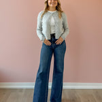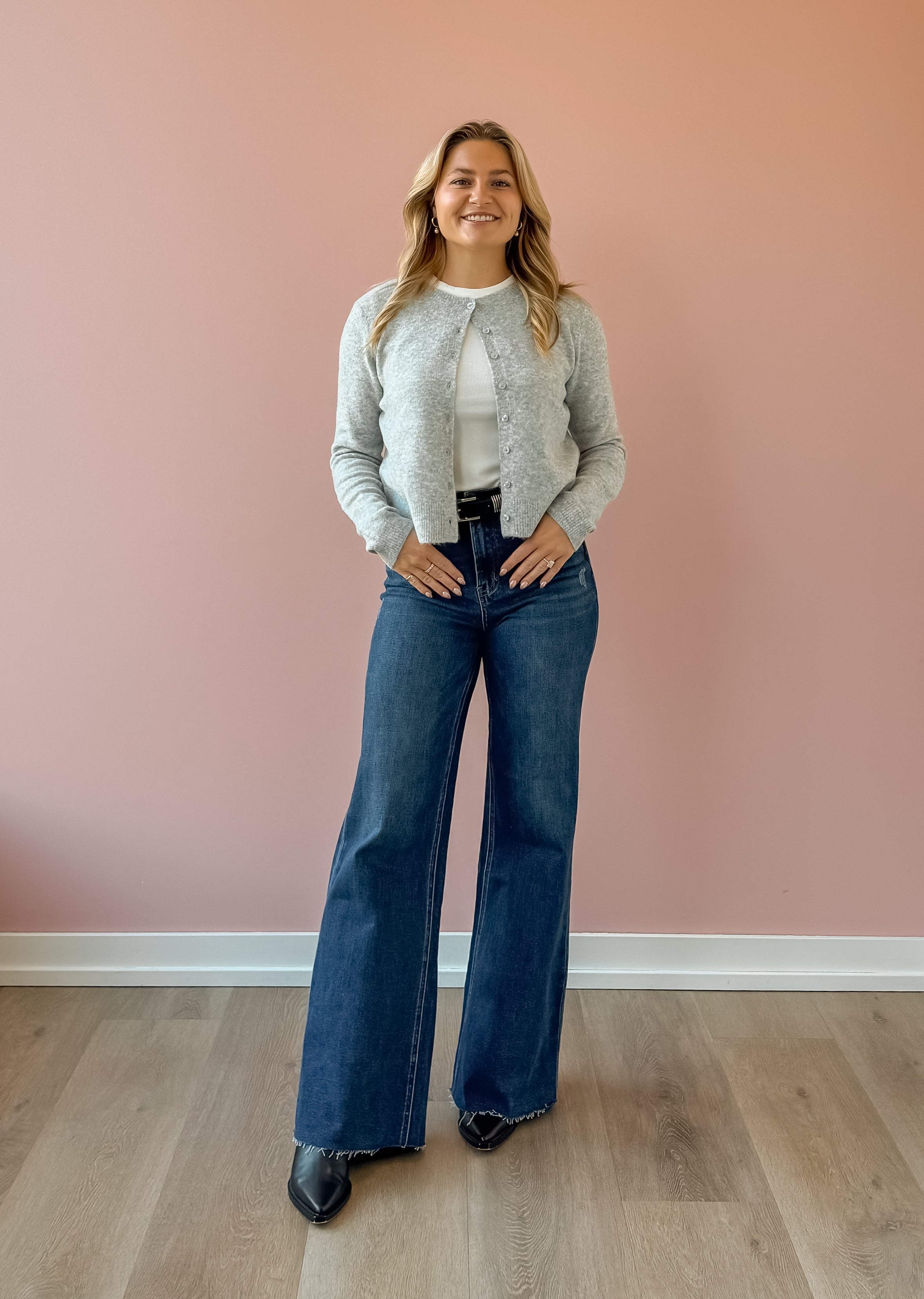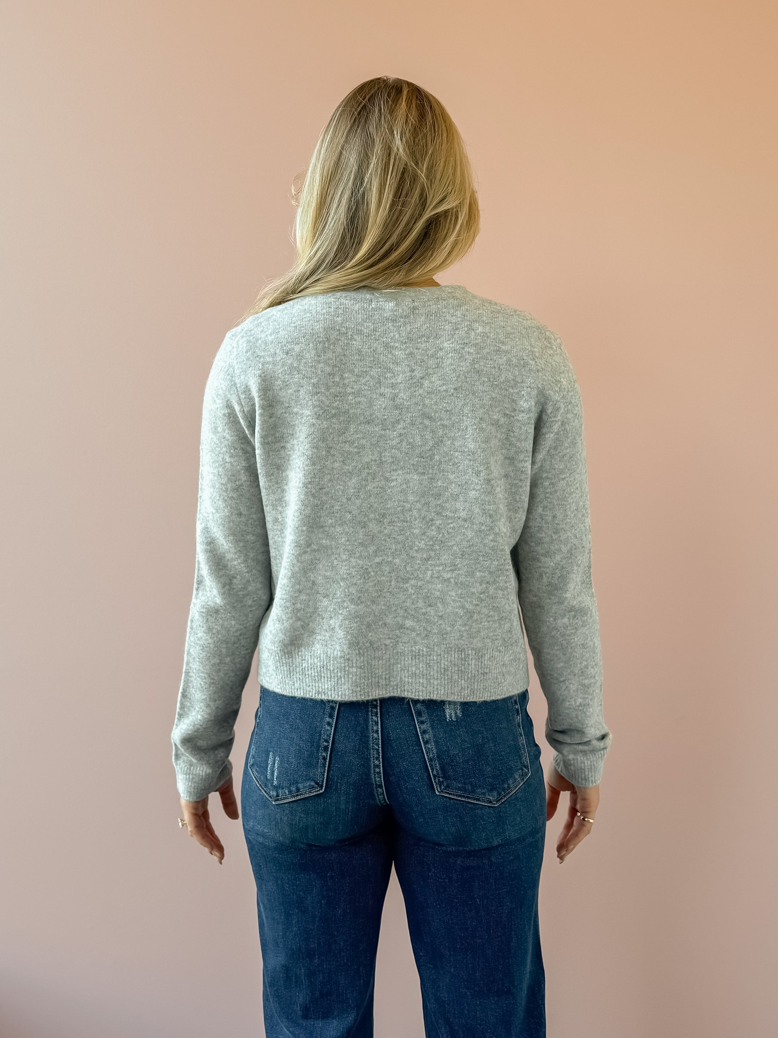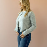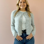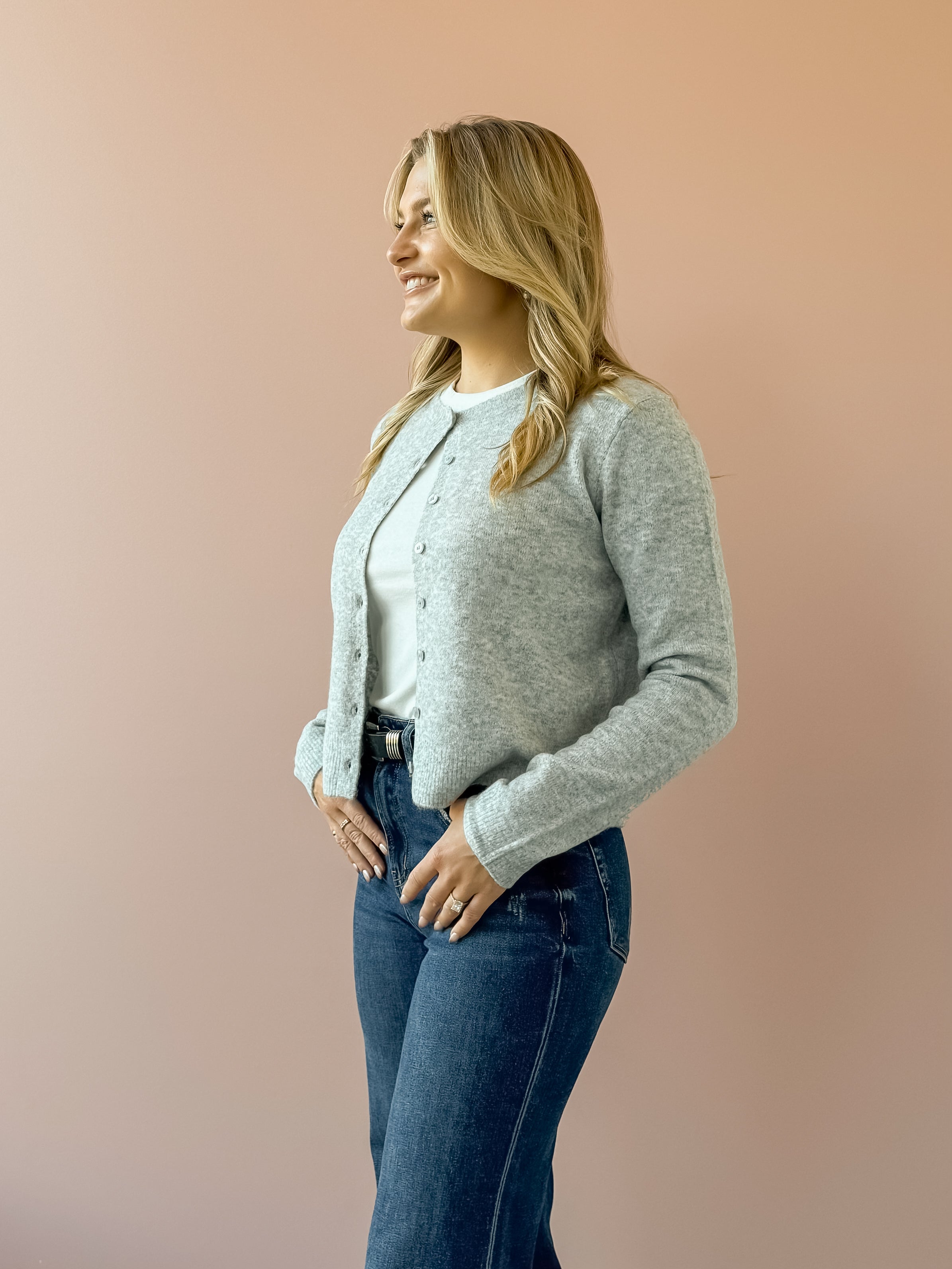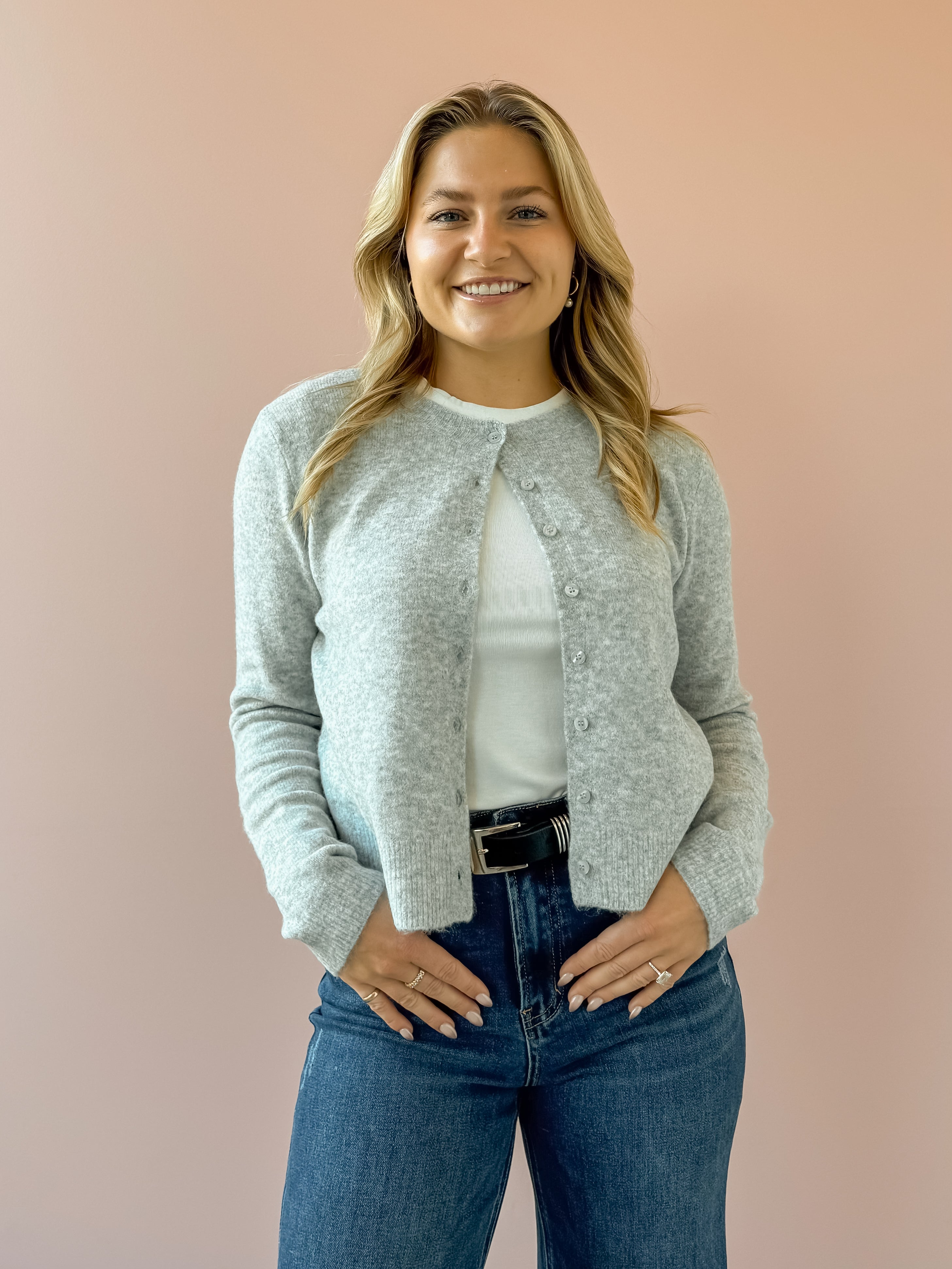 Experience the luxurious style and comfort of our soft sweater yarns with the Medina Cardigan in a light heather grey. Designed for layering, this essential piece boasts a timeless crew neck and button front, making it a must-have in any wardrobe. Style with trousers for work, or denim with flats!