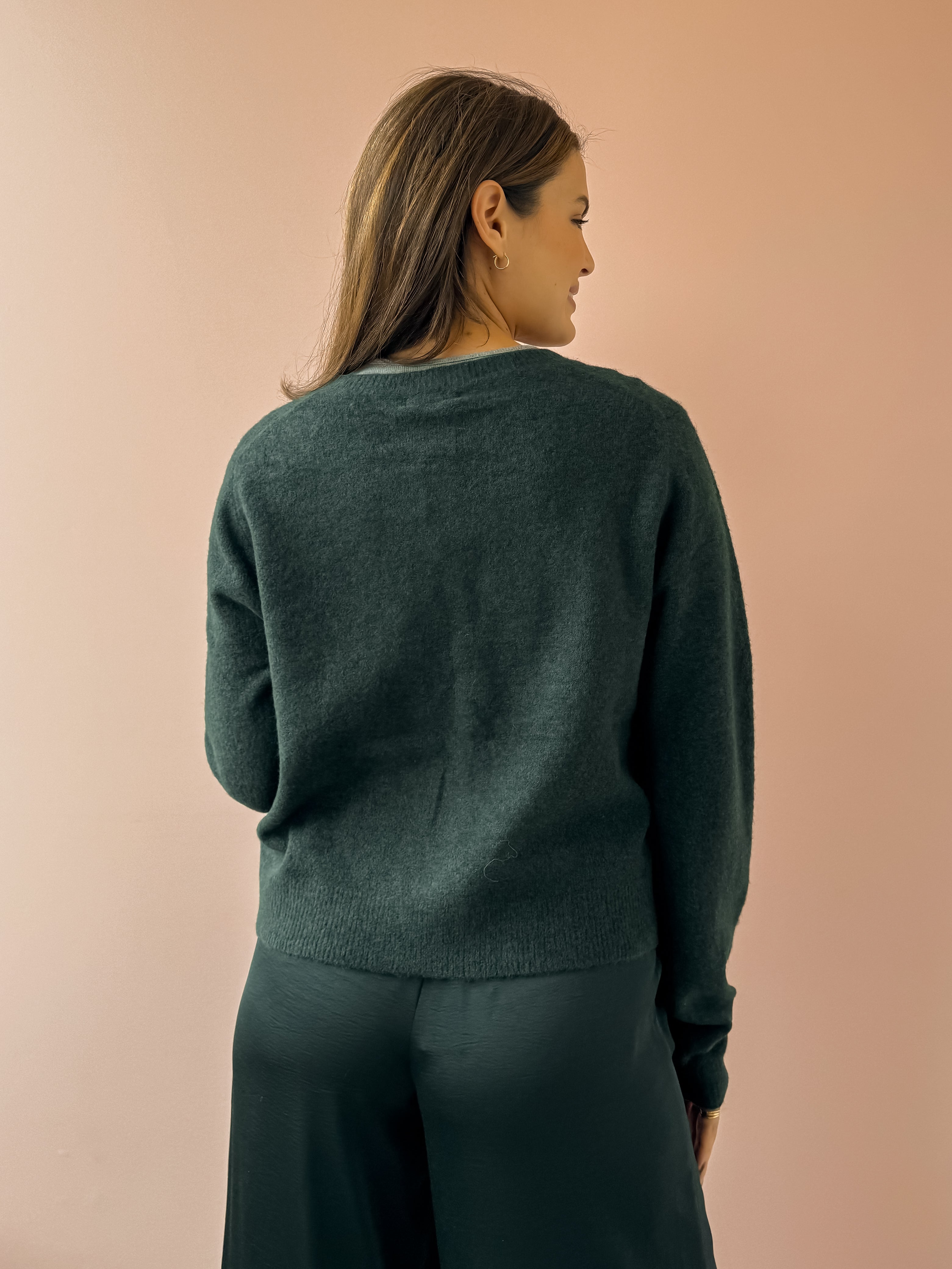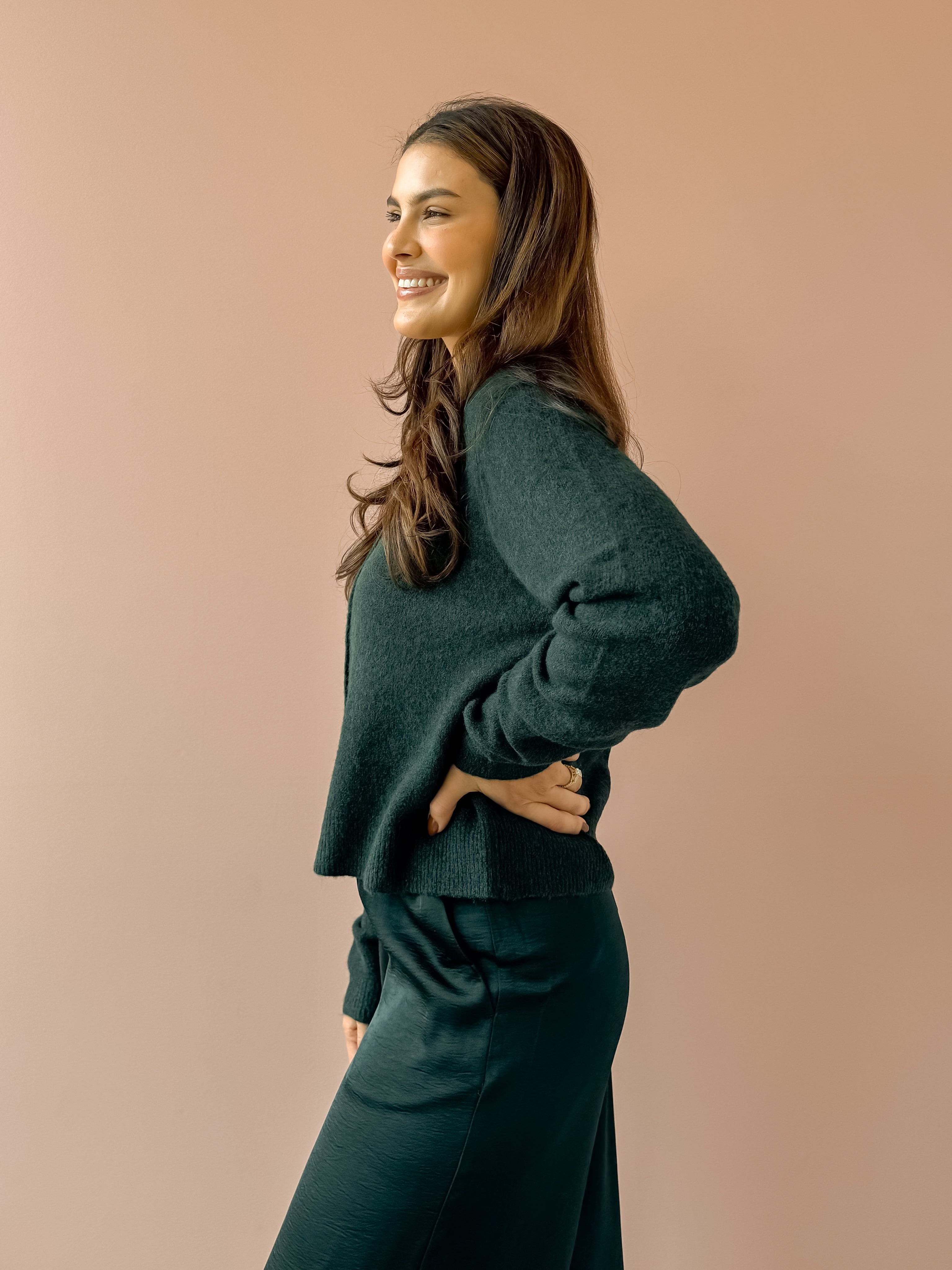 Experience the luxurious style and comfort of our soft sweater yarns with the Medina Cardigan in a stunning garland green. Designed for layering, this essential piece boasts a timeless crew neck and button front, making it a must-have in any wardrobe. Style with trousers for work, or denim with flats!