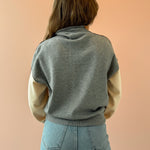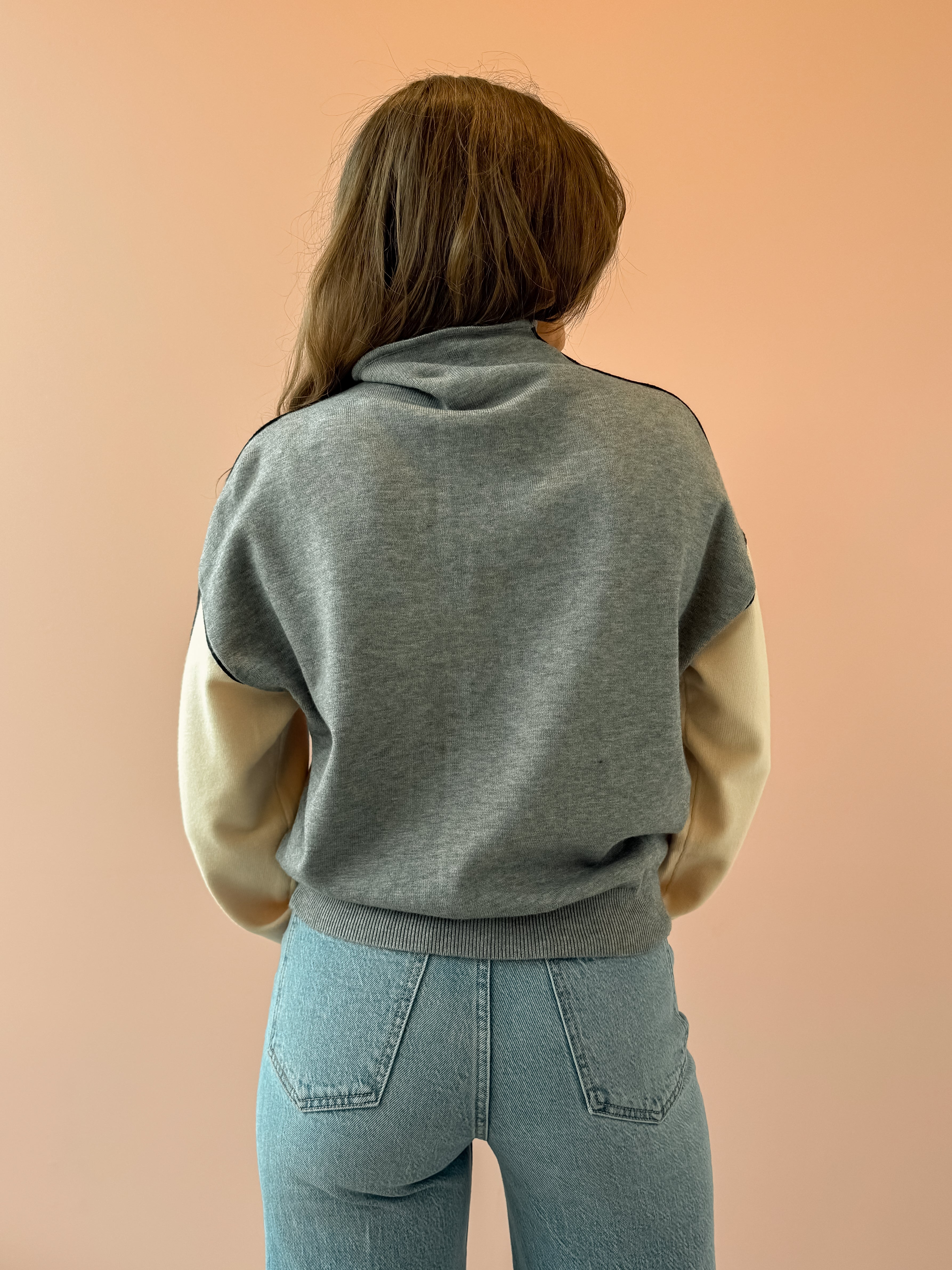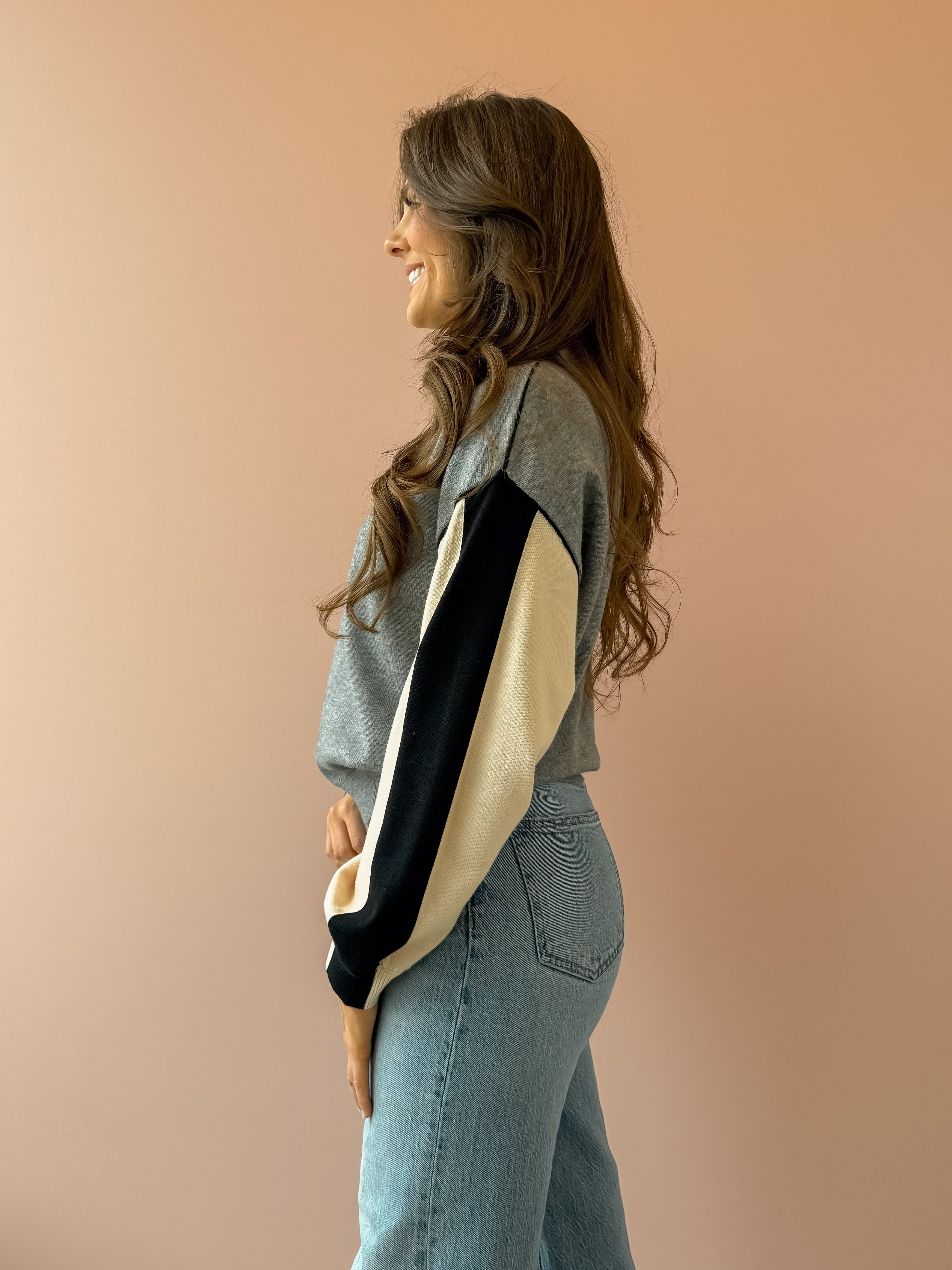 The Michelle Sweater combines cozy warmth with stylish details. Its soft grey fabric offers comfort, while the ivory and black color-block add a chic pop of color. Perfect for busy days, this long sleeve sweater pairs effortlessly with jeans and sneakers, making it your go-to for casual, on-the-move looks. Embrace effortless style and comfort with the Michelle Sweater.