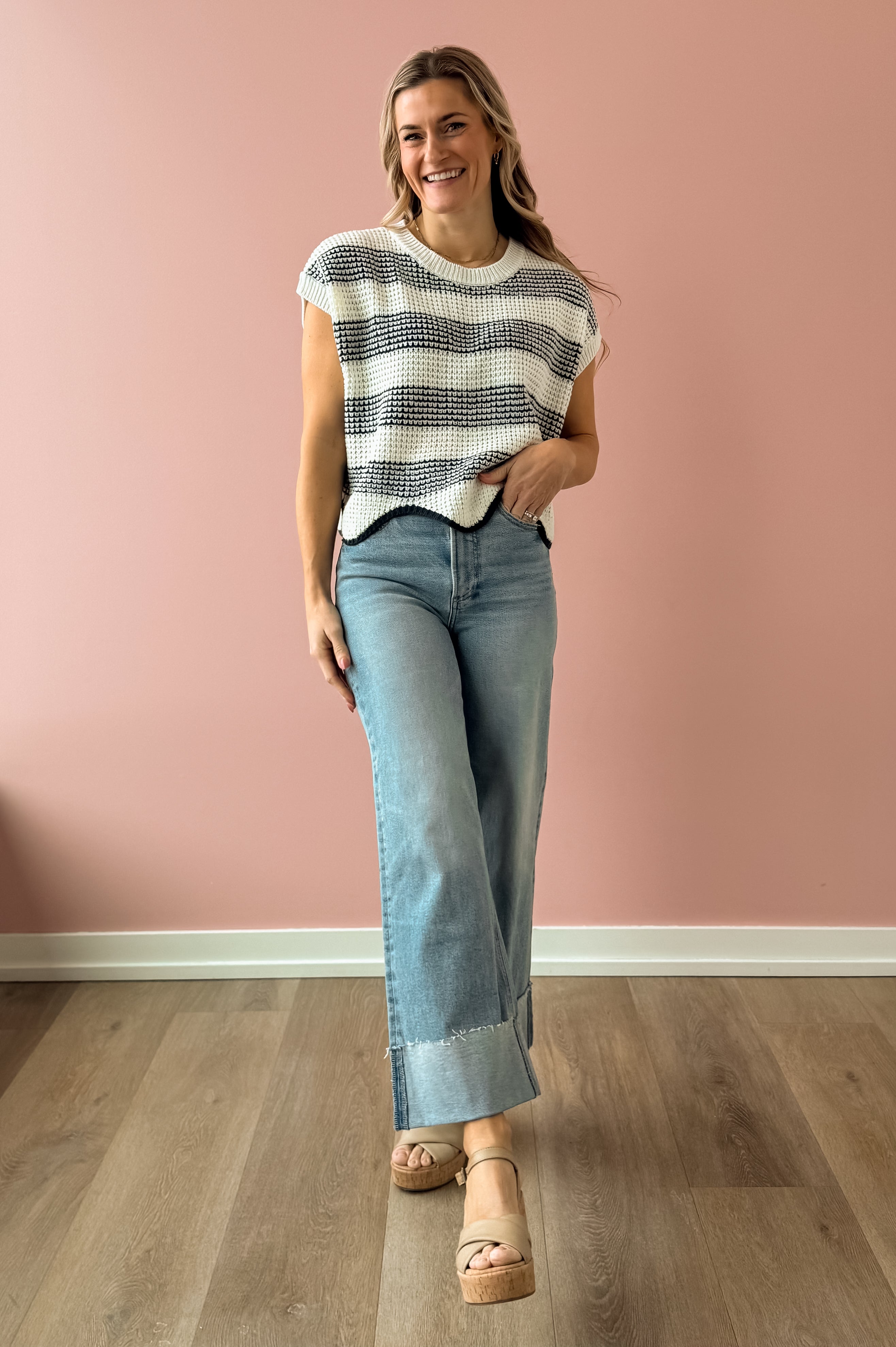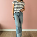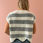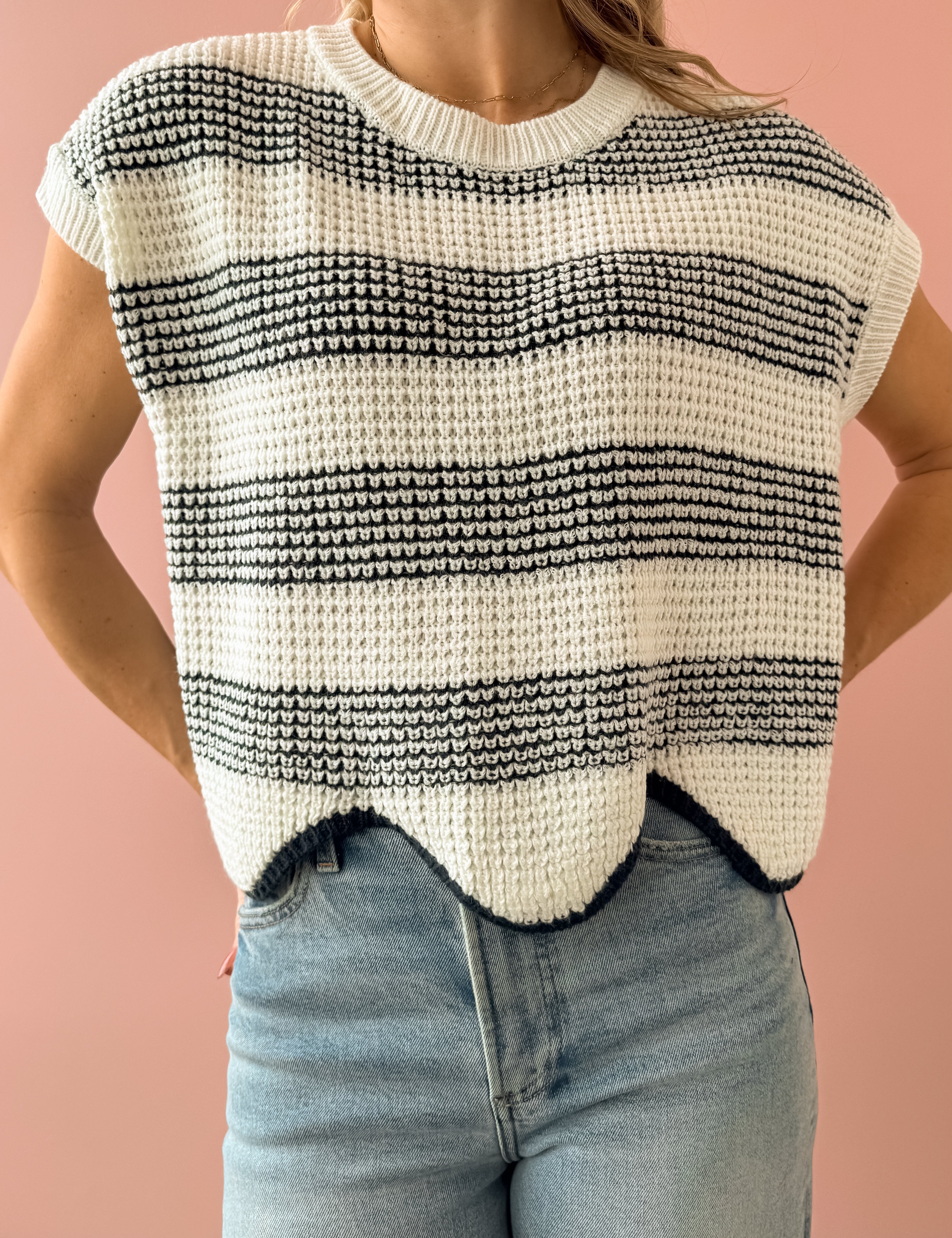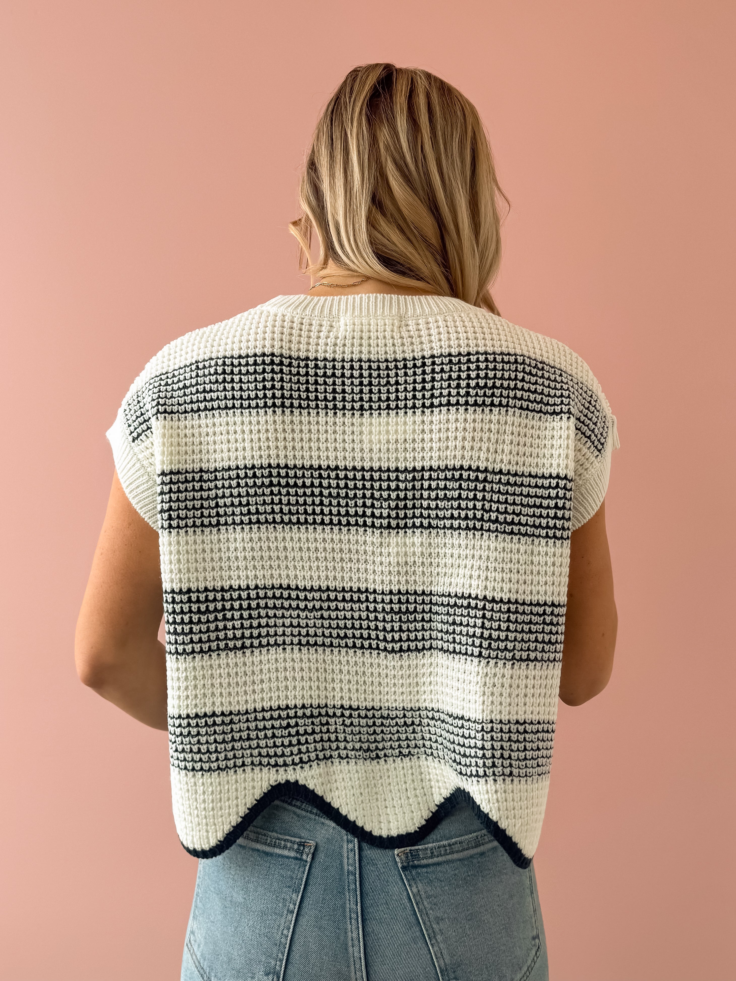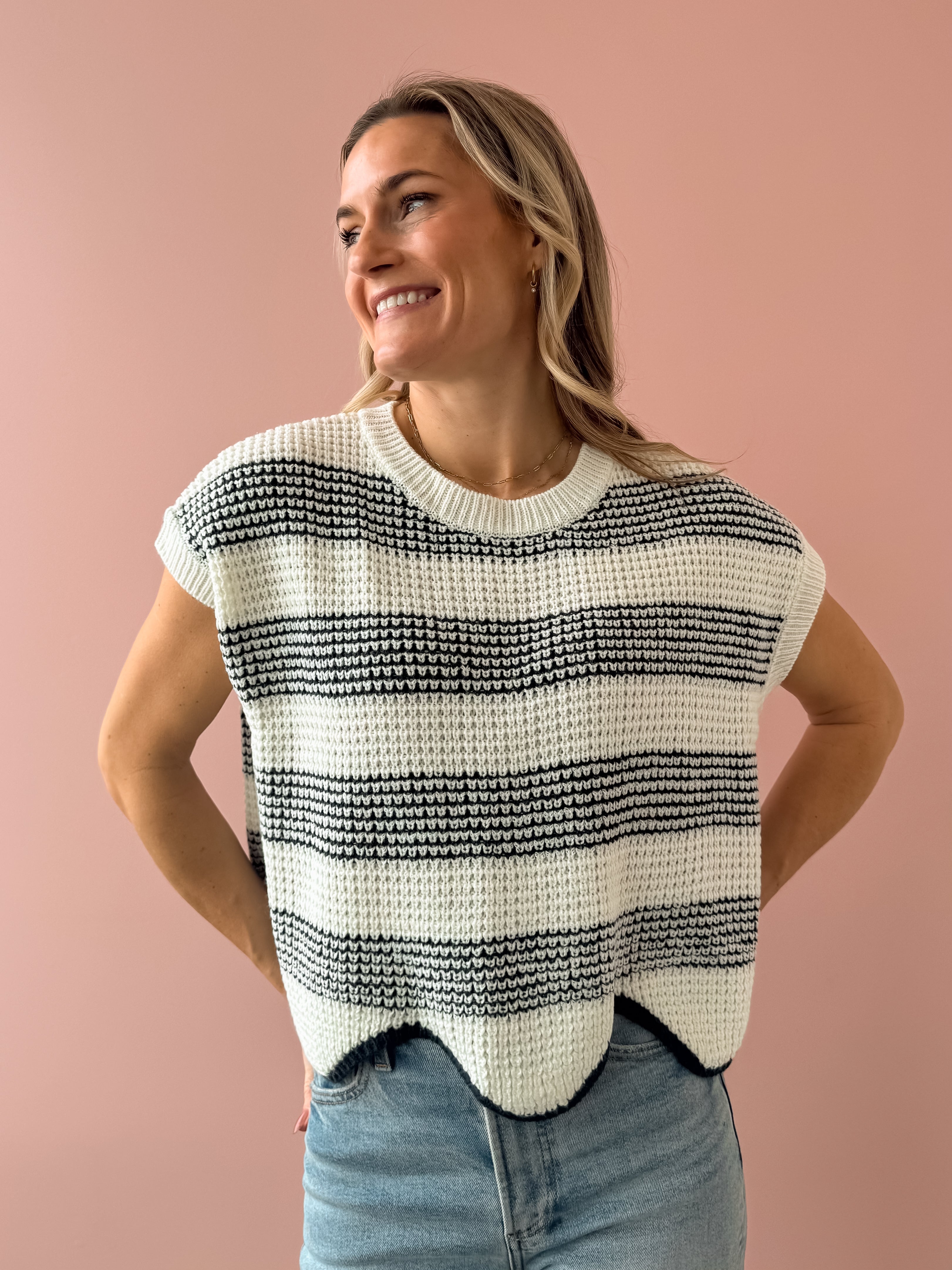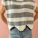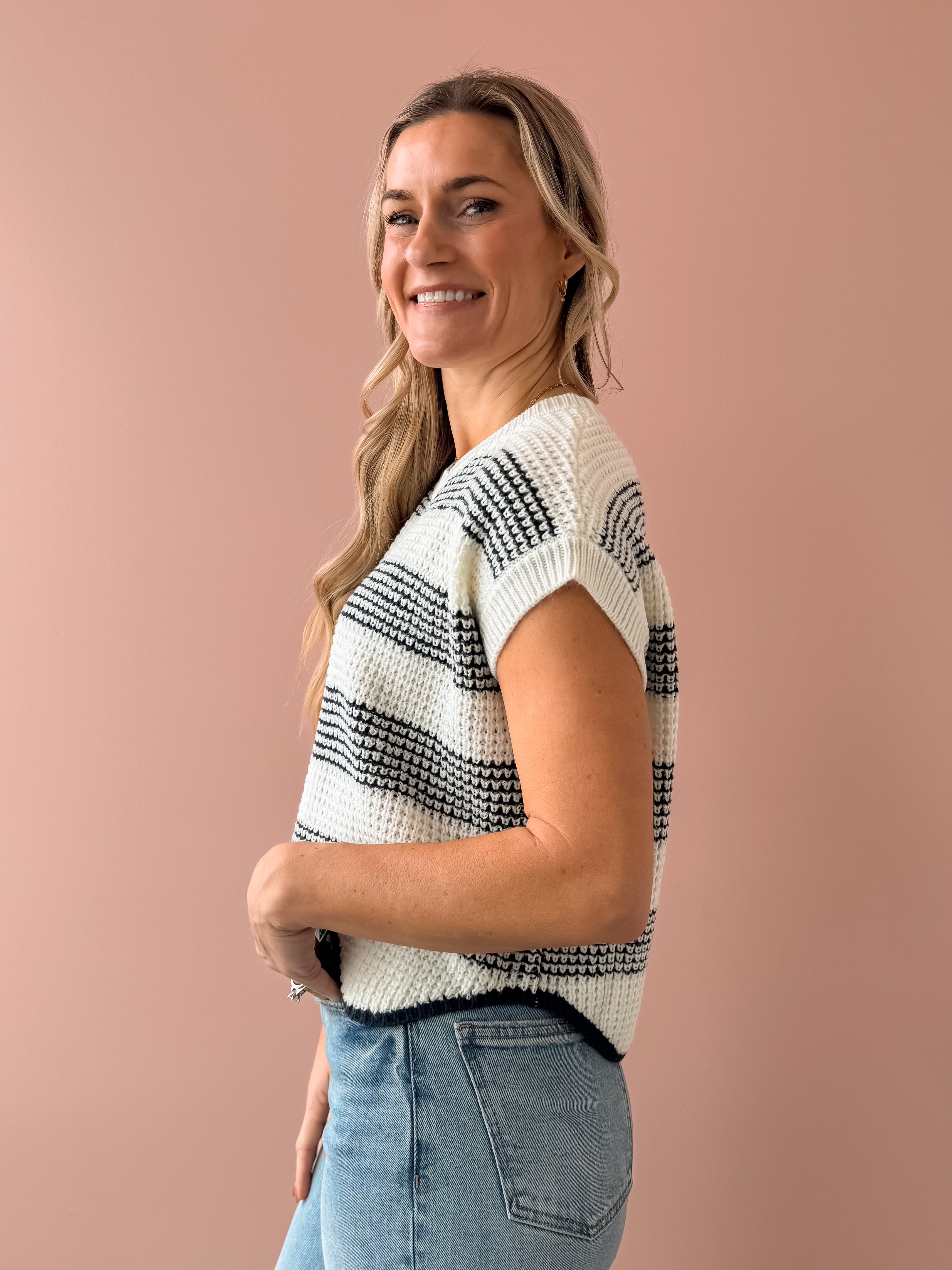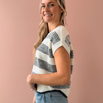 Discover timeless style with the Missed Connections Sweater, where classic striping meets contemporary design. This navy and ivory piece features a short-sleeve cut with a generous, boxy silhouette that feels effortlessly chic. The delicate scalloped hem adds an unexpected feminine touch that sets it apart. Pair it with denim, tailored shorts, or relaxed trousers to create polished, versatile looks that work for any occasion.