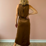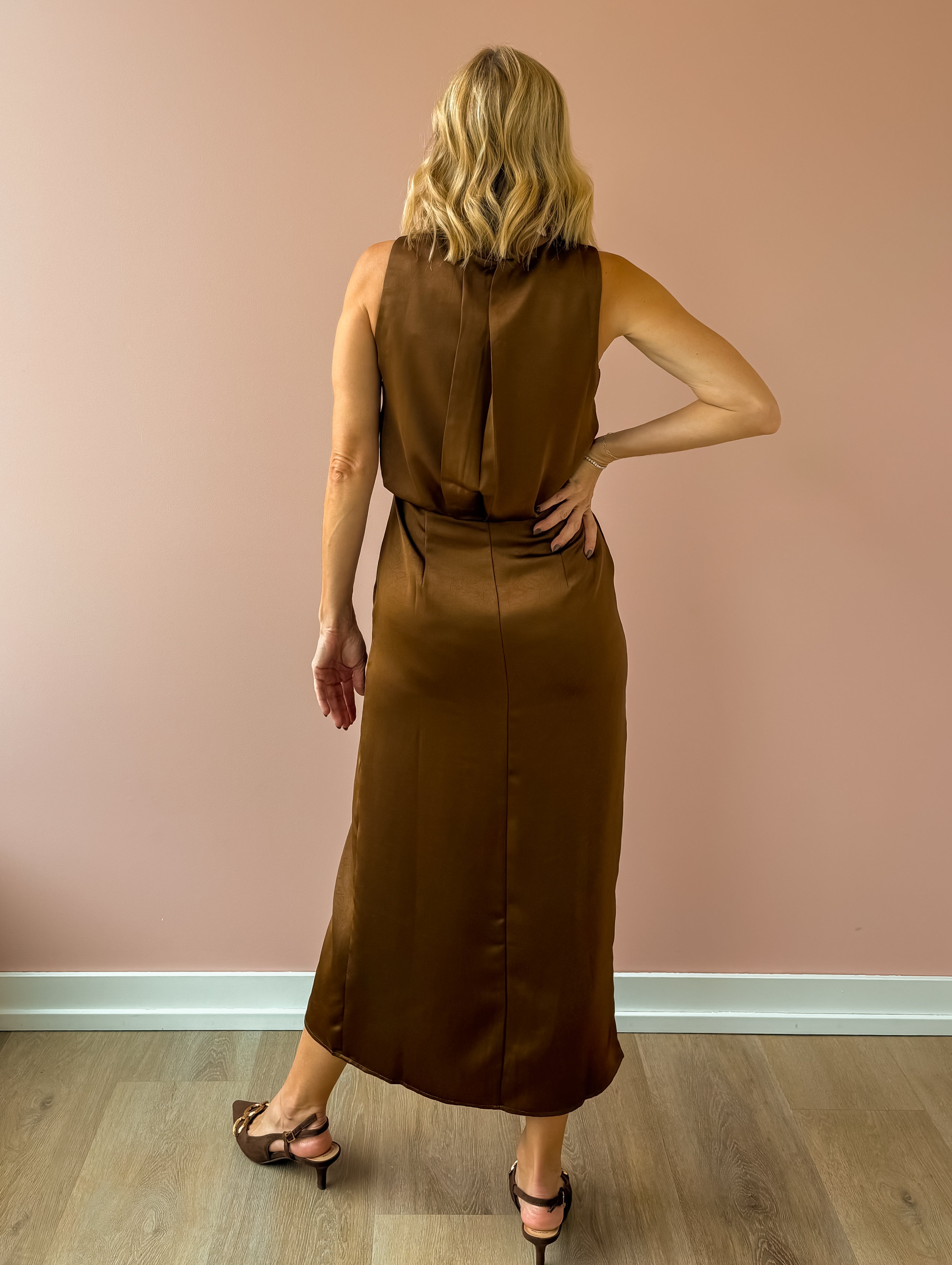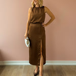 Introducing the Monica Midi Dress—a sleek, minimalist silhouette designed to make a subtle statement. Crafted in a silky light brown fabric, it drapes beautifully with a soft sheen and features a refined high neckline, flattering midi length, and side slit. Effortlessly versatile, it pairs perfectly with strappy heels for a dressy look or ankle boots for an elevated everyday vibe.
