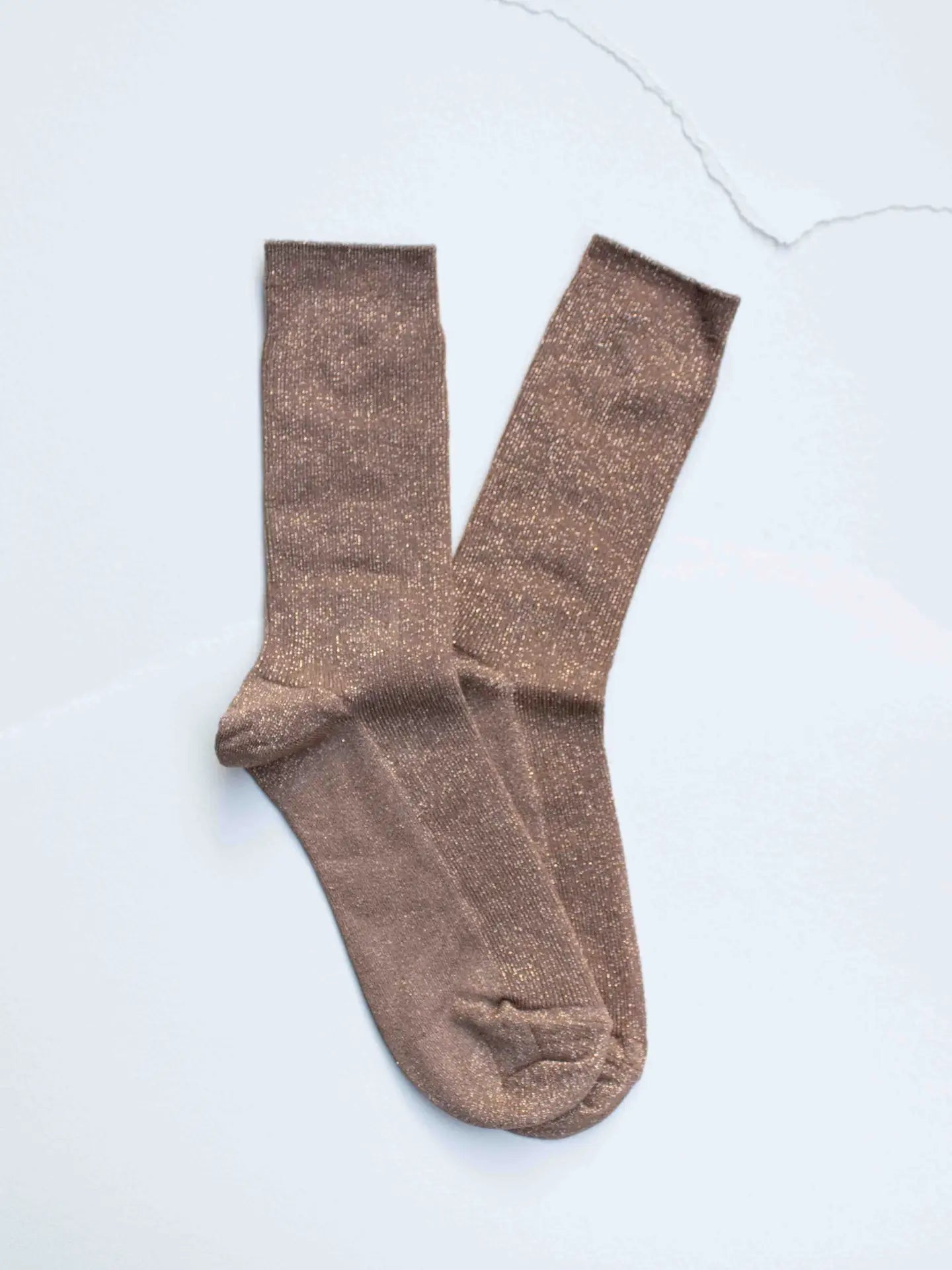 Step up your sock game with these Modal Glitter Socks in a mocha brown. Crafted from a luxurious modal blend infused with subtle metallic shimmer, they deliver the perfect fusion of comfort and glamour. The soft, breathable fabric stretches to fit your foot perfectly, while the lightweight construction keeps them feeling barely-there throughout your day.