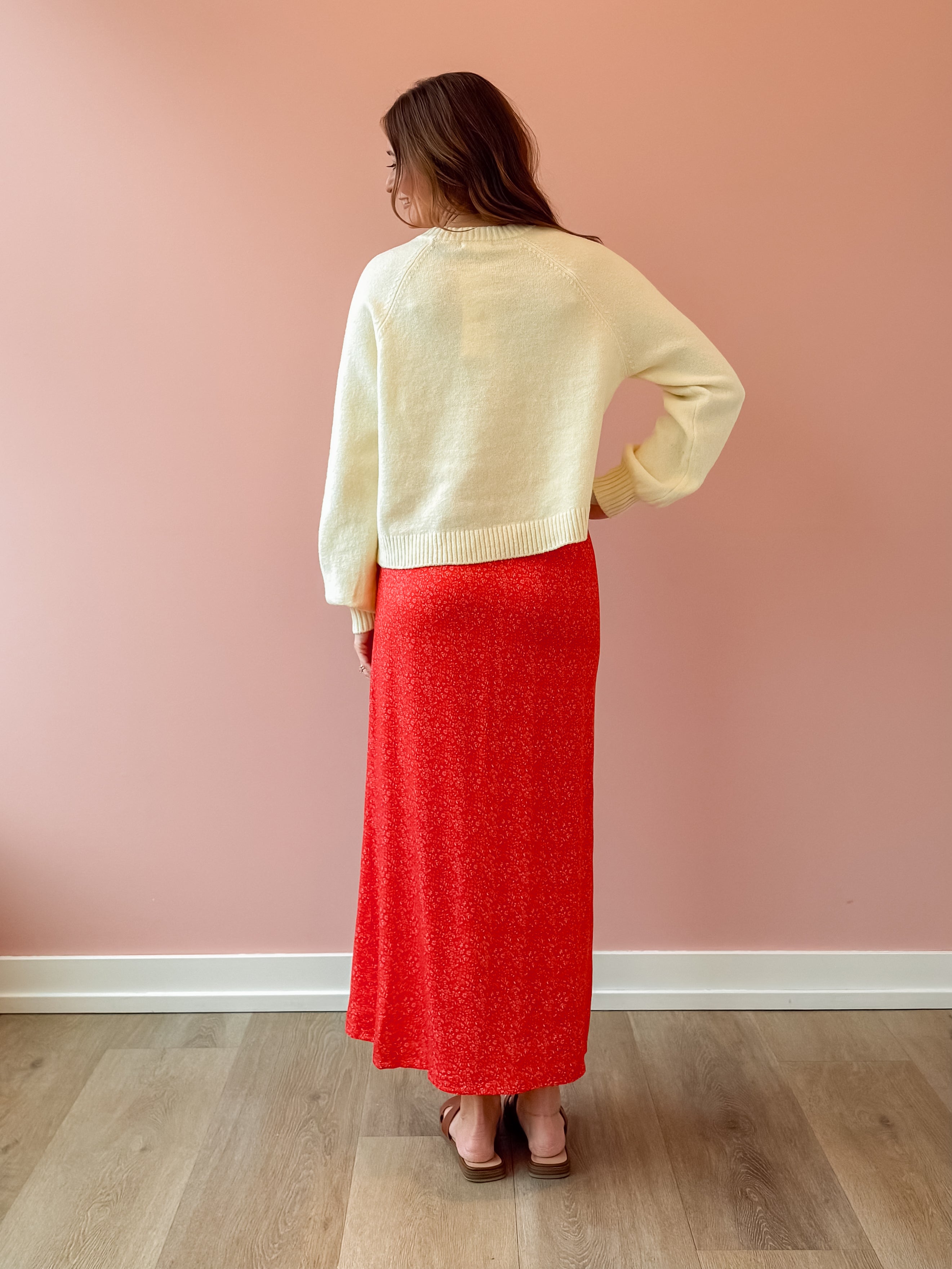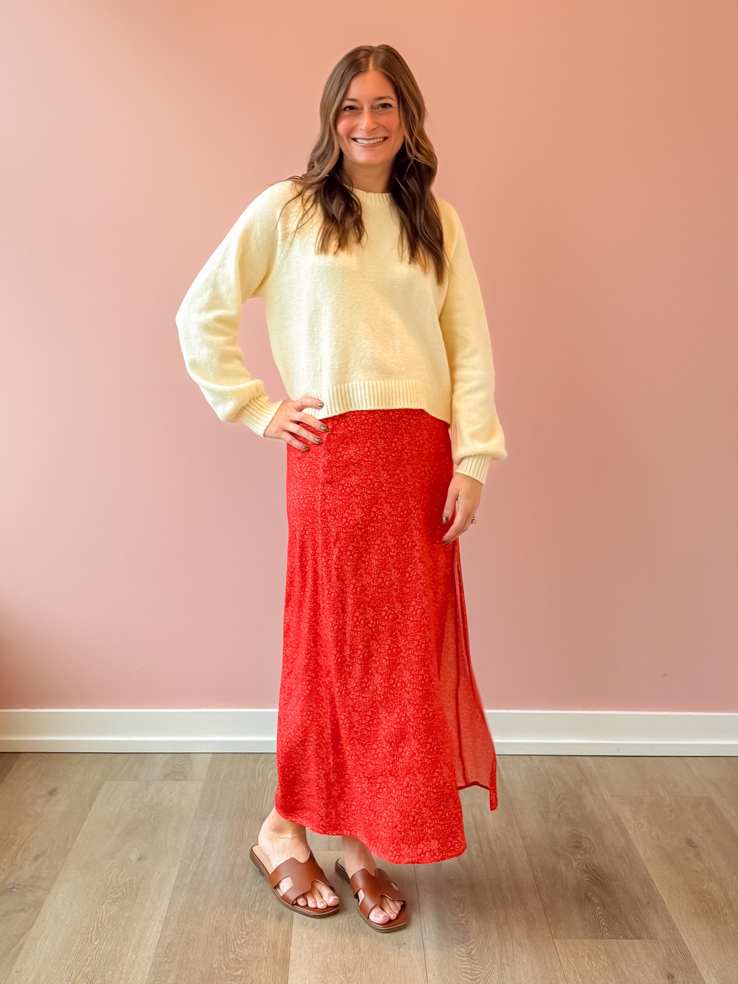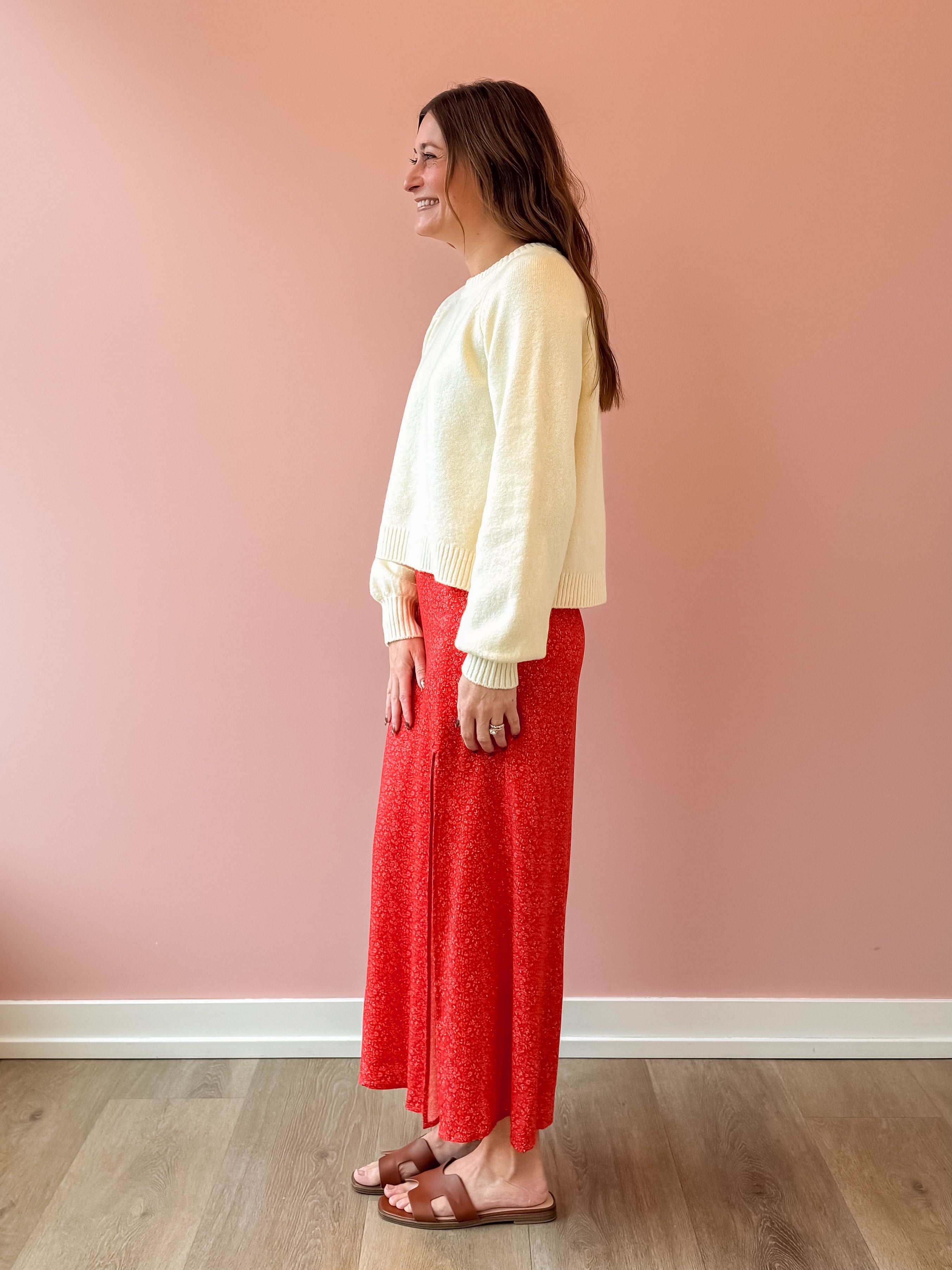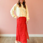 Step into timeless elegance with the Narissa Vintage Red Midi Skirt, where classic sophistication meets modern flair. The high-waisted silhouette and refined panel construction create a flattering, streamlined look, while a side high slit keeps things fun and flirty. Perfect for elevating your vacation wardrobe—pair it with a cozy sweater and strappy sandals for effortless style that turns heads.