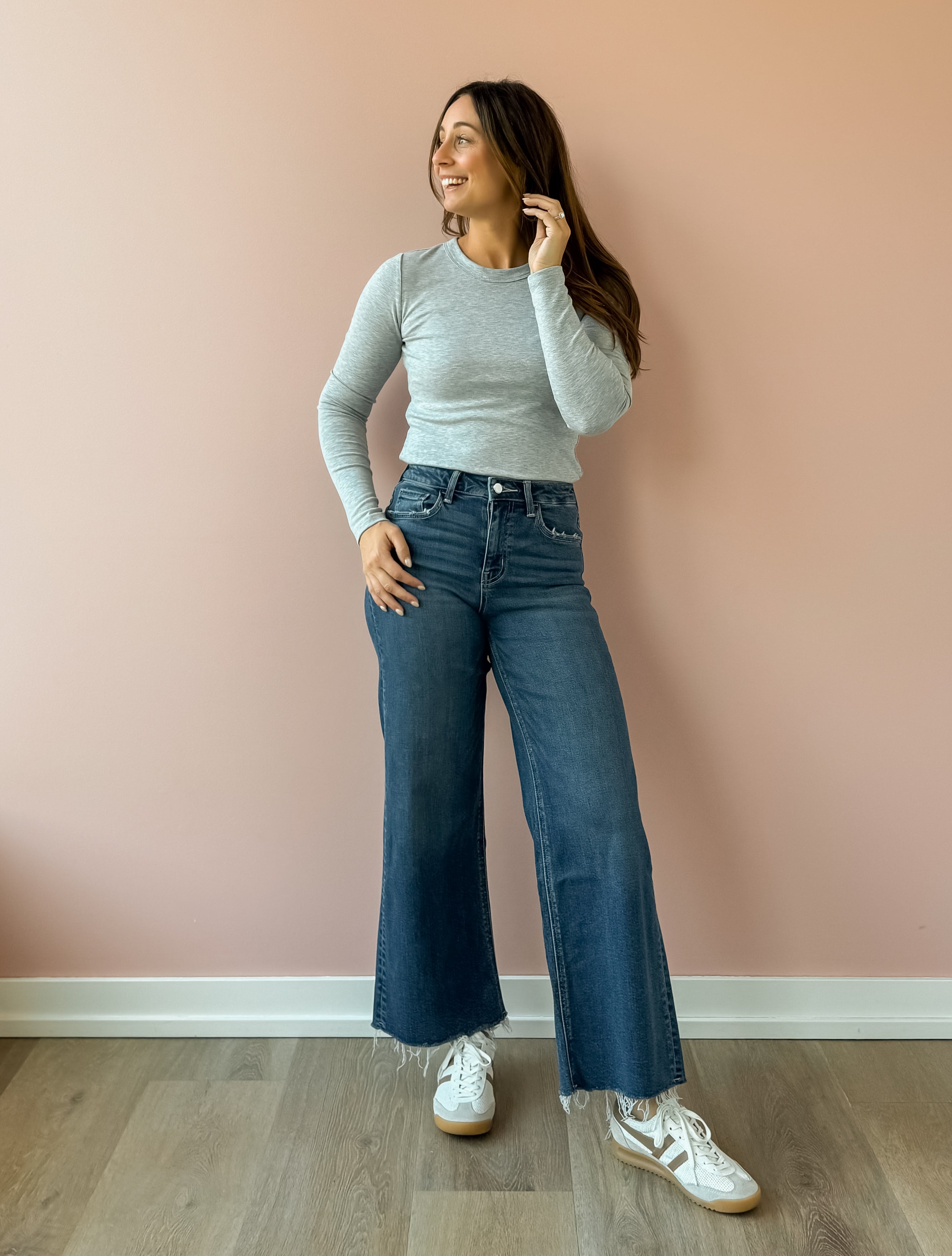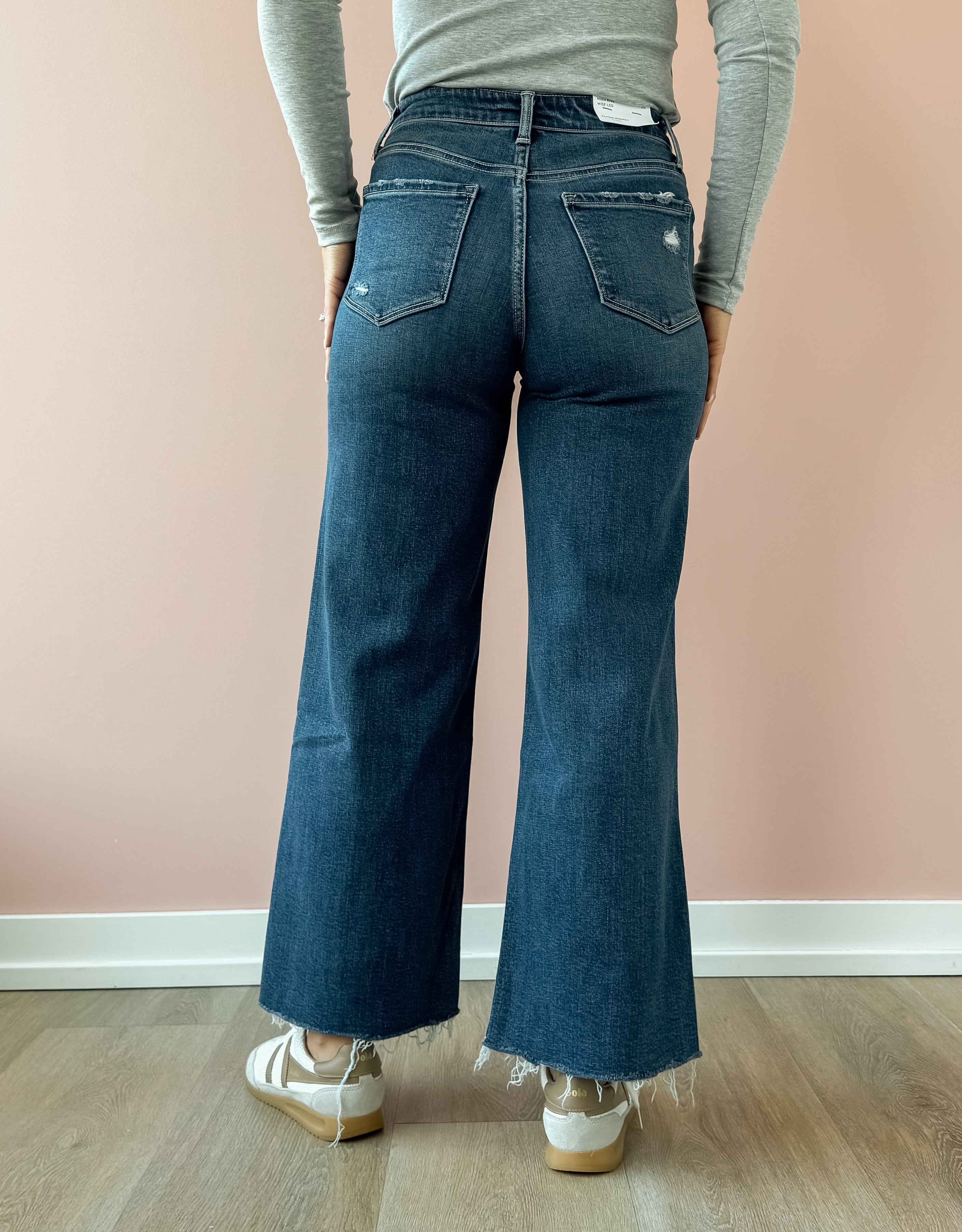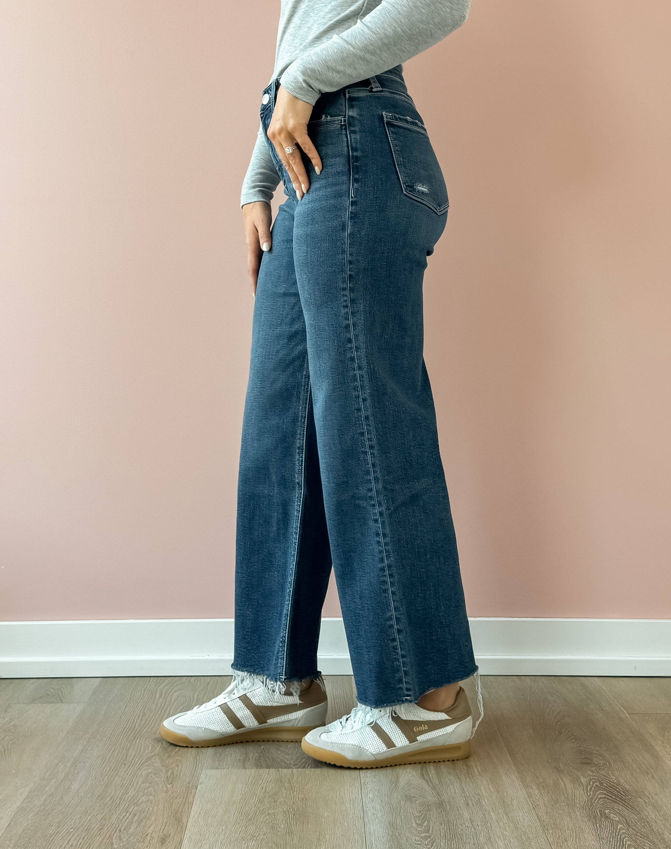 The Nicole High Rise Raw Hem Wide Leg Jean is a fresh take on everyday denim, designed to hit right at the ankle for a clean, modern look. Made from soft comfort-stretch denim, it features a flattering high-rise waist, relaxed wide leg, and raw hem detailing that adds a laid-back edge. The ankle-length cut makes it perfect for showing off your favorite shoes, from sneakers to ankle boots. Style it with a sweater and boots!