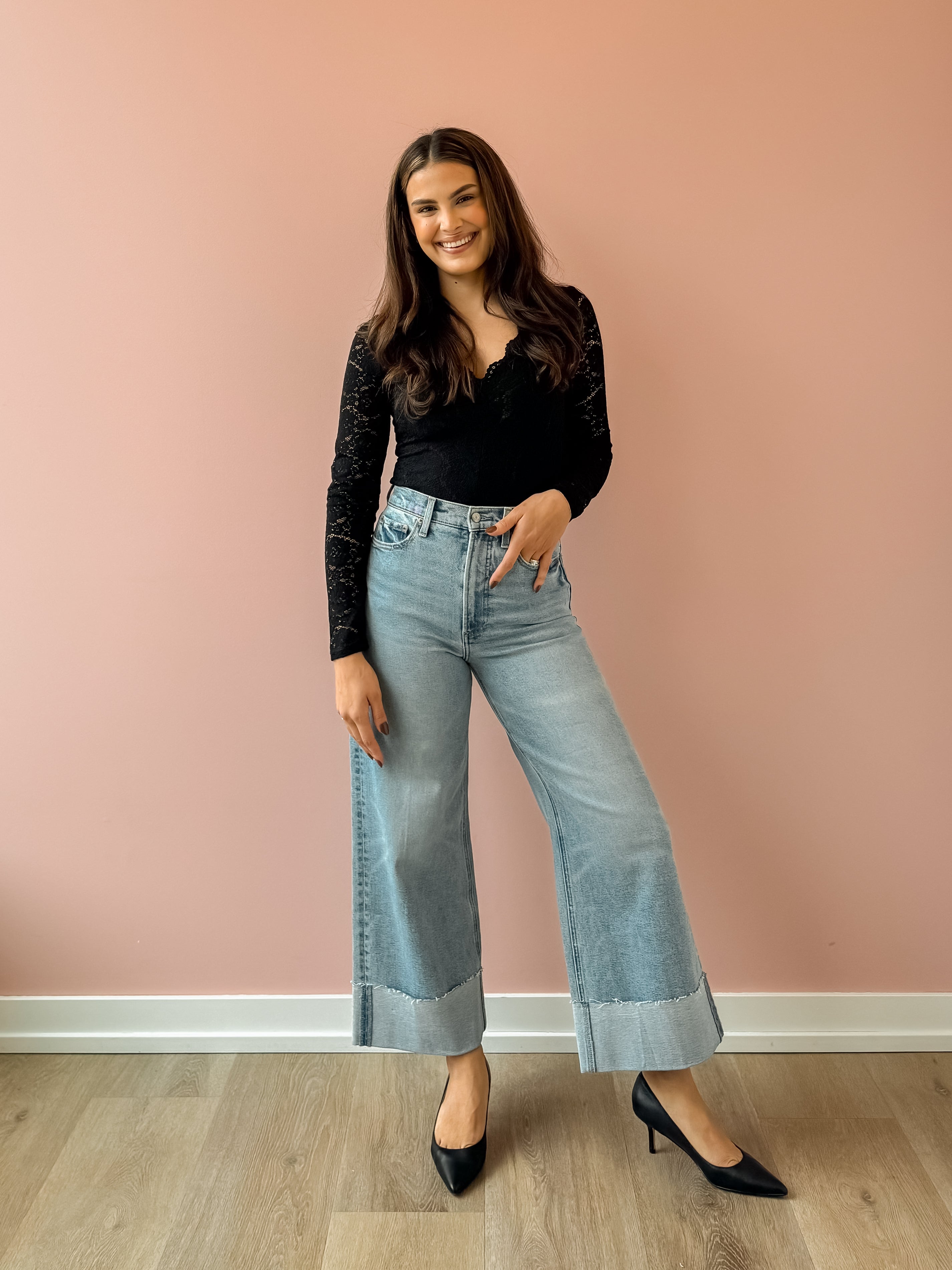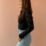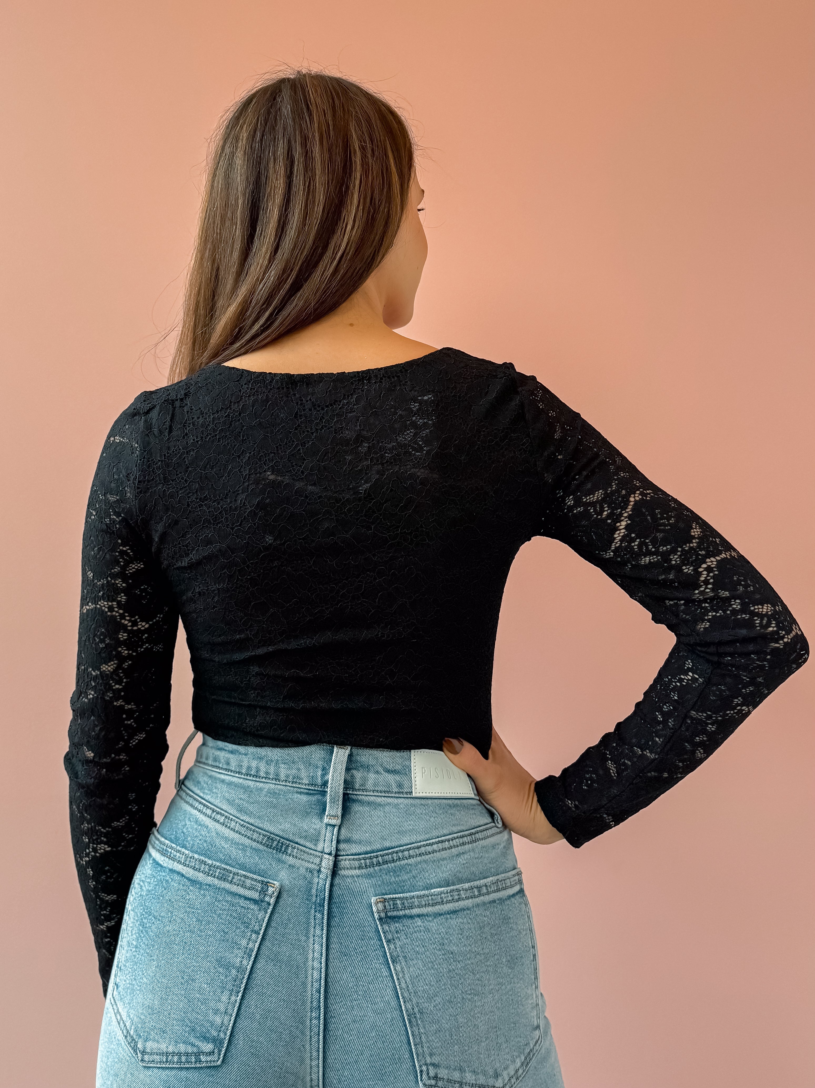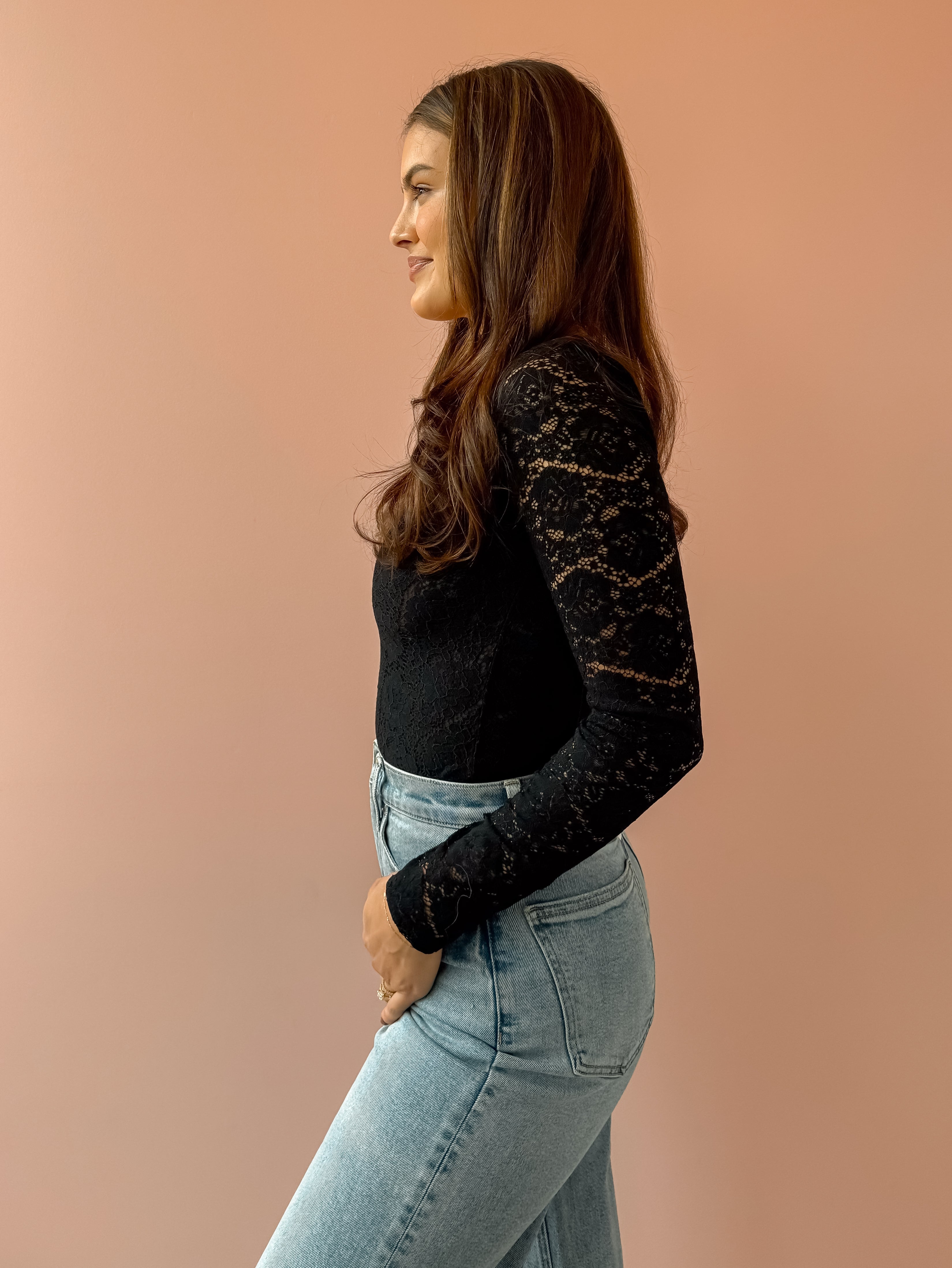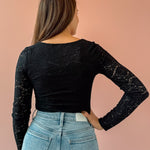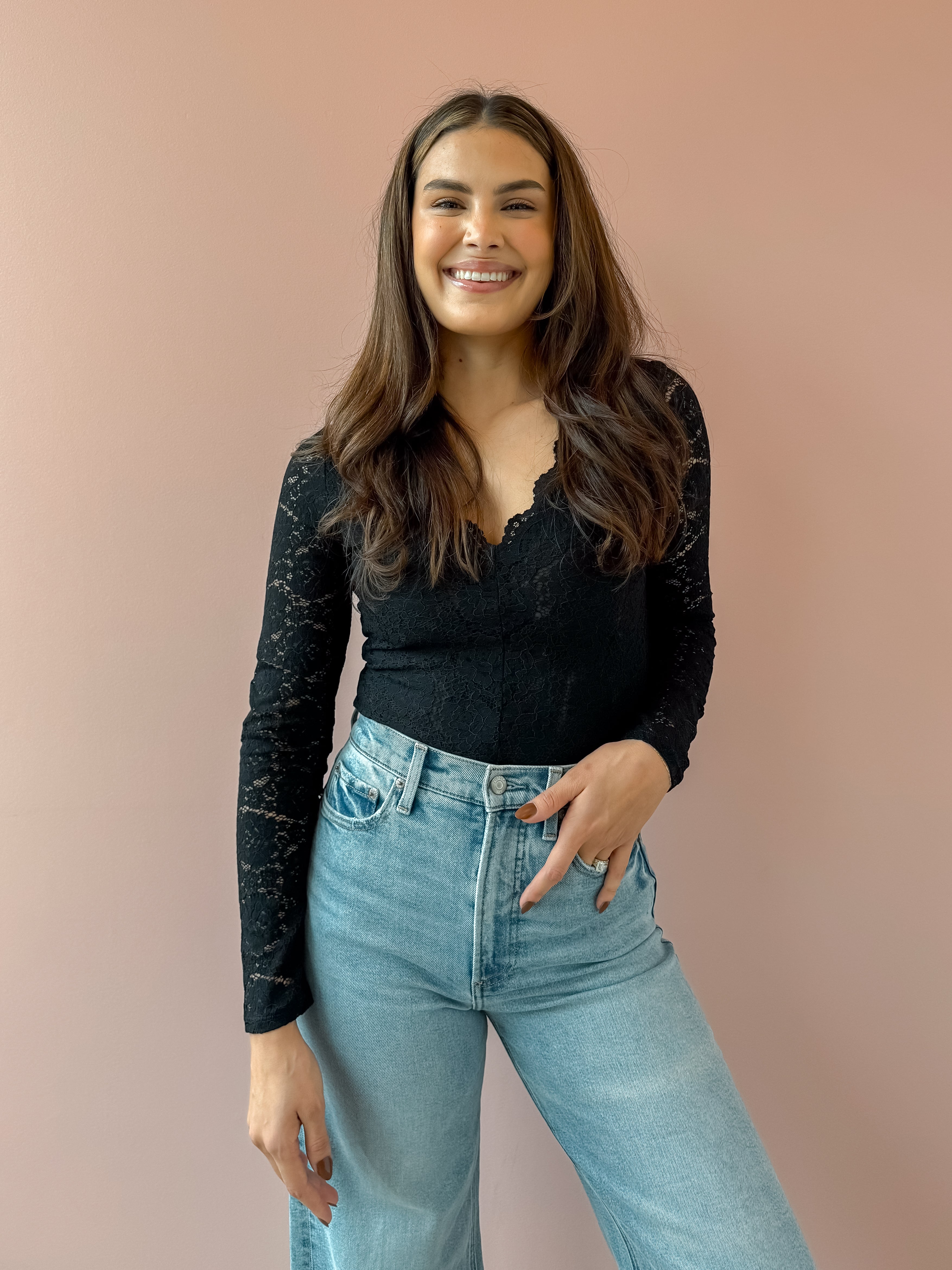 The Nightfall Lace Bodysuit is effortlessly chic and endlessly versatile. Featuring a flattering V-neckline and long sleeves, it hugs your silhouette in all the right ways. In timeless black with a sheer finish, it’s made to make a statement. Elegant with a touch of edge, it’s the perfect piece to elevate any outfit—style it with denim and heels for a night out!
