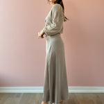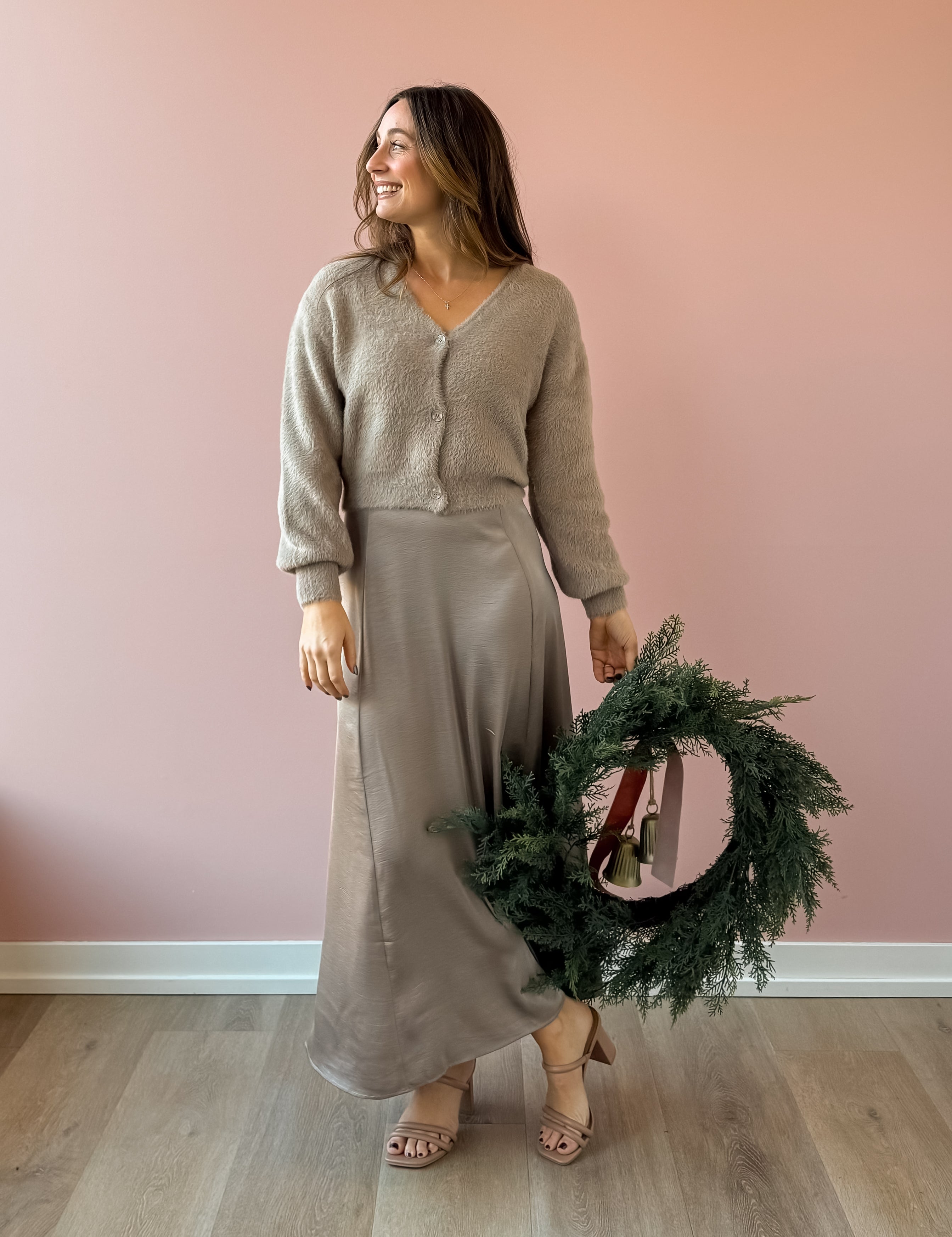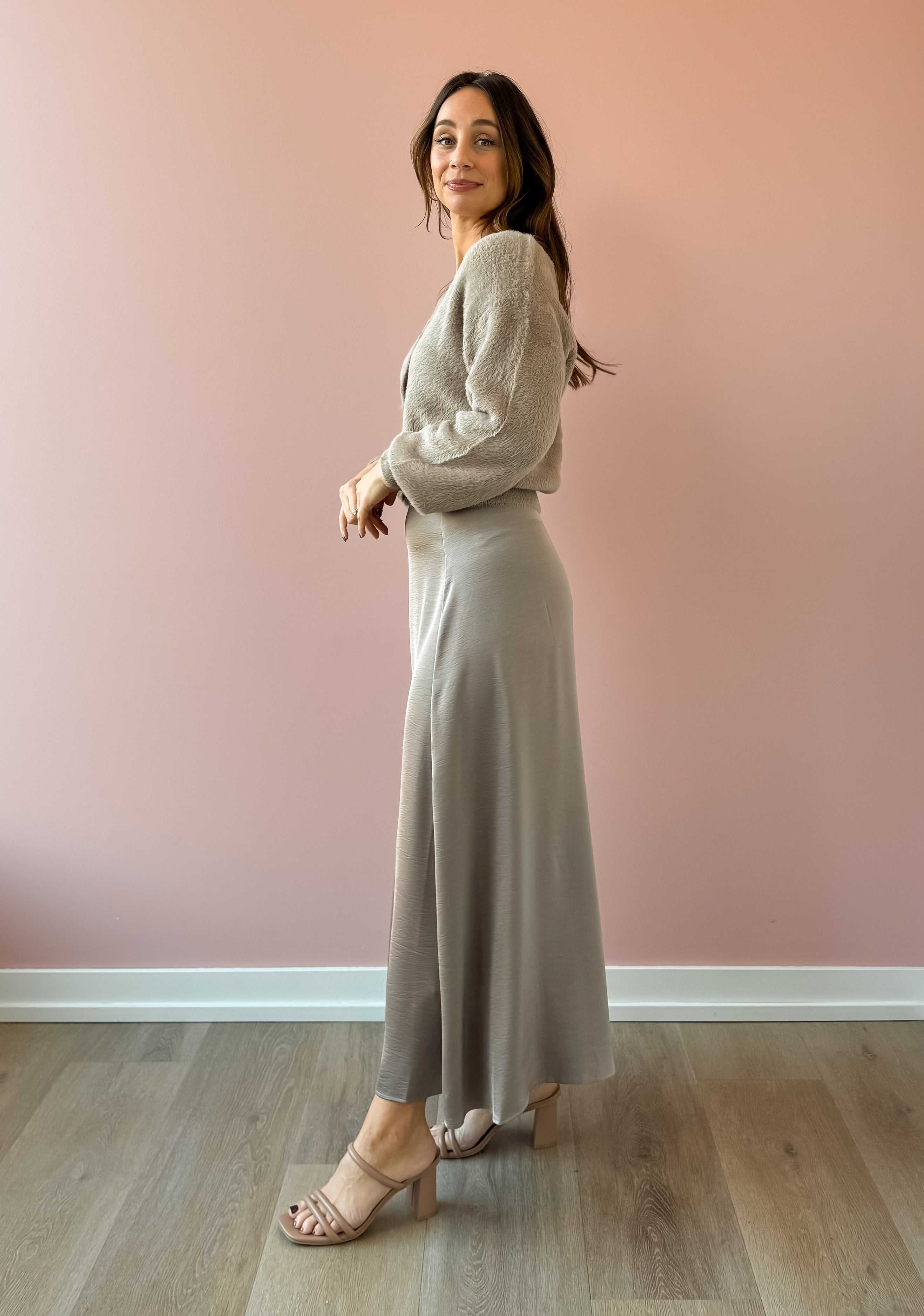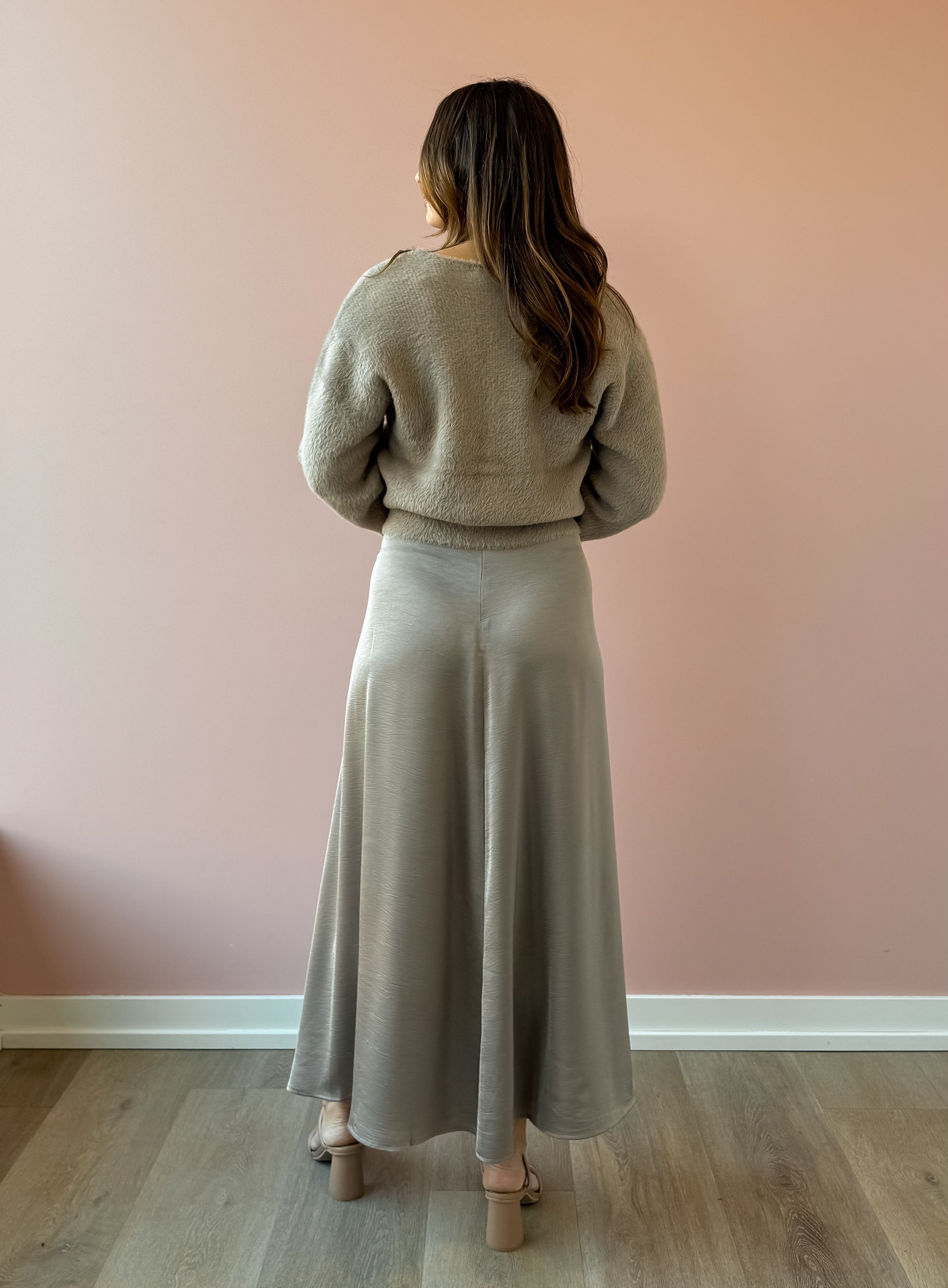 The Northpointe Midi Skirt features a classic moonlit shade that pairs beautifully with any outfit. Its high-rise silhouette and hidden zipper create a sleek, streamlined look, perfect for effortless styling. This versatile piece transitions seamlessly from day to night—ideal with a cardigan and heels for a polished work ensemble. Crafted from luxe satin with a regular fit, it offers comfort and elegance at midi length.