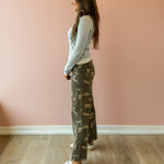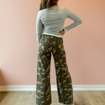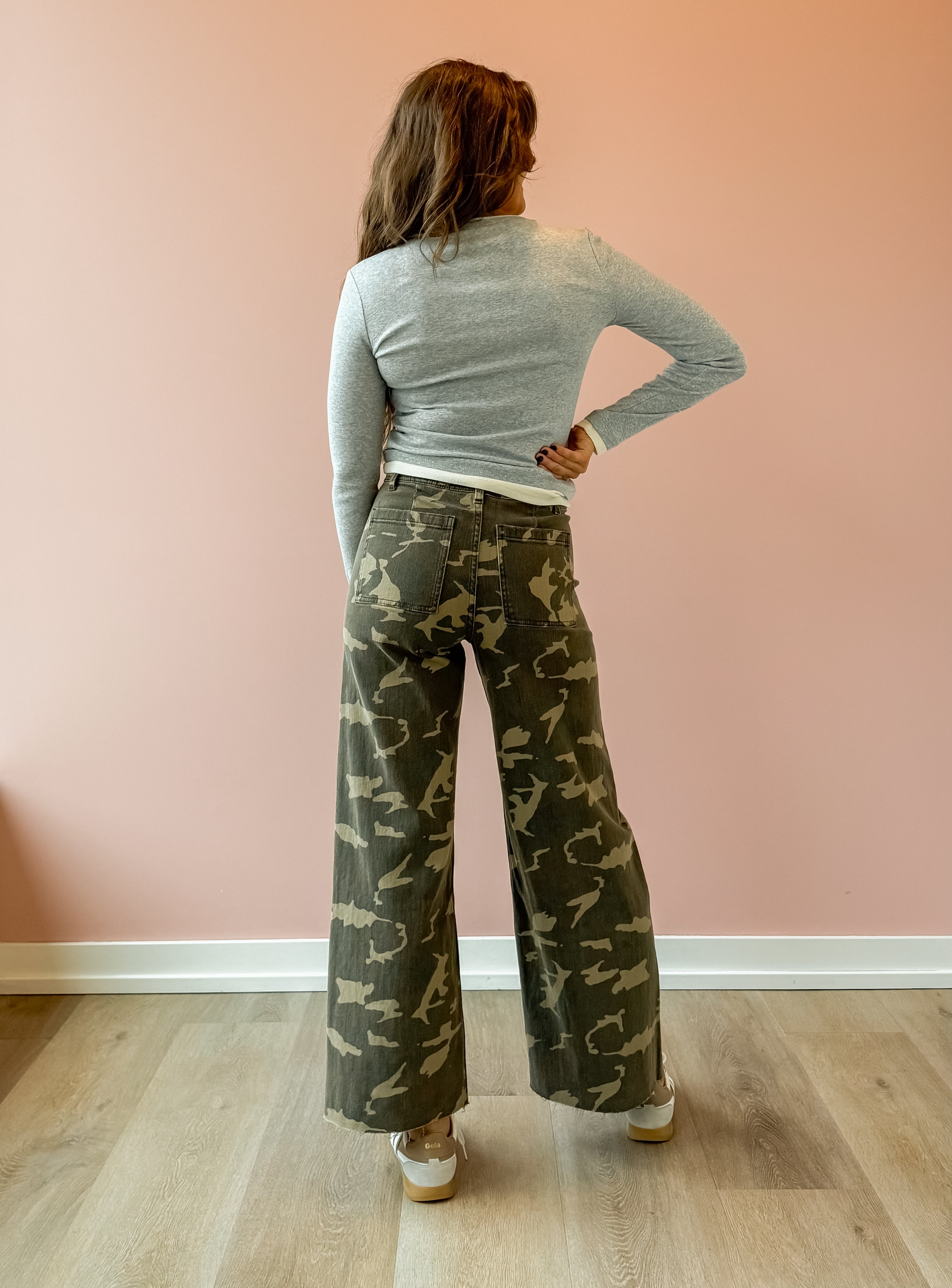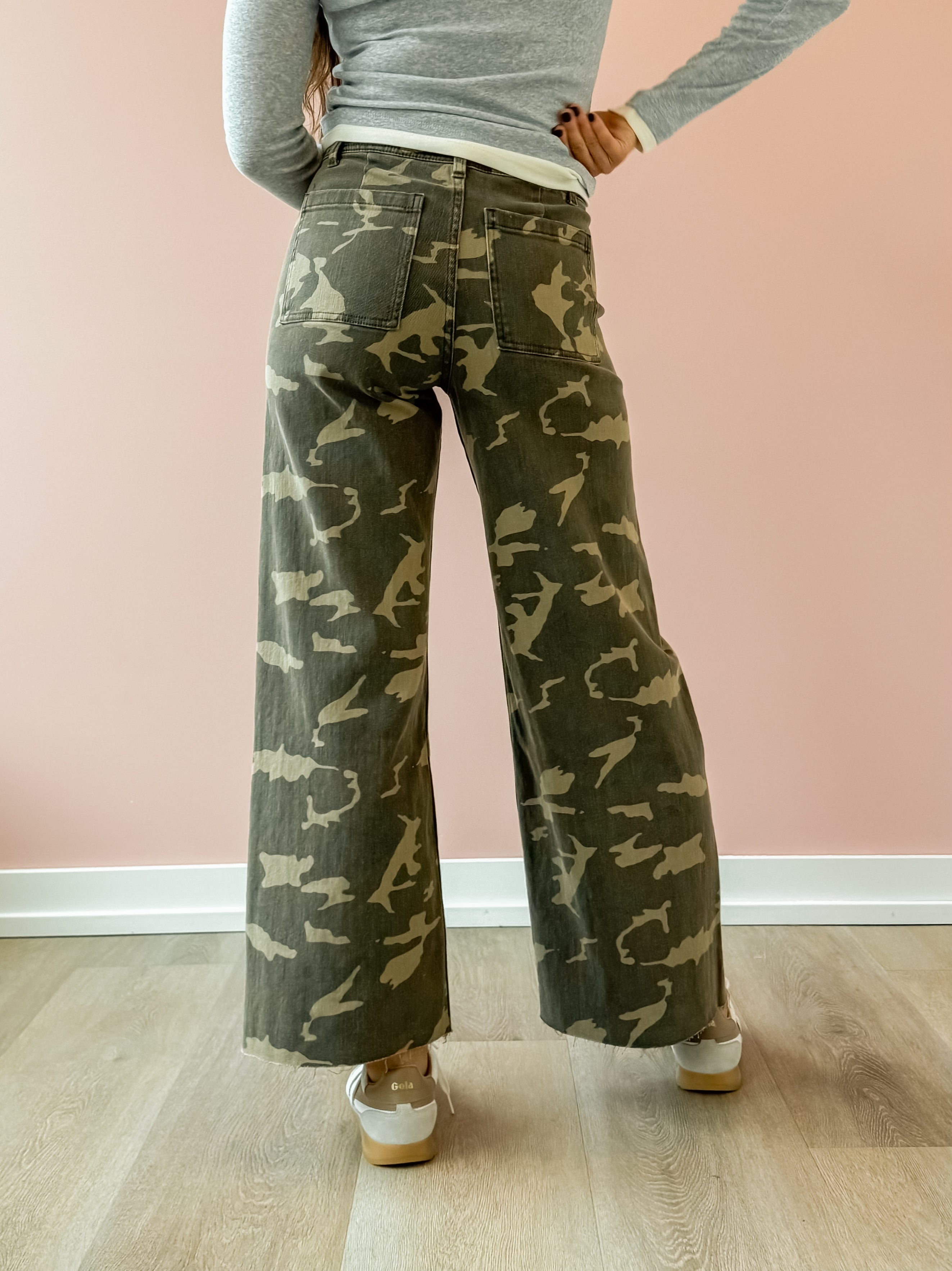 Meet The Off-Duty Pant — effortlessly cool with a feminine edge. Featuring a high-rise waist and wide-leg silhouette, these camo pants balance comfort and style perfectly. Practical back pockets add just the right amount of utility, while the raw hem keeps the look fresh and modern. Pair them with a tee and sneakers for an easy weekend vibe!
