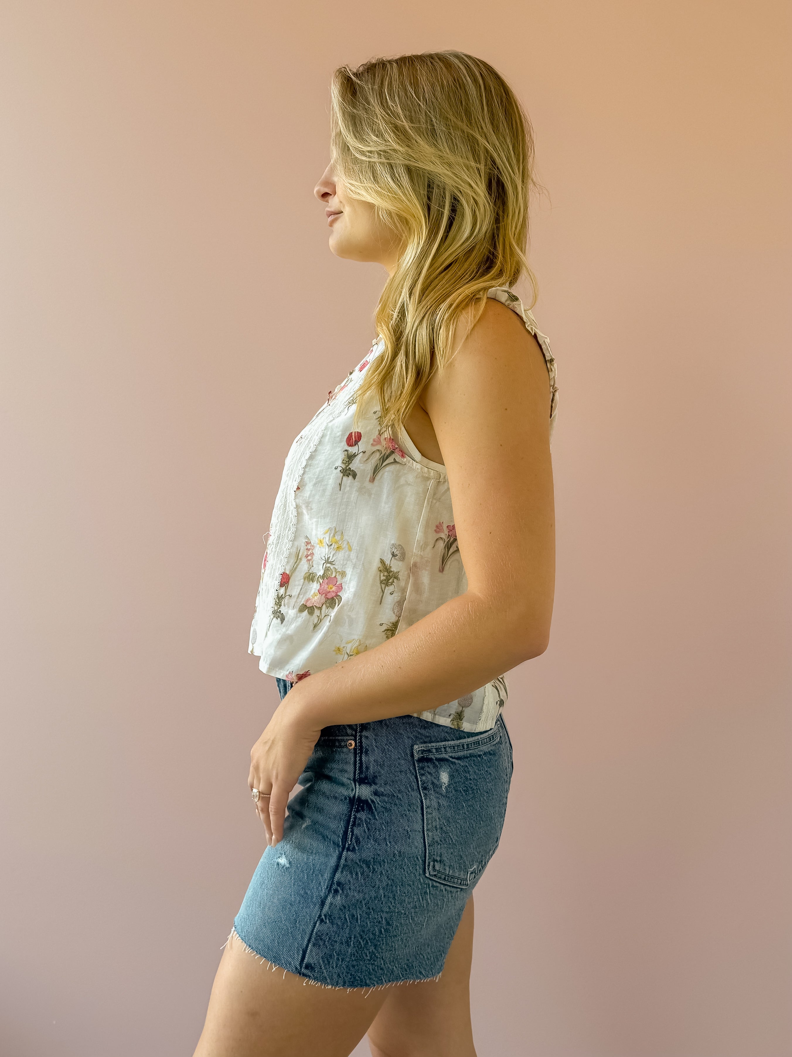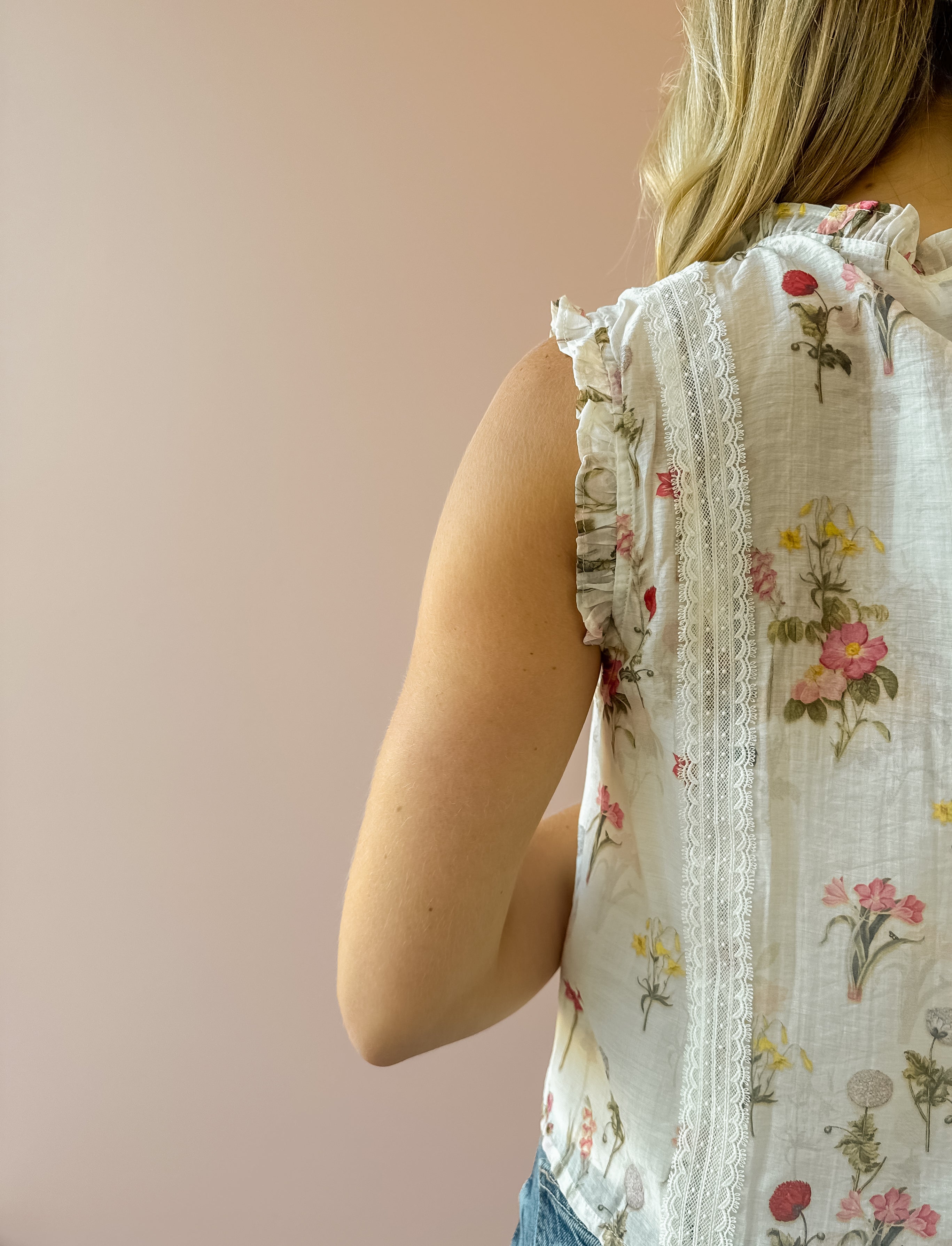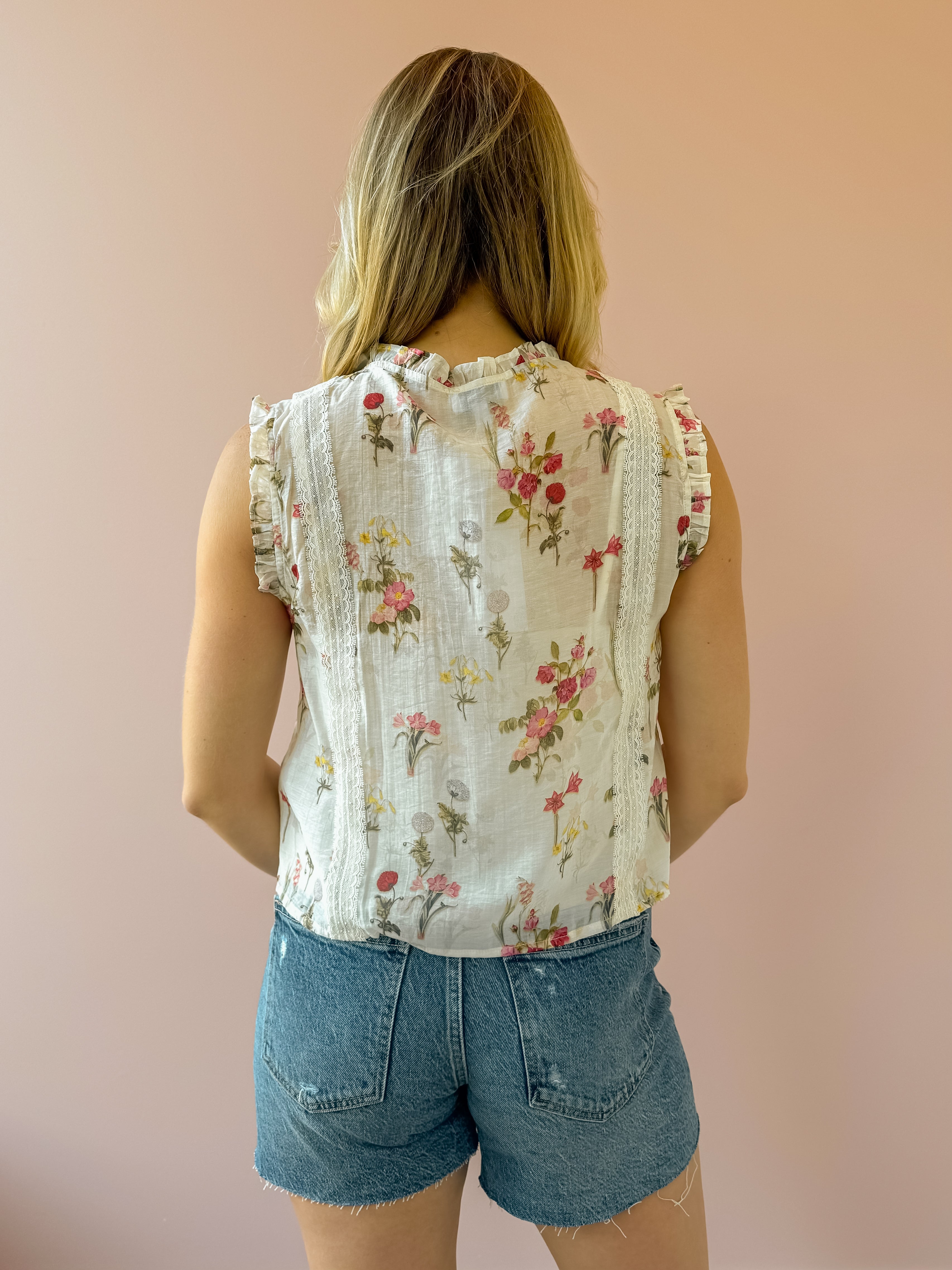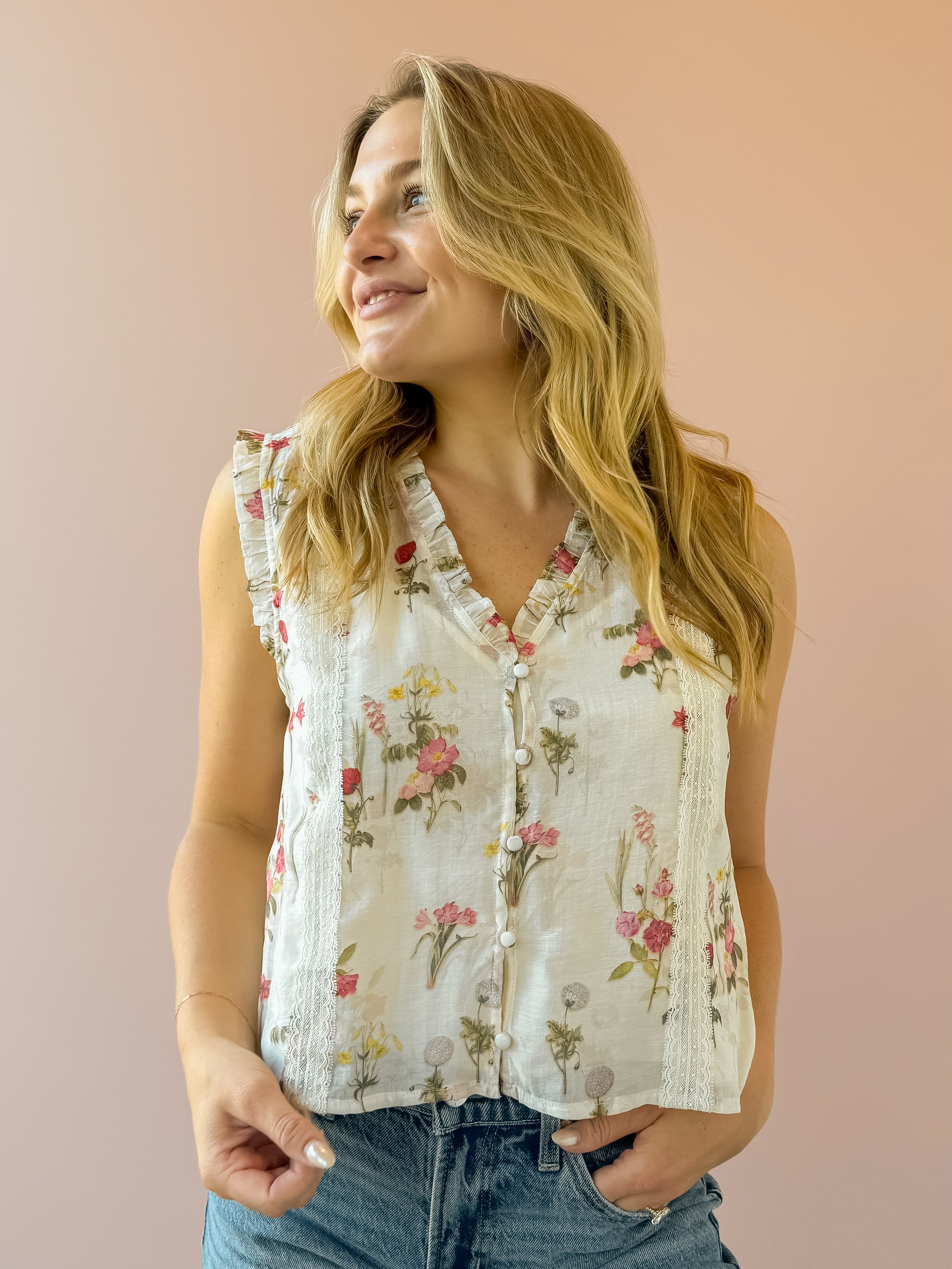The Olina Prairie Top offers a perfect blend of light comfort and feminine elegance. Crafted from ivory fabric adorned with a lively flower garden print, it features delicate button closures along a flattering v-neckline and sleeveless design. Ruffle details add a charming touch, making it an ideal choice for casual brunches paired with denim shorts or polished office looks with tailored trousers. Elevate your wardrobe with this versatile and stylish top that effortlessly transitions from day to night