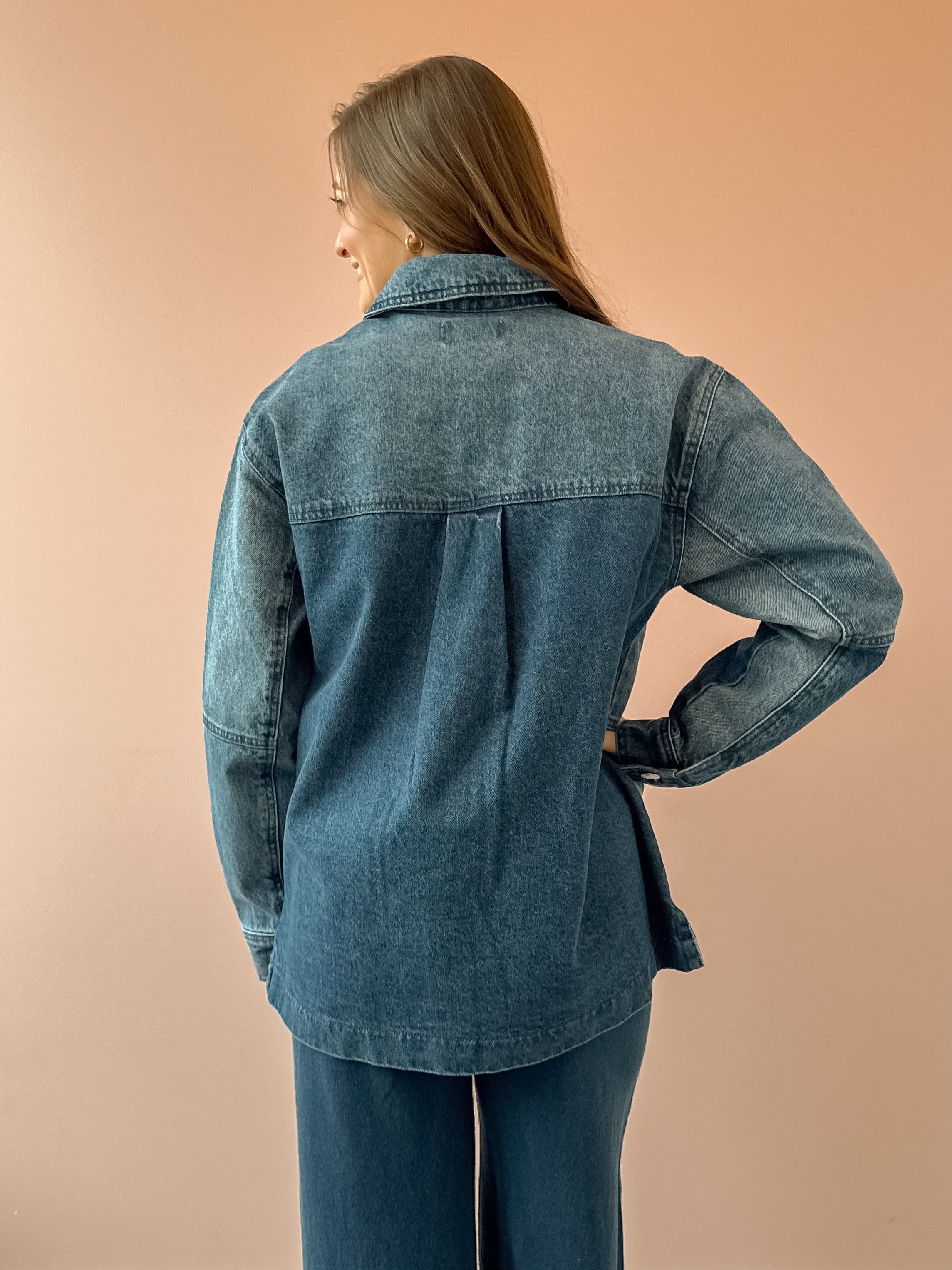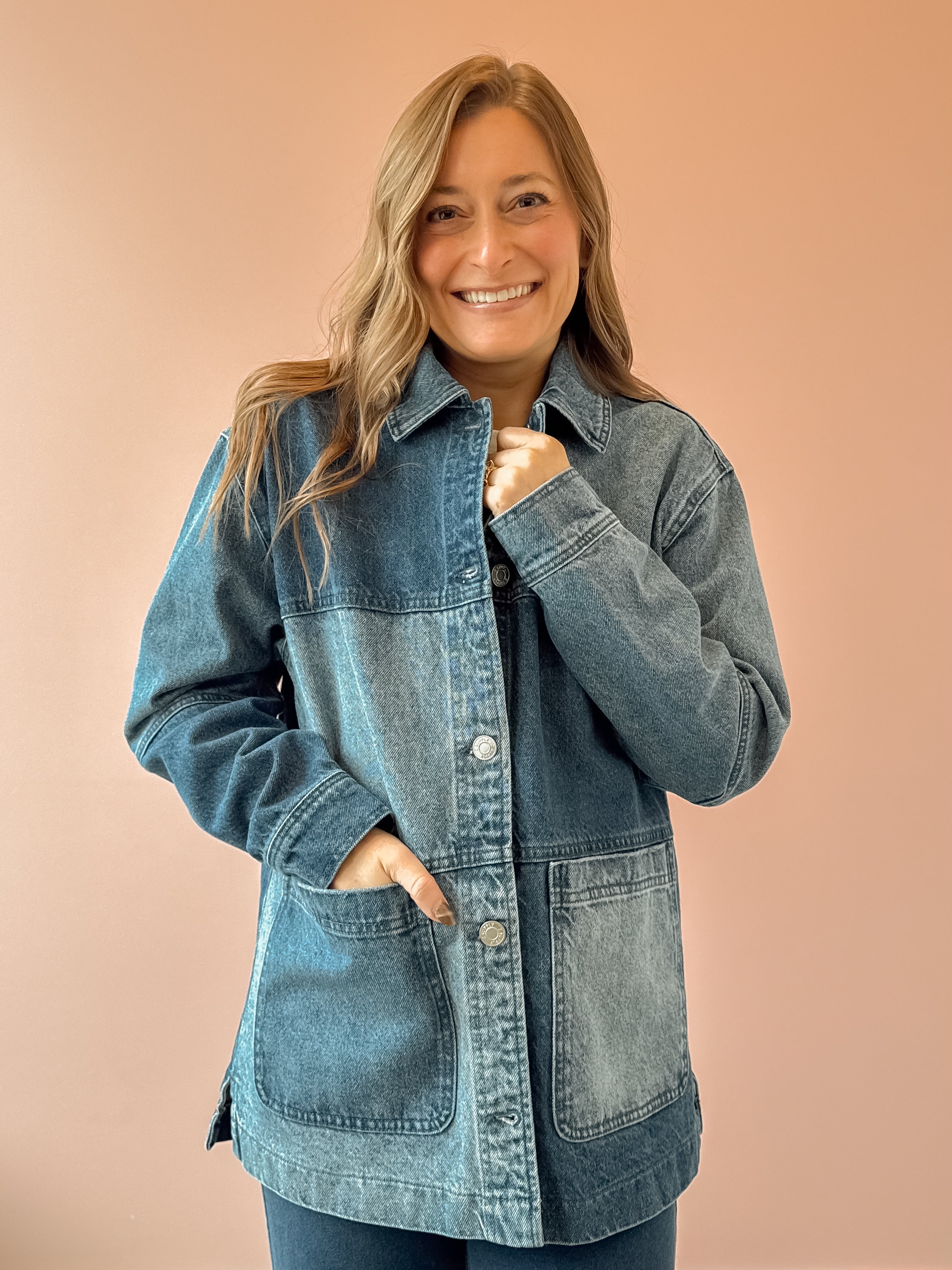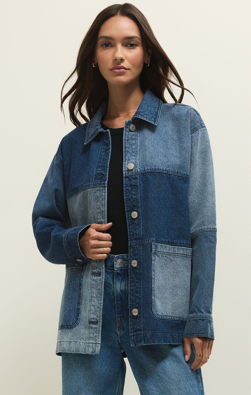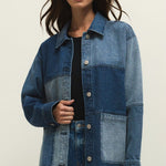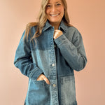 The On The Road Colorblock Jacket in color indigo brings vintage denim energy with a modern, oversized fit. Crafted from rigid 100% cotton denim, the artful mix of washes gives it a perfectly lived-in look that still feels polished and intentional. Designed with a classic collar, button front, and flap pockets, this barn-style jacket is midweight with a heavy soft wash that only gets better over time. Layer it over tees, knits, or dresses for an effortless statement piece you’ll wear season after season.
