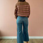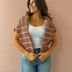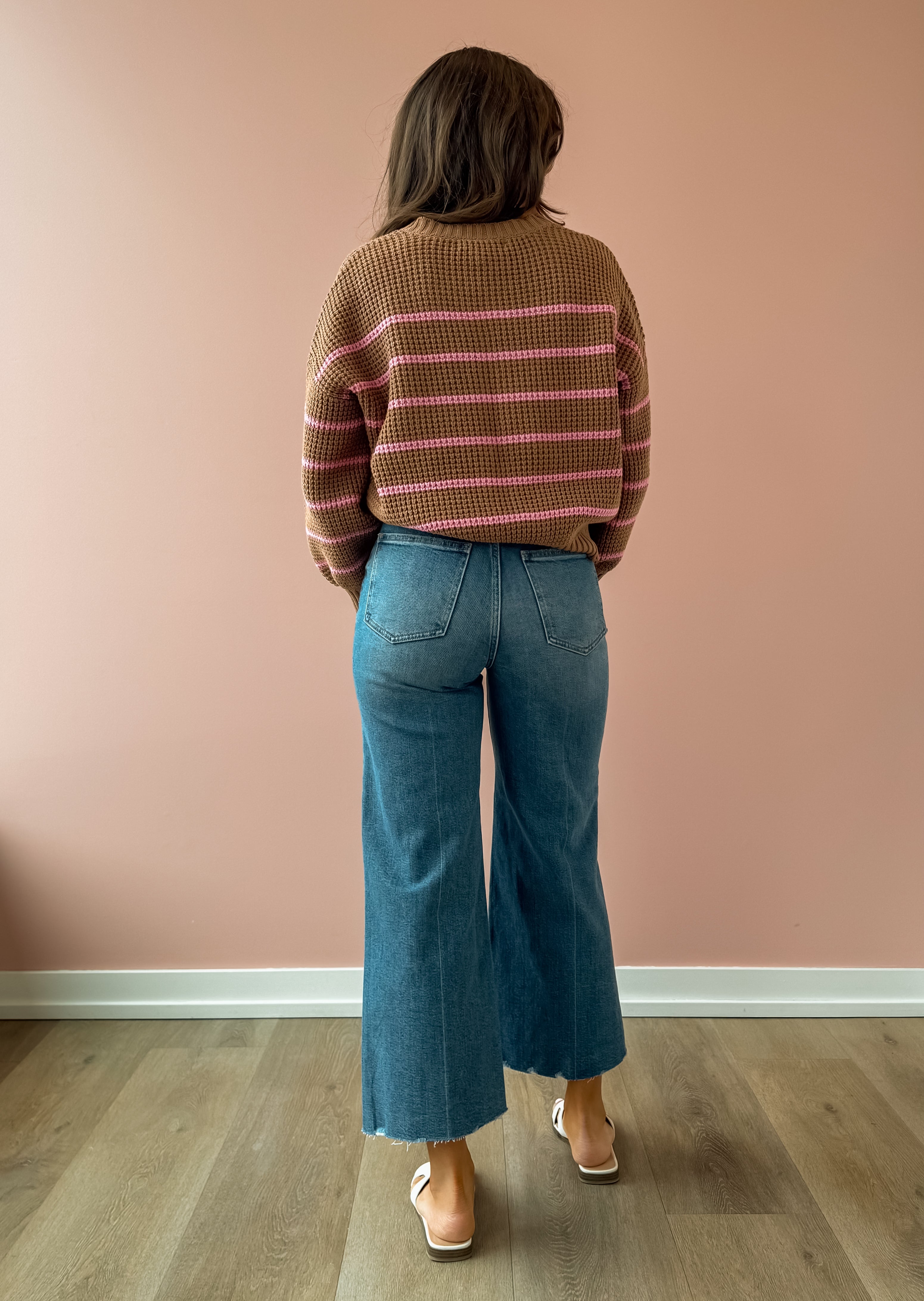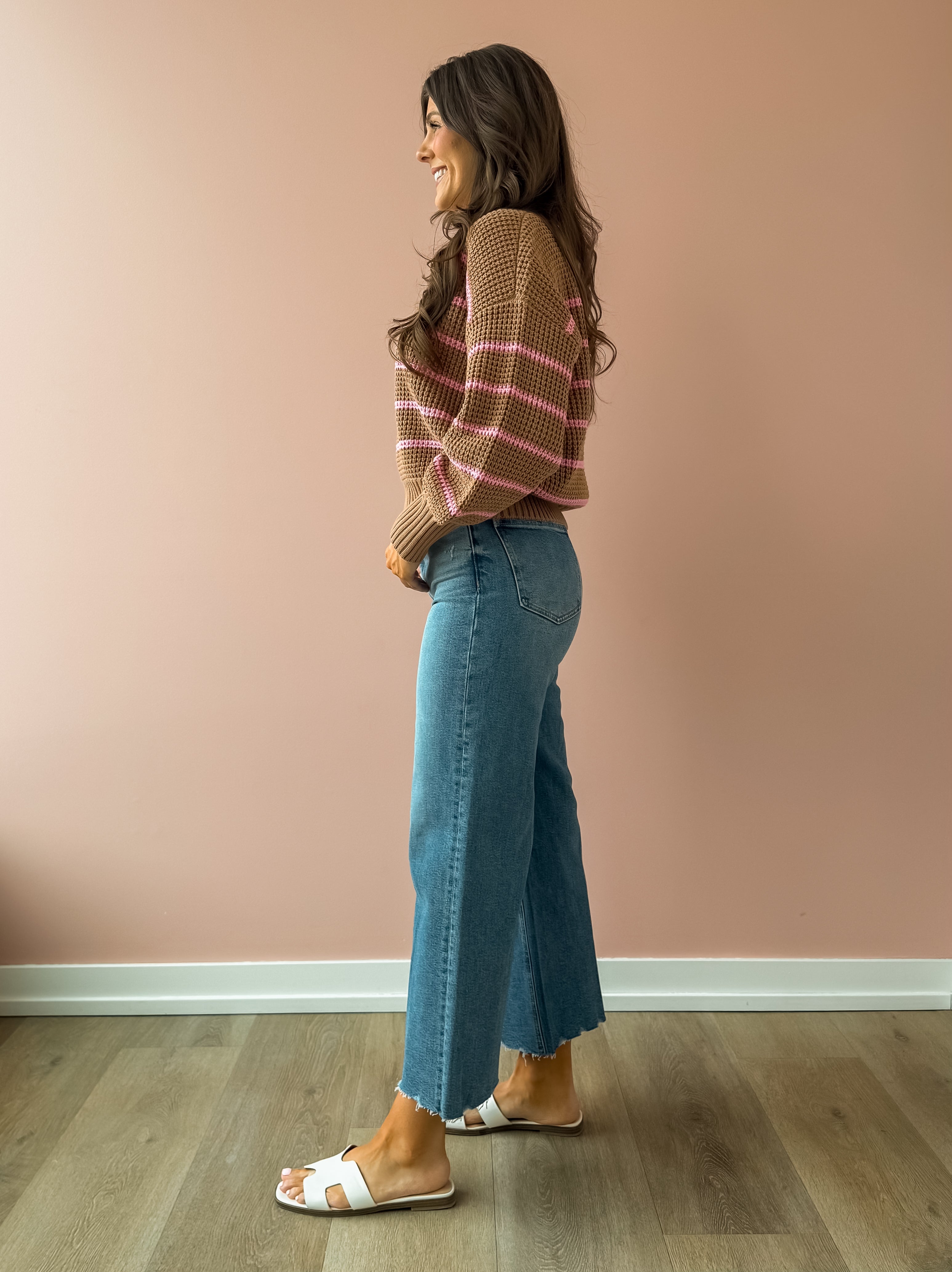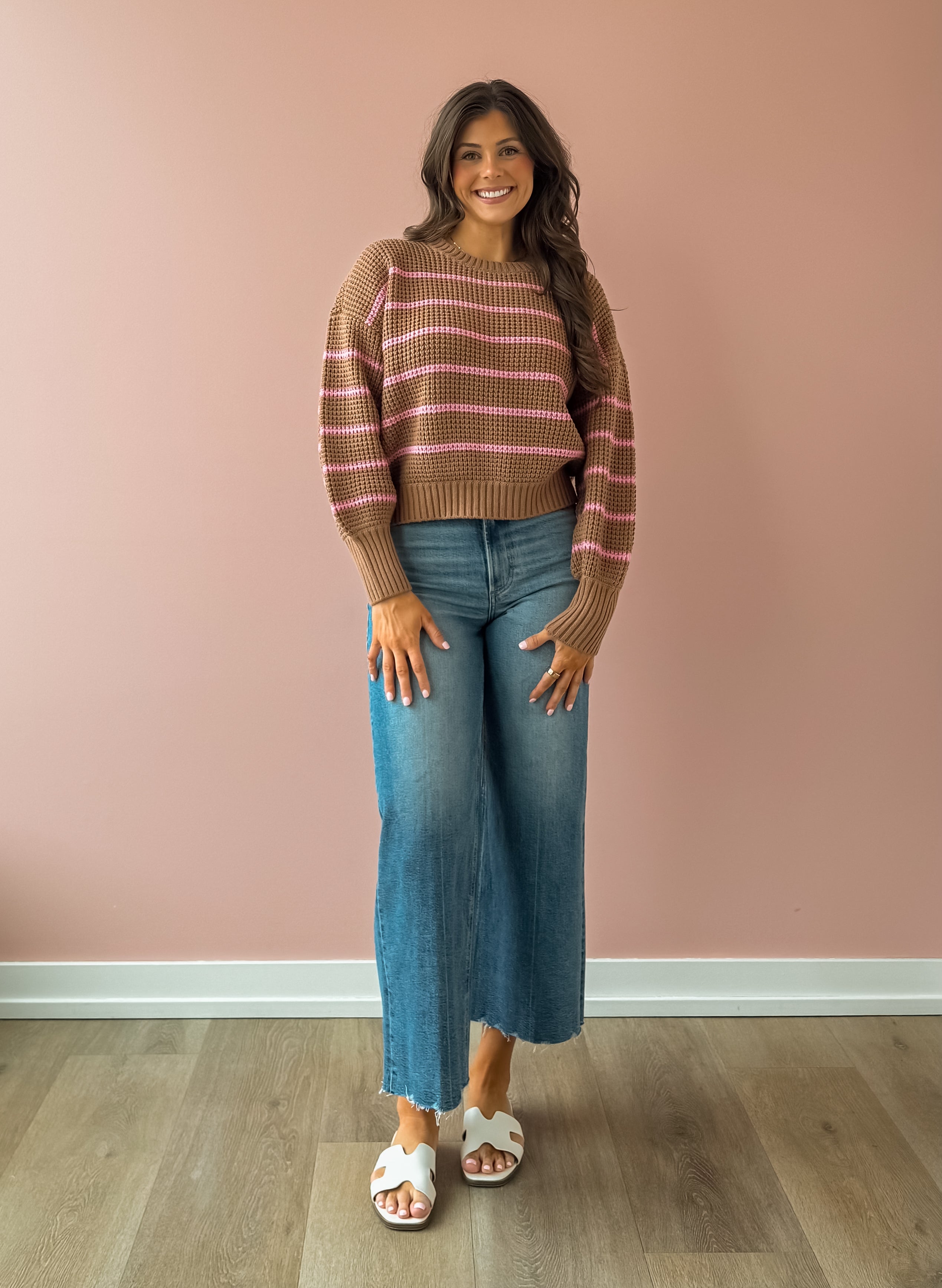 Add a playful pop of color to your everyday knits with the Opal Sweater. Designed in a soft waffle-textured knit, this sweater features a soft brown base accented with cheerful pink stripes for a fun yet effortless look. The relaxed fit and classic crew neckline make it easy to wear, while ribbed trim at the cuffs and hem give it a polished finish. Perfect for pairing with denim, this sweater is cozy, casual, and endlessly versatile!