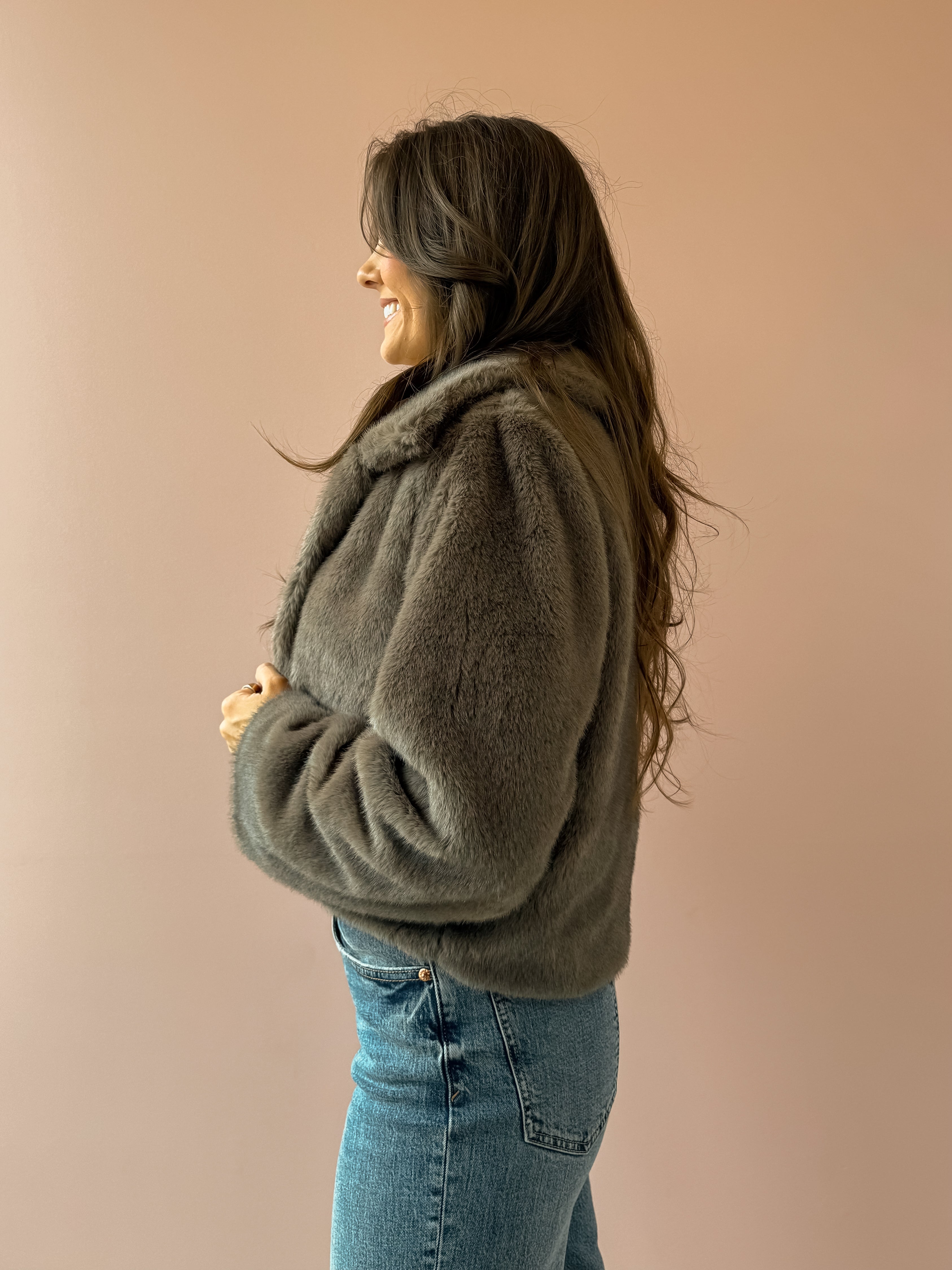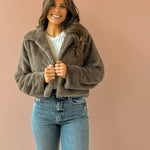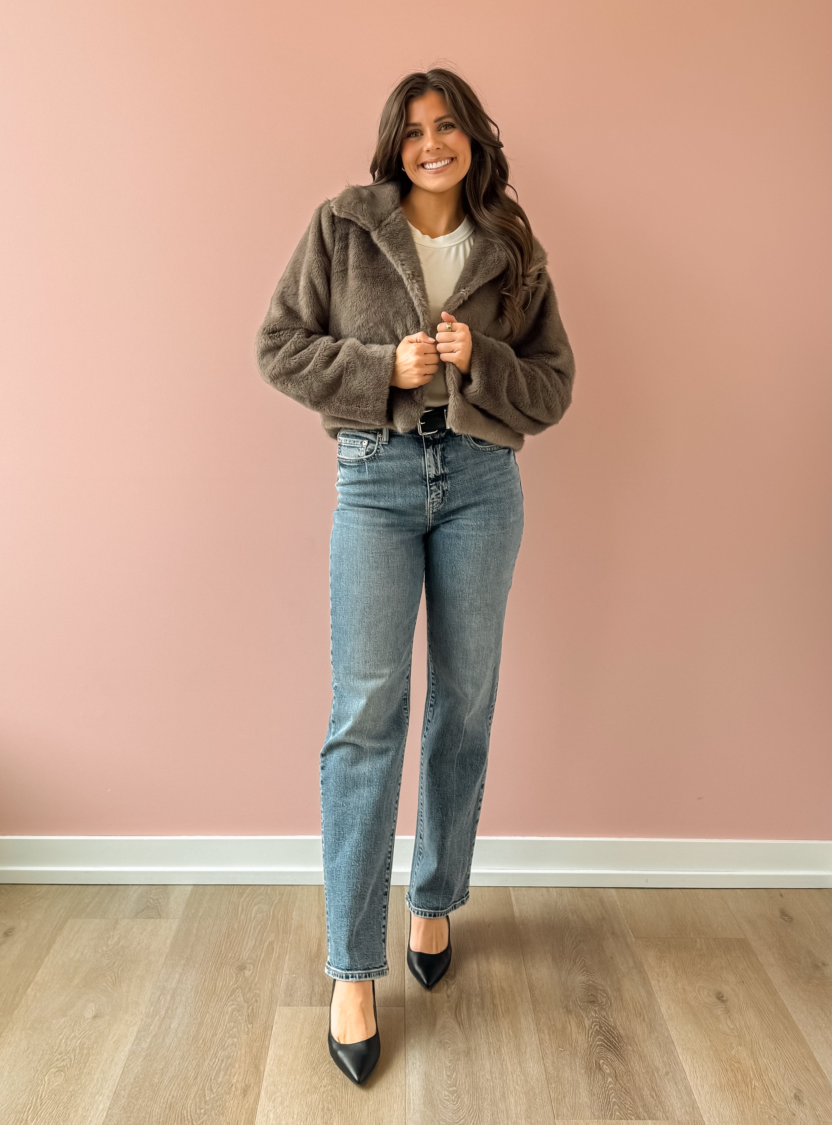 The Penelope Faux Fur Coat combines cozy comfort with stylish sophistication. Its charming collared neckline and semi-cropped fit create a versatile look that’s perfect for dressing up or down. Whether layered over a mini dress for a night out or paired with jeans and flats for a casual day, this coat keeps you warm while elevating your outfit effortlessly.