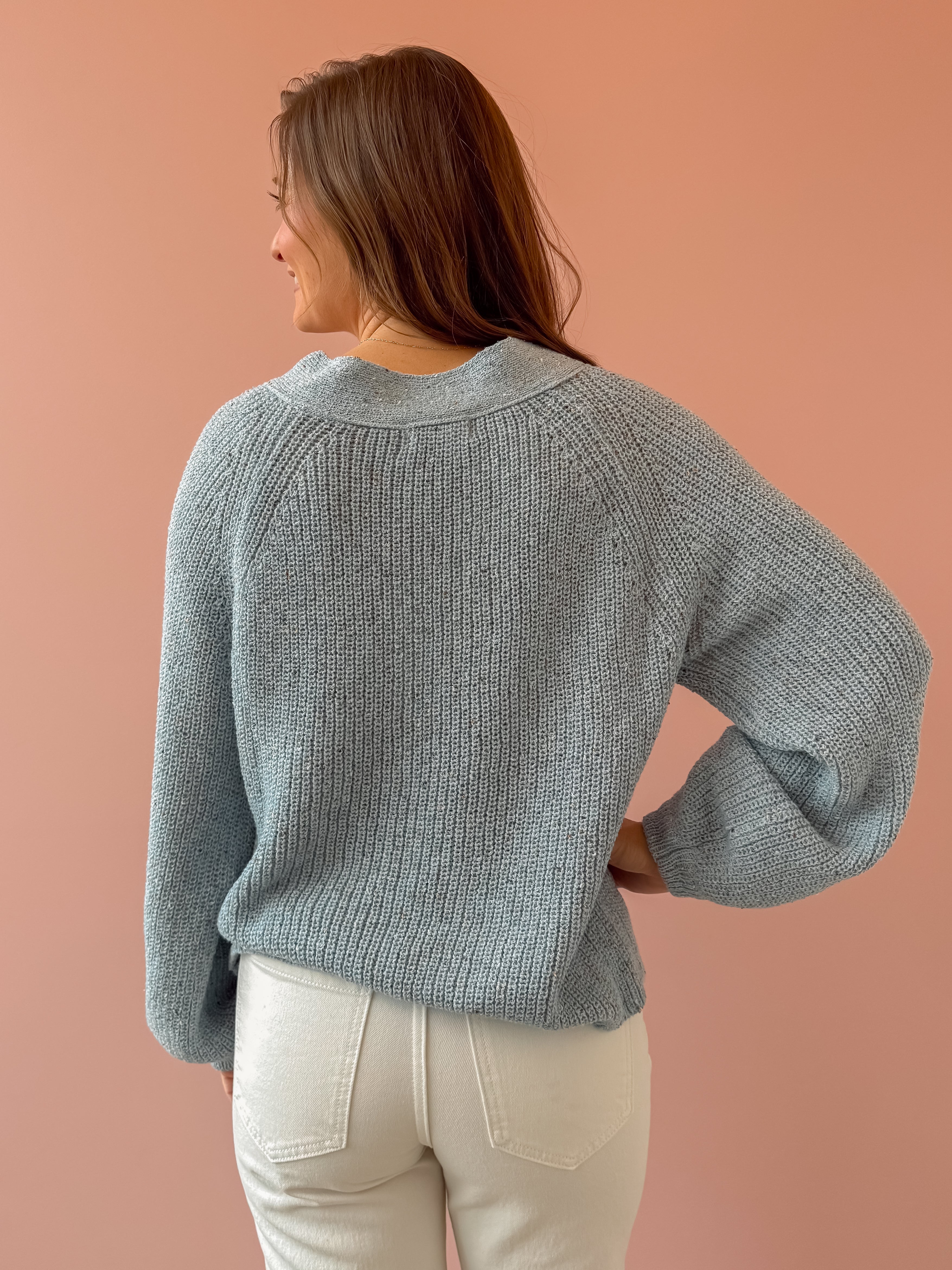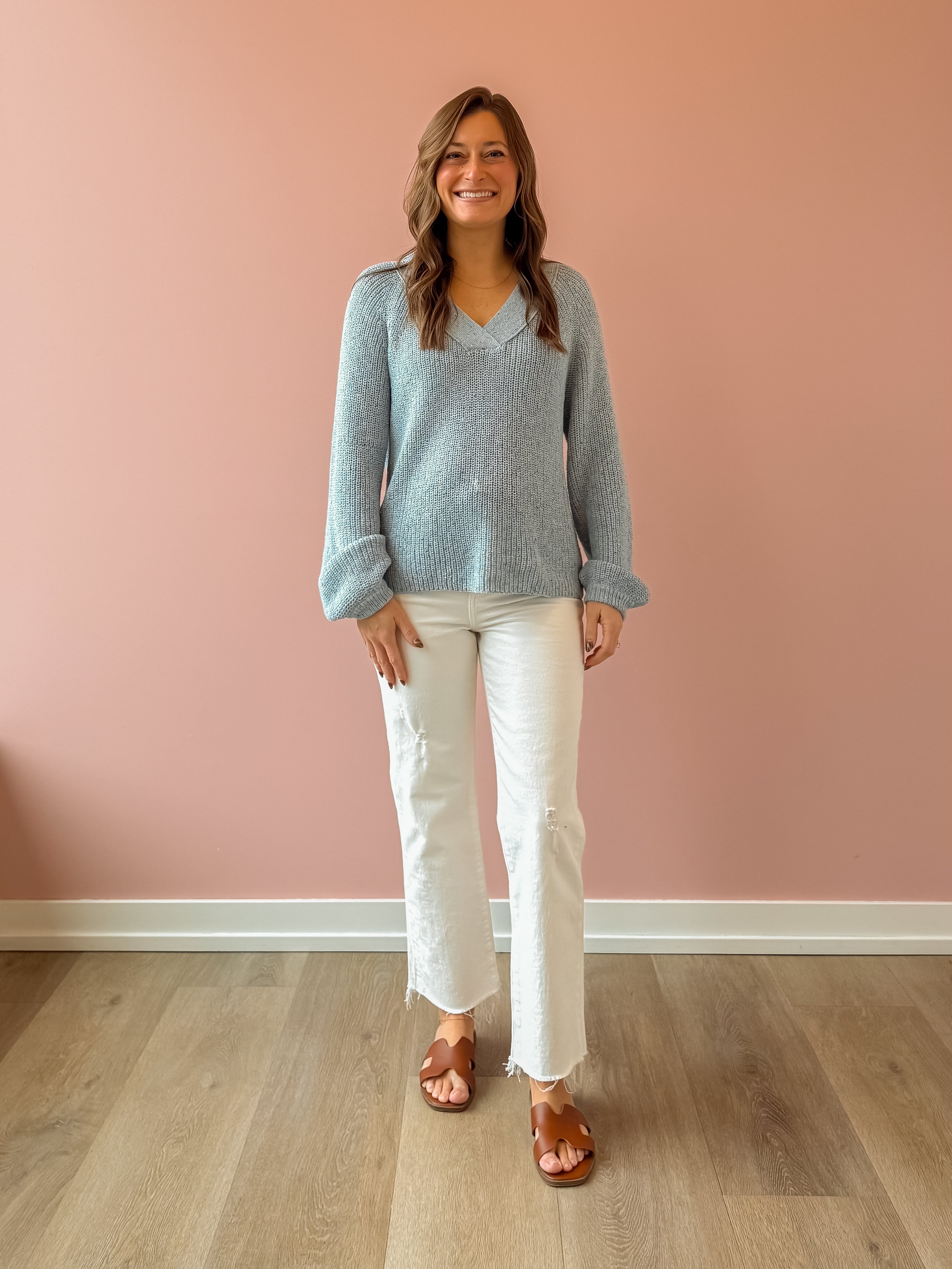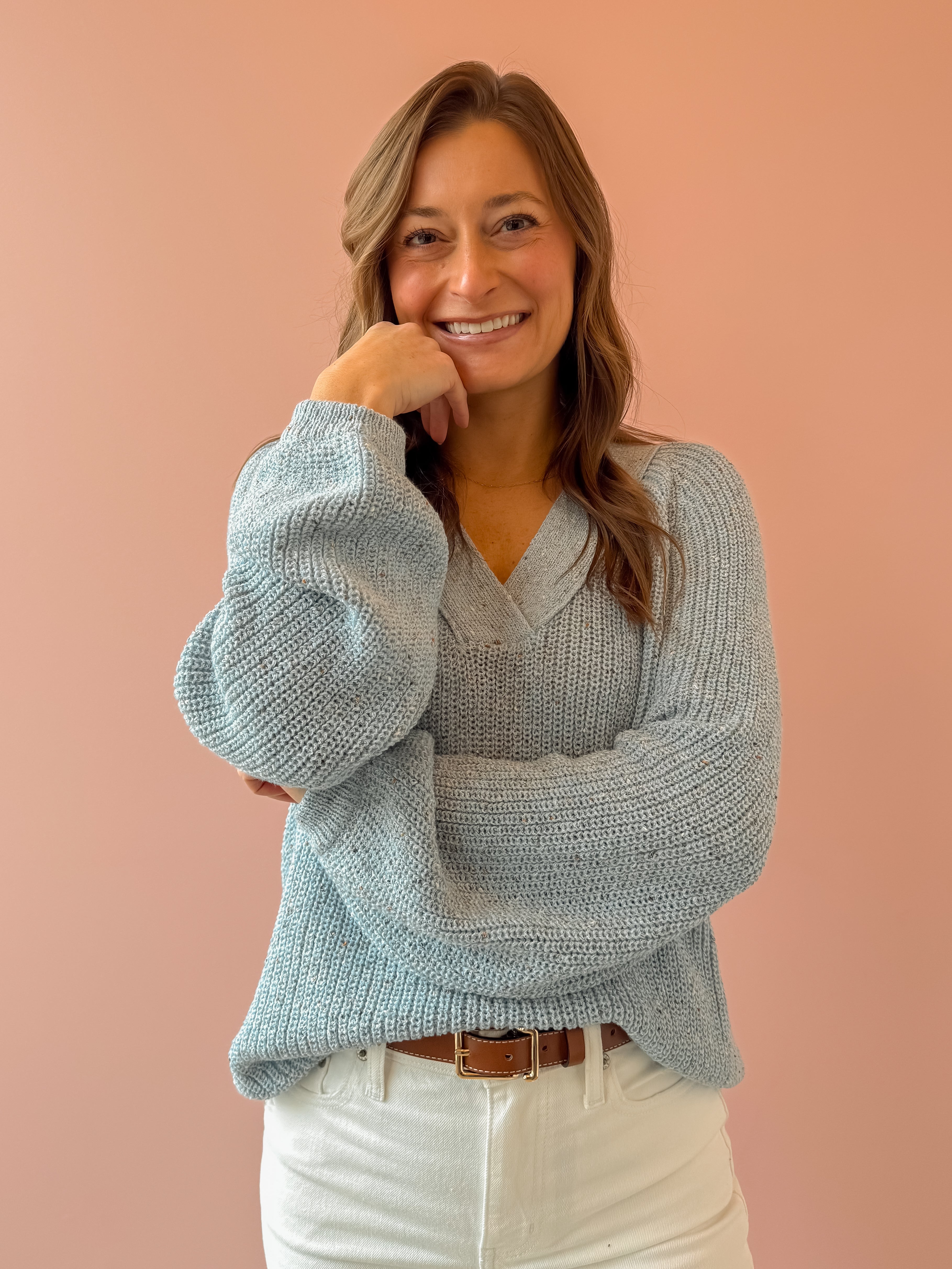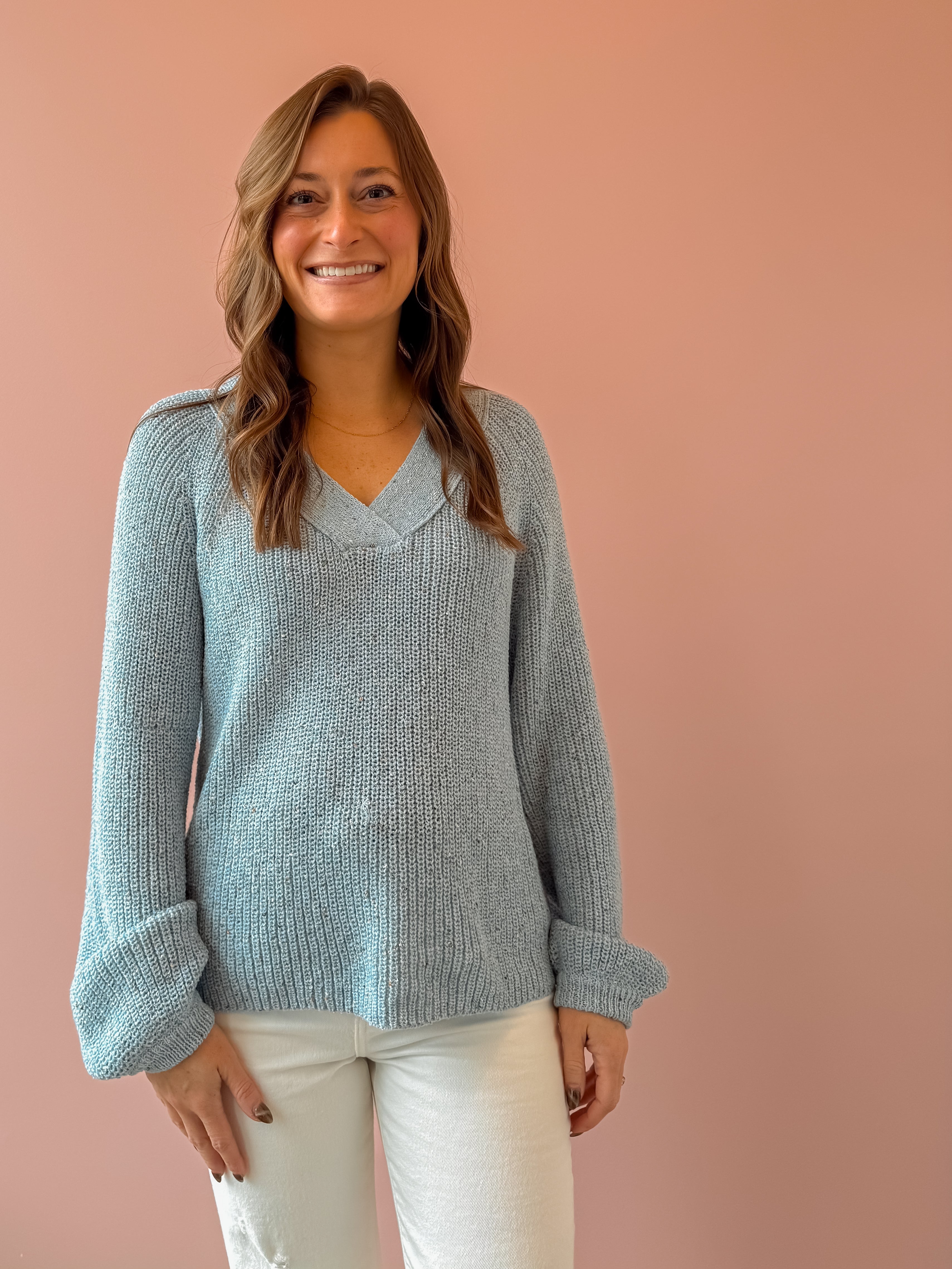 The Phoebe Sweater is a lightweight essential designed for effortless everyday wear. Featuring a flattering v-neckline and a slightly oversized fit, it offers a relaxed, cozy feel without looking bulky. The soft baby blue hue adds a fresh, easy-to-style touch. Pair it with denim and sneakers or loafers for a casual, comfortable look you’ll reach for often.