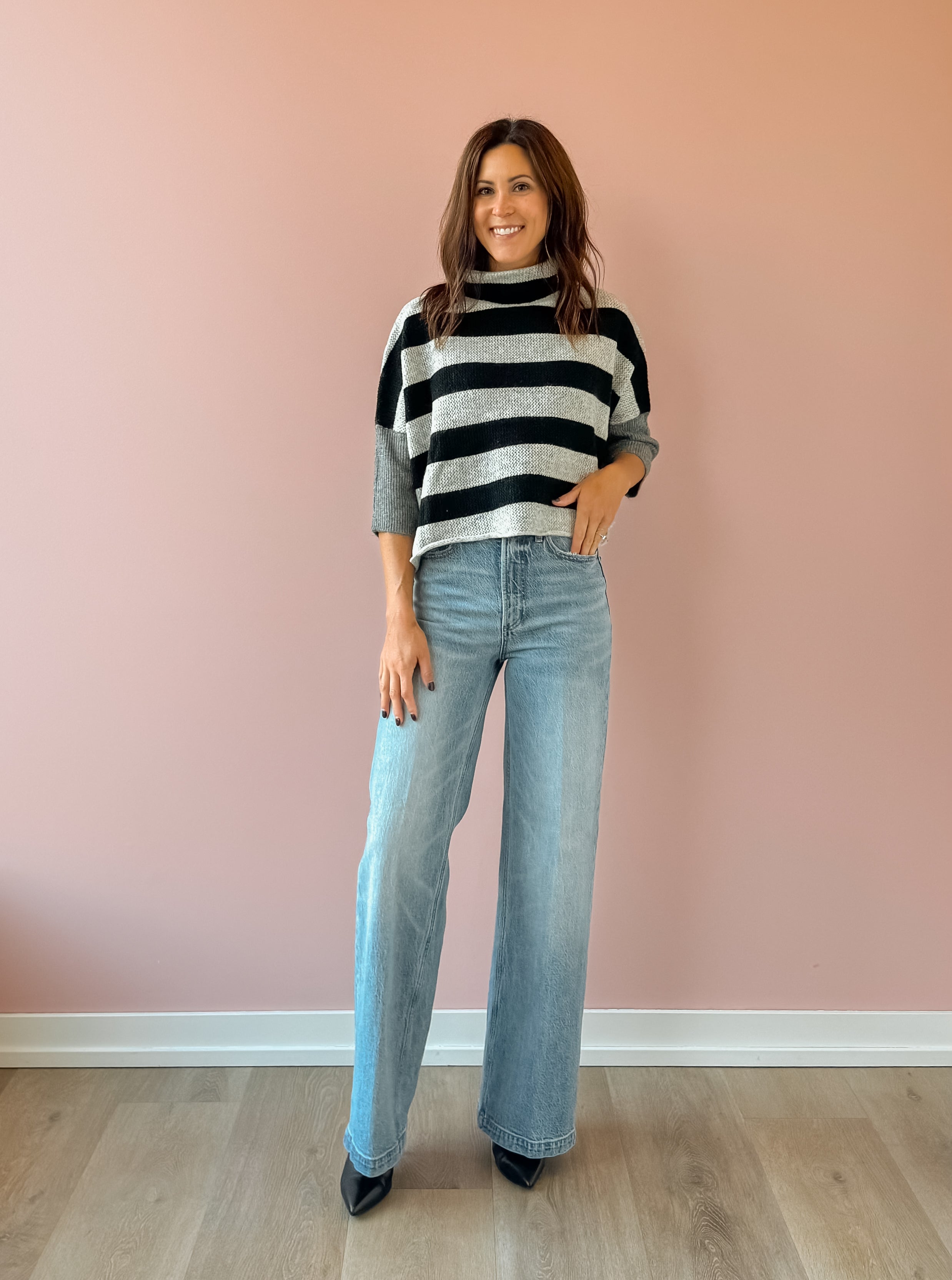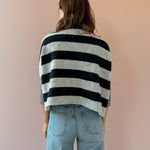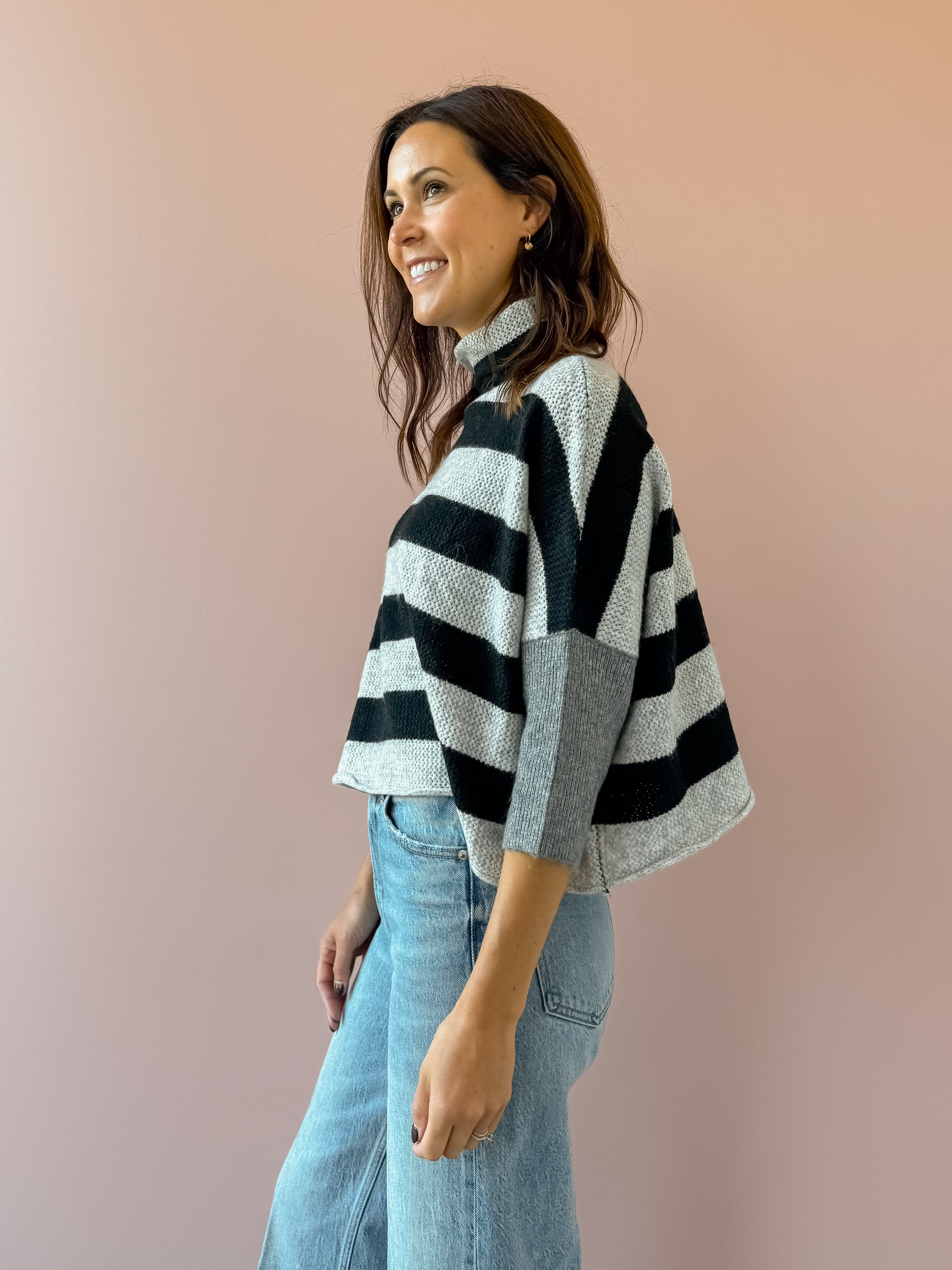 The London Sweater is a lightweight essential with a relaxed, elevated feel. Designed in soft grey with subtle stripes, it features a slightly boxy silhouette, a mock neckline, and cropped sleeves that hit just between short and full length—ideal for layering or wearing solo. Finished in a breathable cable knit, it’s the perfect piece for transitional days when comfort meets effortless style.