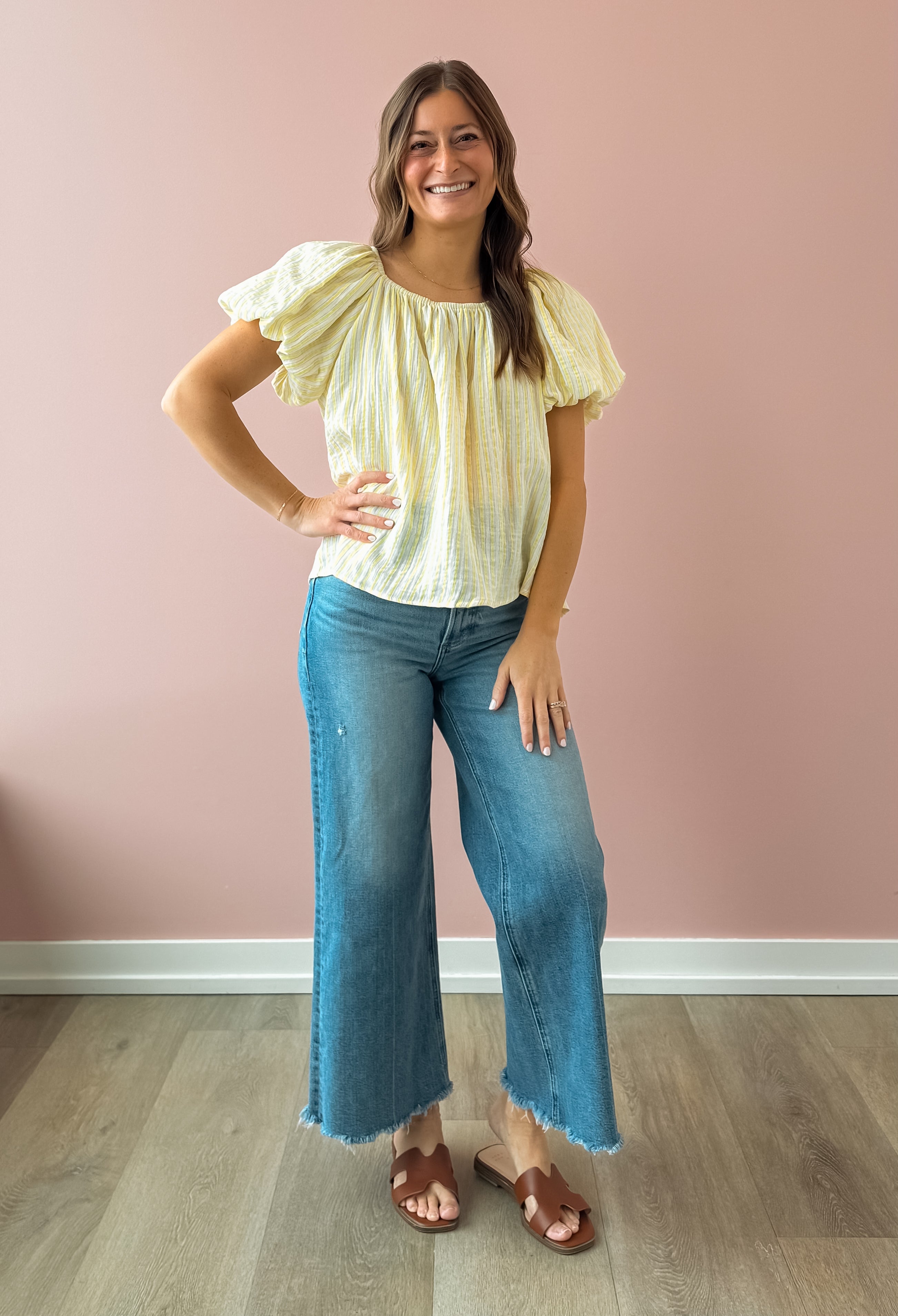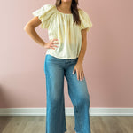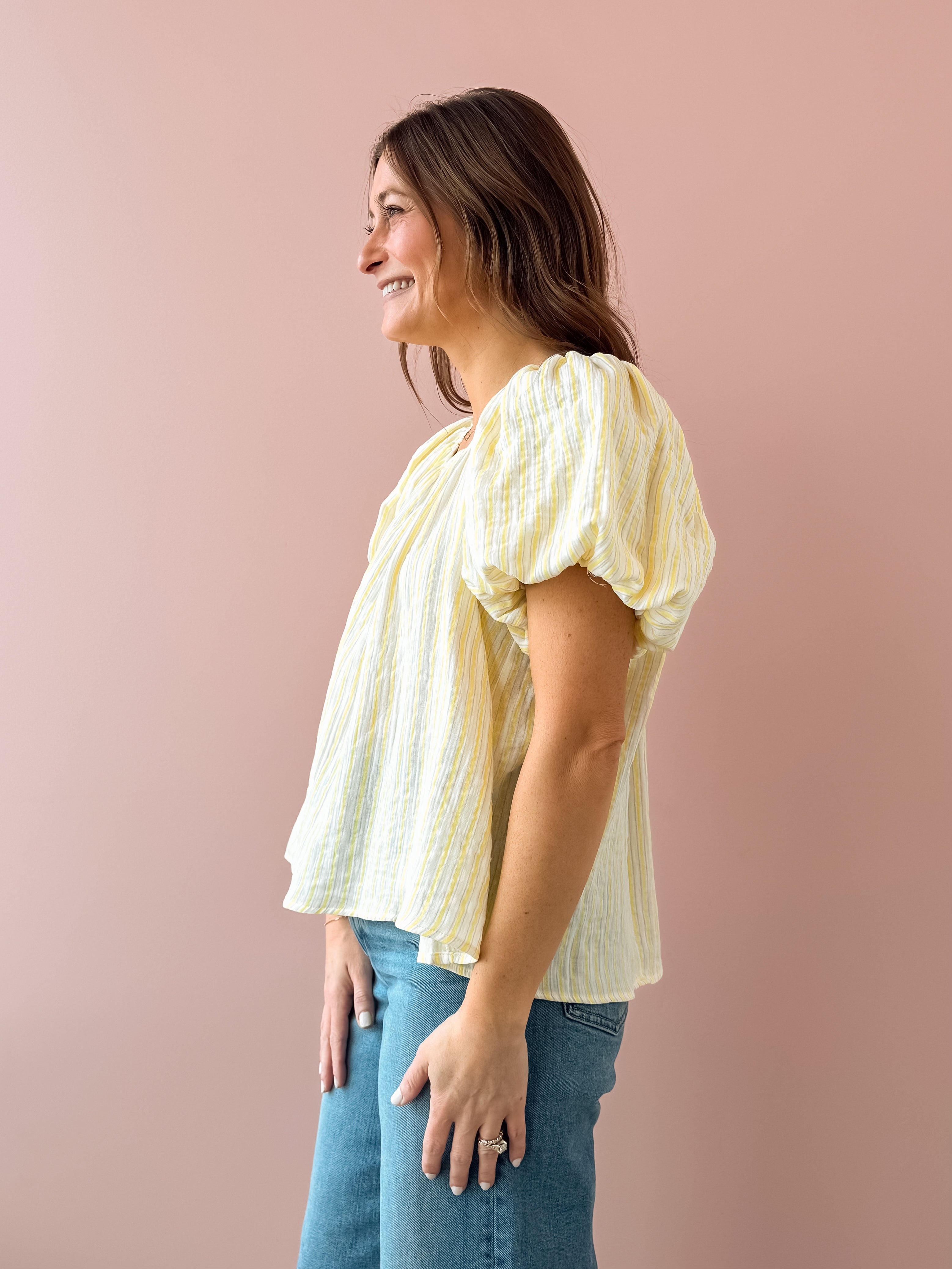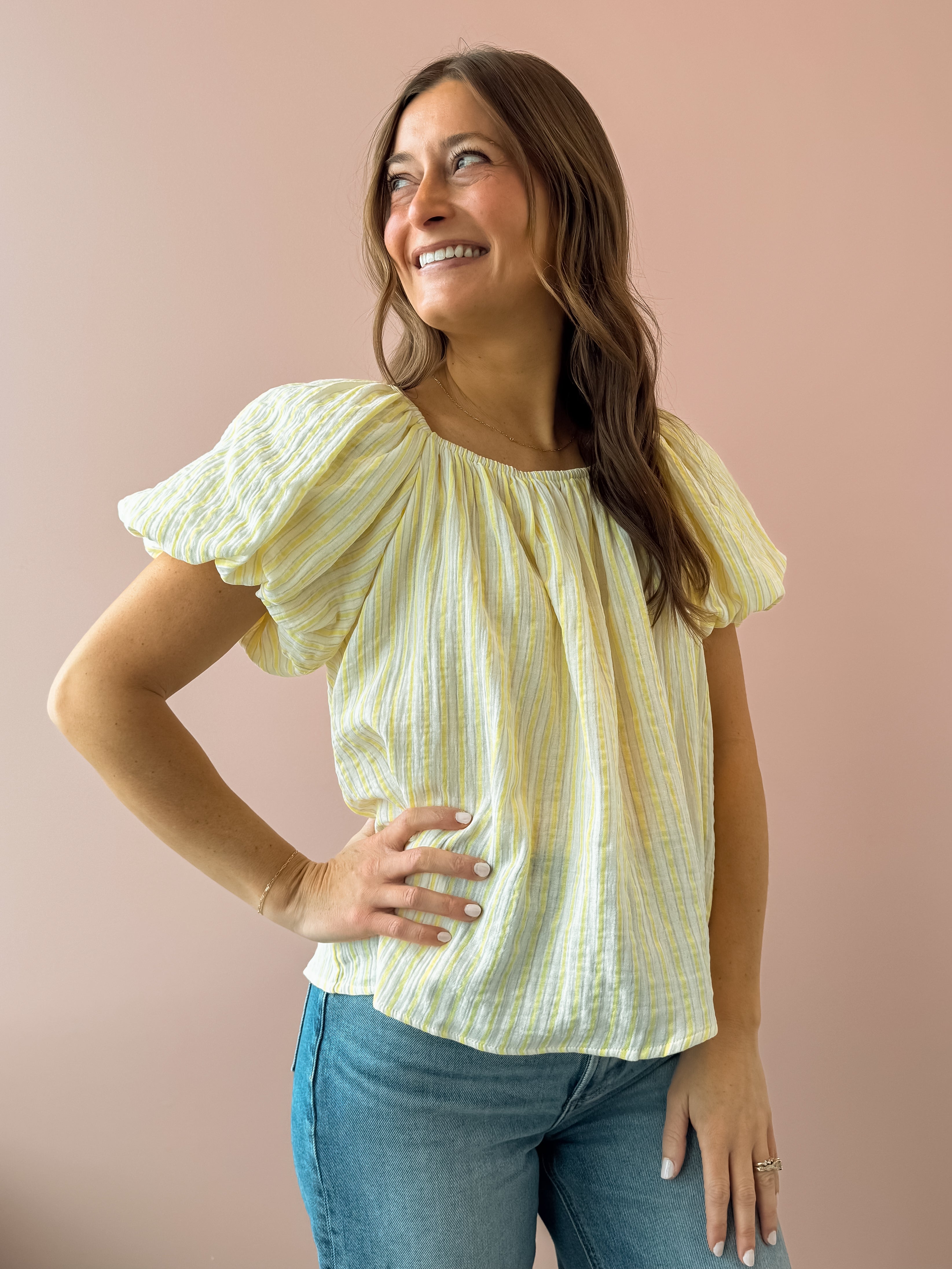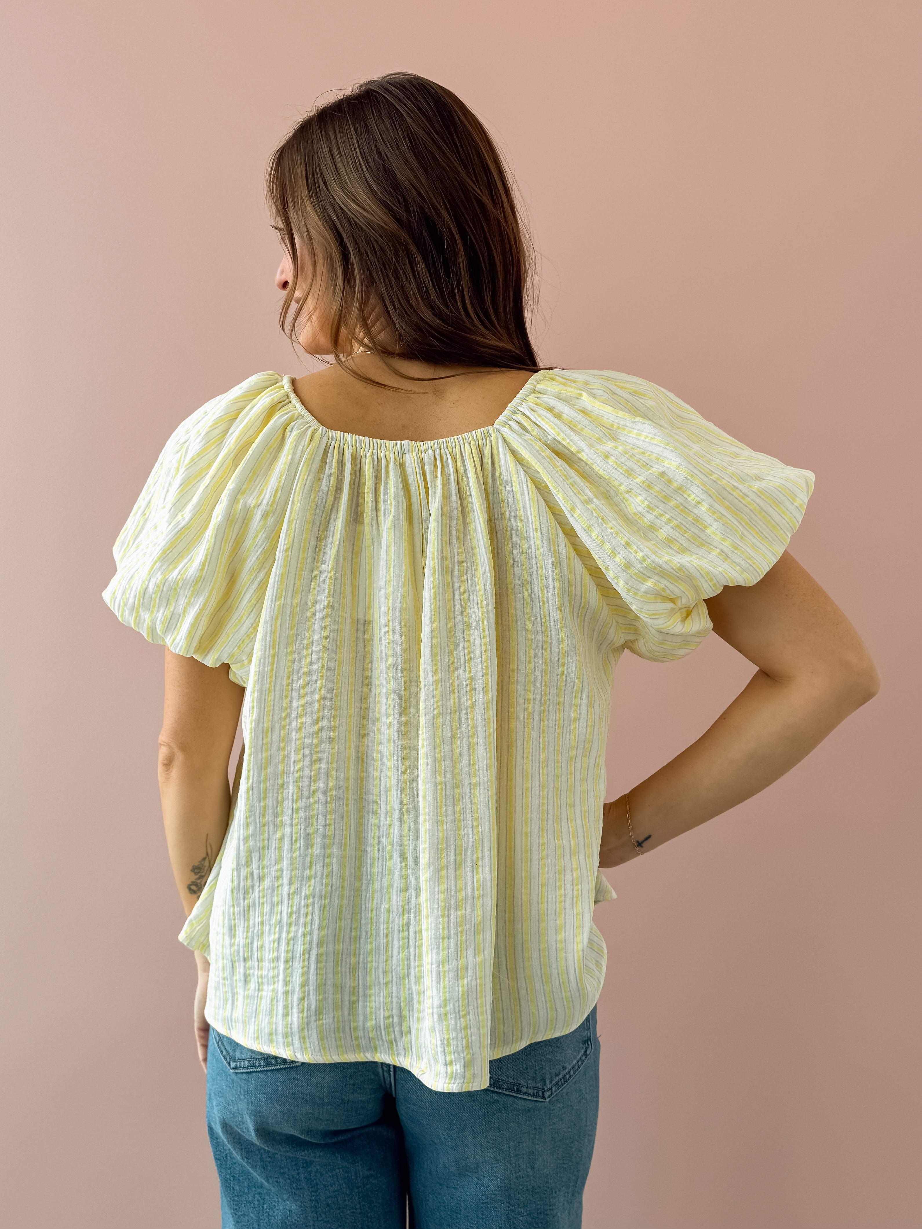 The Christine Top brings effortless charm to your everyday wardrobe. This striped beauty features romantic puff sleeves and a flattering square neckline that frames your face beautifully. Crafted from lightweight, breathable fabric, the flowy silhouette moves with you. The crisp white and yellow stripe pattern adds a fresh, timeless appeal. Style it with white denim and sandals for that coveted seaside-chic aesthetic!
